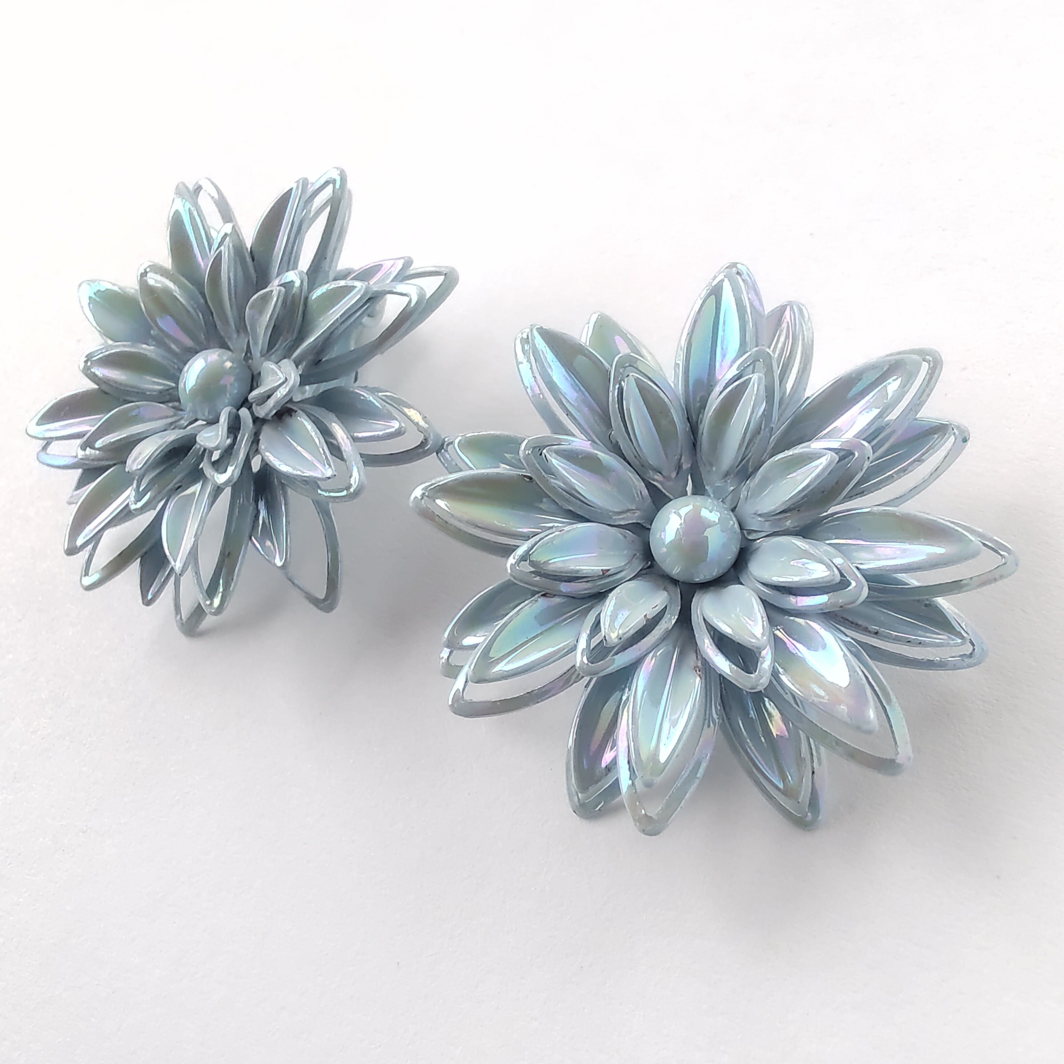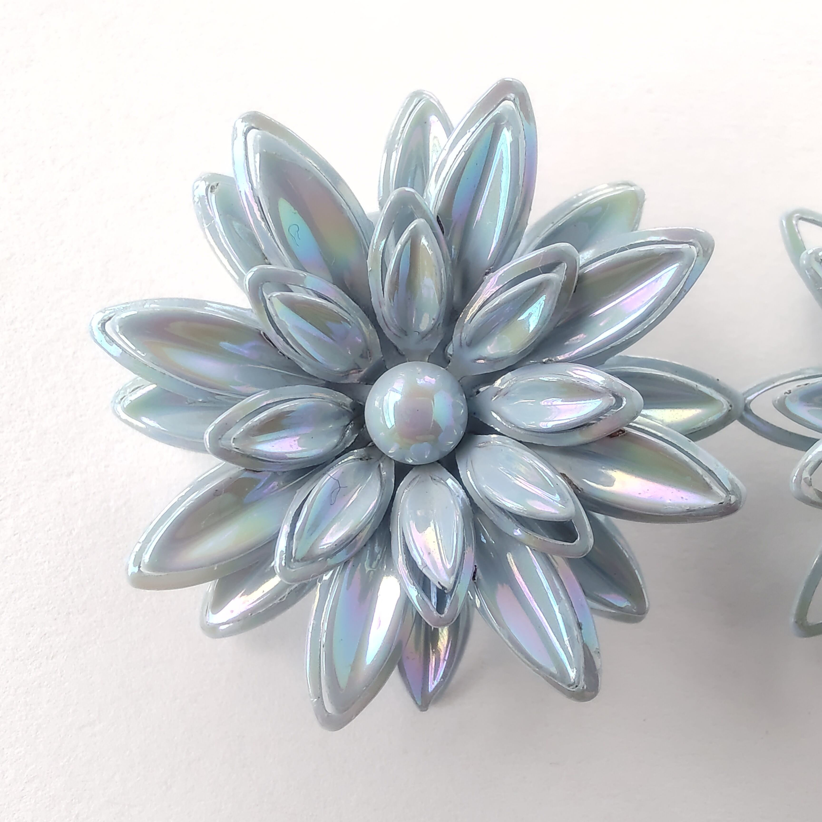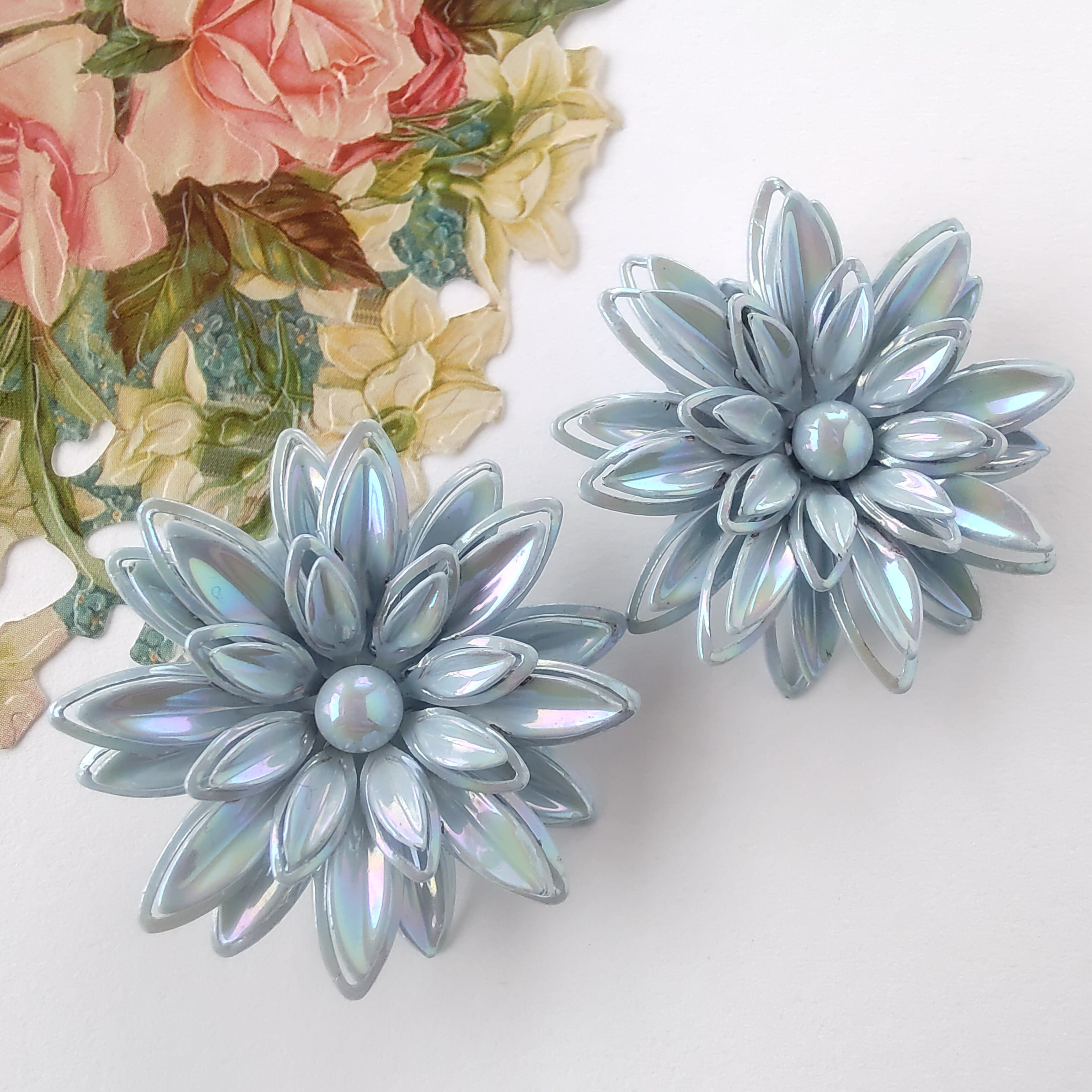 ベースメタルにパールがかった淡いブルーのエナメルで色付けされたフラワーのヴィンテージイヤリングです。