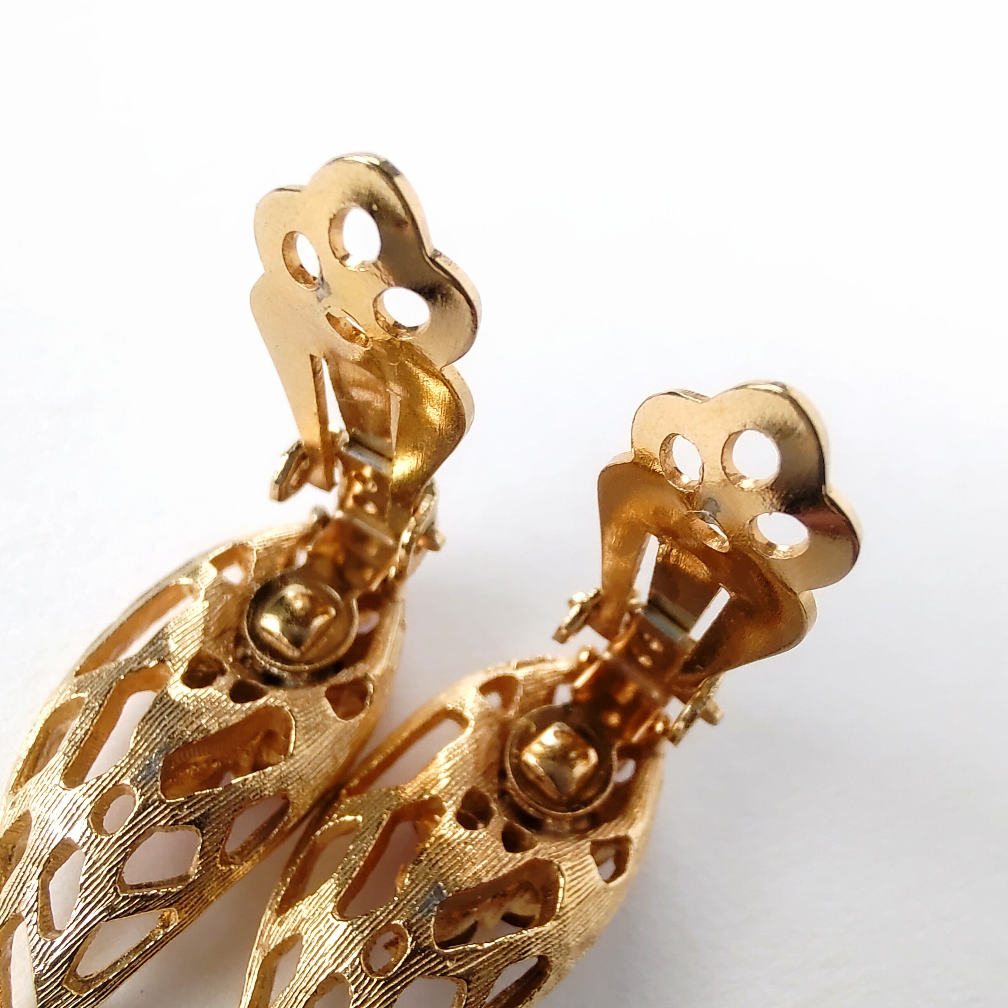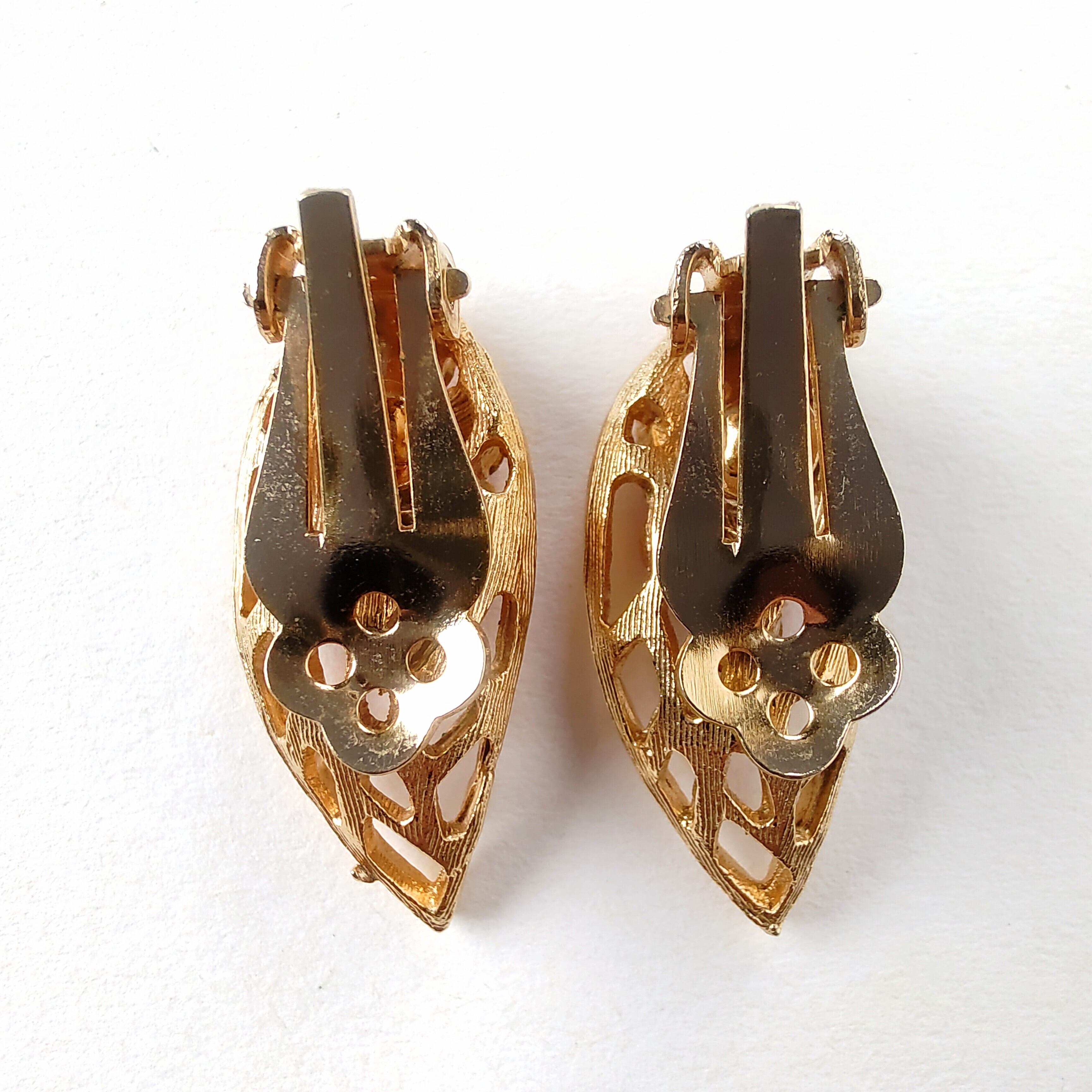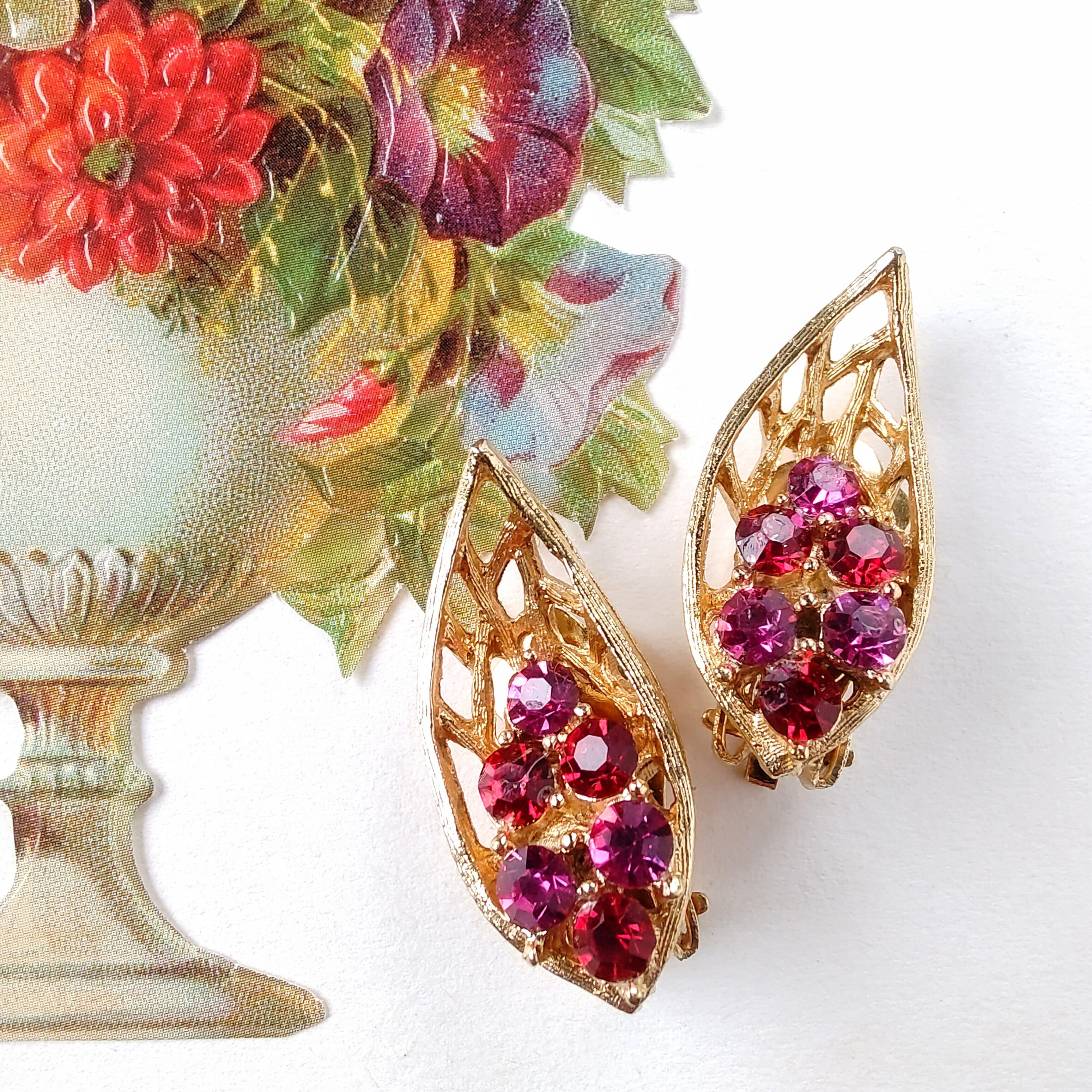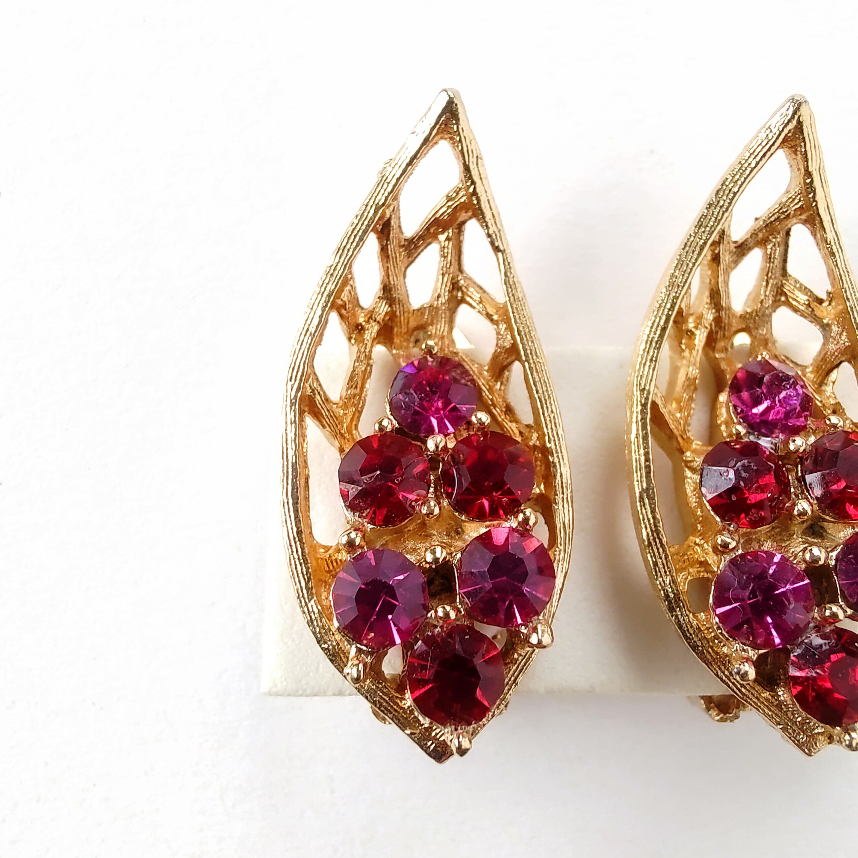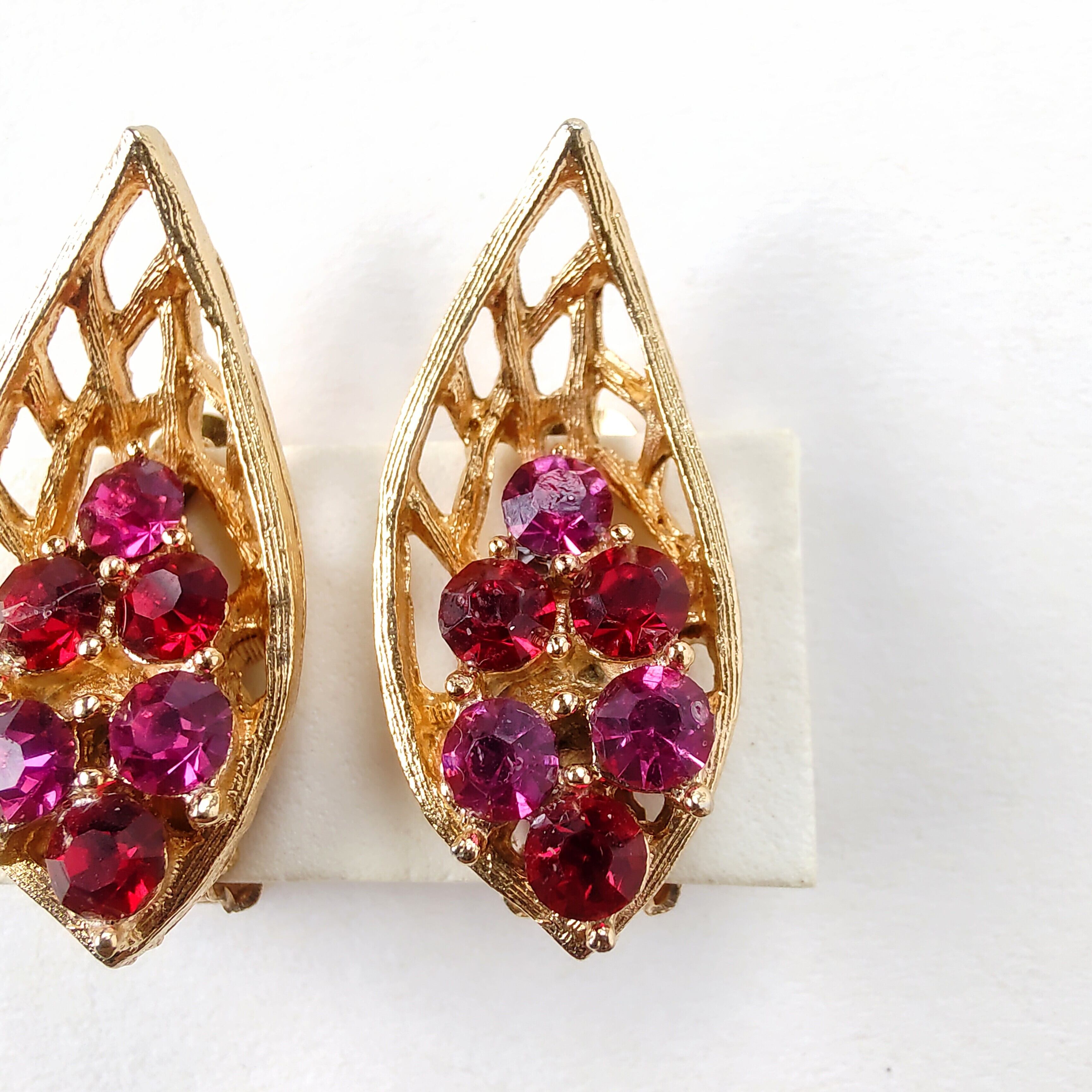 透かしのゴールドメタルのリーフにレッドとマゼンタのラインストーンがあしらわれたヴィンテージイヤリングです。