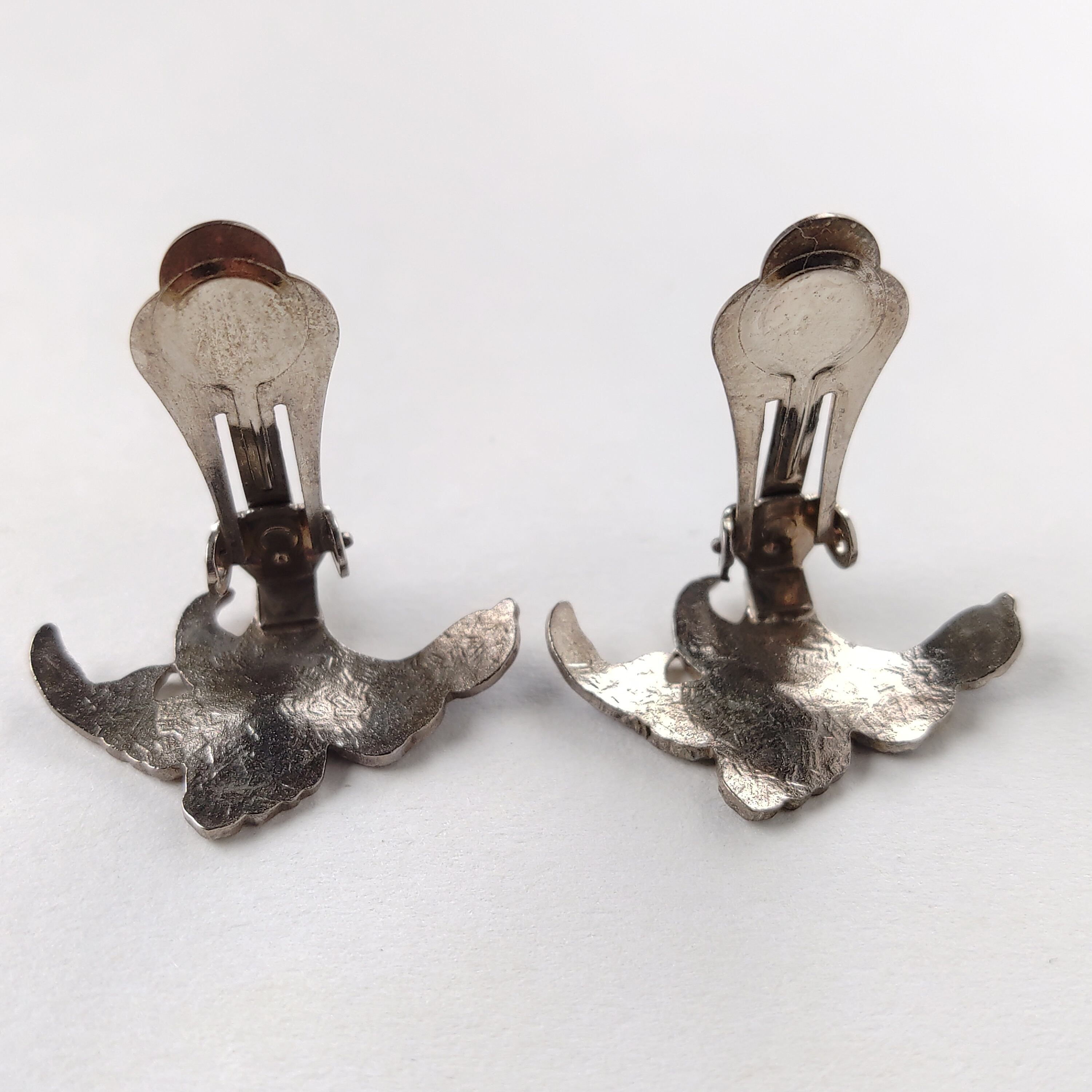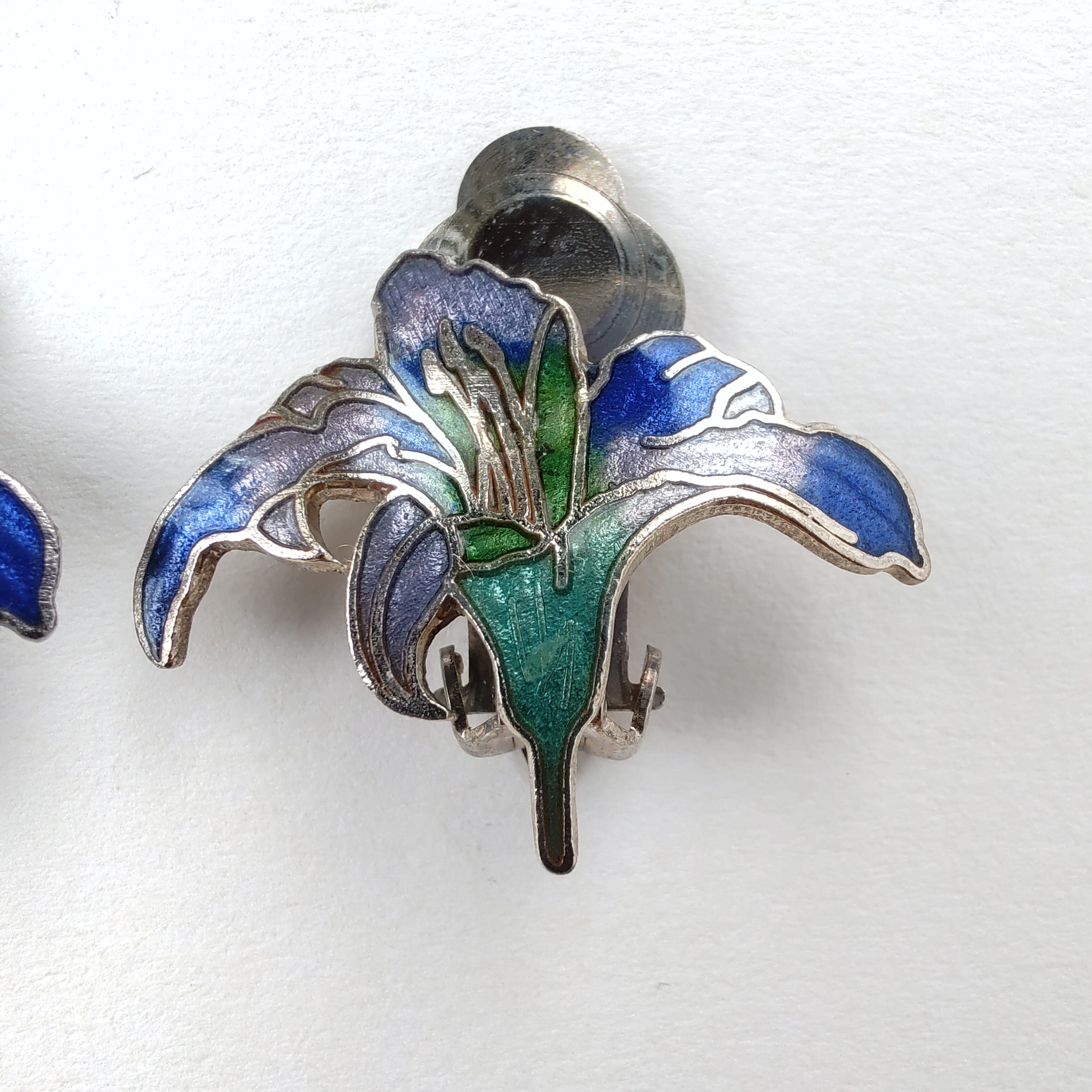 ブルー、パープル、グリーンのエナメルで色付けされた百合の七宝焼のヴィンテージイヤリングです。