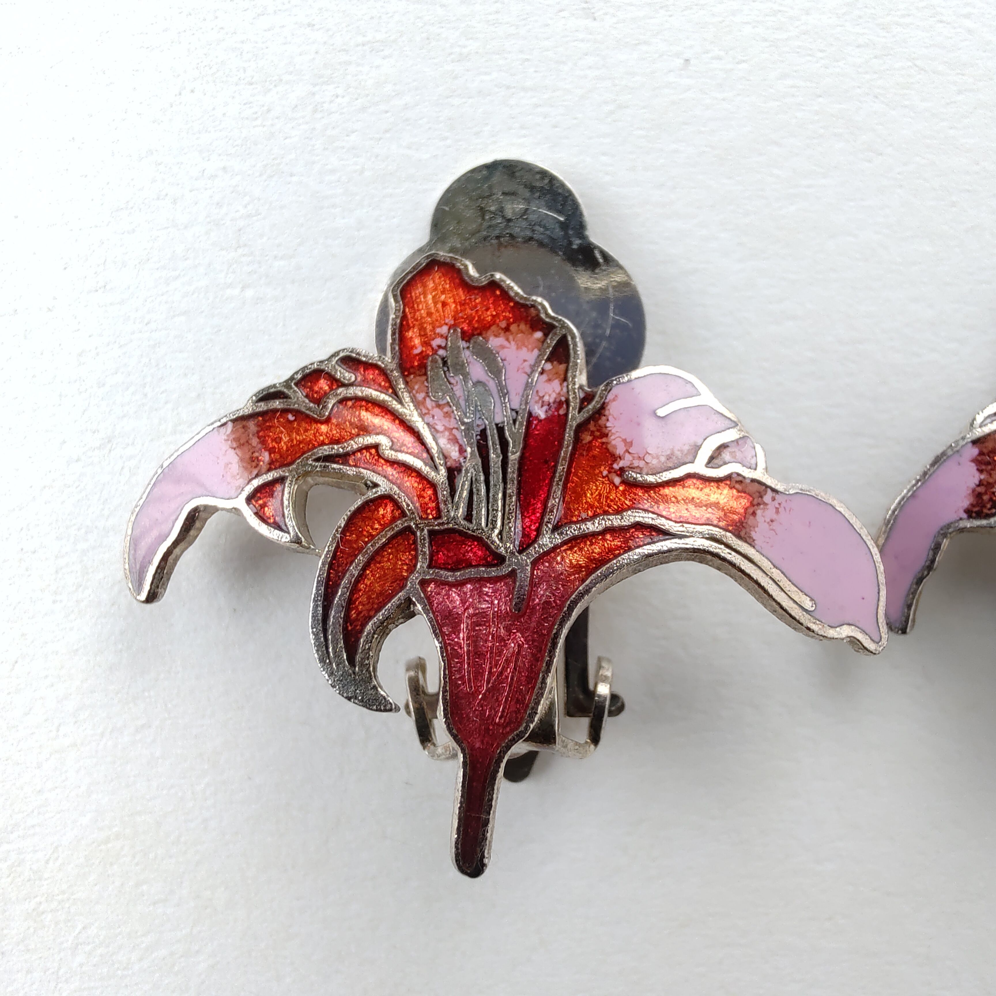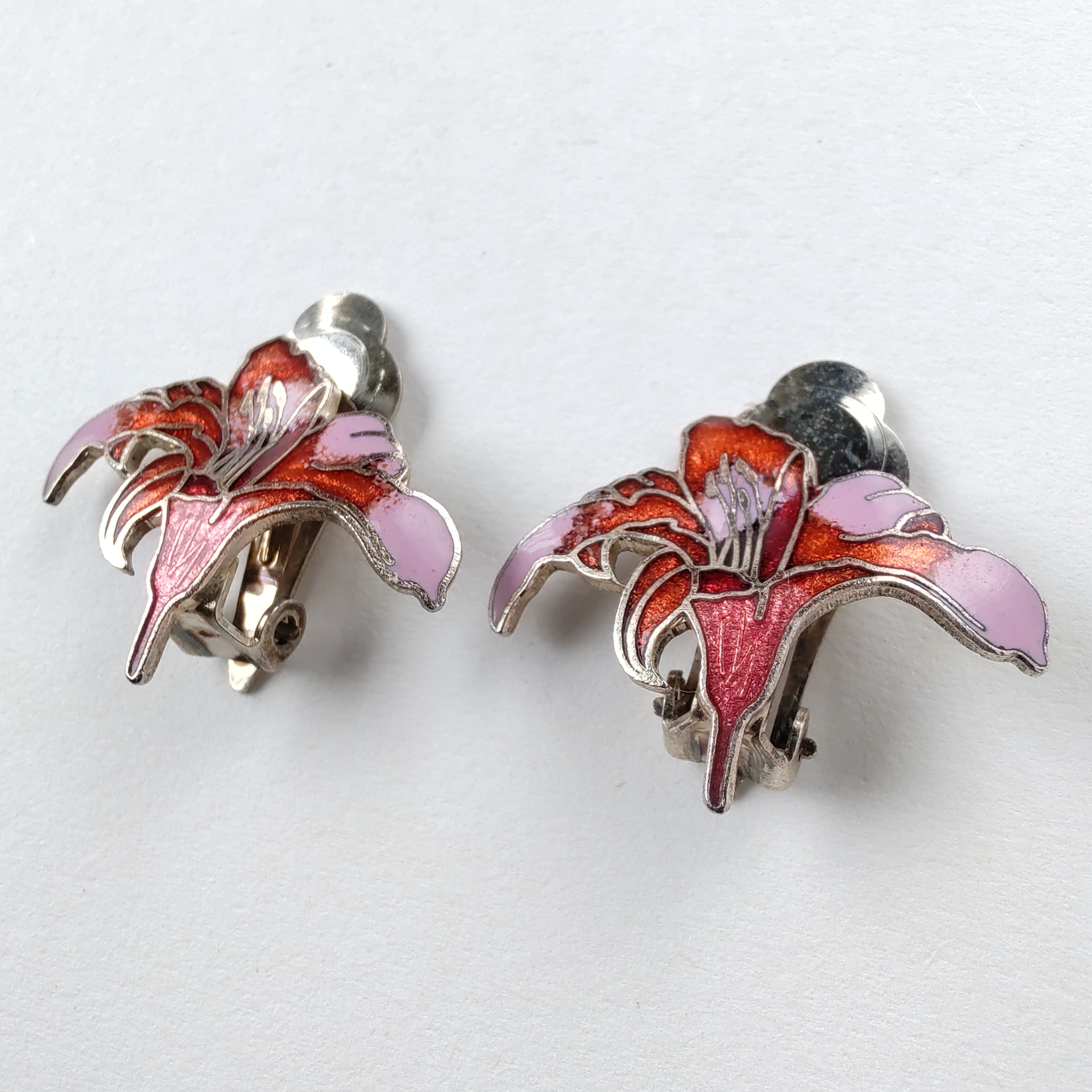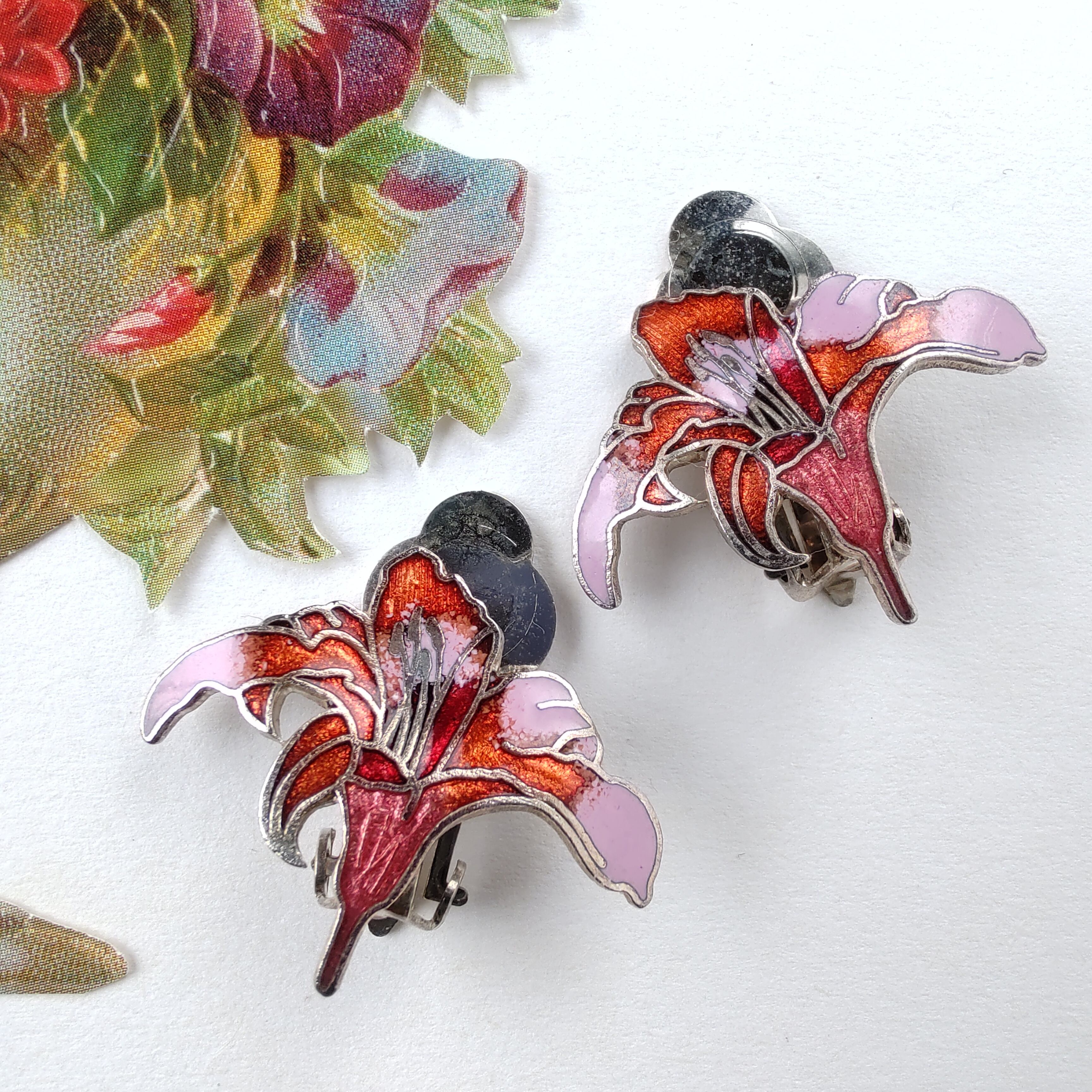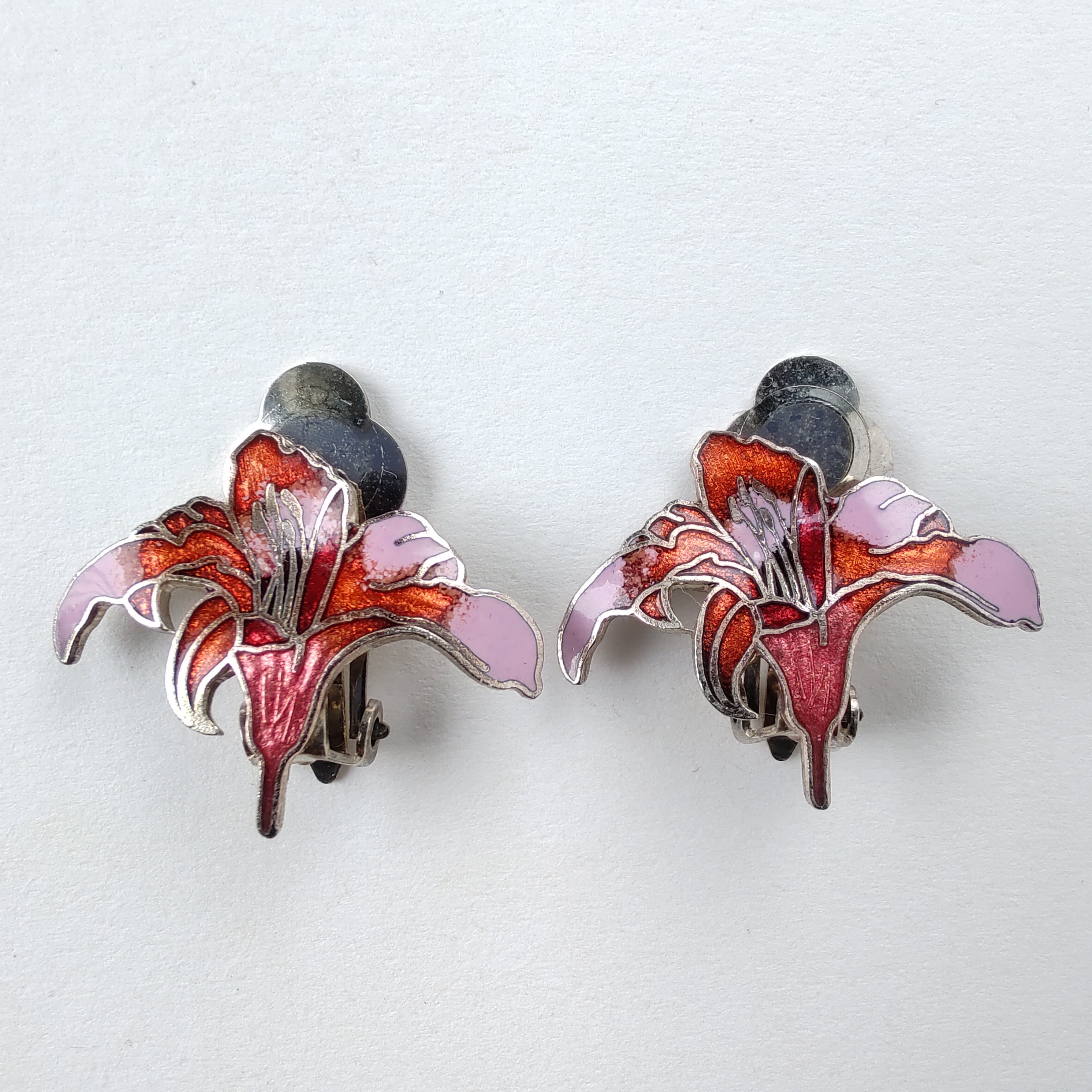 オレンジ、ピンク、レッドのエナメルで色付けされた百合の七宝焼のヴィンテージイヤリングです。