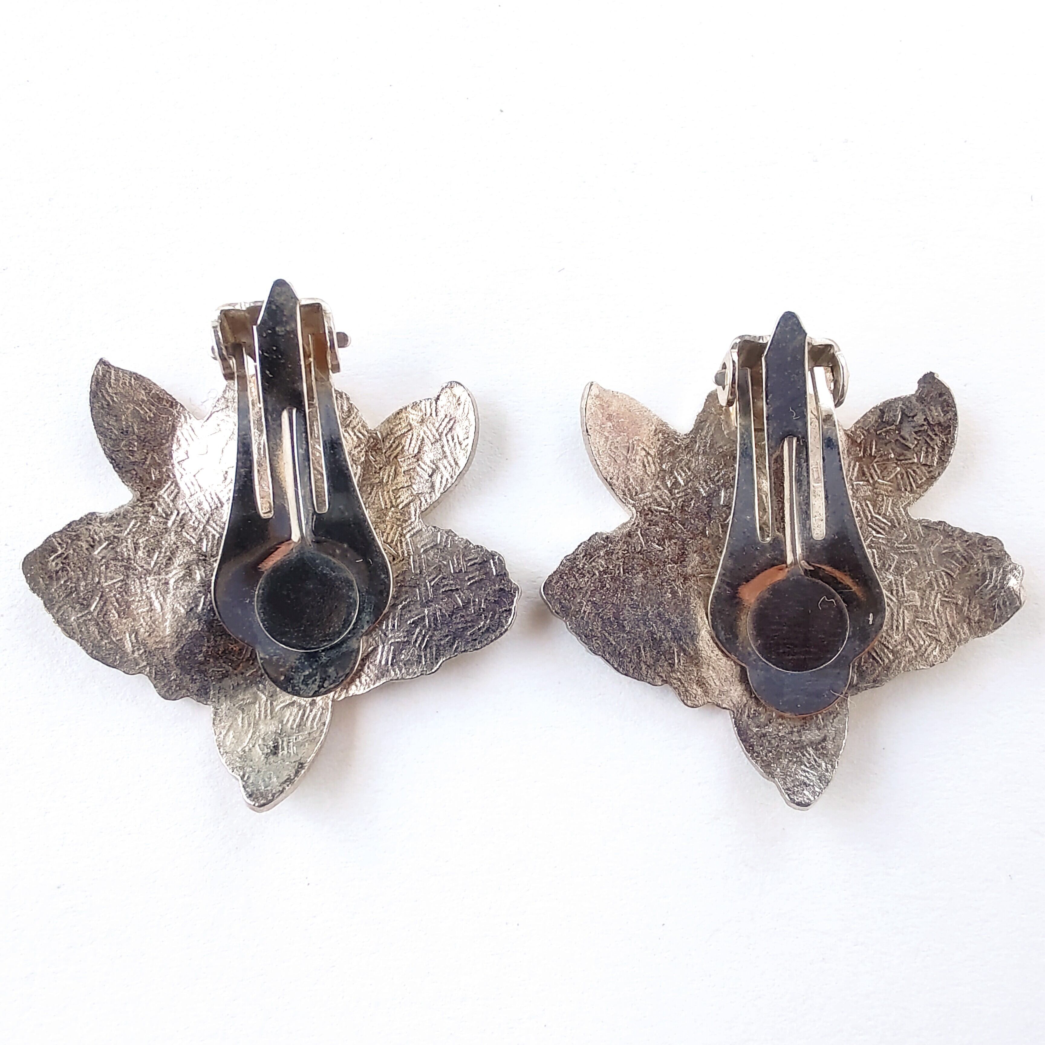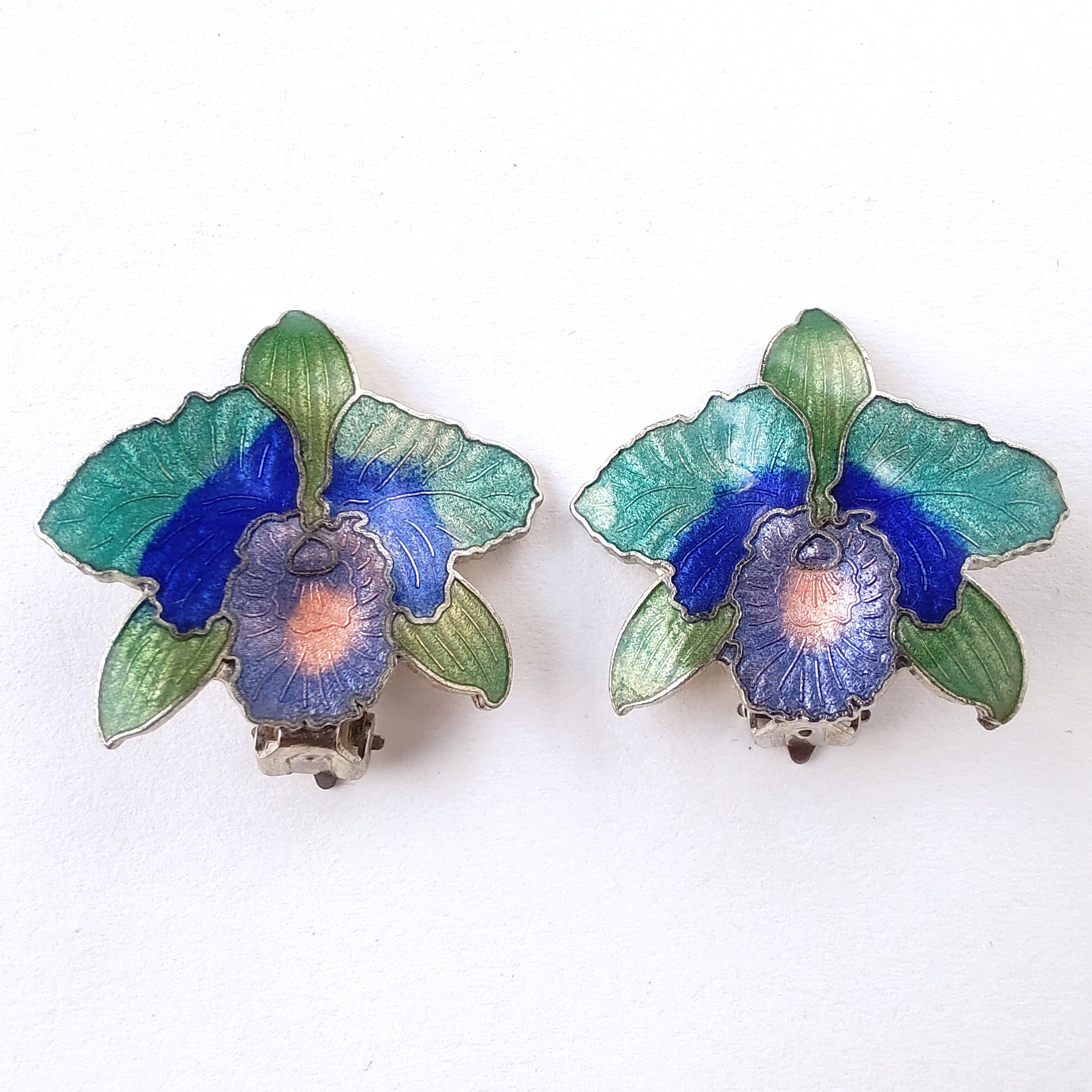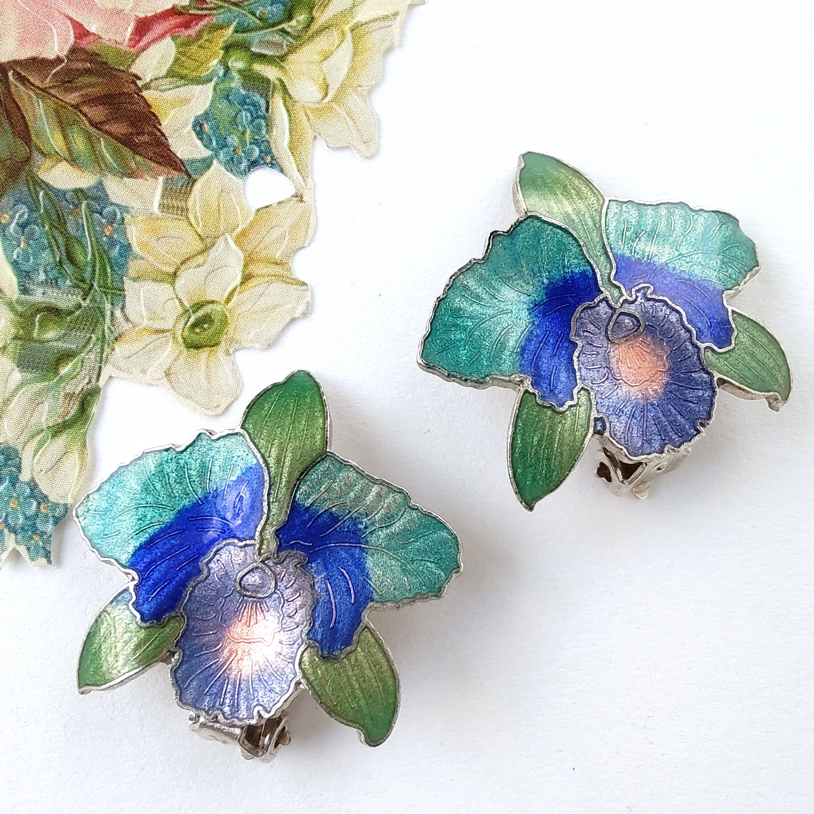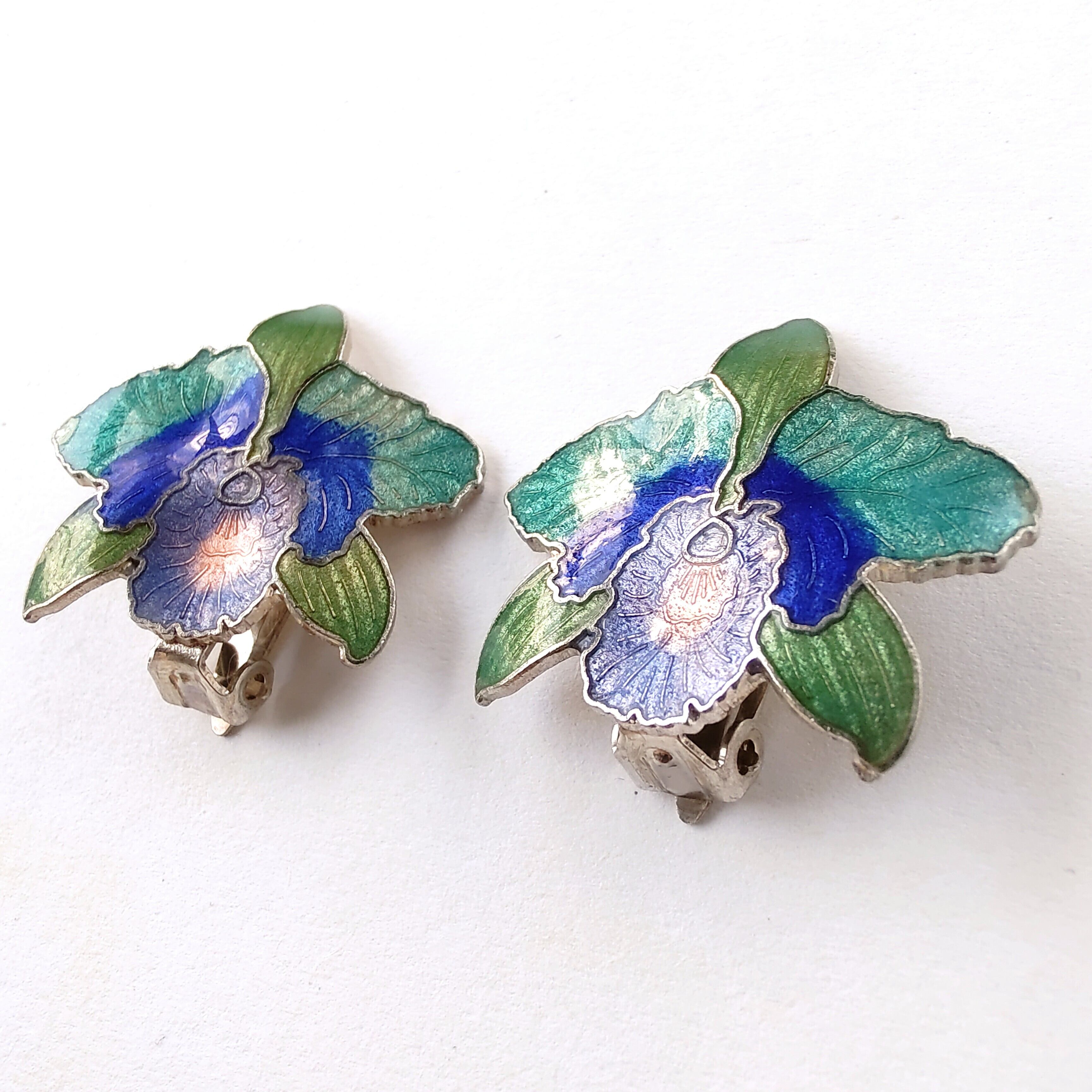 ブルー、パープル、グリーン、ピンクのエナメルで色付けされた洋蘭の七宝焼のヴィンテージイヤリングです。