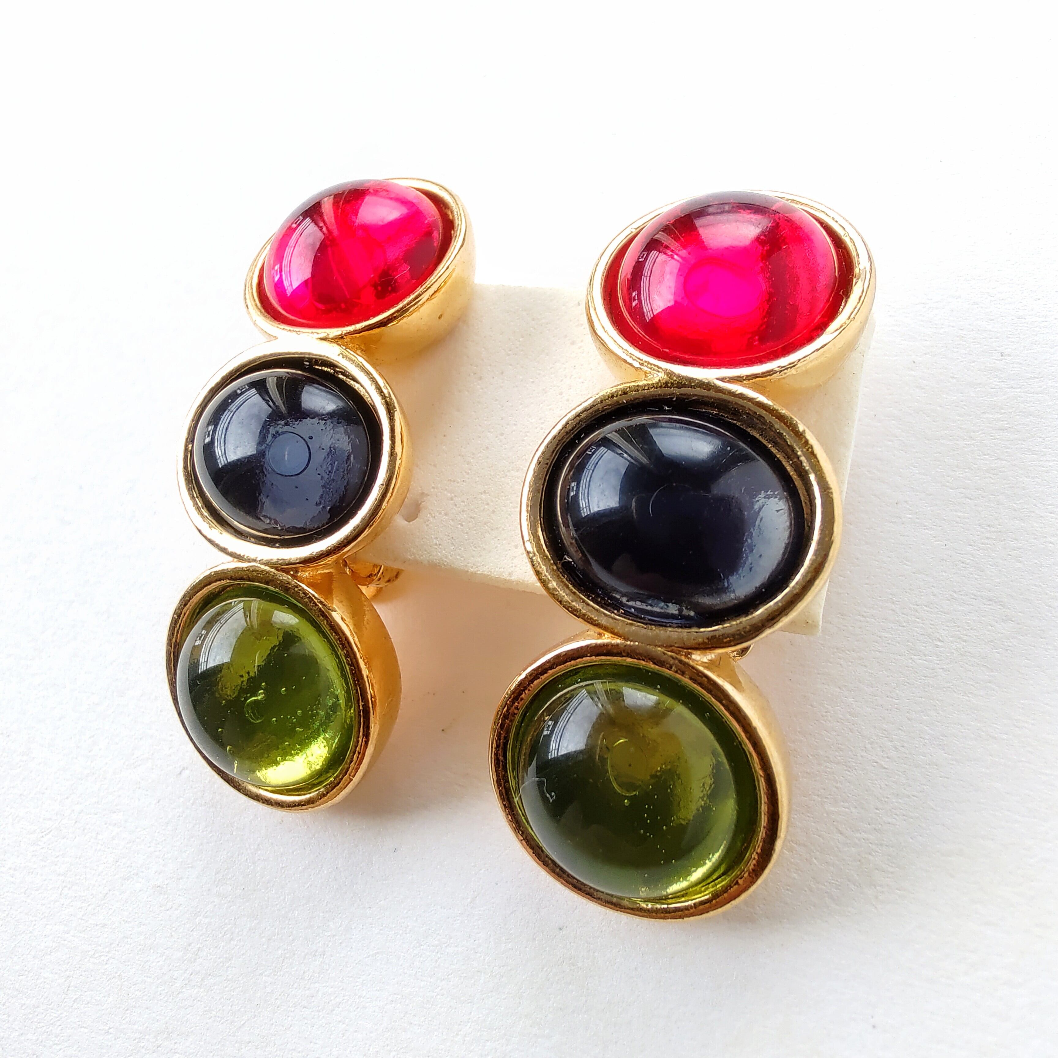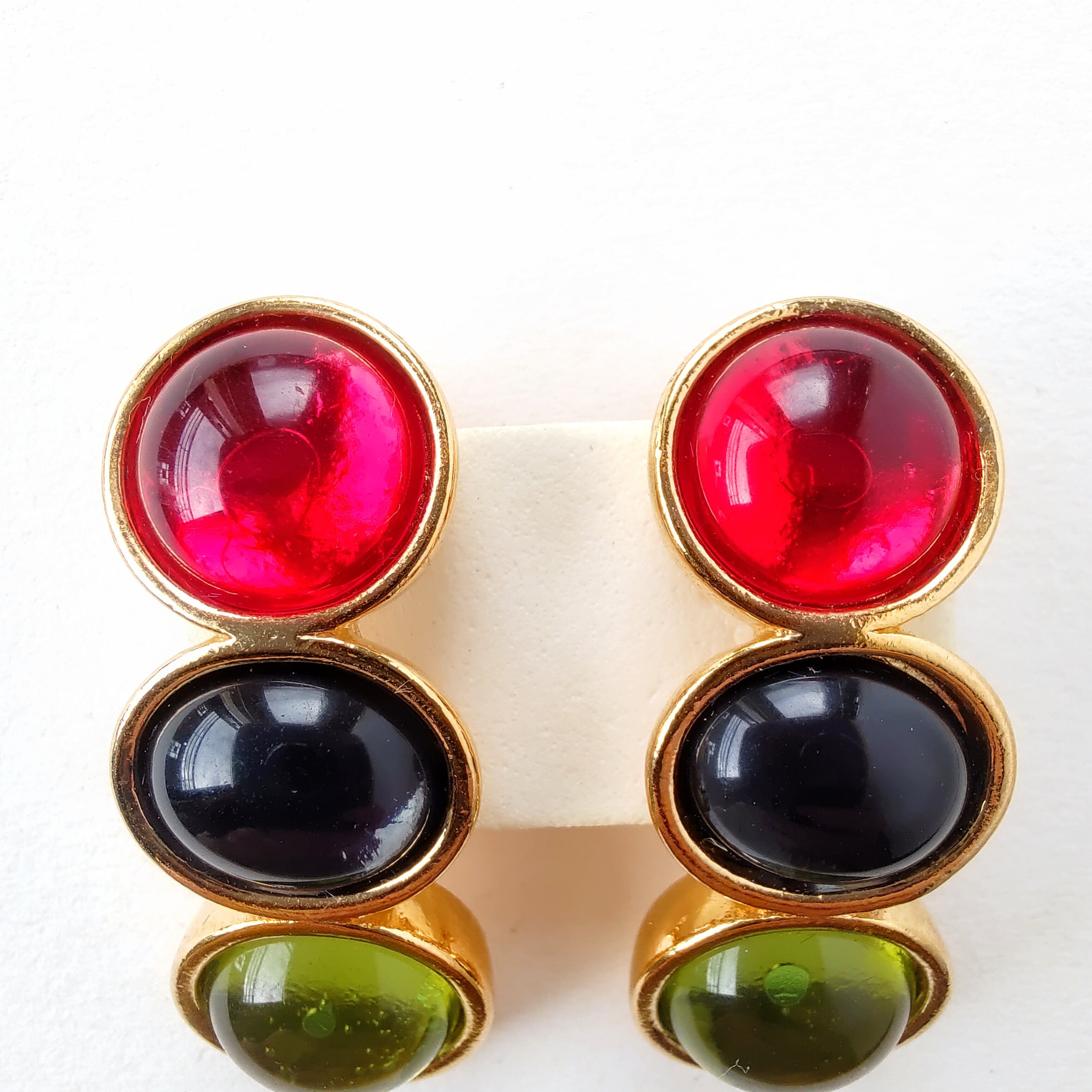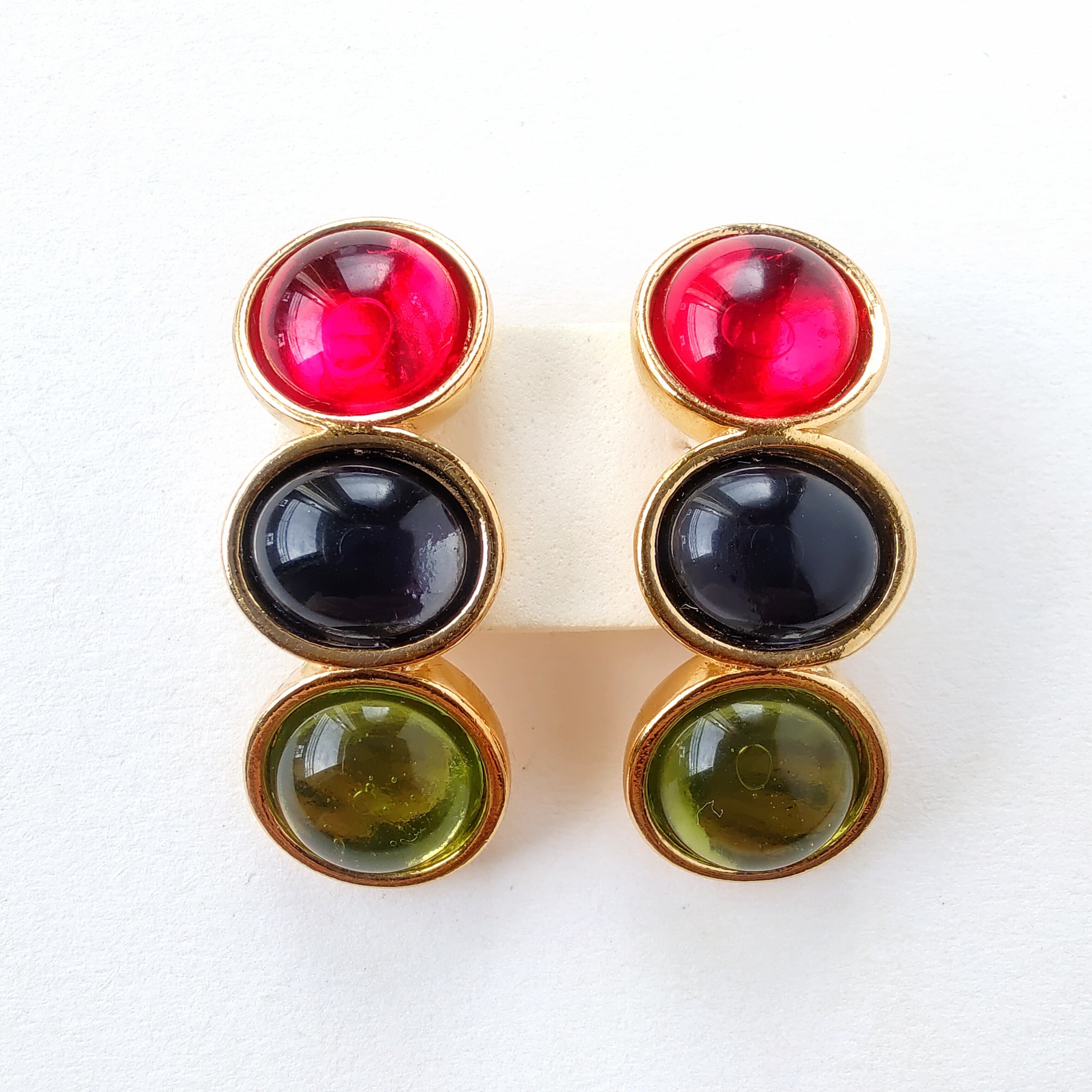ゴールドのベースメタルに透明感のあるラウンド型のレッド、オーバル型のブルー、ラウンド型のグリーンのガラスカボションが縦に並んだデザインのヴィンテージイヤリングです。