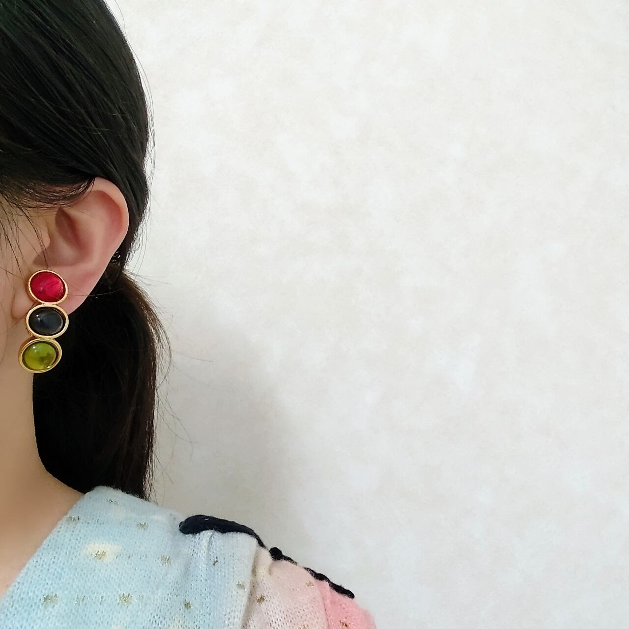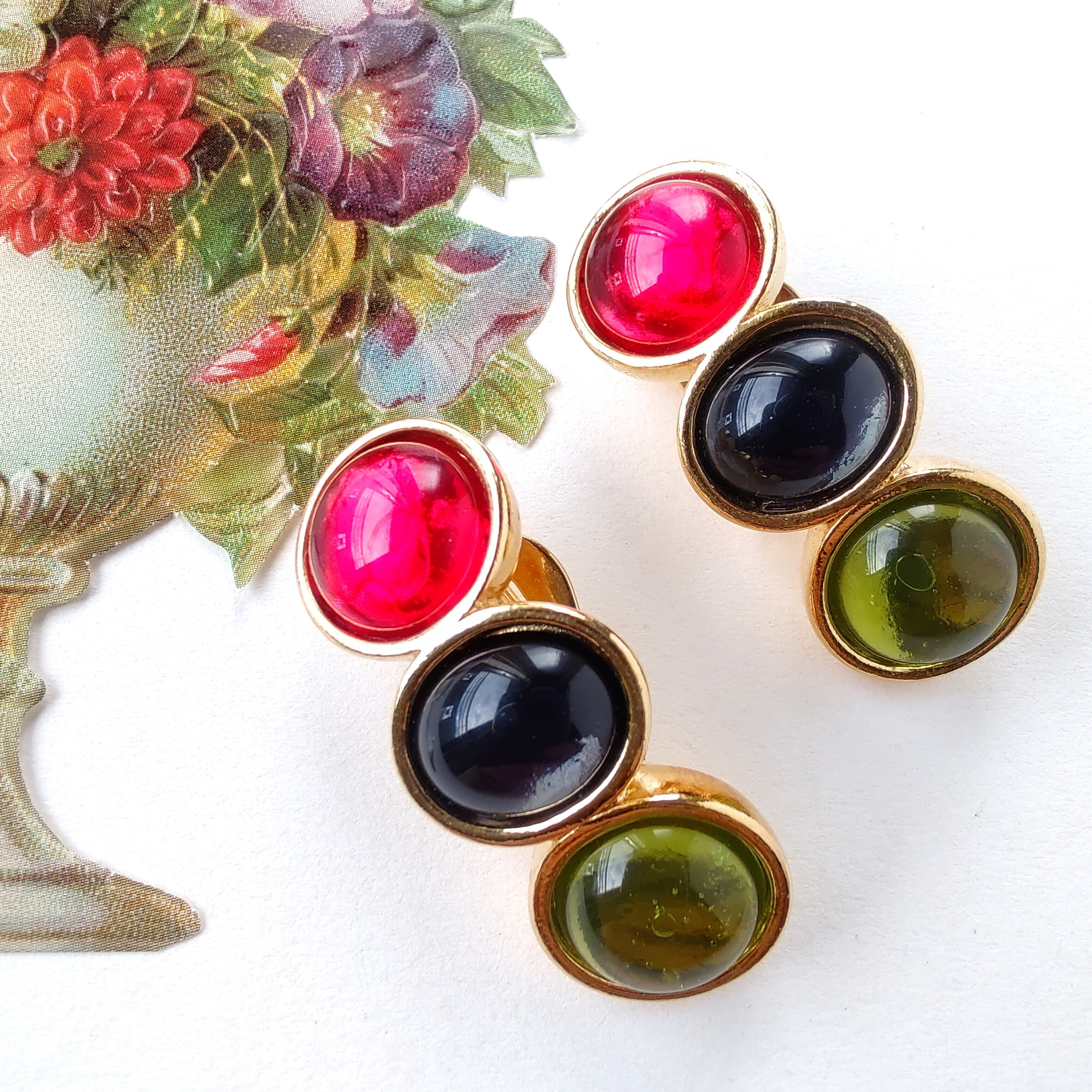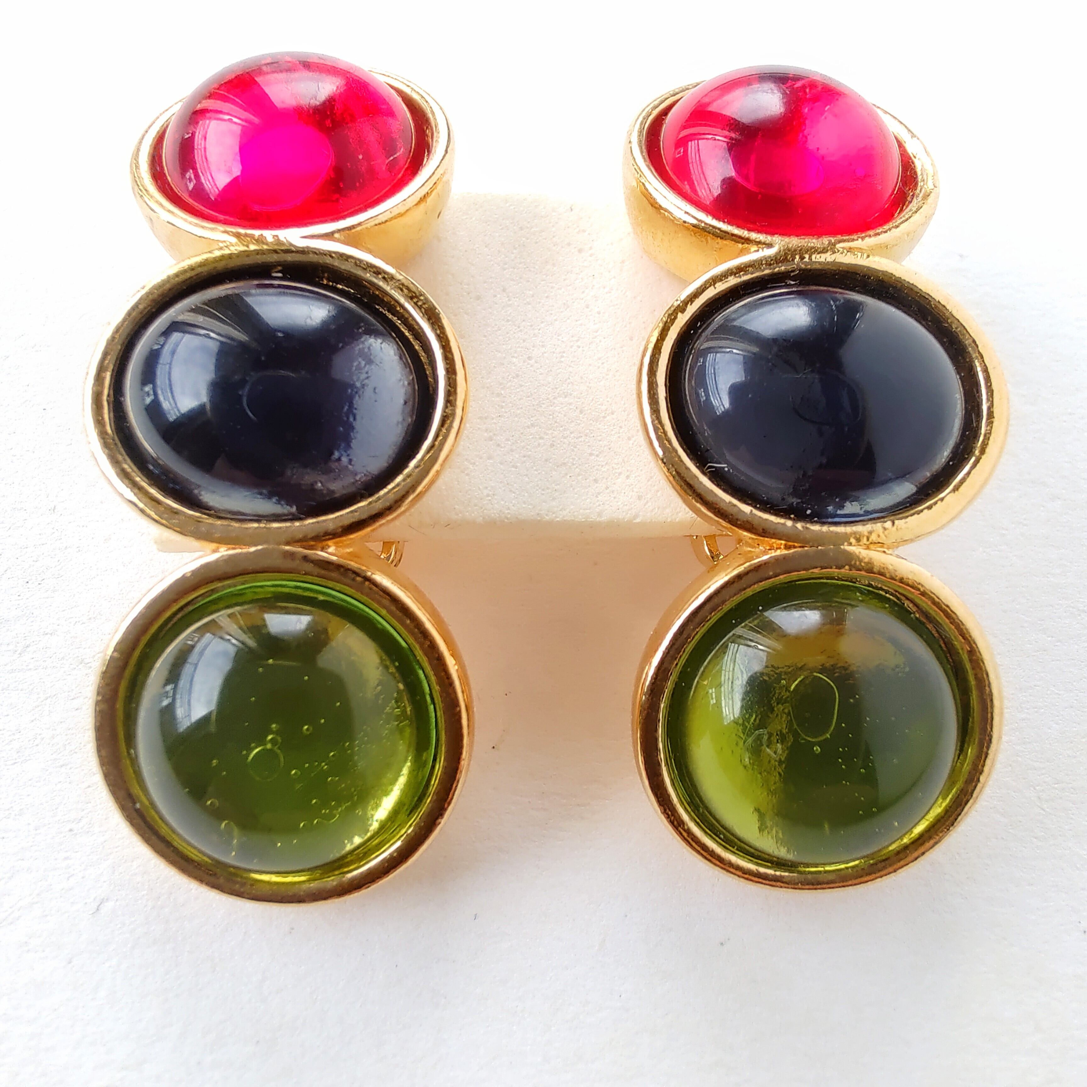ゴールドのベースメタルに透明感のあるラウンド型のレッド、オーバル型のブルー、ラウンド型のグリーンのガラスカボションが縦に並んだデザインのヴィンテージイヤリングです。