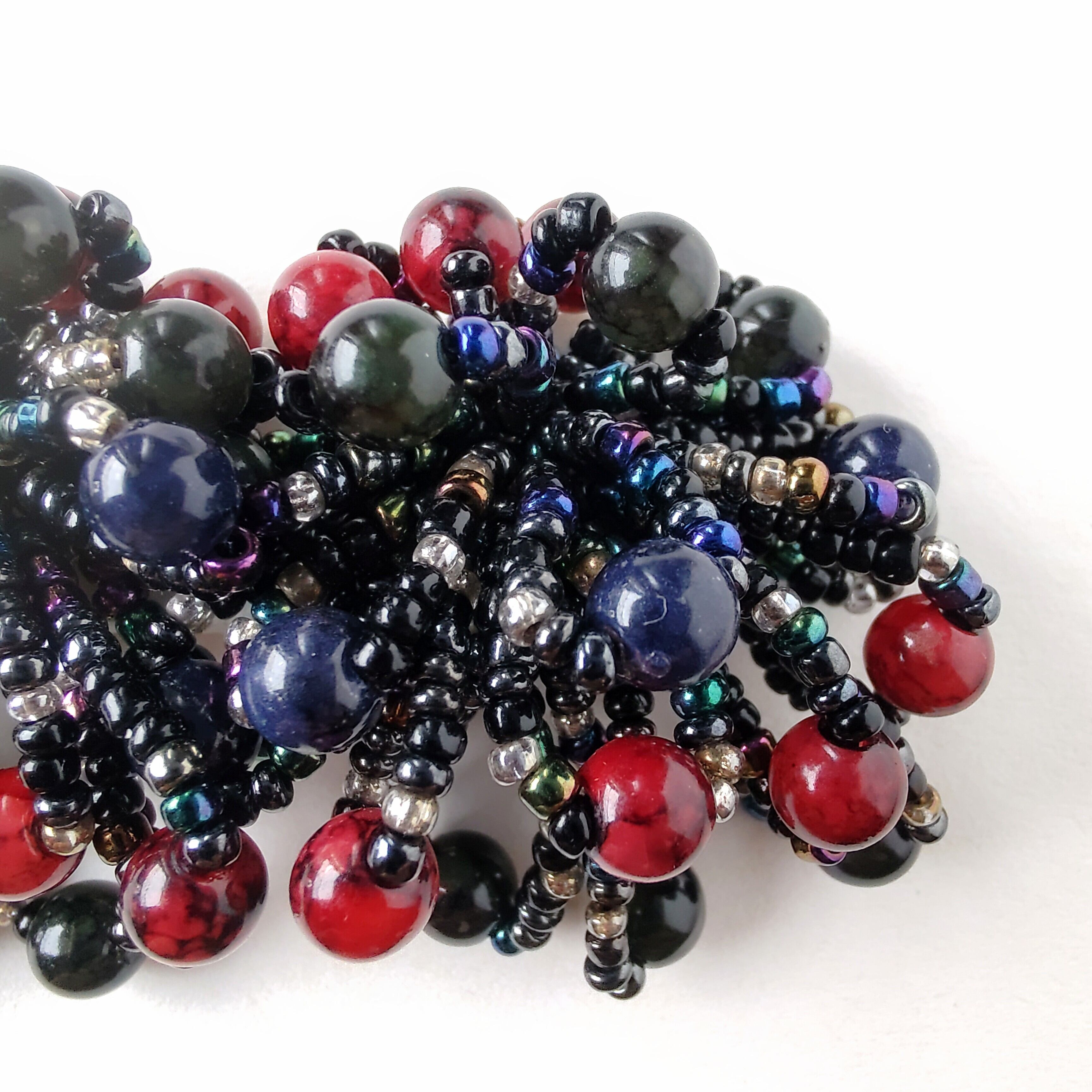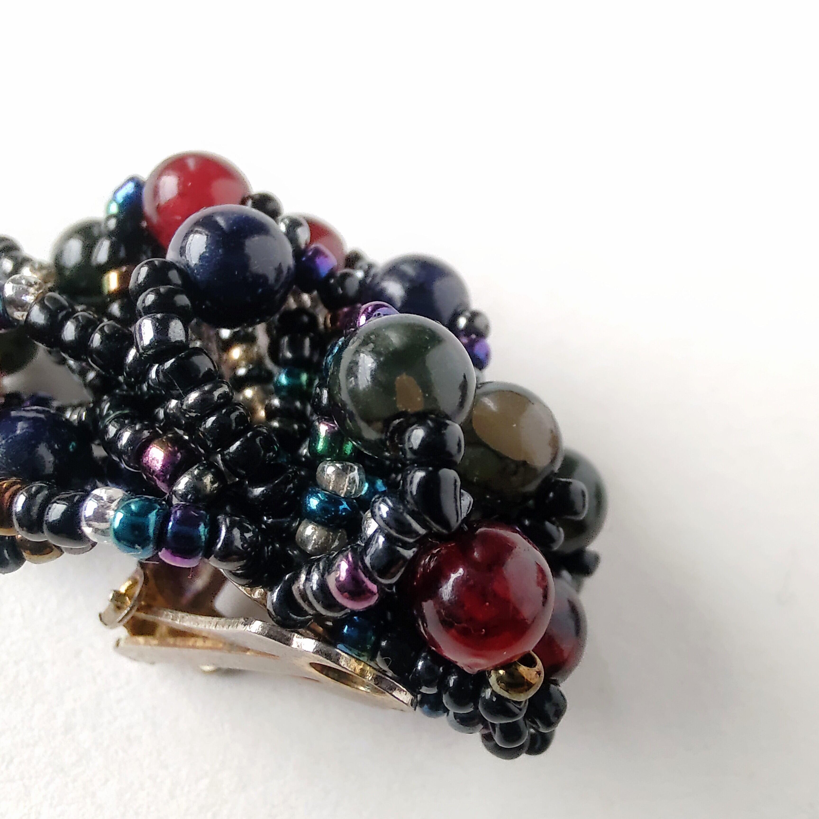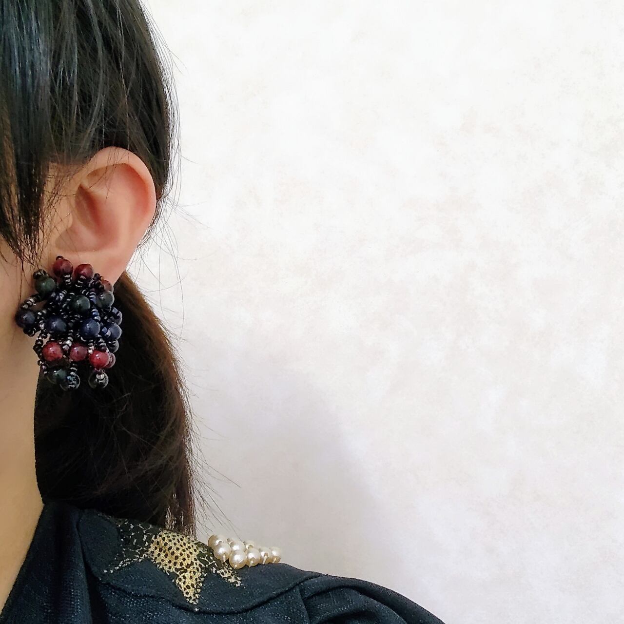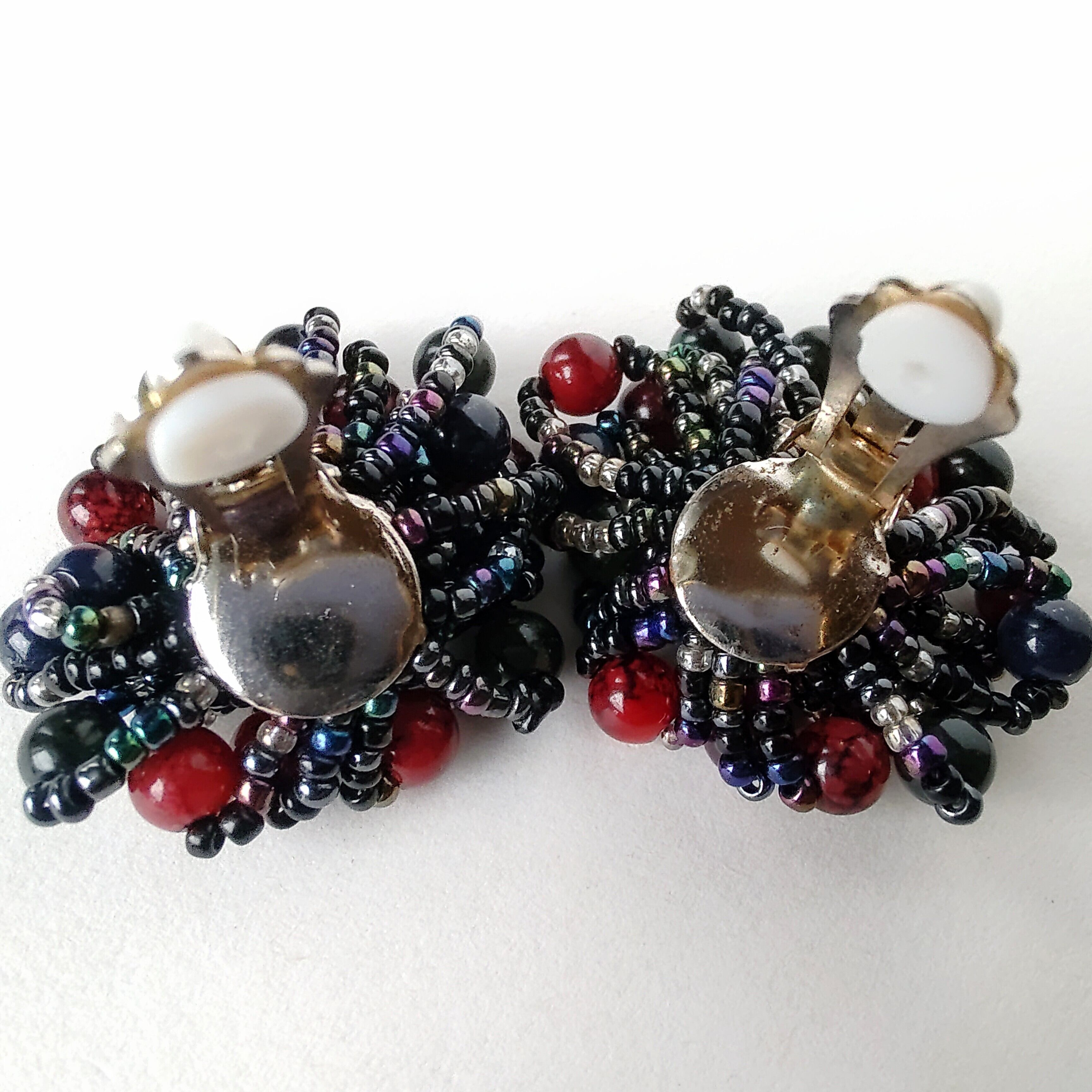 ネイビー、レッド、モスグリーンのビーズがじゃらじゃらと垂れ下がったデザインのヴィンテージイヤリングです。