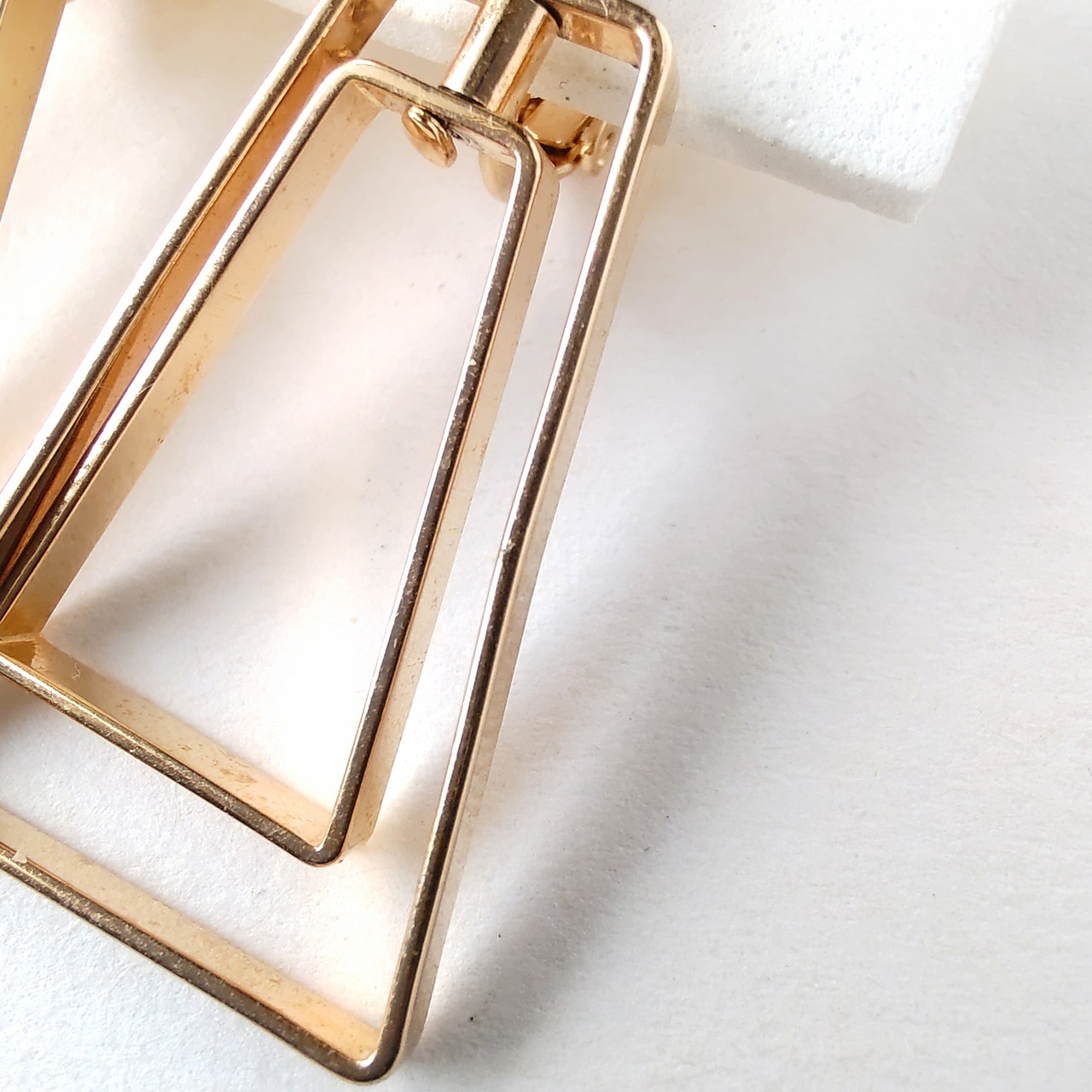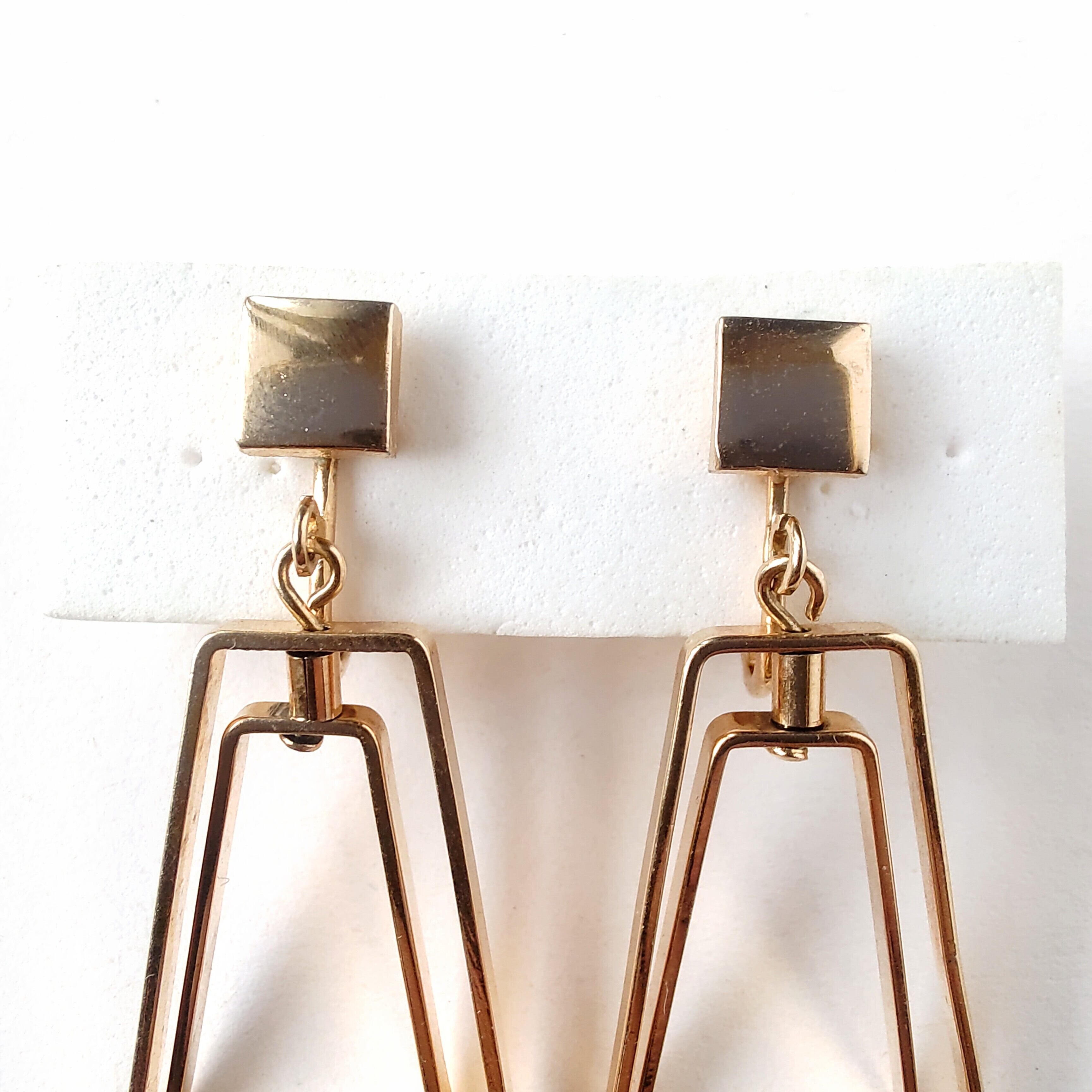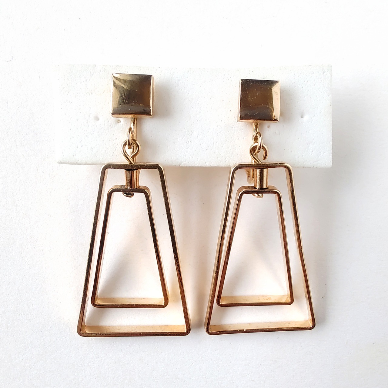 1886年アメリカのニューヨークにて小さな香水会社を創業、1971年に本格的にコスチュームジュエリーの製作を開始したAvon(エイボン)の1977年に販売された“Sweet Whispers”のゴールドメタルの大きさの異なる台形のフープが2重になったデザインの揺れるタイプのヴィンテージイヤリングです。