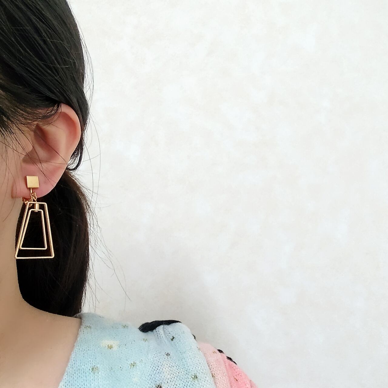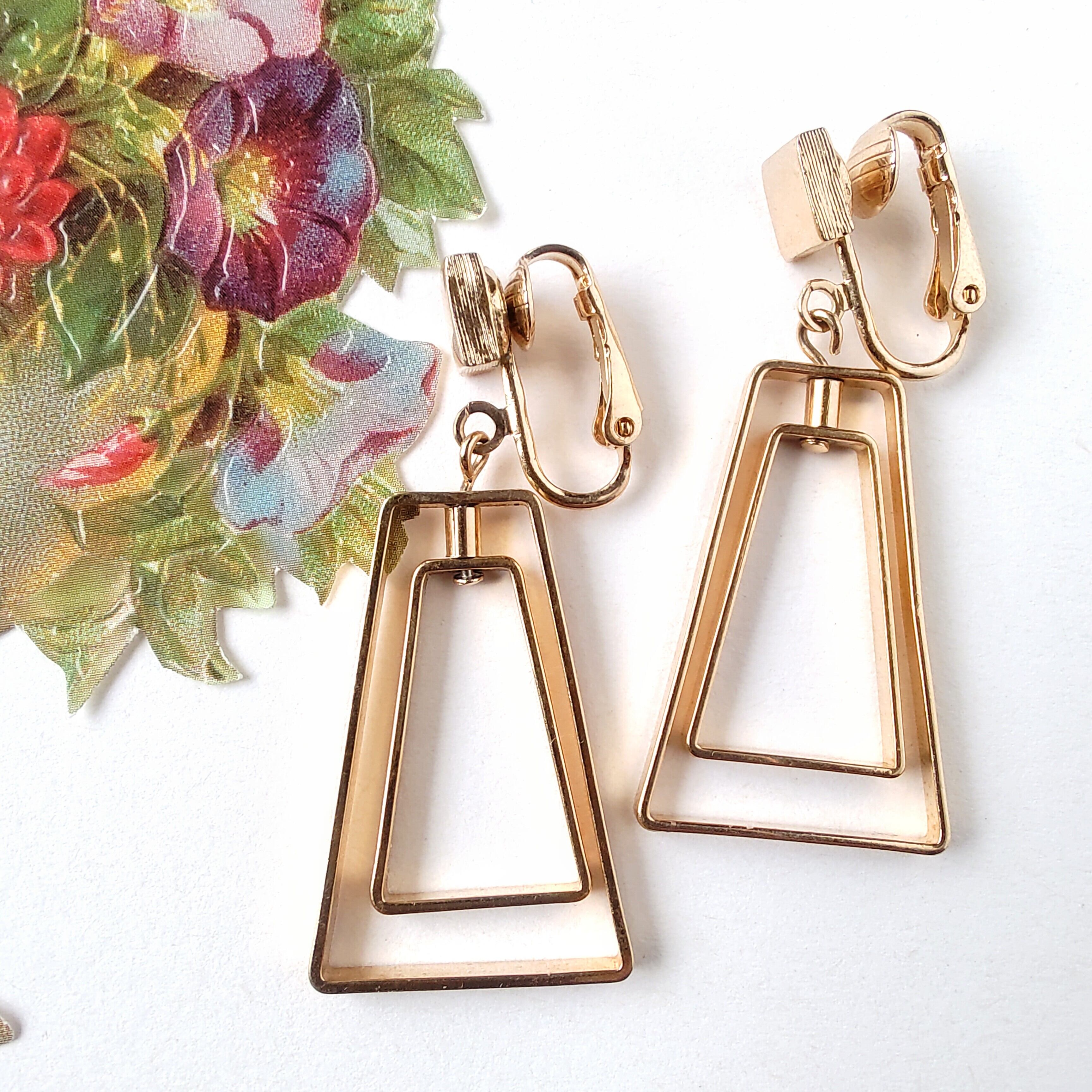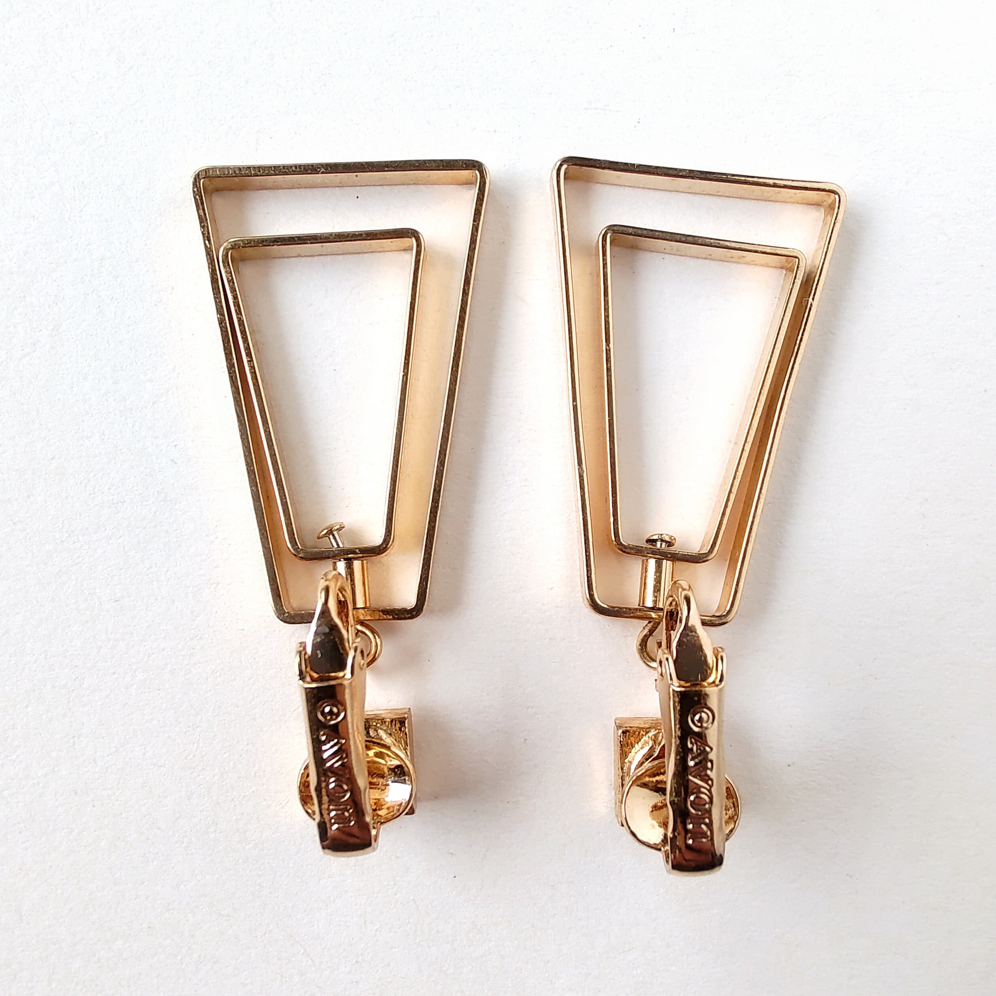 1886年アメリカのニューヨークにて小さな香水会社を創業、1971年に本格的にコスチュームジュエリーの製作を開始したAvon(エイボン)の1977年に販売された“Sweet Whispers”のゴールドメタルの大きさの異なる台形のフープが2重になったデザインの揺れるタイプのヴィンテージイヤリングです。