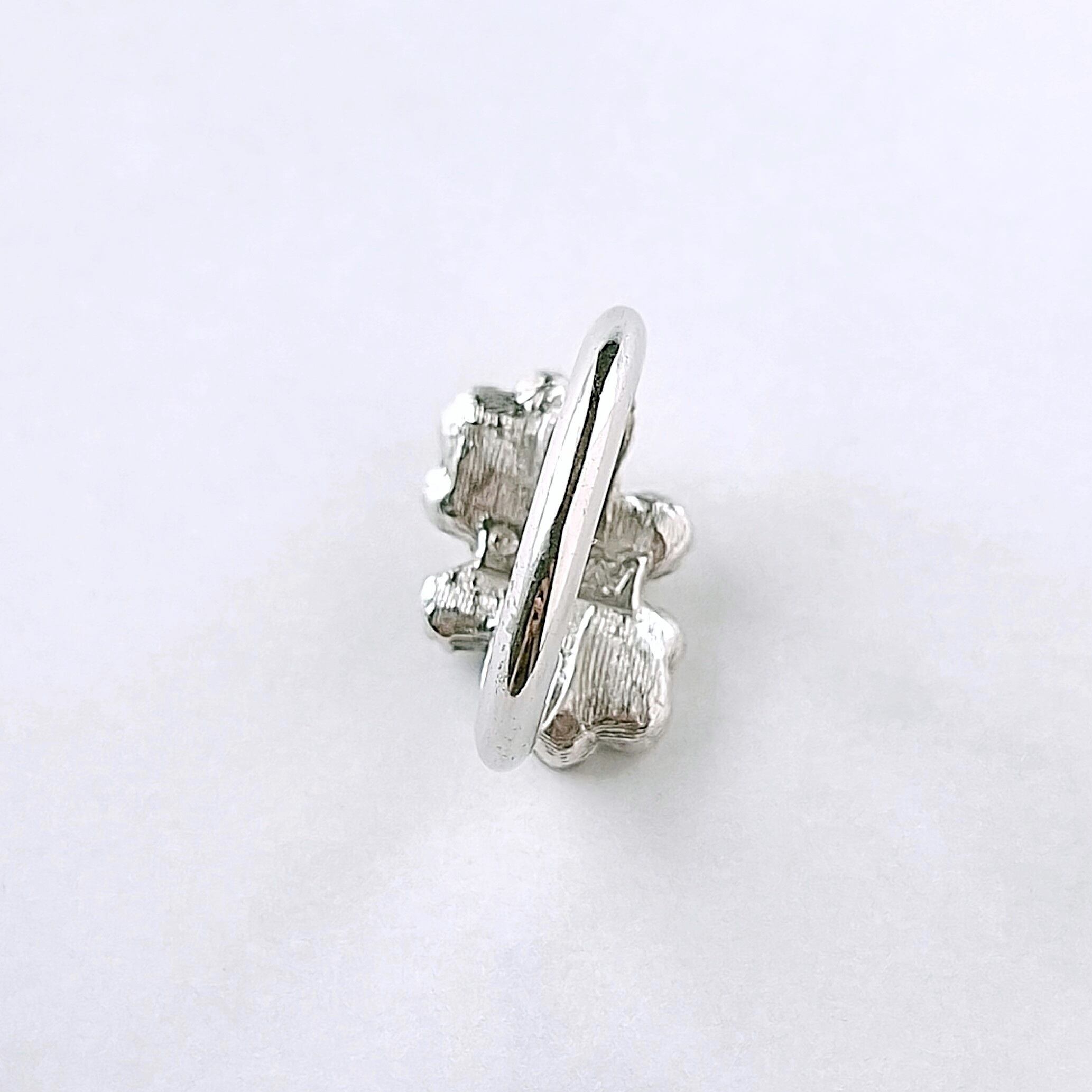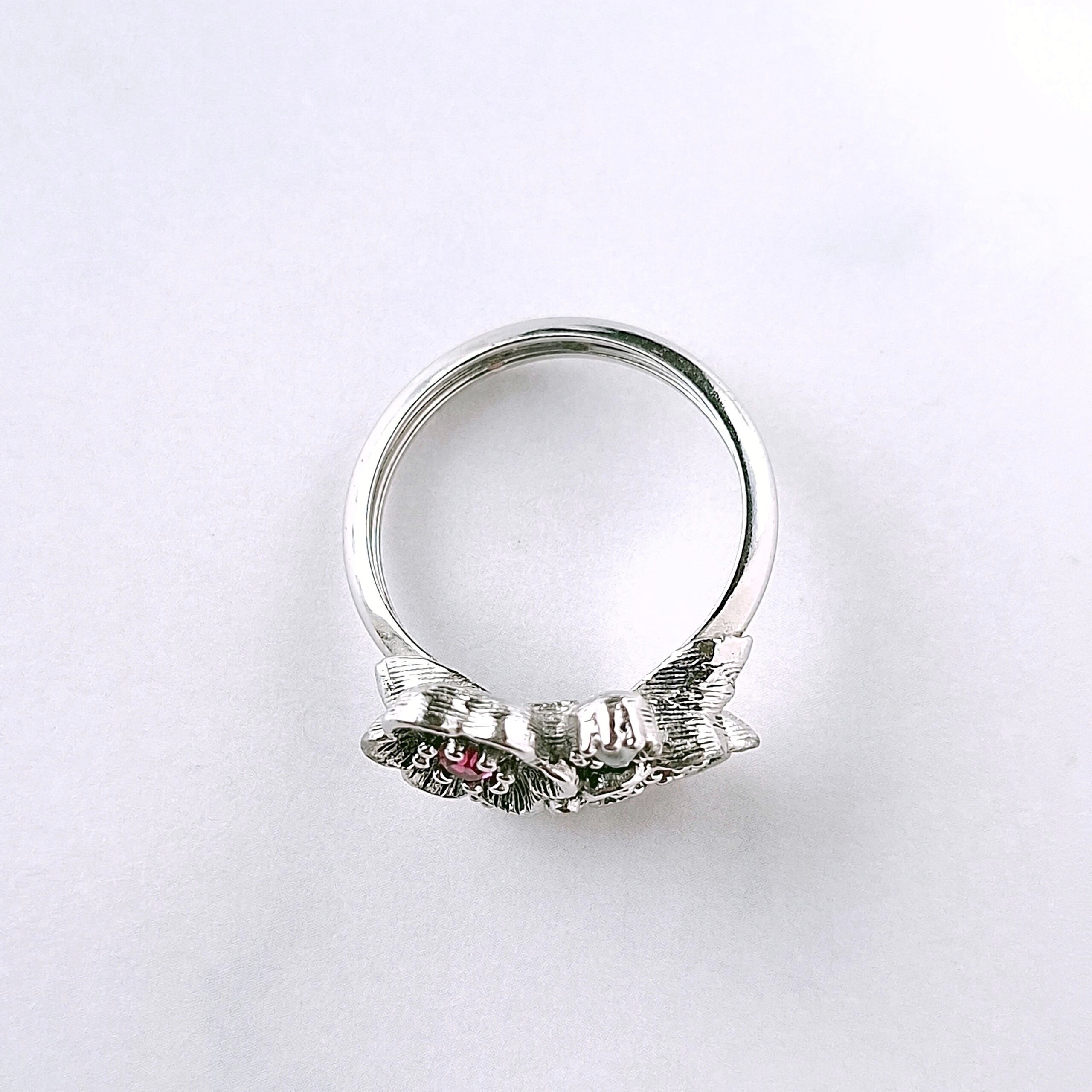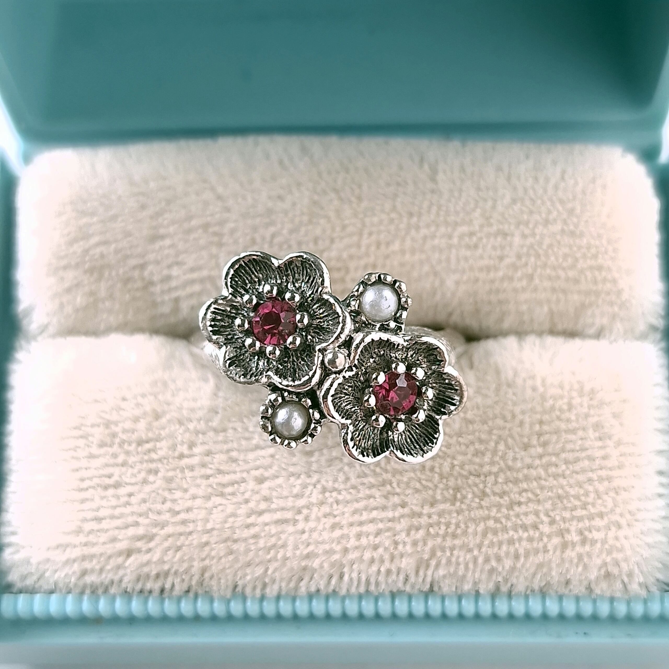 1886年アメリカのニューヨークにて小さな香水会社を創業、1971年に本格的にコスチュームジュエリーの製作を開始したAvon(エイボン)の1974年に販売された“Rosegay”のシルバーメタルのフラワーにマゼンタカラーのラインストーンとグレー掛かったフェイクパールがあしらわれたヴィンテージリングです。