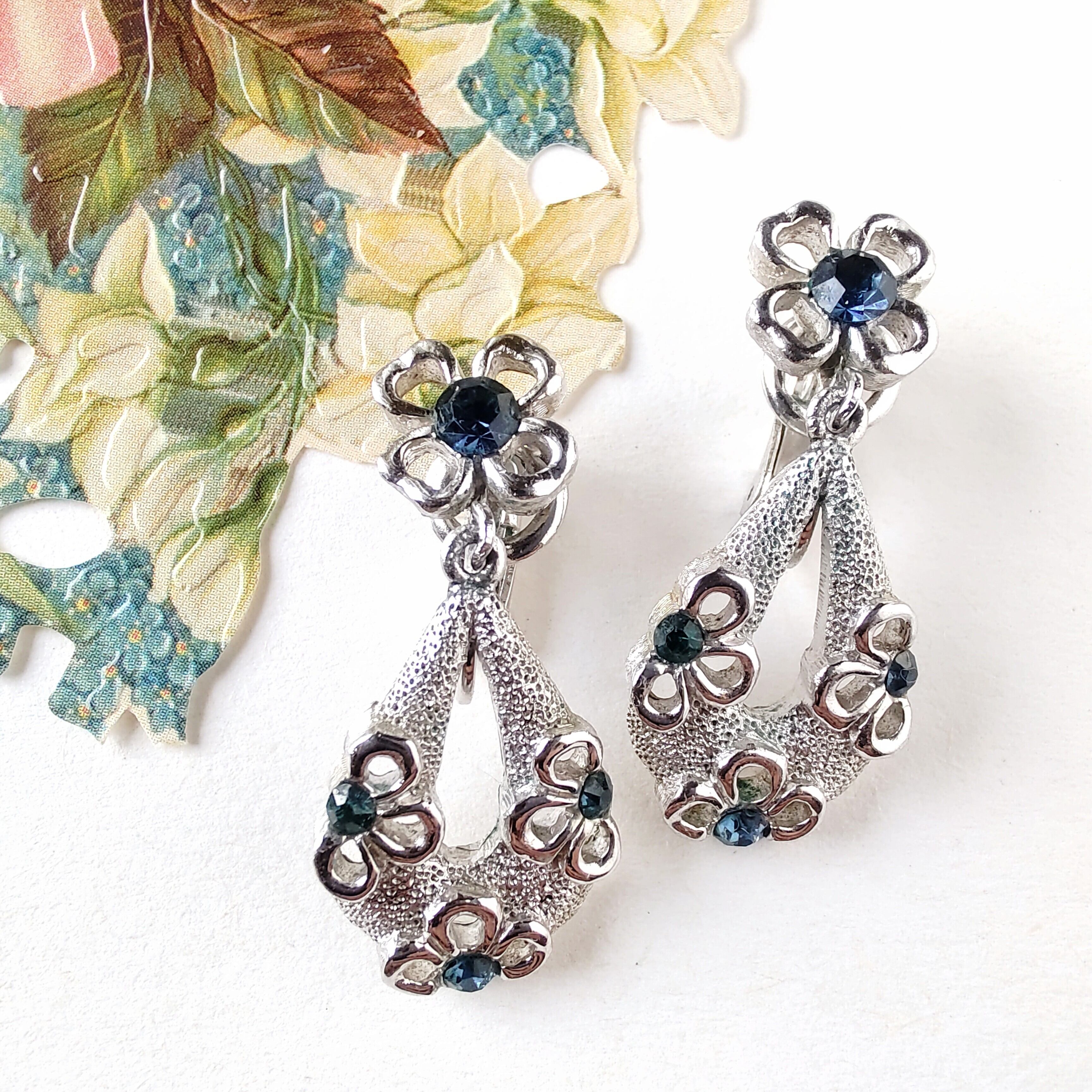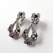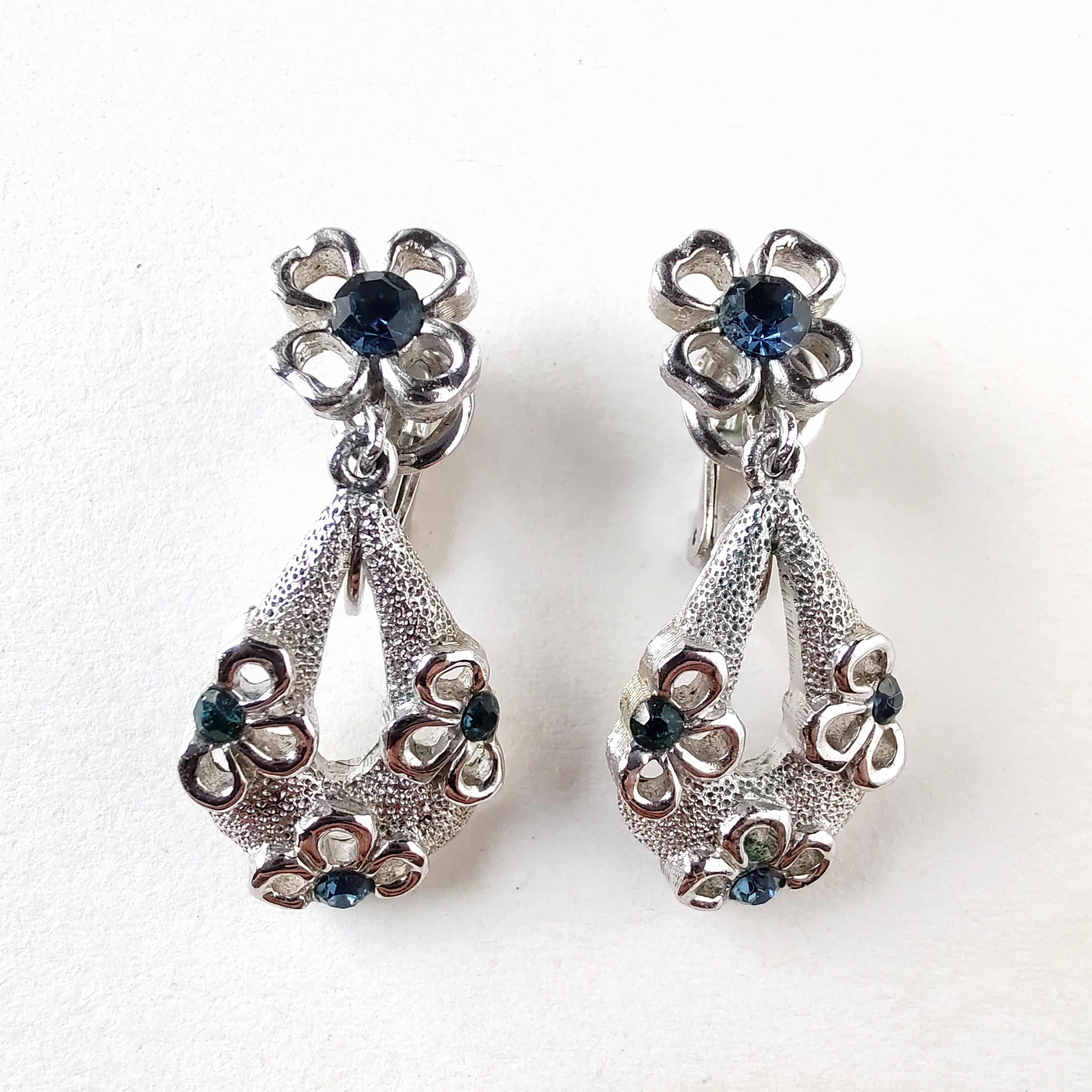 1910年にニューヨークにて創業した老舗コスチュームジュエリーメーカーTRIFARI(トリファリ)の中央にブルーのラインストーンがあしらわれたフラワーの形にくり抜かれたドロップ型のシルバーメタルがフラワーの下で揺れるデザインのヴィンテージイヤリングです。