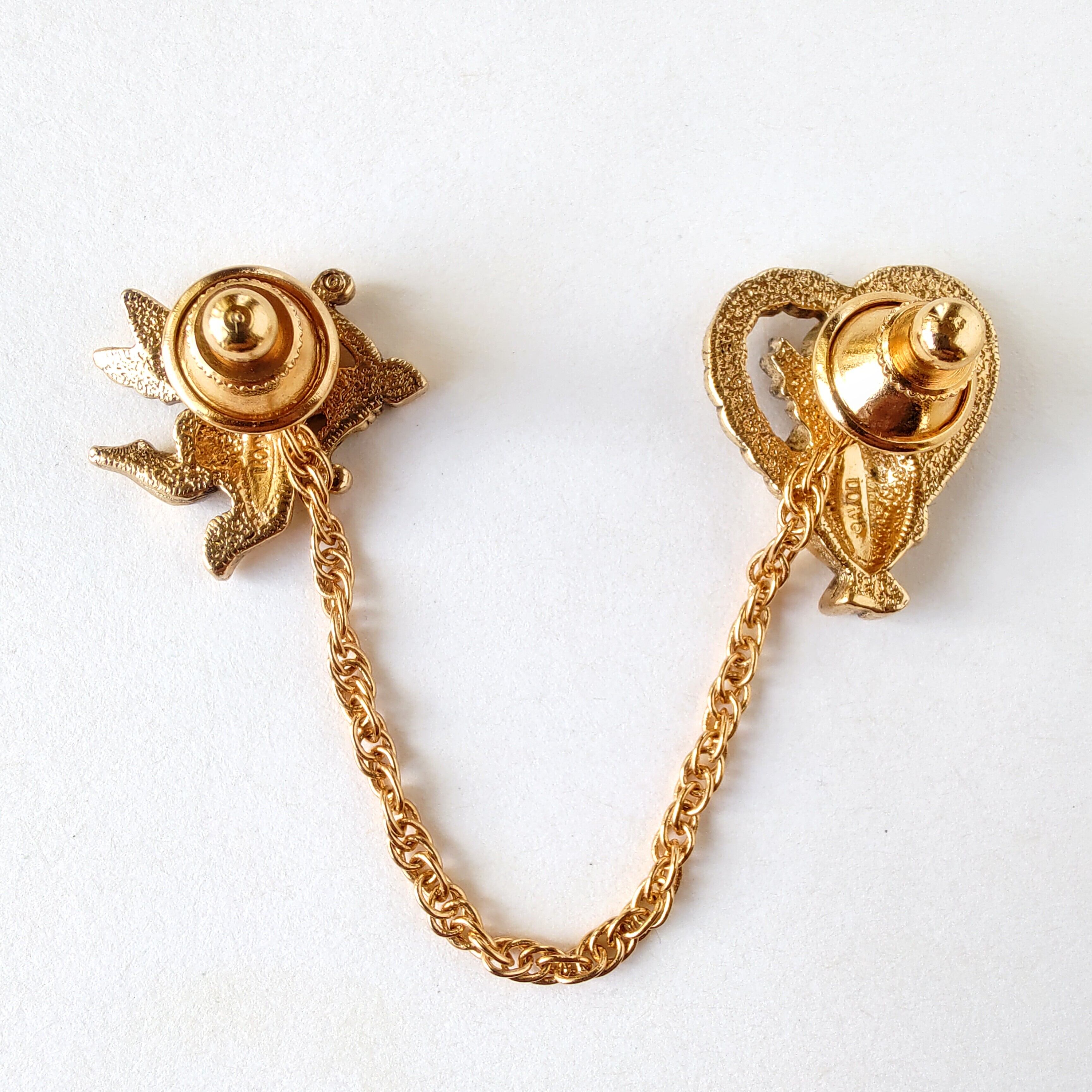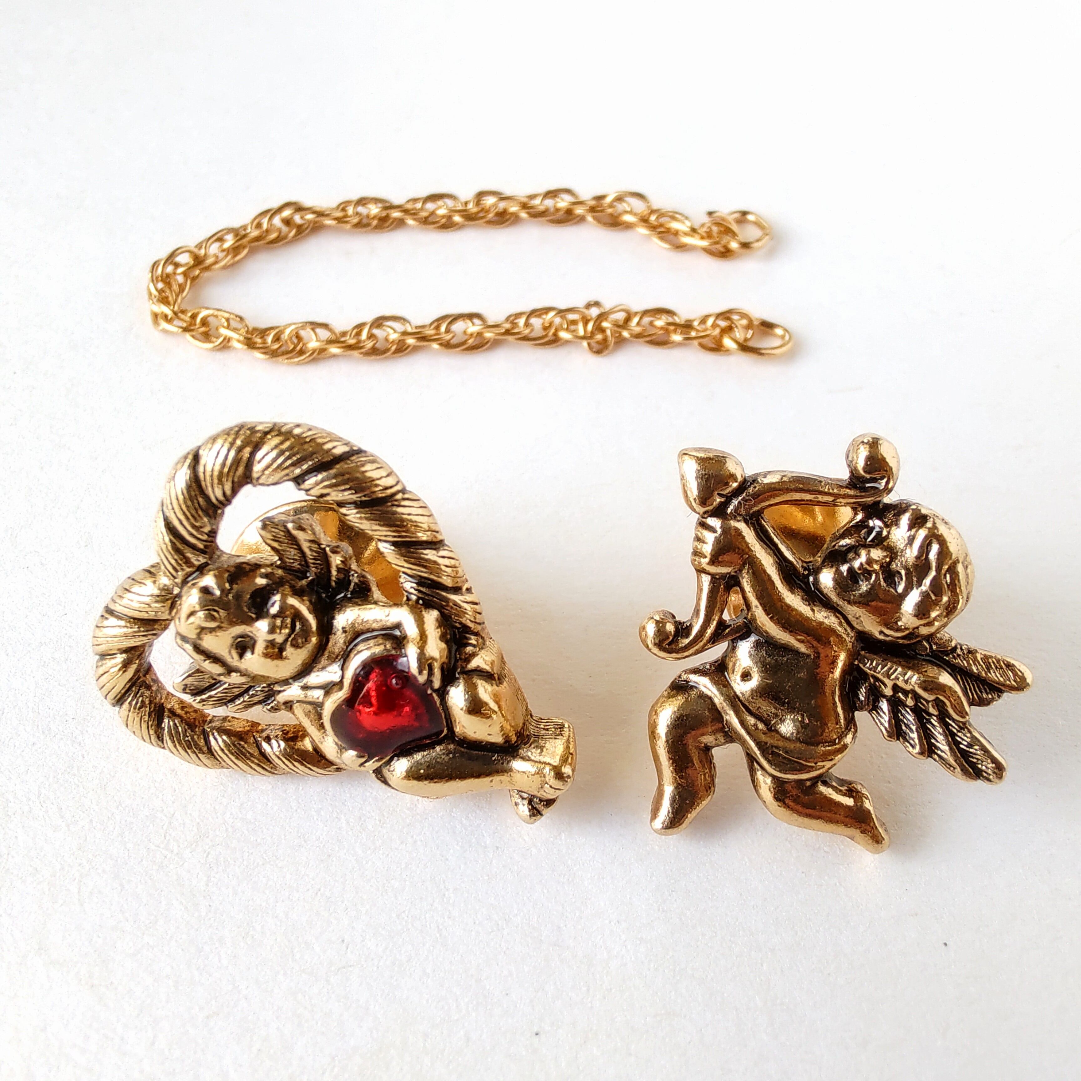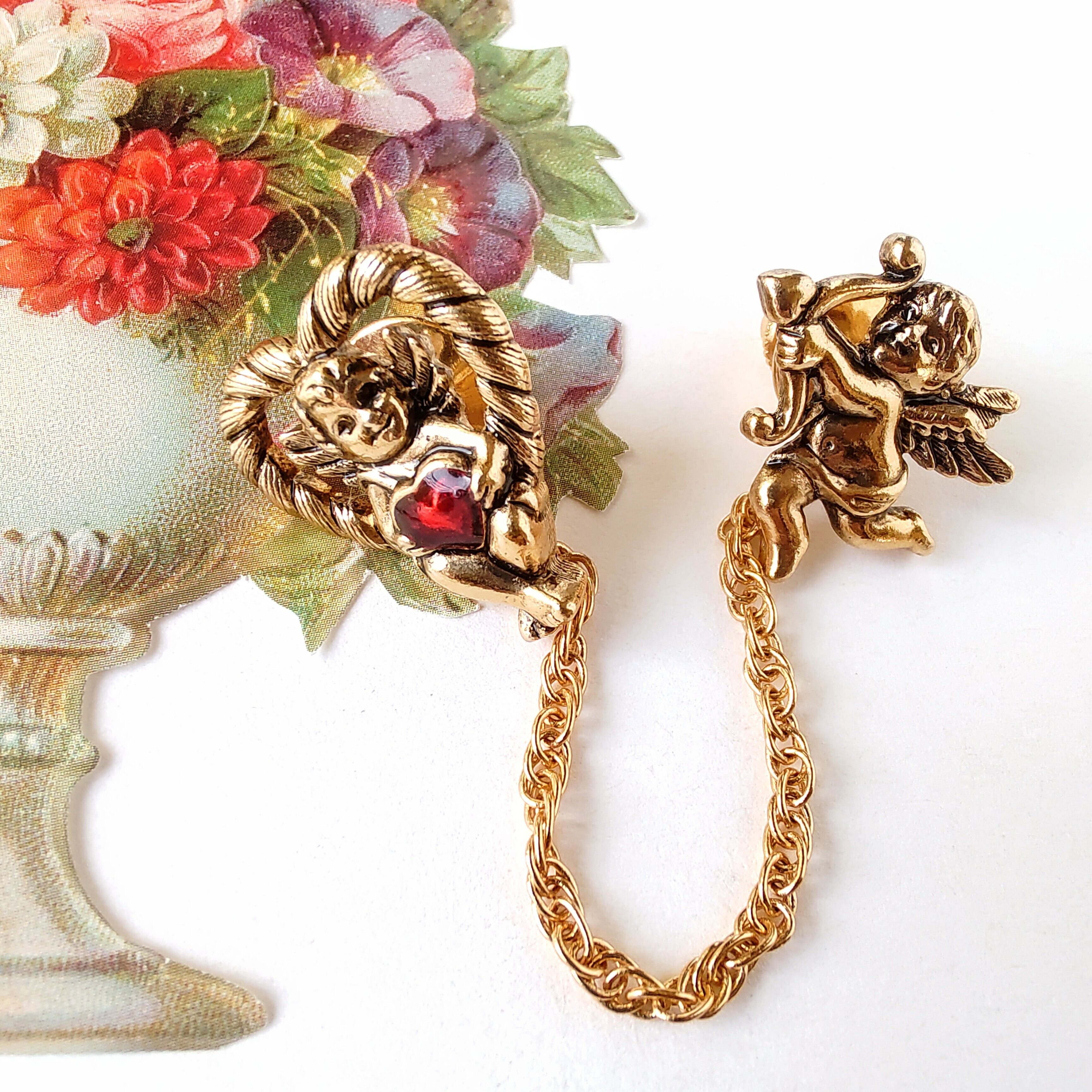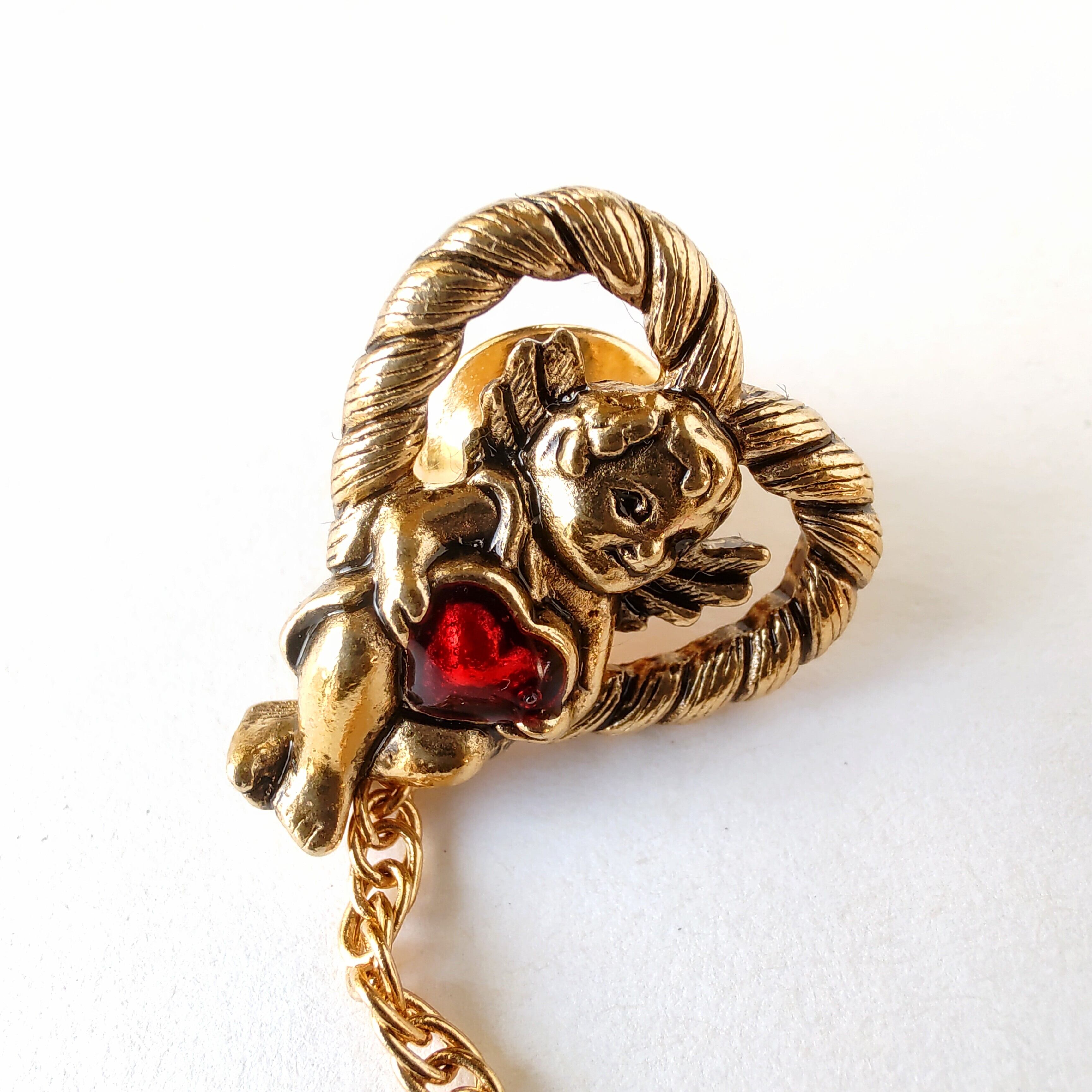 1886年アメリカのニューヨークにて小さな香水会社を創業、1971年に本格的にコスチュームジュエリーの製作を開始したAvon(エイボン)の1994年に販売された“Captivating Cupids Pin”の黒ずみ加工が施されたゴールドメタルの赤いハートを持ったキューピッドと矢を持ったキューピッドがチェーンで繋がれたデザインのヴィンテージブローチです。