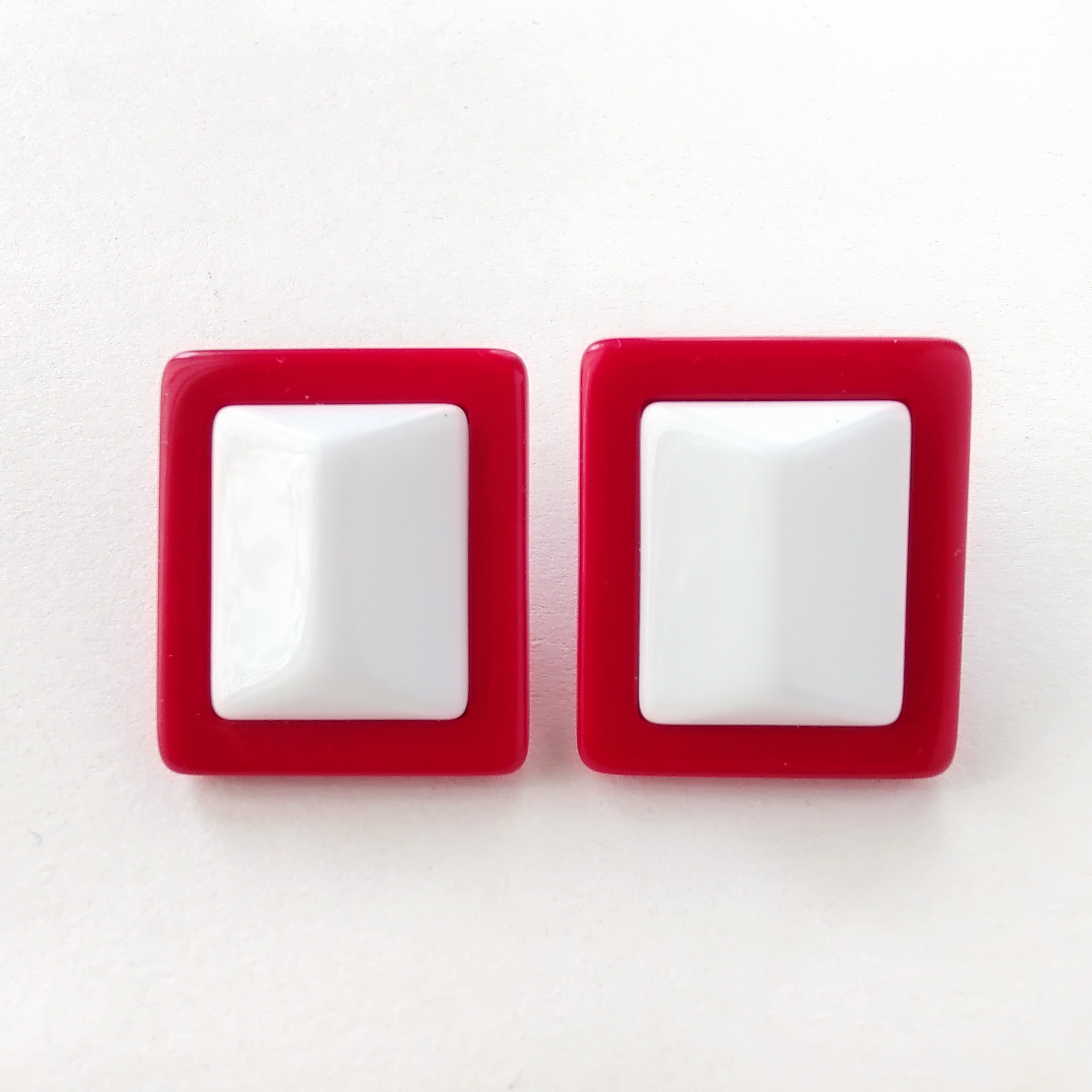 1886年アメリカのニューヨークにて小さな香水会社を創業、1971年に本格的にコスチュームジュエリーの製作を開始したAvon(エイボン)の1989年に販売された“classic lines”のレッドのプラスチックの中央に立体的なホワイトのプラスチックがあしらわれた長方形のヴィンテージピアスです。