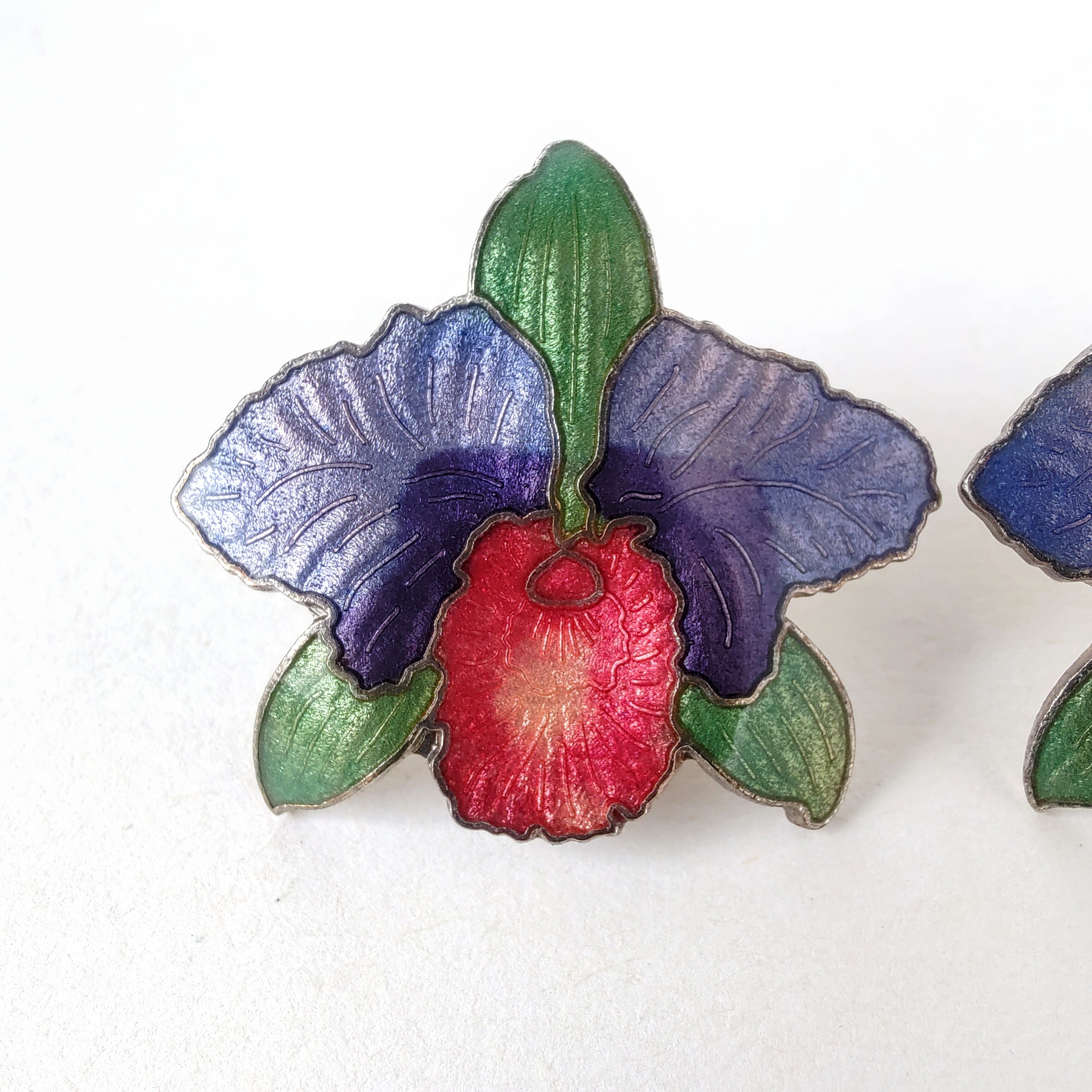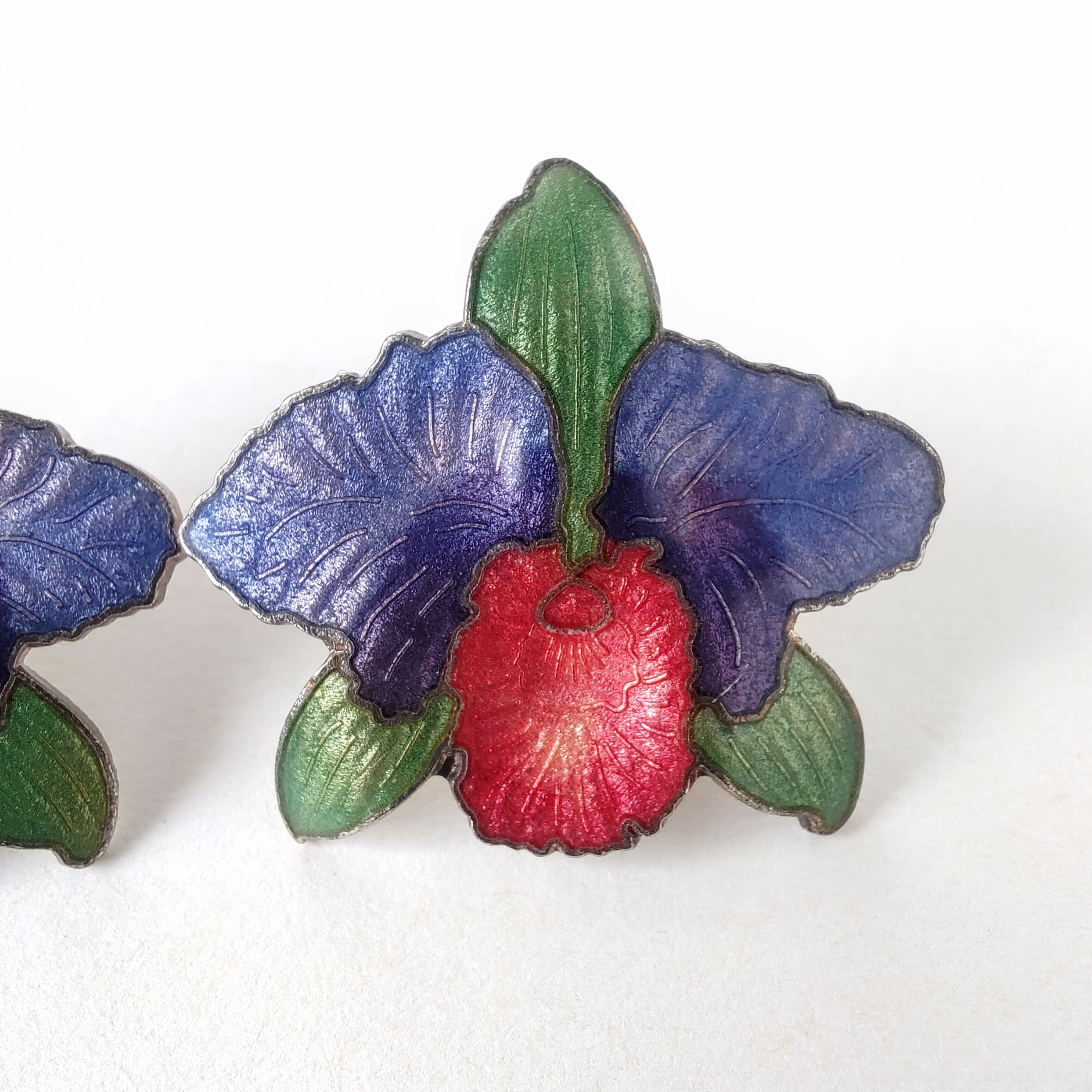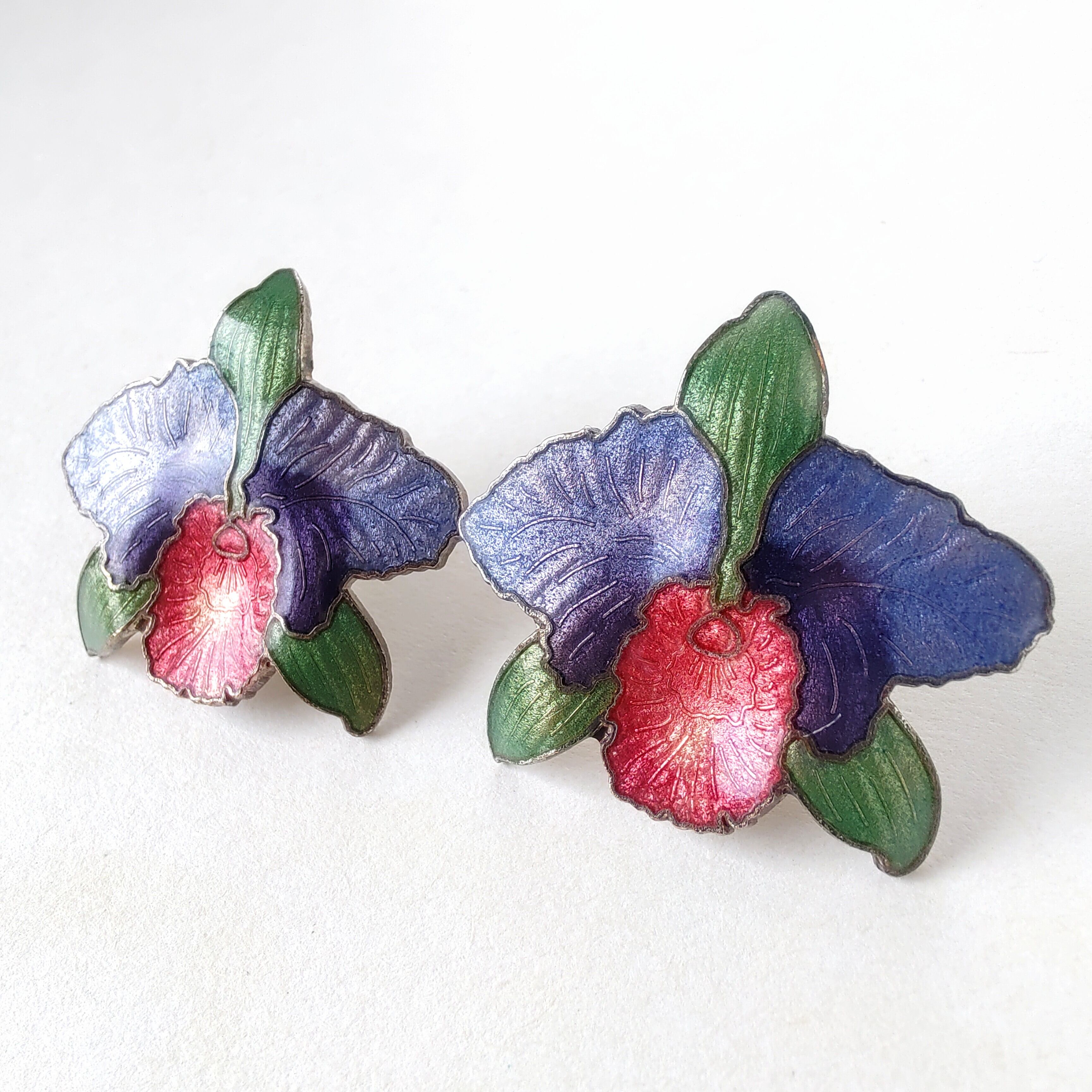 パープル、ピンク、グリーンのエナメルで色付けされた洋蘭の七宝焼のヴィンテージピアスです。