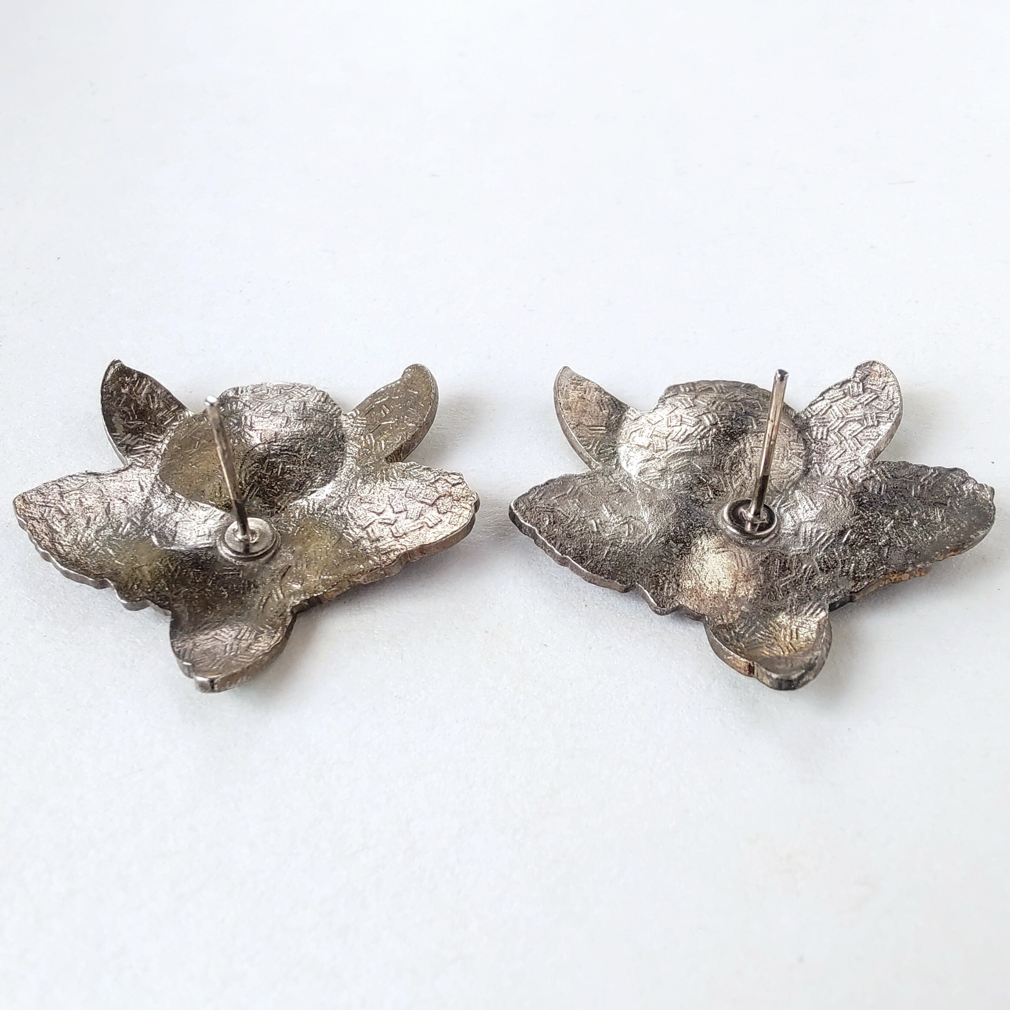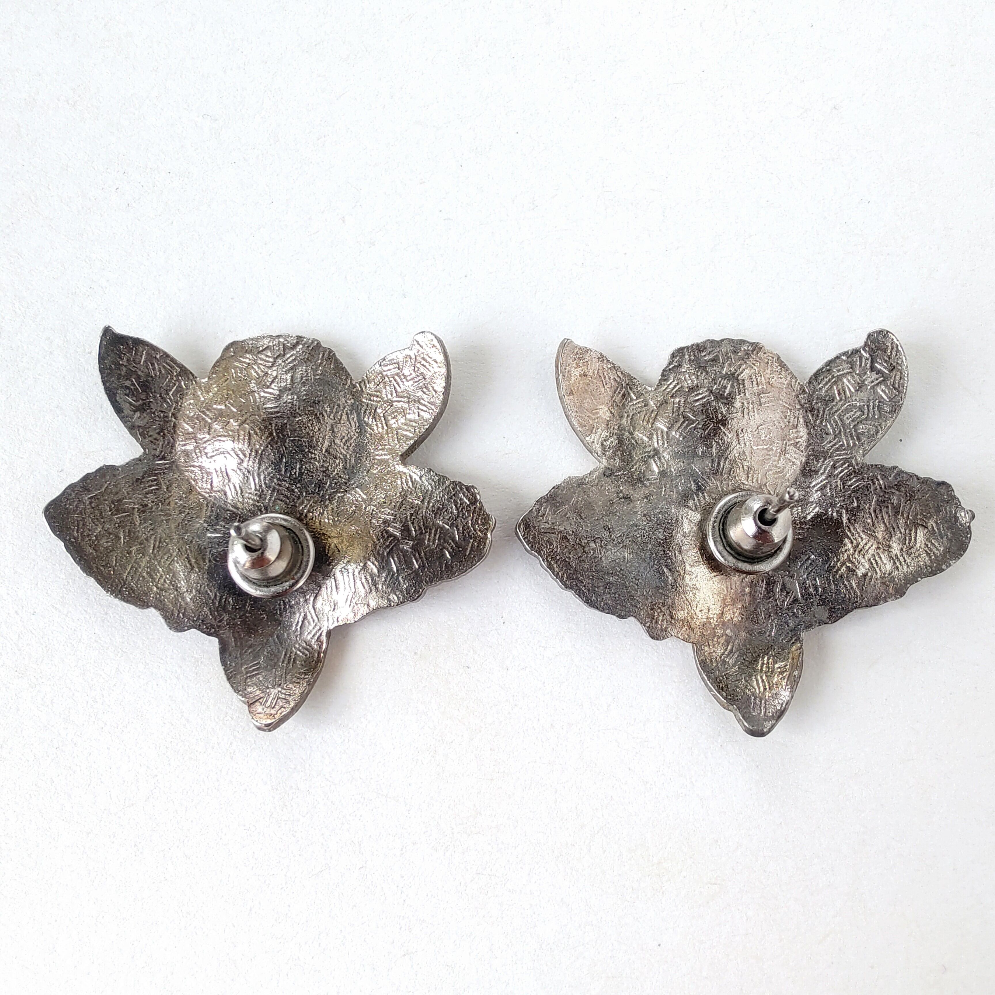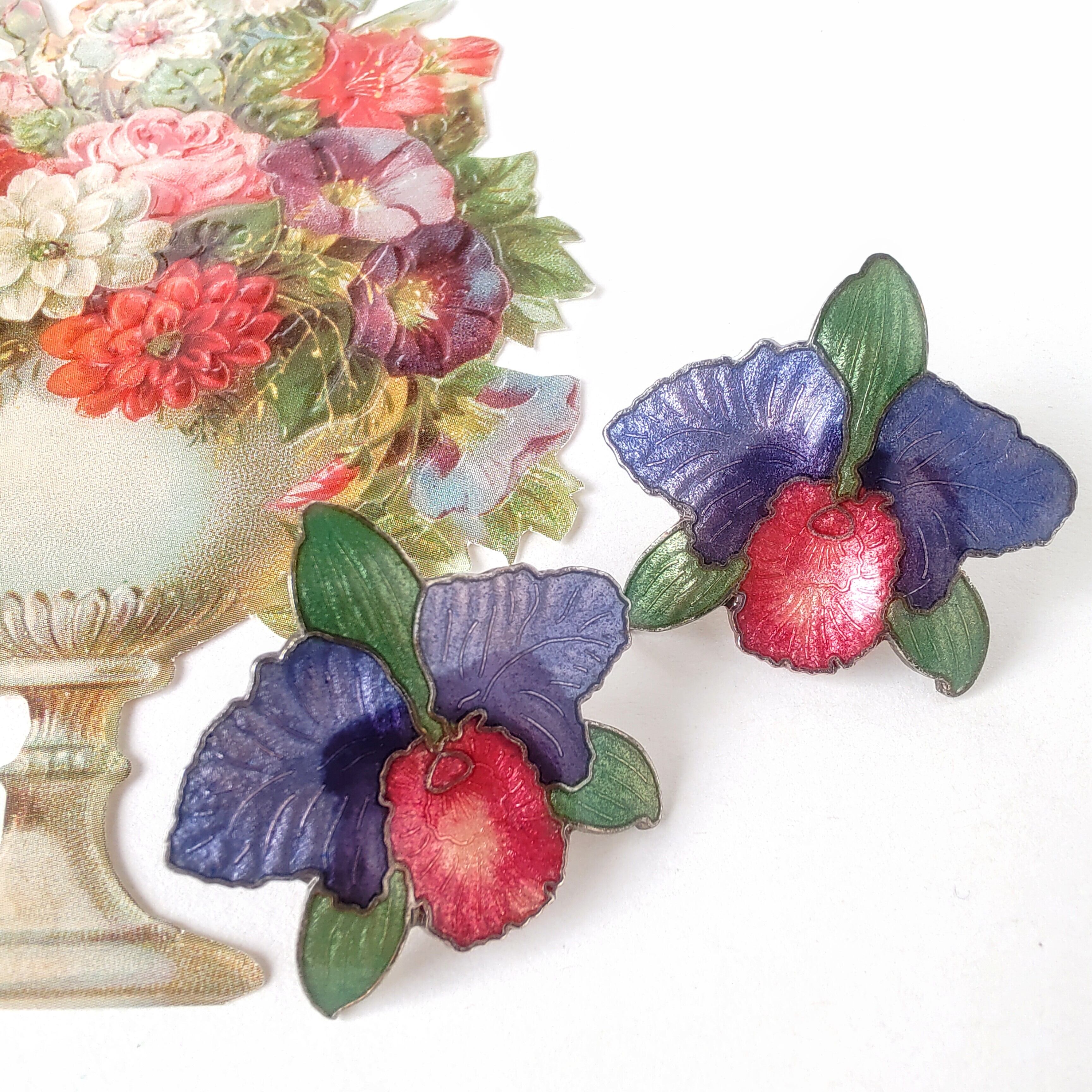 パープル、ピンク、グリーンのエナメルで色付けされた洋蘭の七宝焼のヴィンテージピアスです。