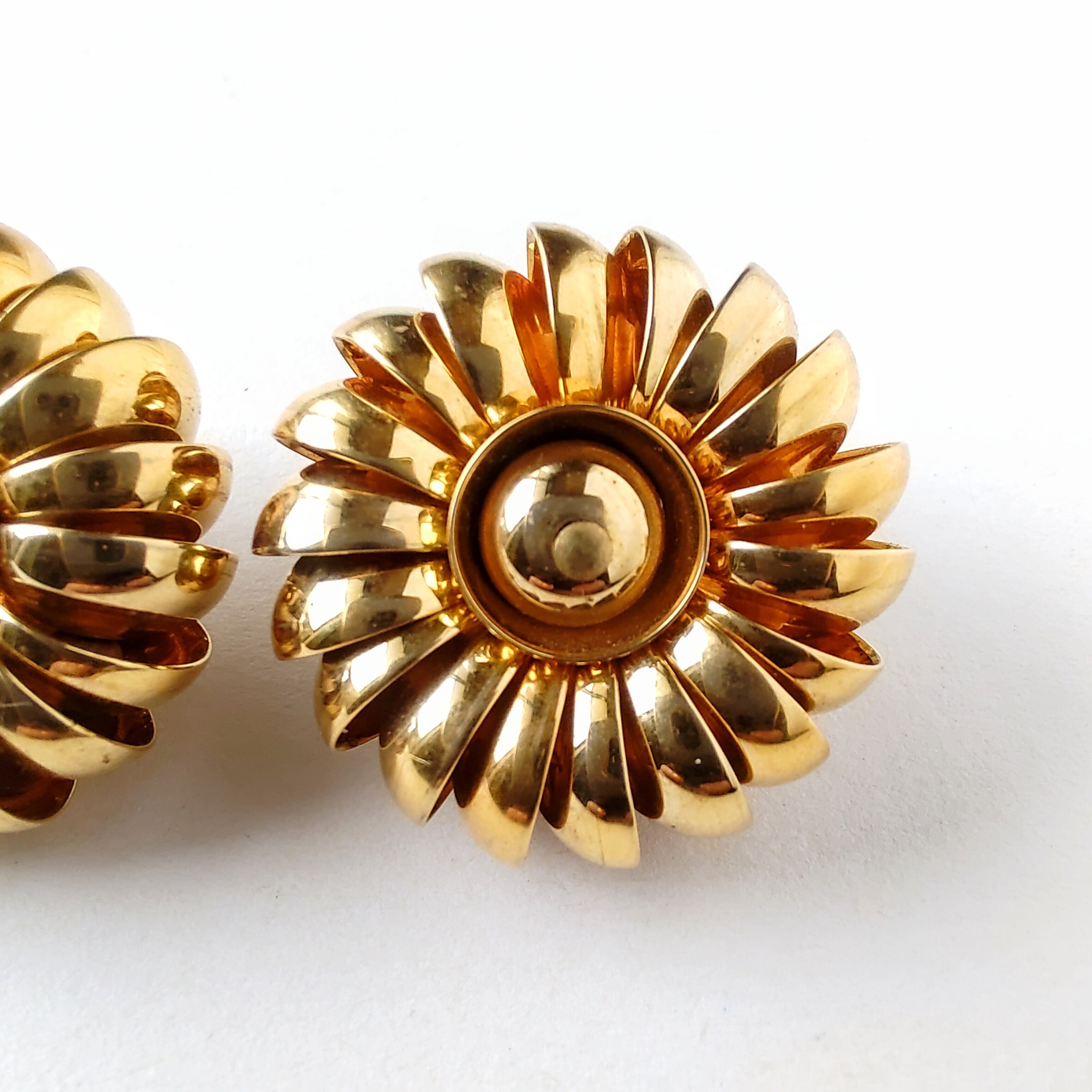 ドーム型のゴールドメタルをいくつも重ねて立体的なフラワーの形にデザインされたヴィンテージイヤリングです。