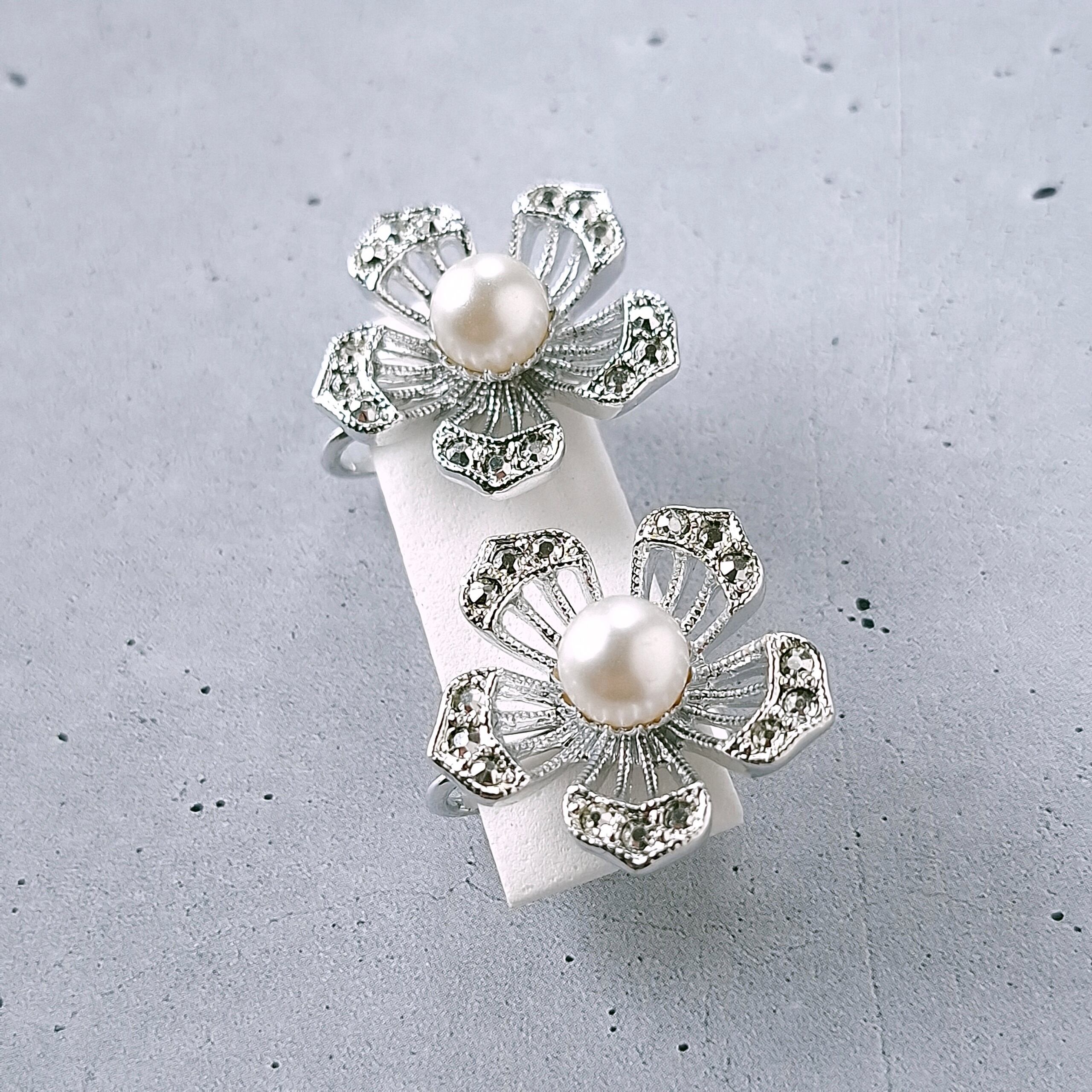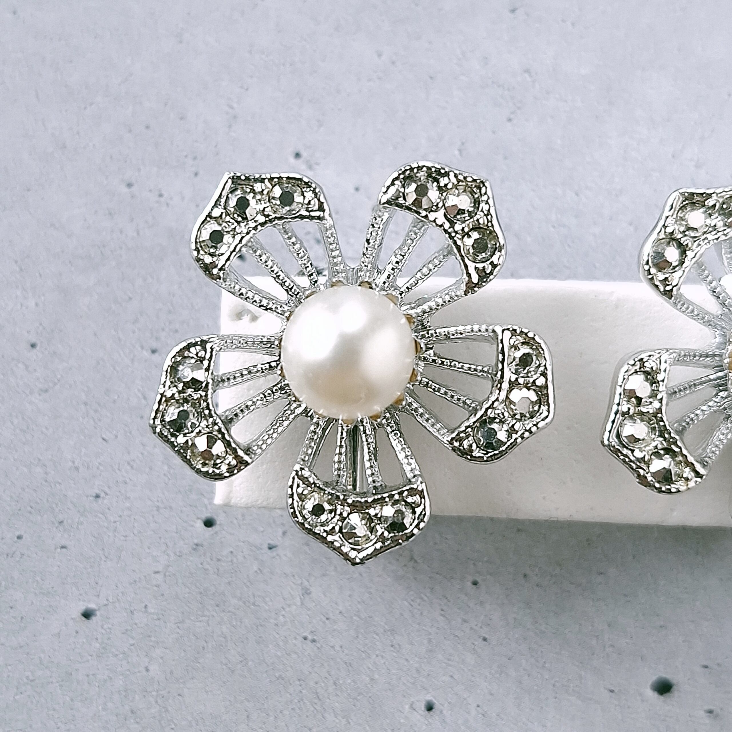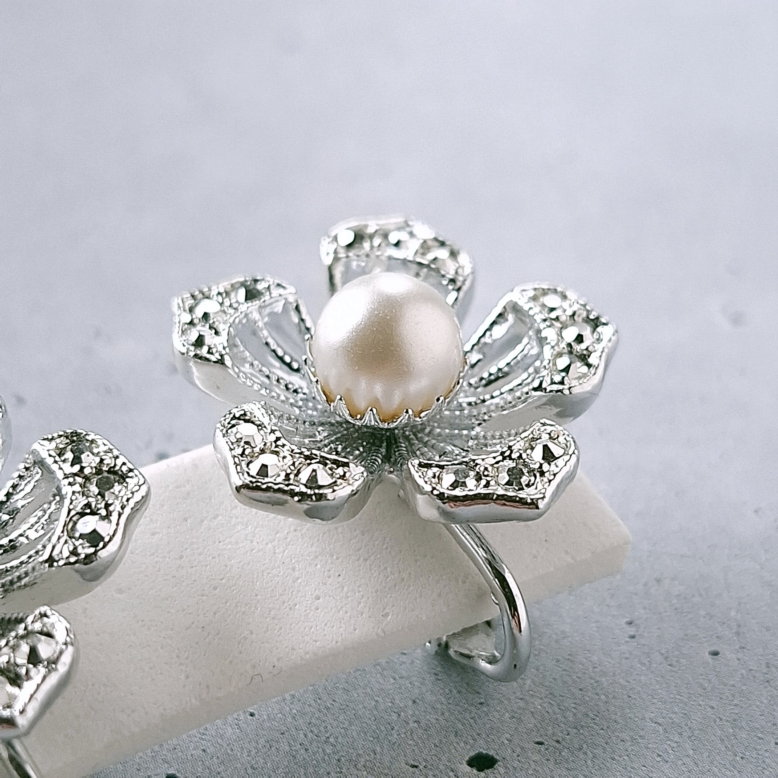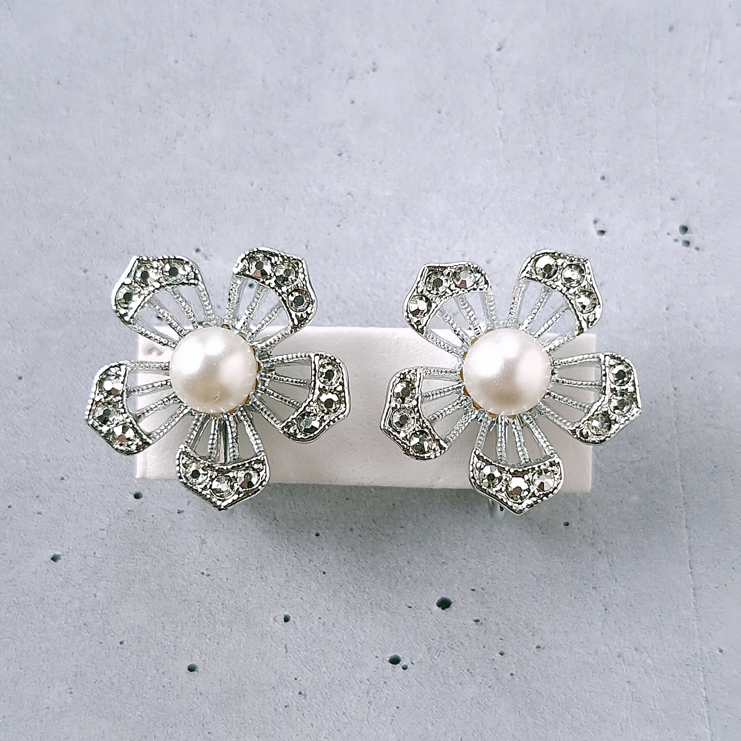 1949年にニューヨークで創業したSarah Coventry(サラコベントリー)の1966年に販売された“Nocturne”の透かしデザインのシルバーメタルの花びらにはマーカサイトを模したラインストーンがあしらわれ、中央にはフェイクパールがあしらわれたフラワーのヴィンテージイヤリングです。