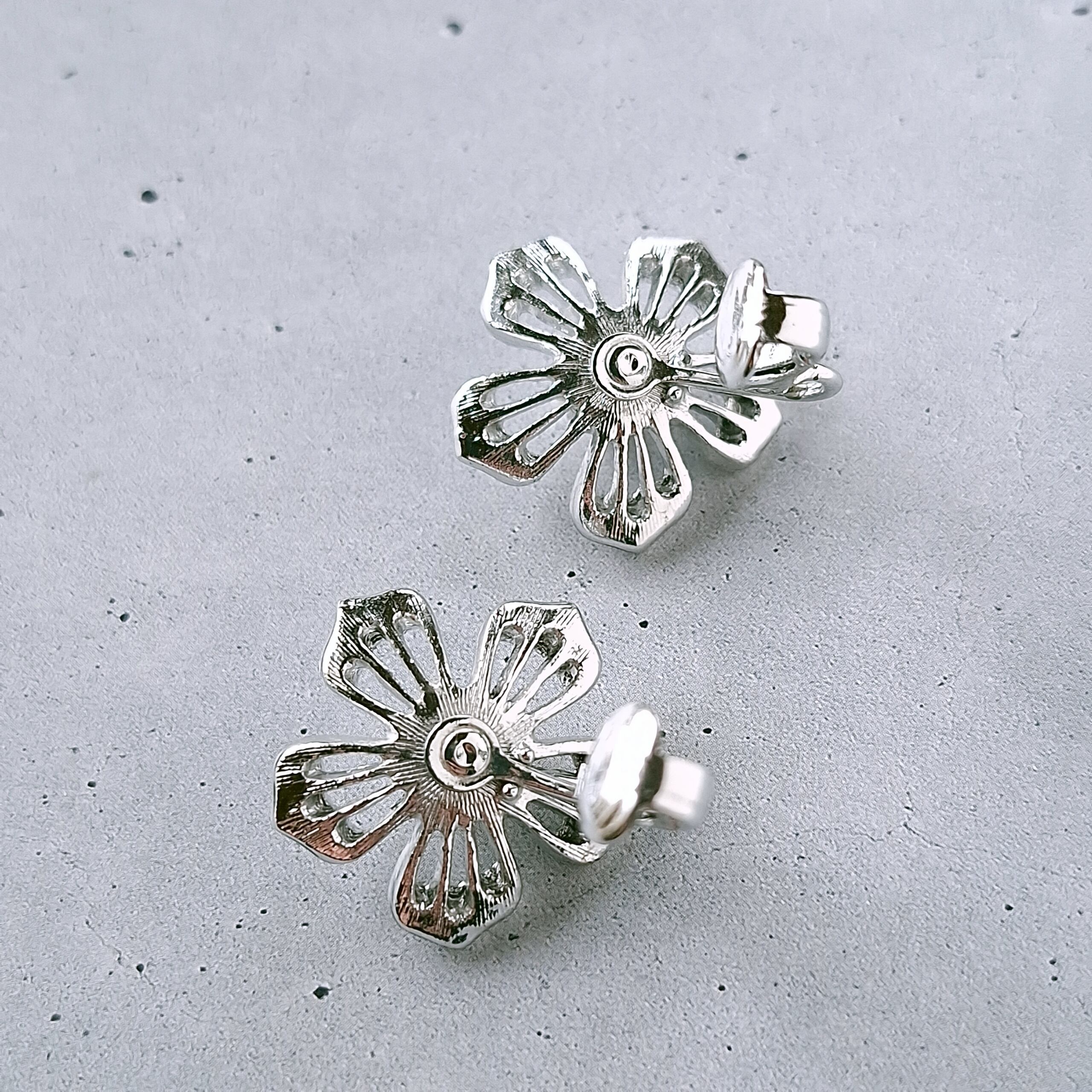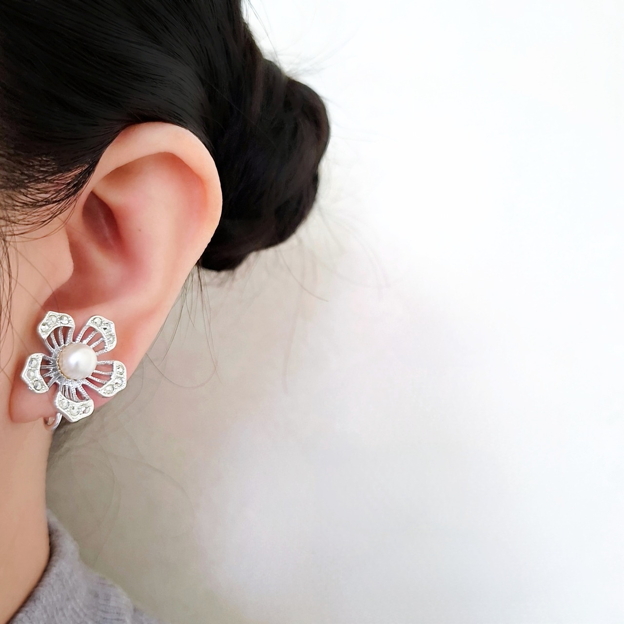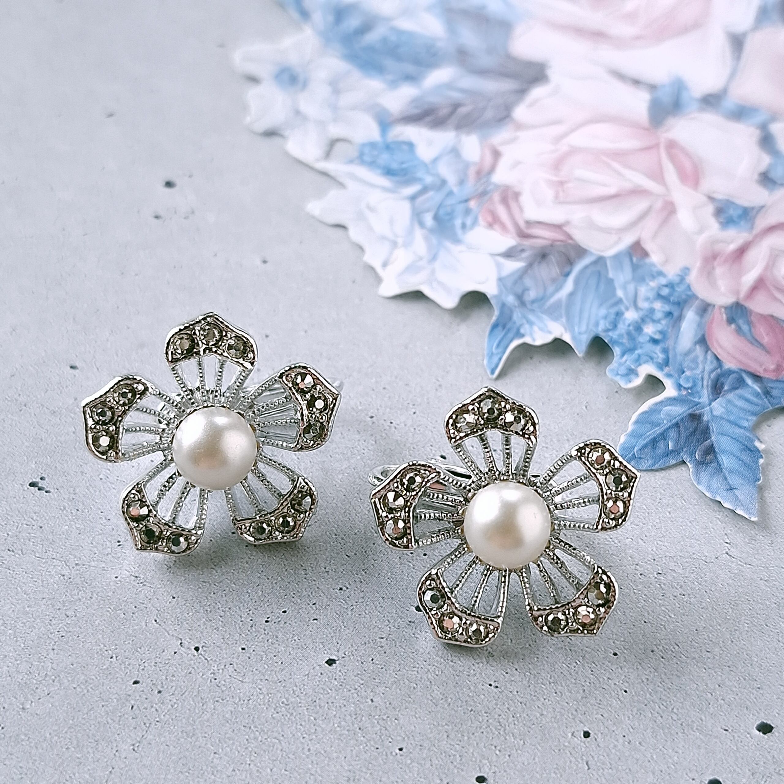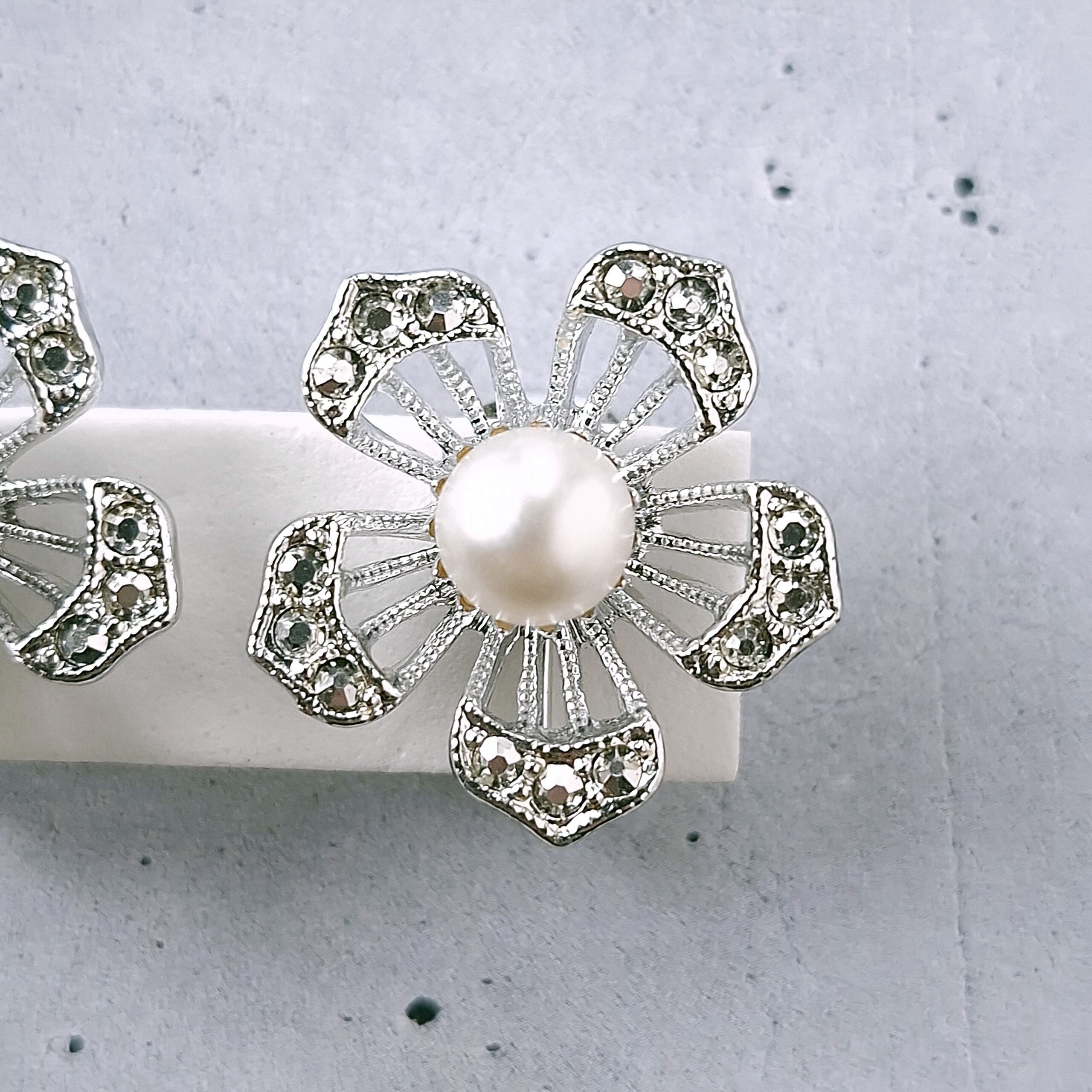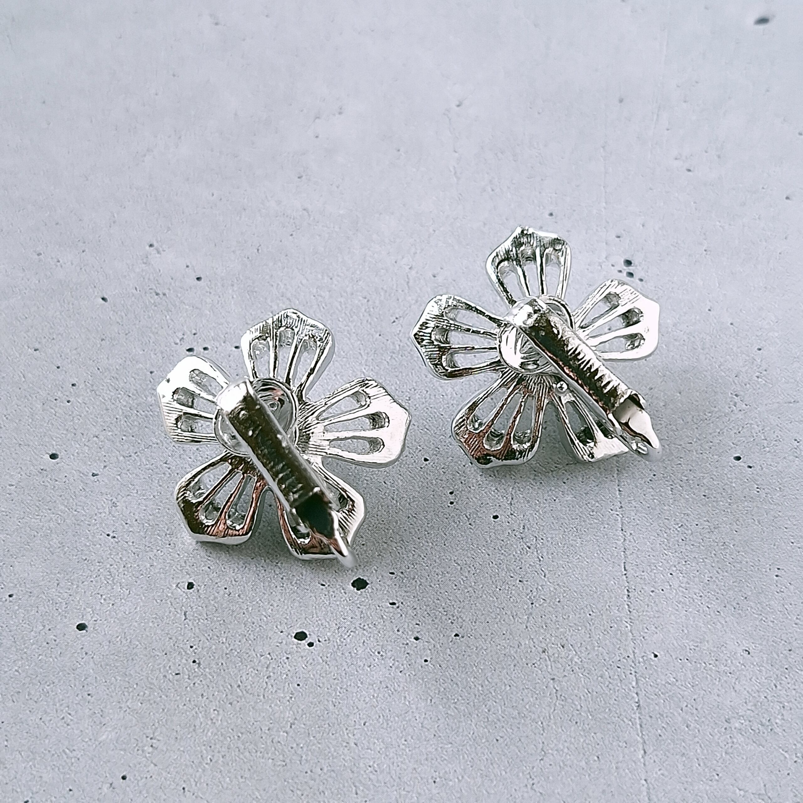 1949年にニューヨークで創業したSarah Coventry(サラコベントリー)の1966年に販売された“Nocturne”の透かしデザインのシルバーメタルの花びらにはマーカサイトを模したラインストーンがあしらわれ、中央にはフェイクパールがあしらわれたフラワーのヴィンテージイヤリングです。