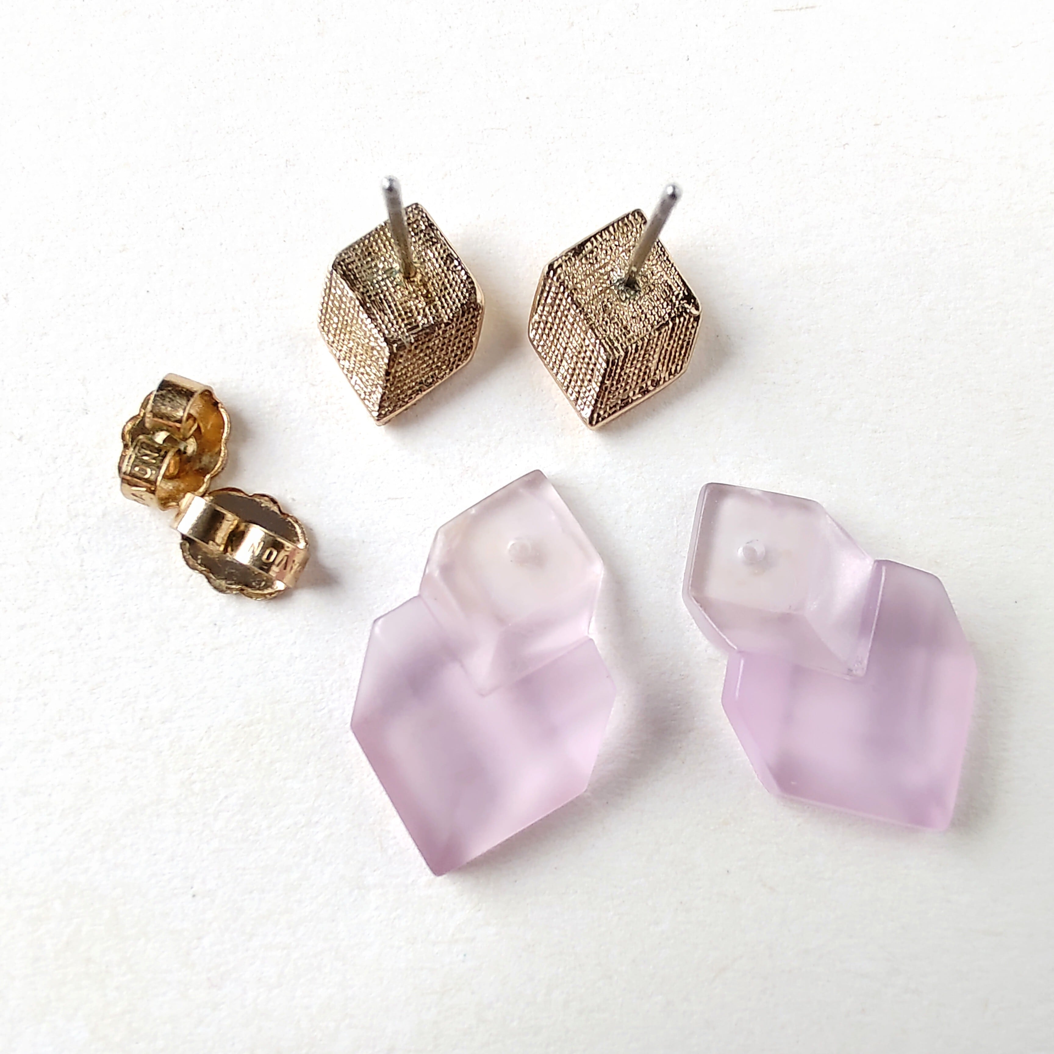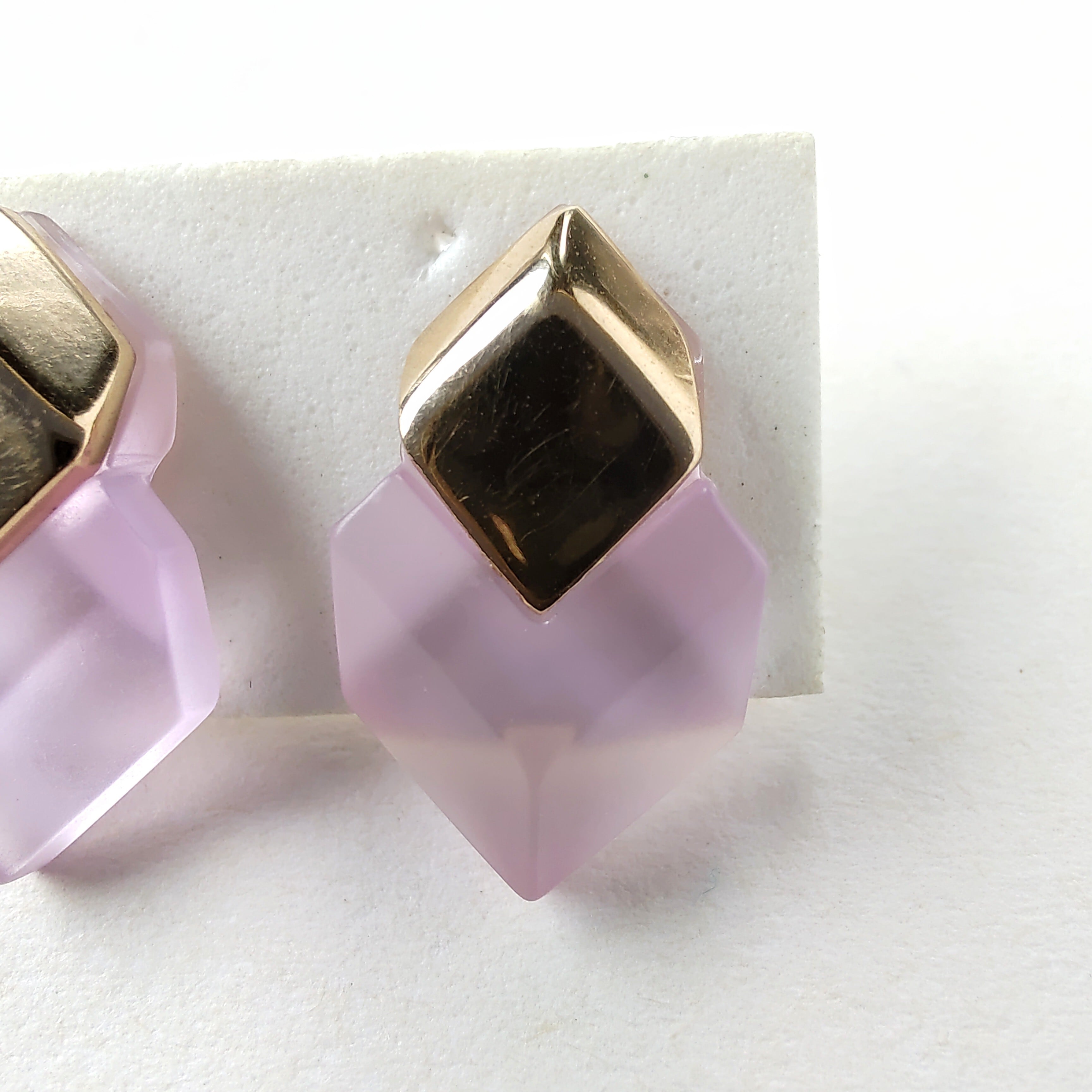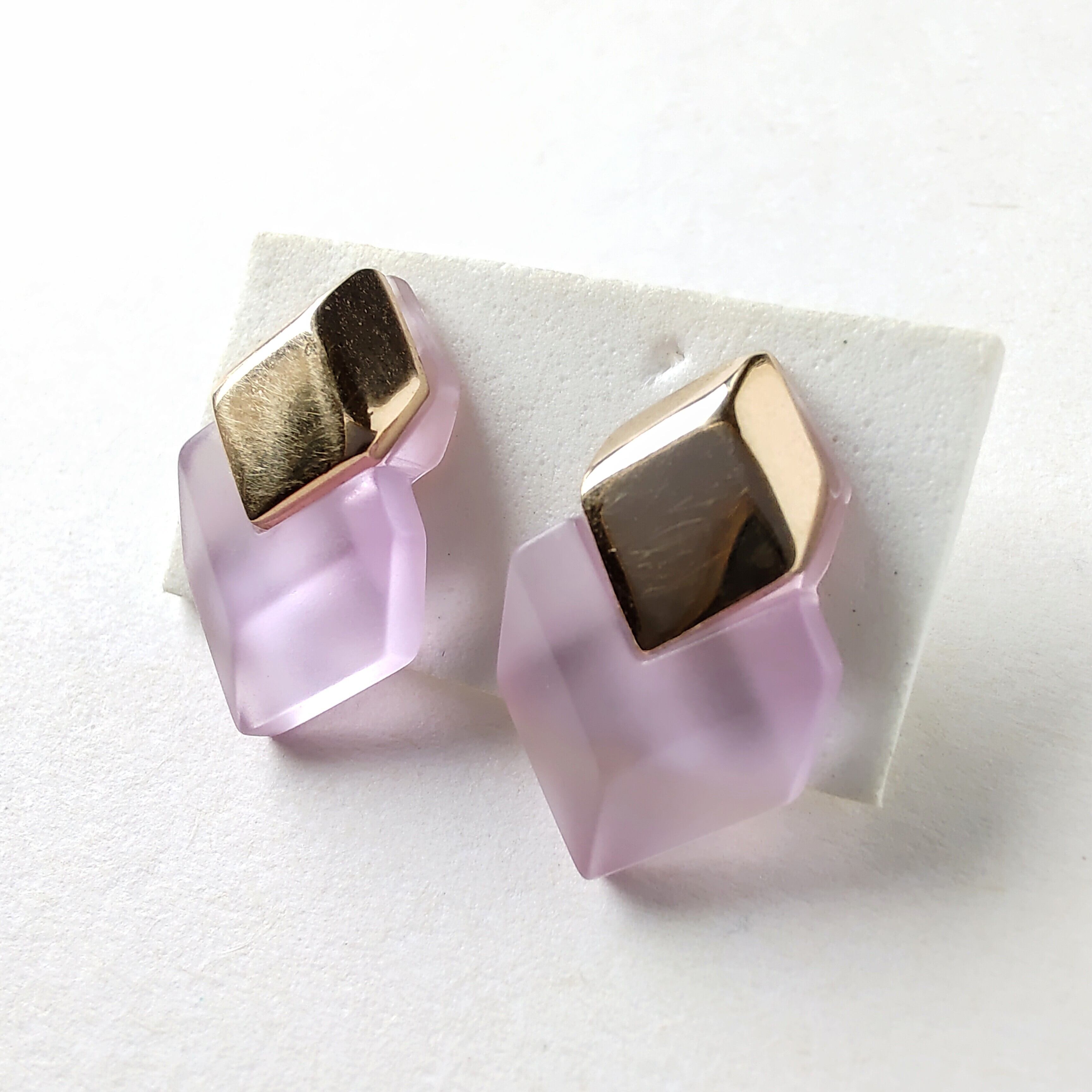1886年アメリカのニューヨークにて小さな香水会社を創業、1971年に本格的にコスチュームジュエリーの製作を開始したAvon(エイボン)の1985年に販売された“crystal impressions”の平らなキューブ型のゴールドメタルと淡いパープルのフロストプラスチックのヴィンテージピアスです。