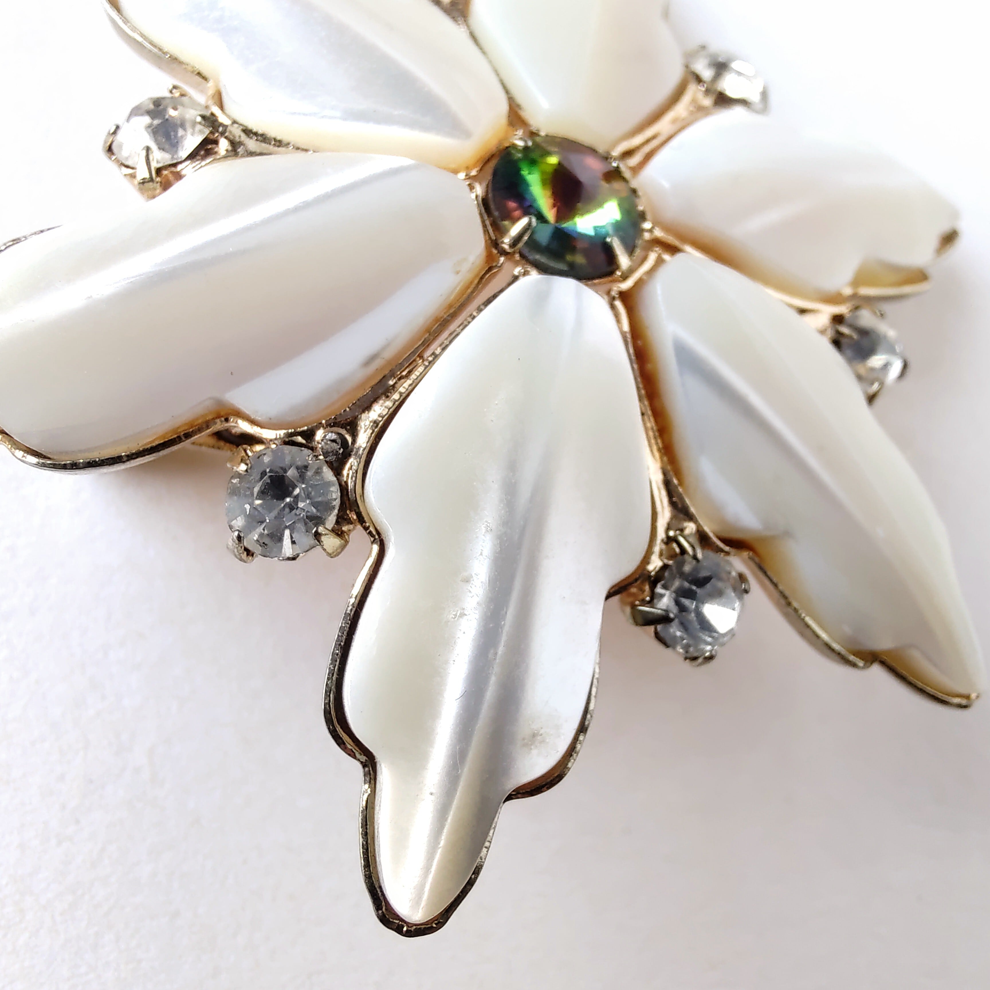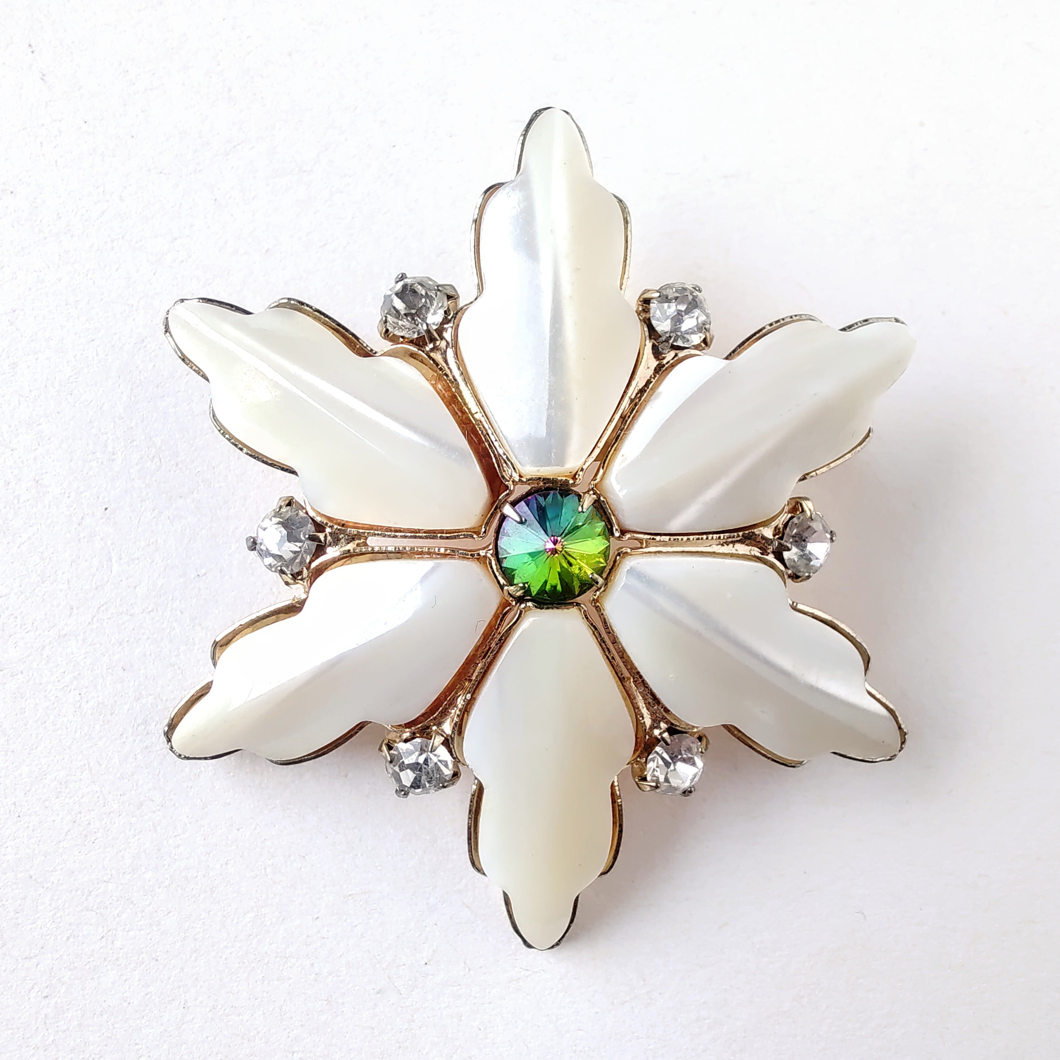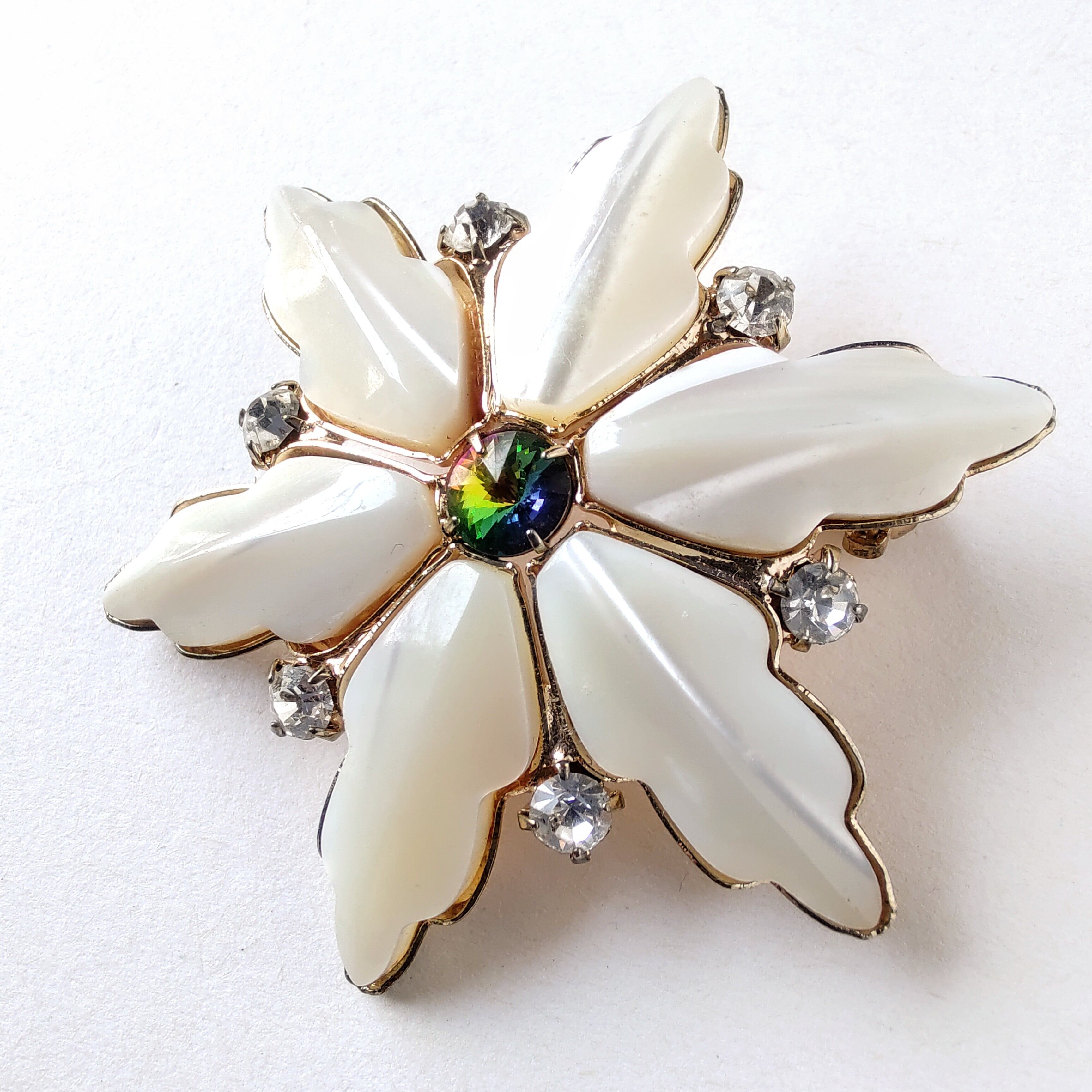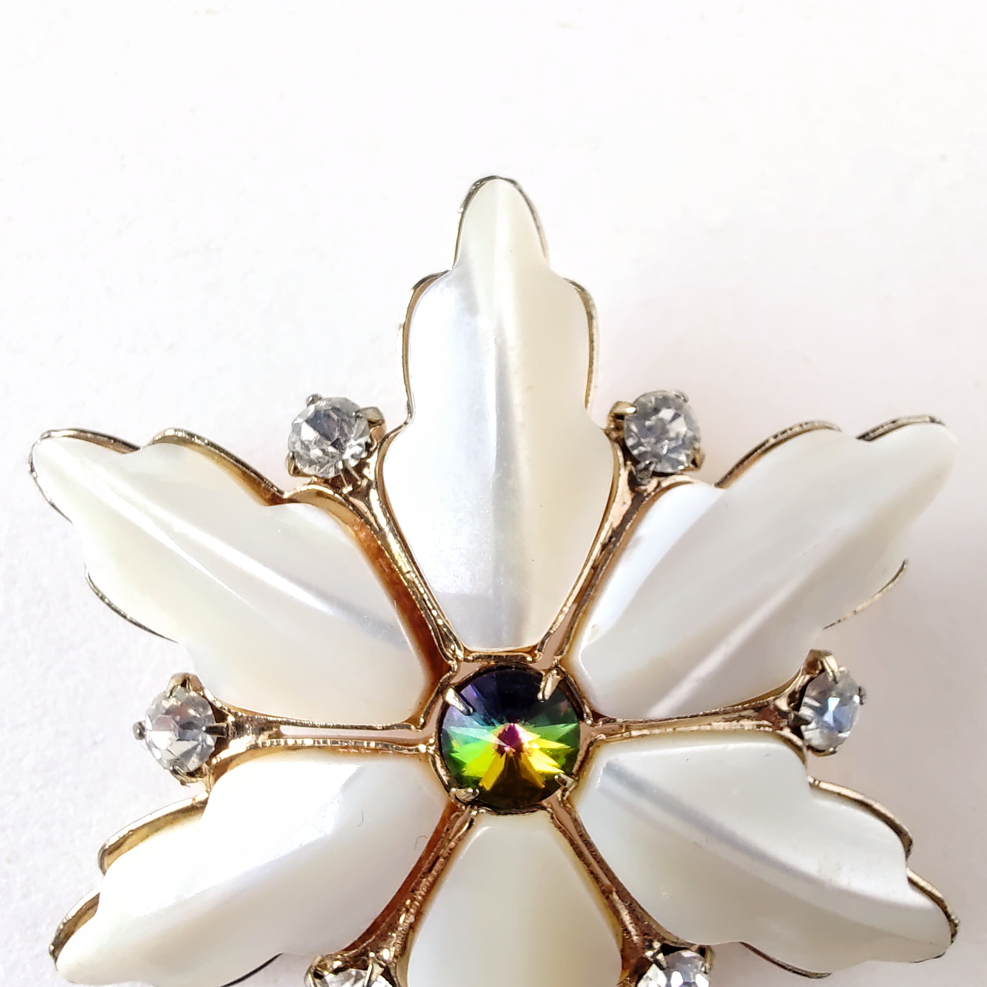マザーオブパールの花びらの間にクリアラインストーンが散りばめられ、中央にグリーン、ピンク、ブルー等角度によって色味の変わるウォーターメロンリヴォリラインストーンがあしらわれたフラワーのヴィンテージブローチです。