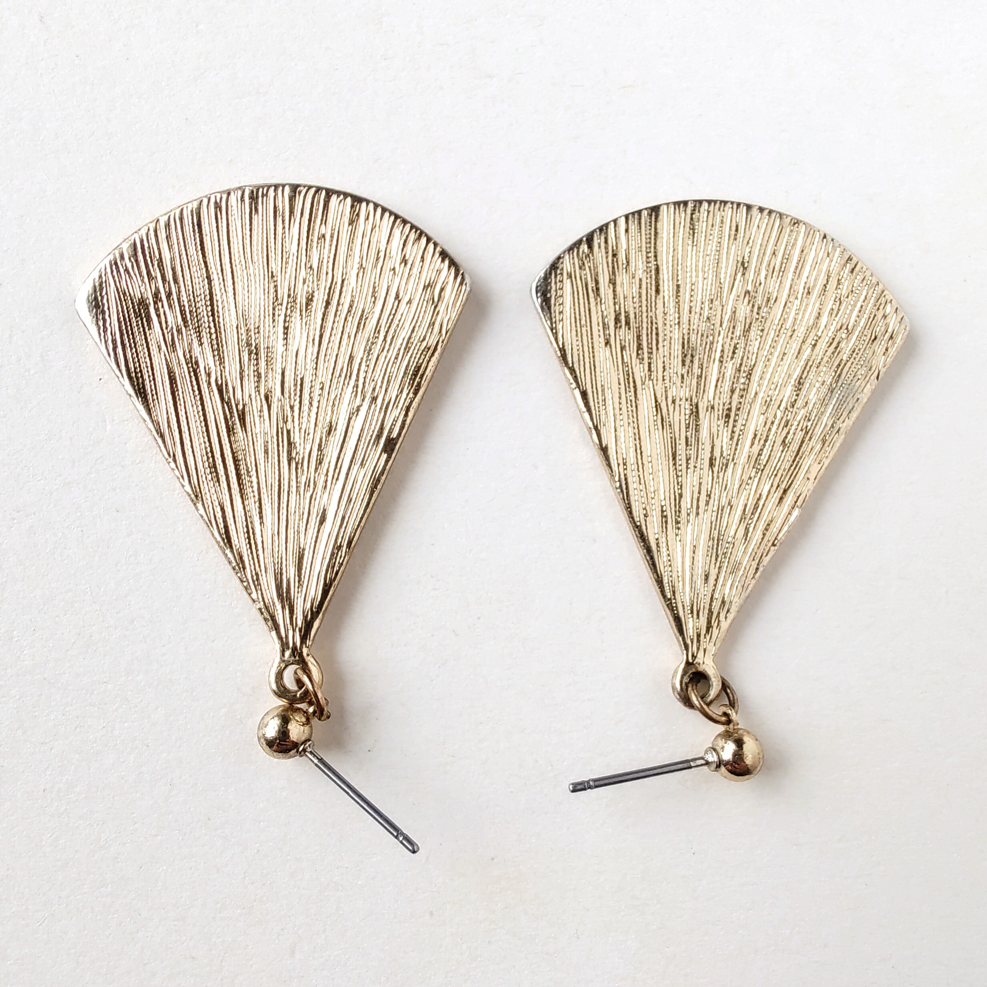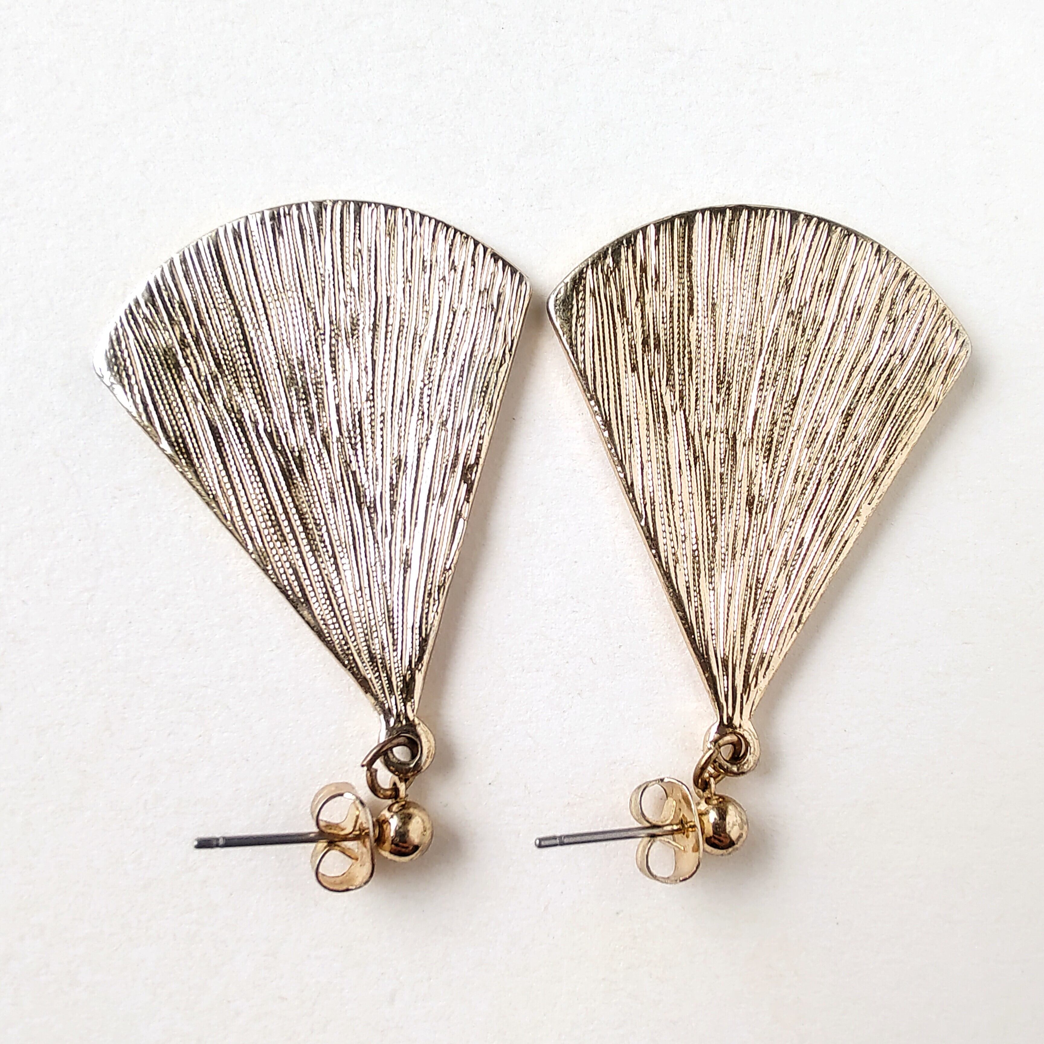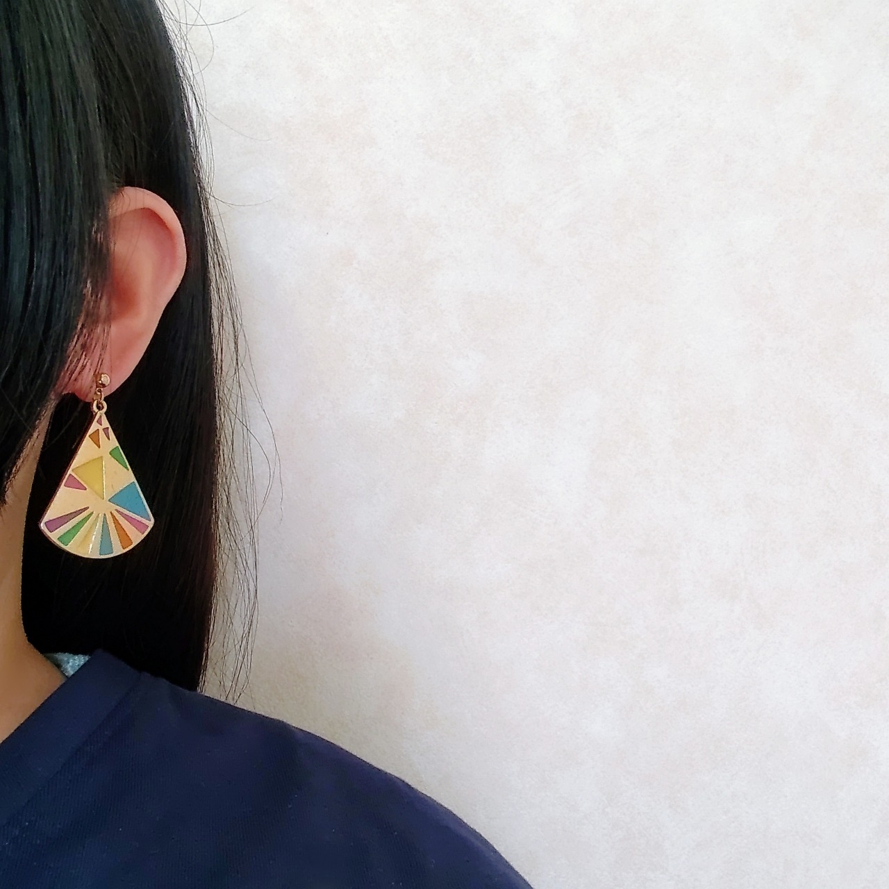 薄い色味の扇形のゴールドメタルに色とりどりのカラフルなエナメルが色付けされた揺れるタイプのヴィンテージピアスです。