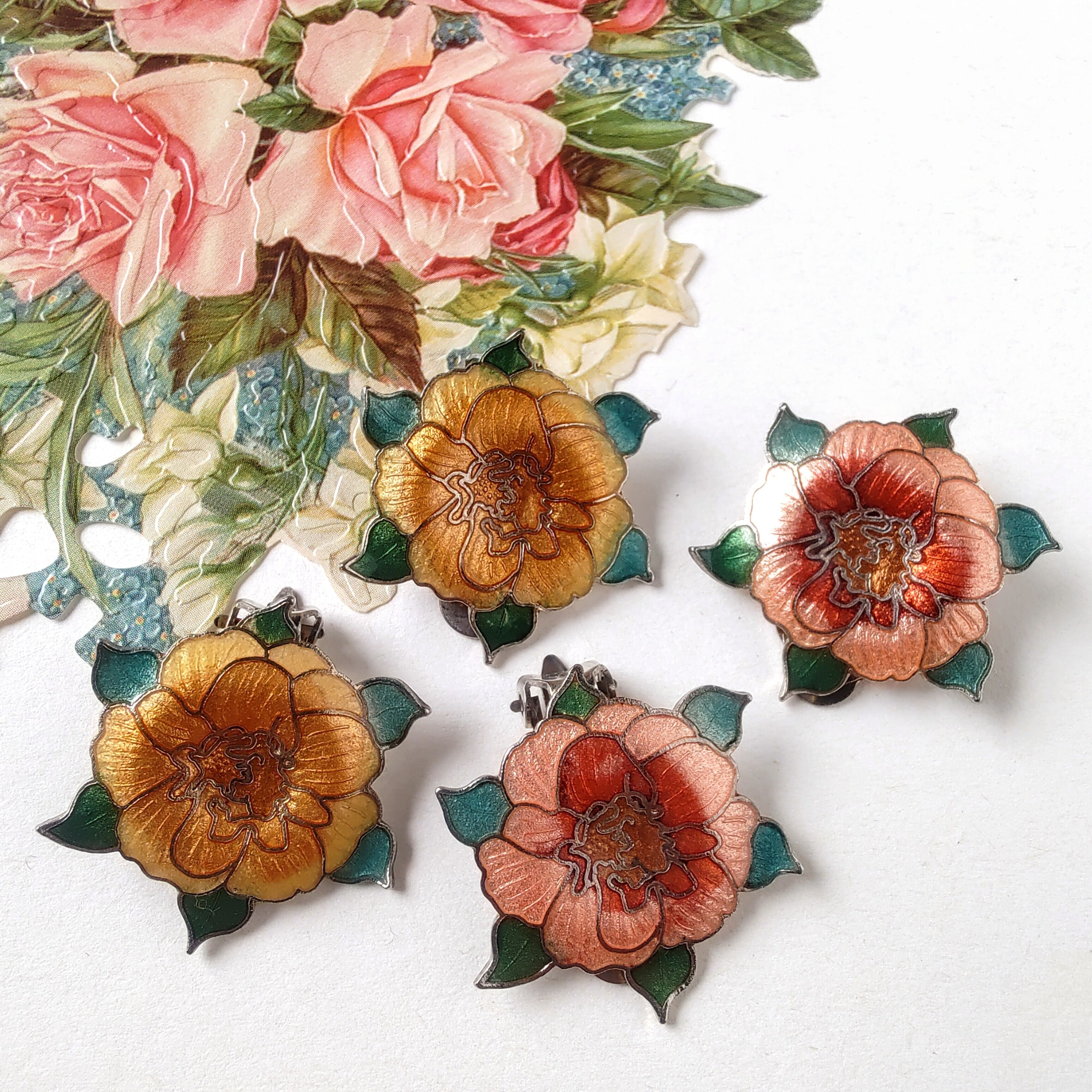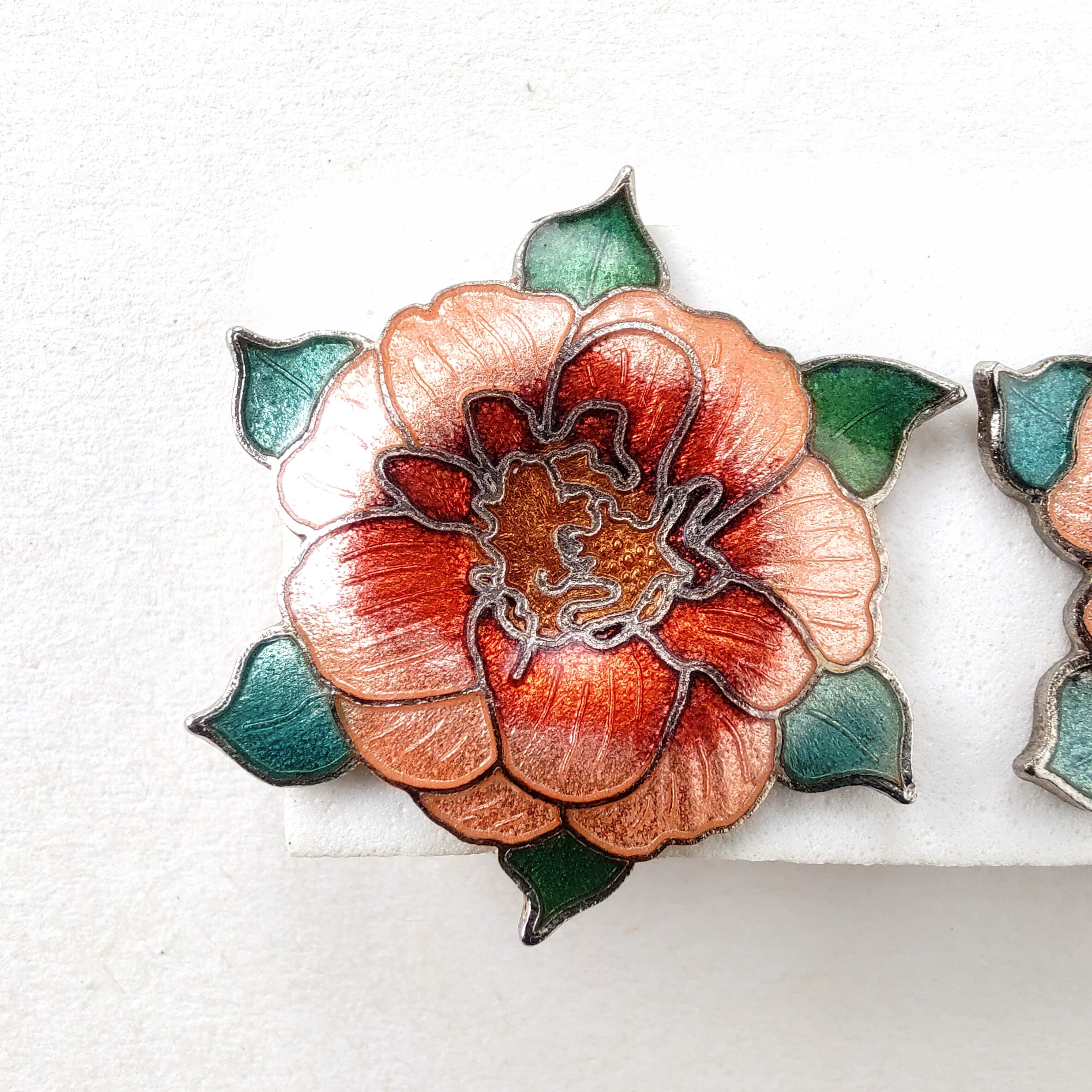 cloisonné pink vermilion orange camellia vintage earrings ヴィンテージイヤリング