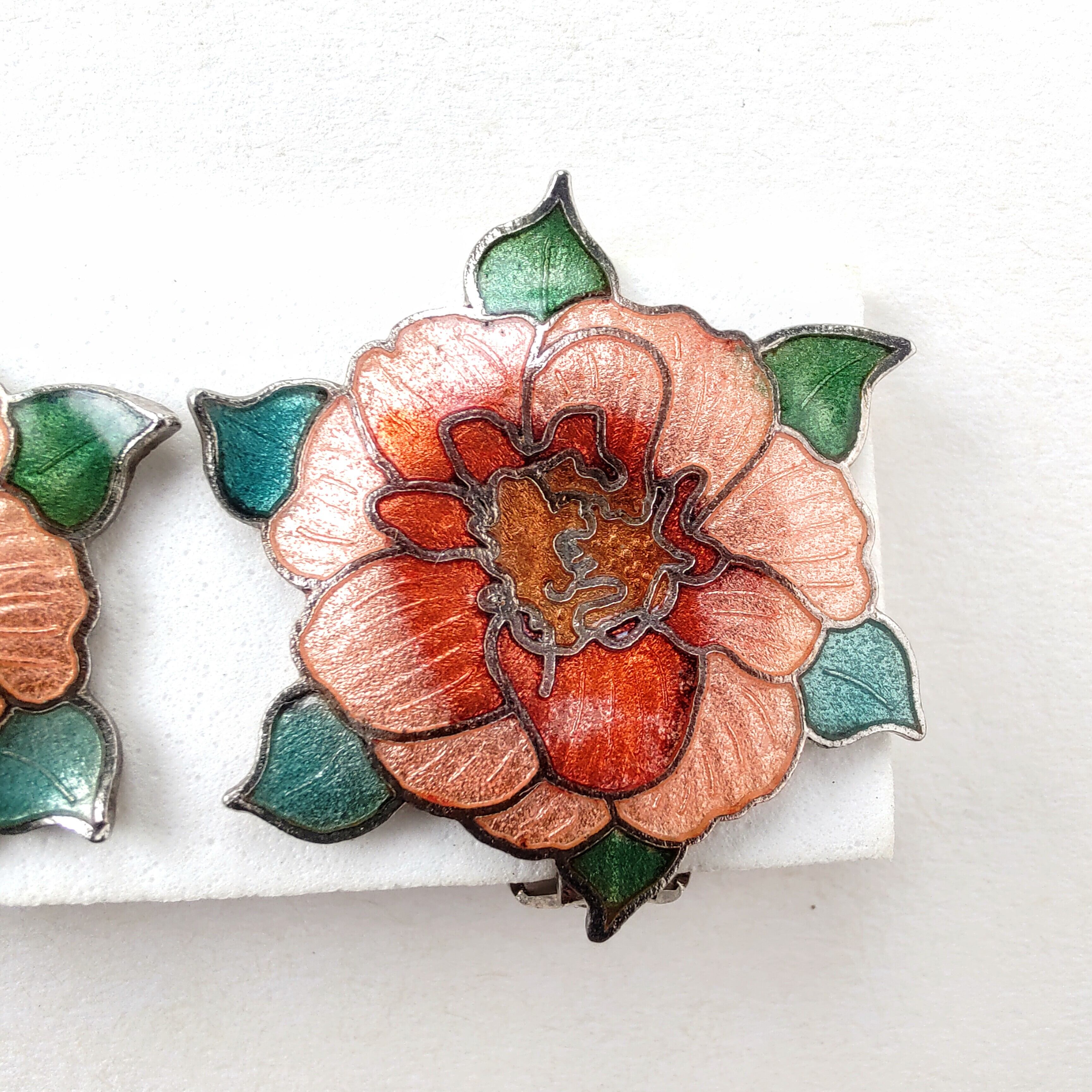 淡いピンク、バーミリオン(朱色)、オレンジで色付けされたフラワーの周りにグリーンとブルーの2色で色付けされたリーフがデザインされた椿の七宝焼のヴィンテージイヤリングです。