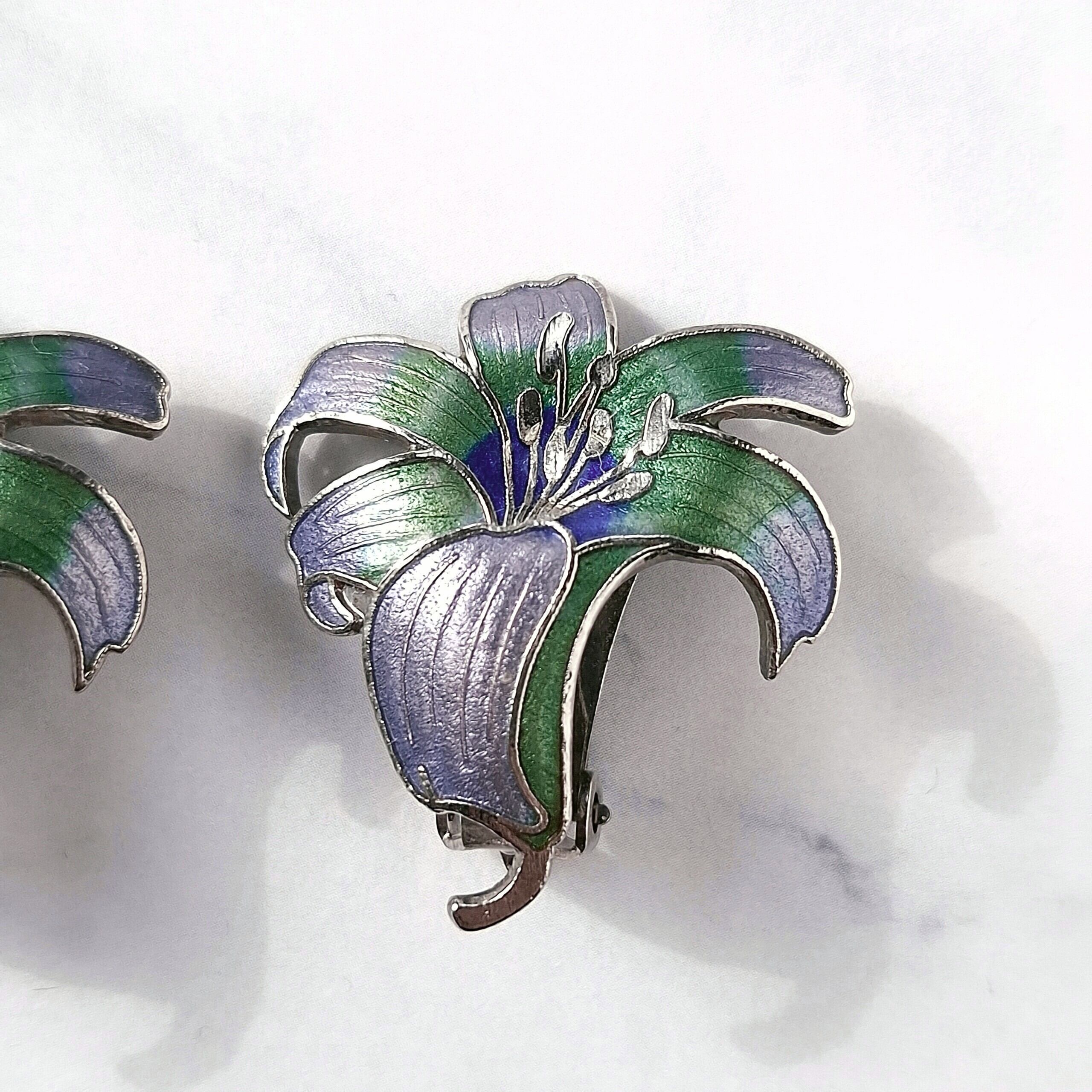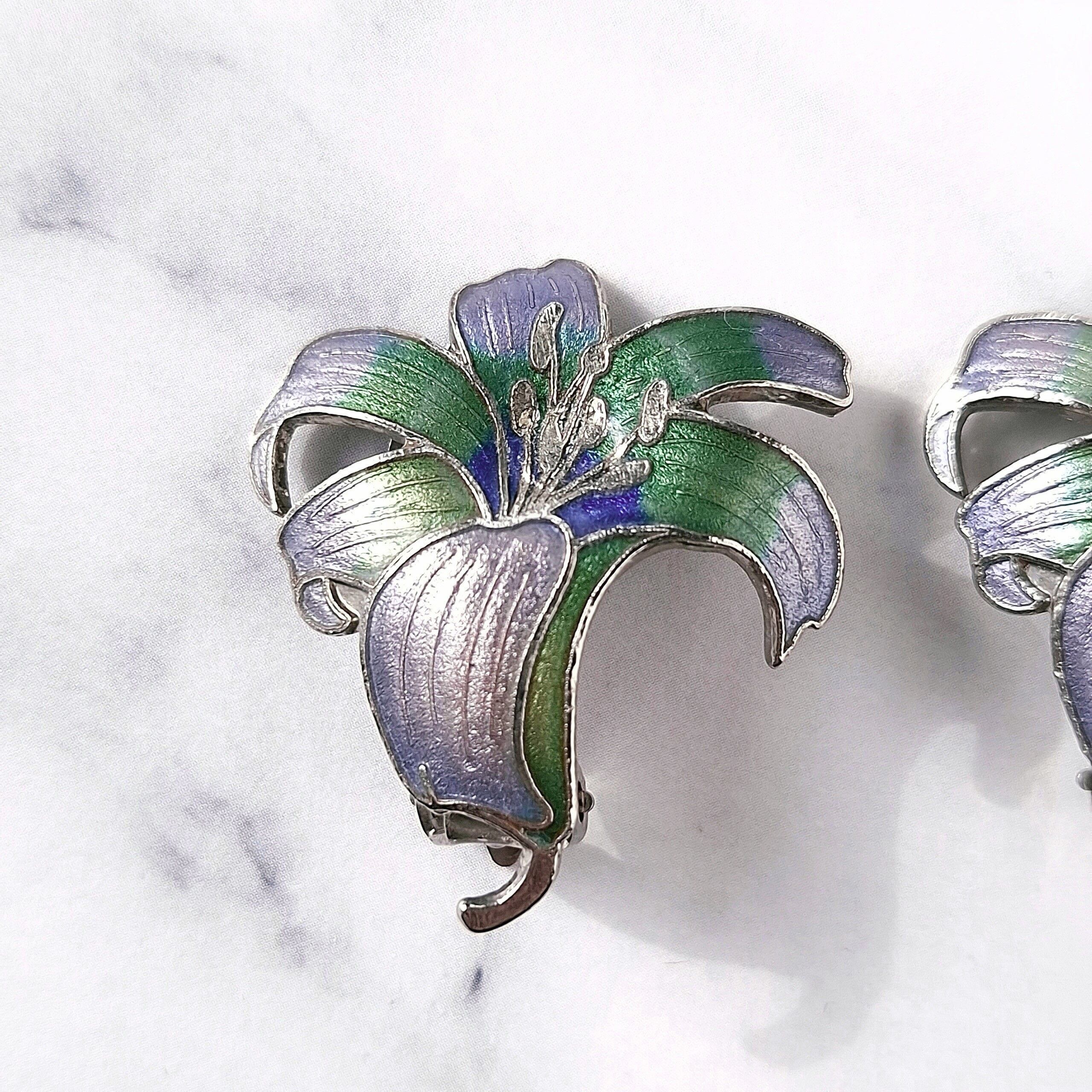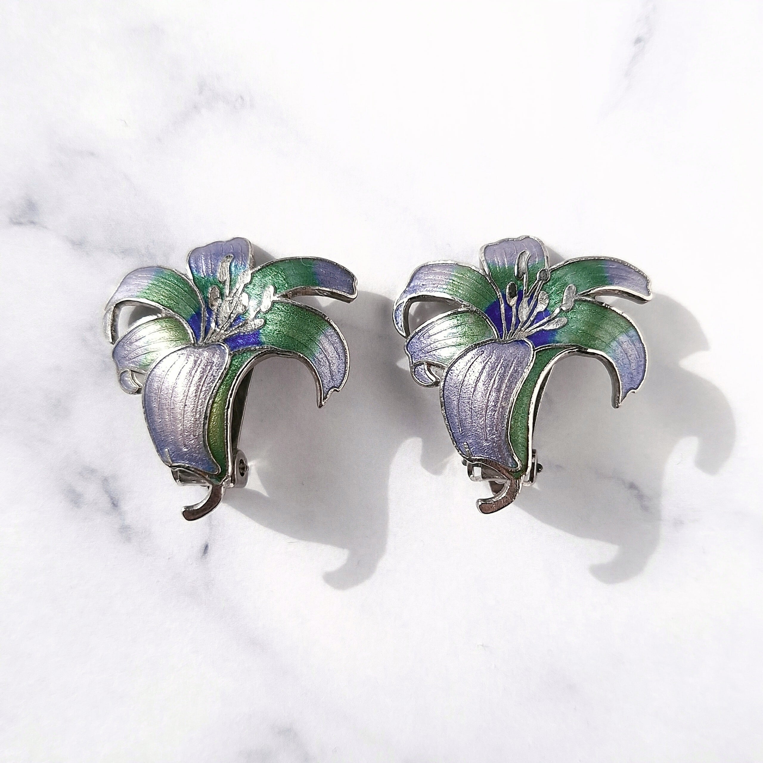 パープル、ブルー、グリーンのエナメルで色付けされた百合の七宝焼のヴィンテージイヤリングです。