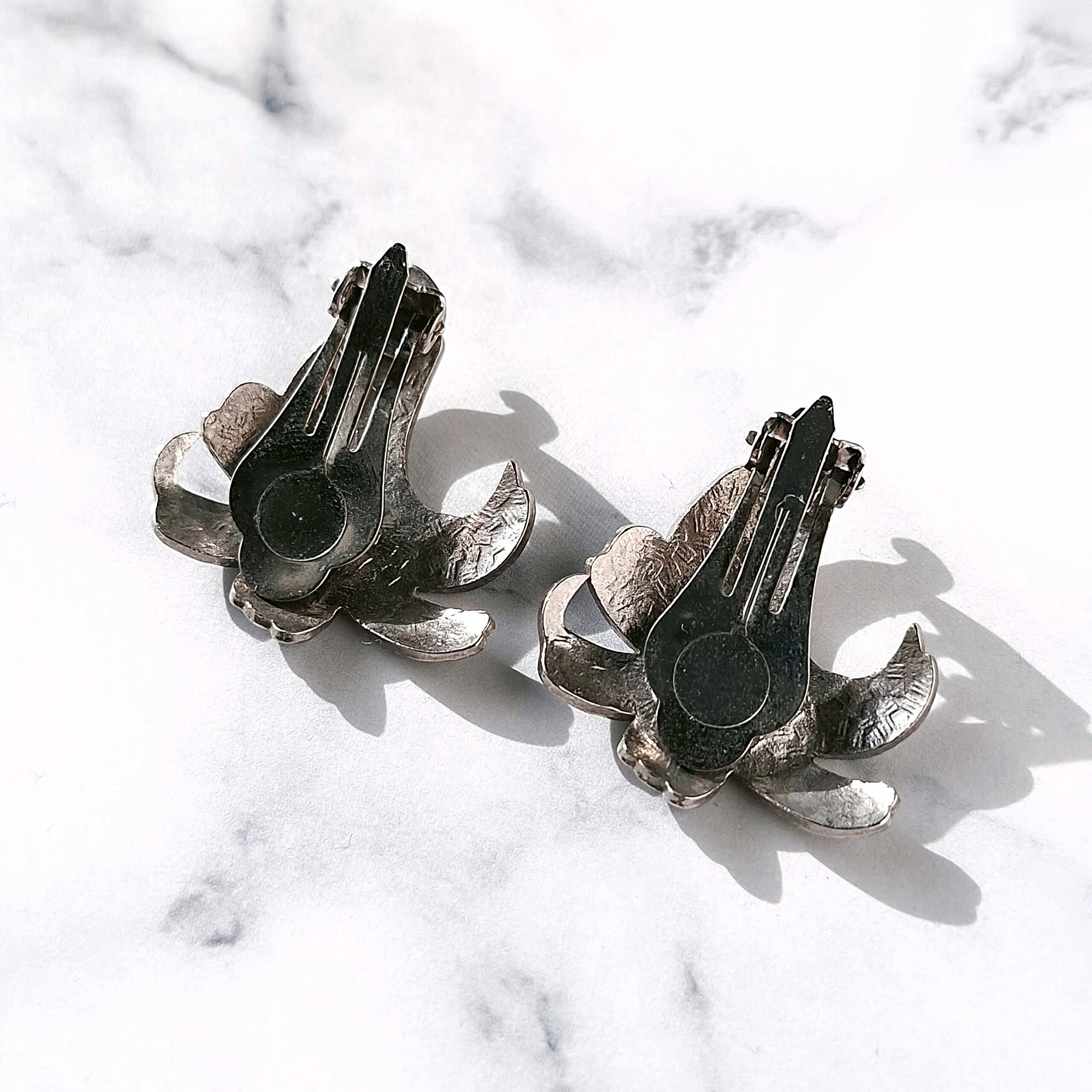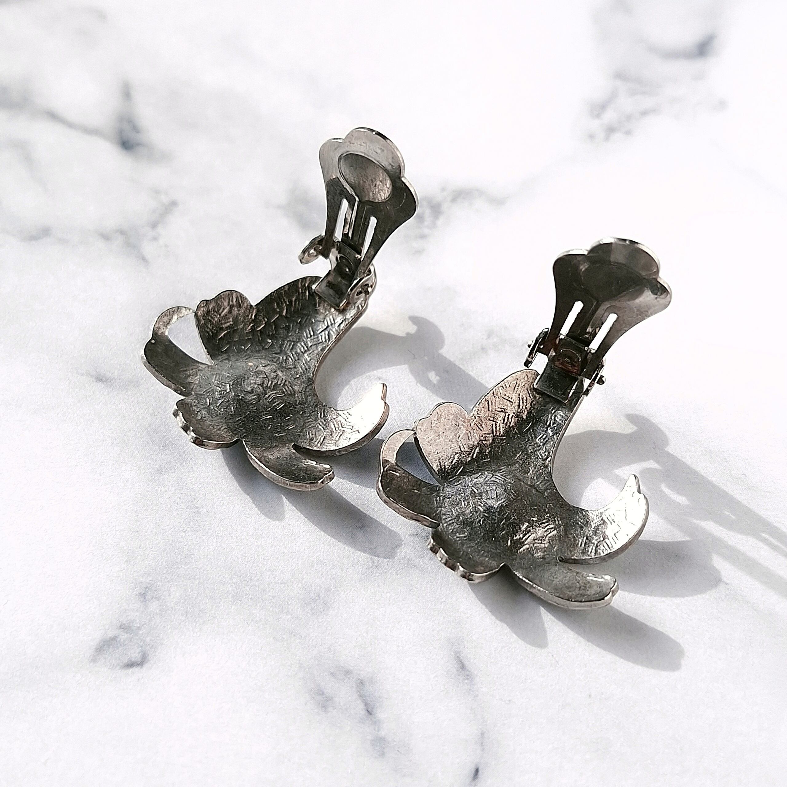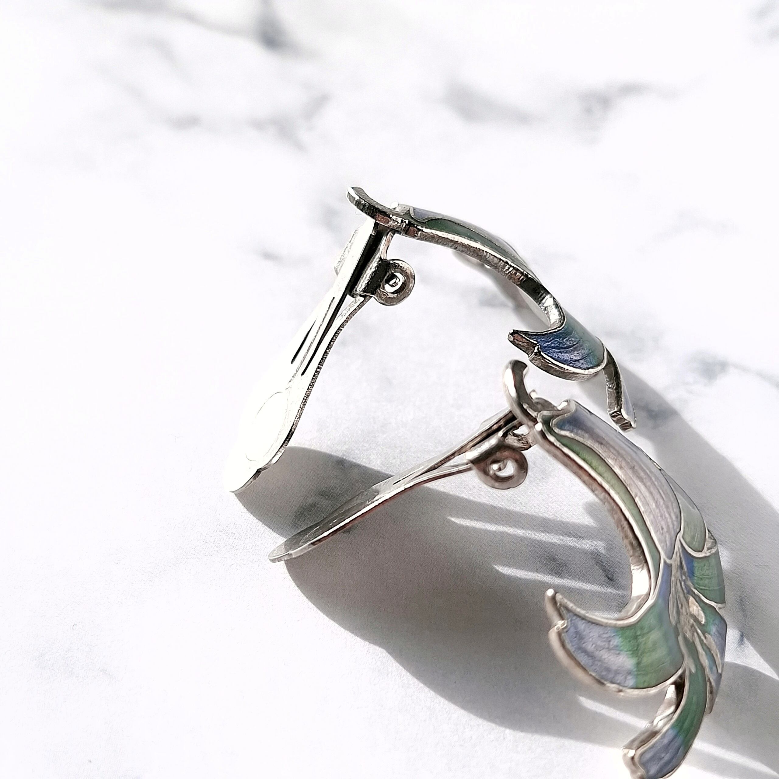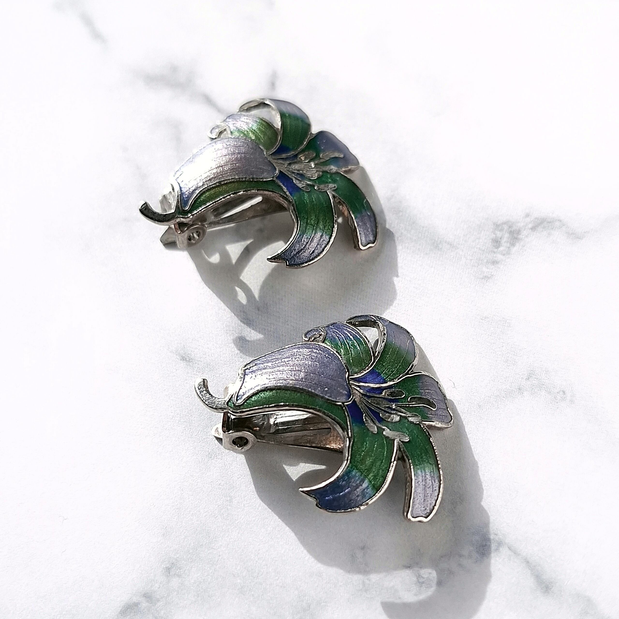 パープル、ブルー、グリーンのエナメルで色付けされた百合の七宝焼のヴィンテージイヤリングです。