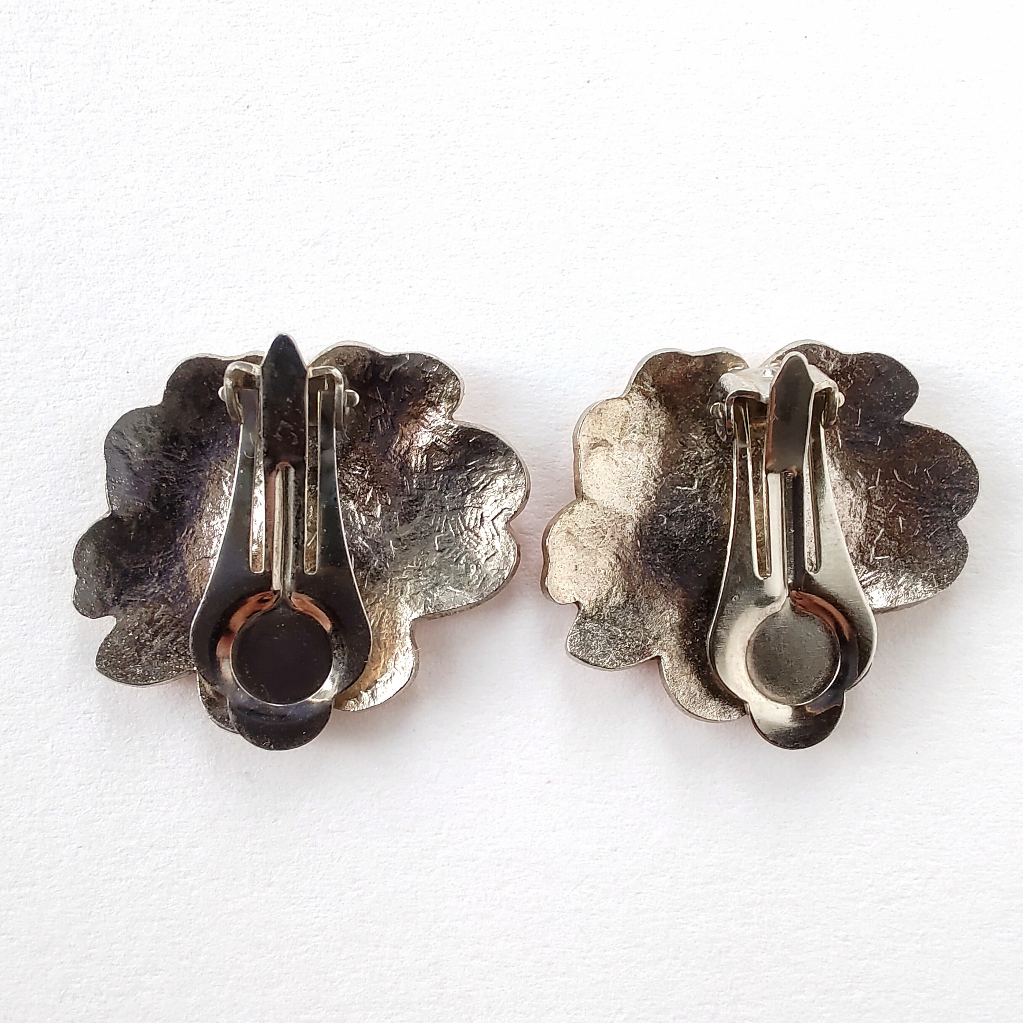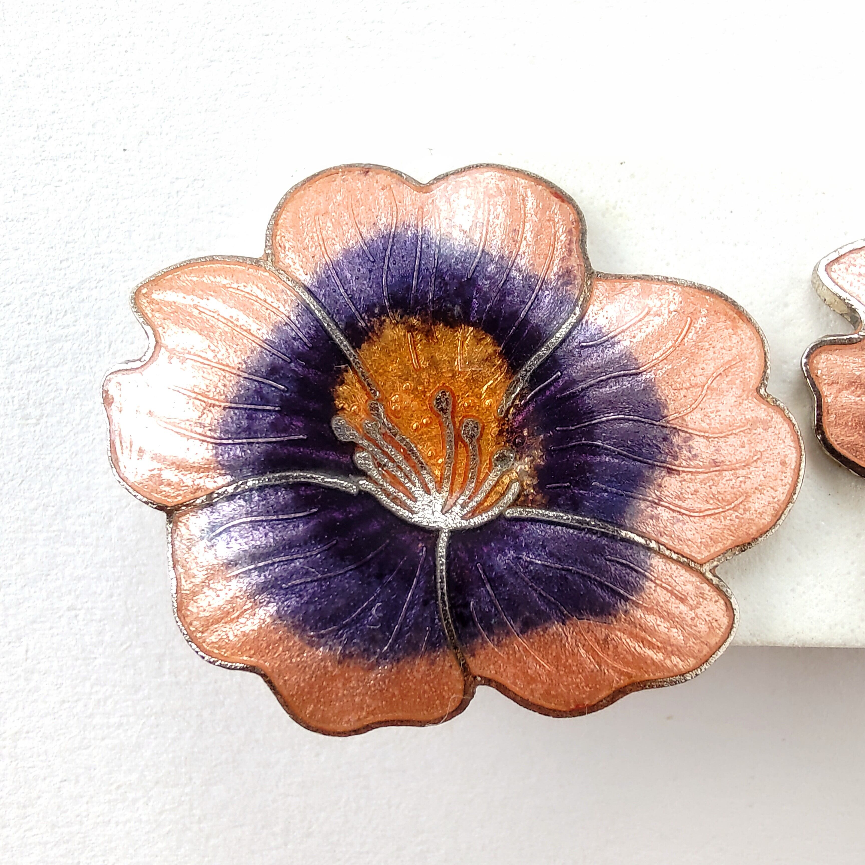 ピンク、パープル、オレンジのエナメルで色付けされた桜の七宝焼のヴィンテージイヤリングです。