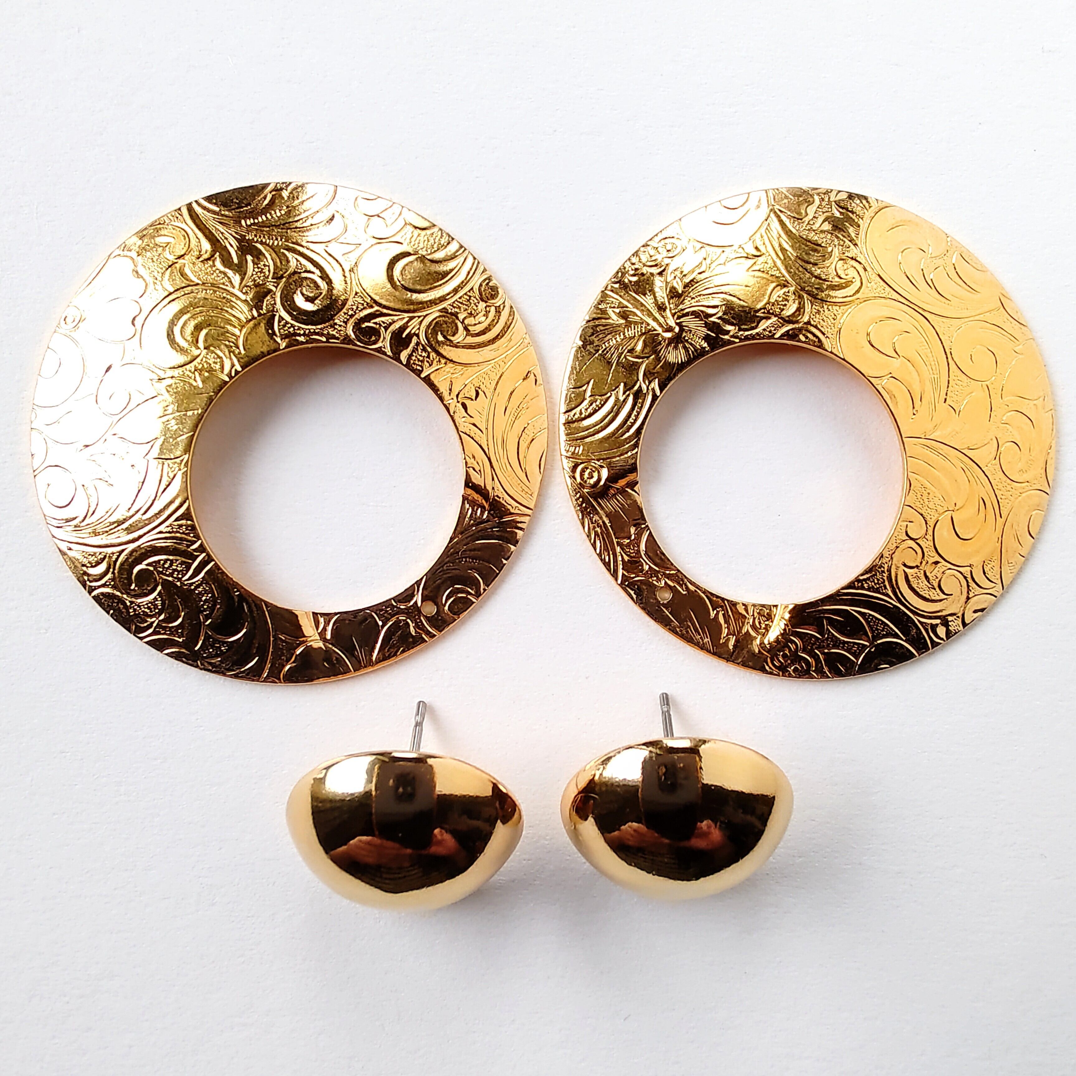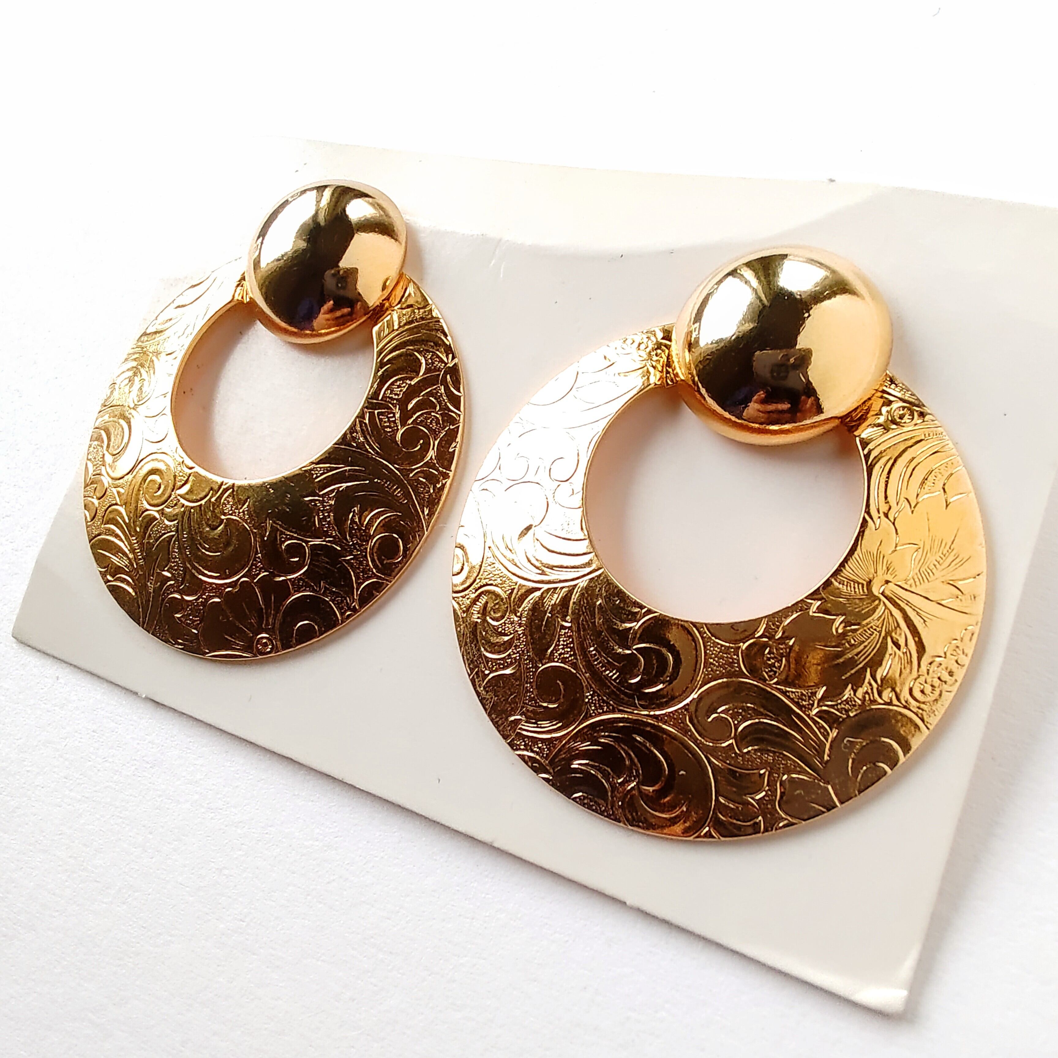 1886年アメリカのニューヨークにて小さな香水会社を創業、1971年に本格的にコスチュームジュエリーの製作を開始したAvon(エイボン)の1992年に販売された“brocade convertible”のゴールドメタルのラウンドに取り外し可能なフラワーやリーフが刻まれたフープが付いた2通り(ラウンド型、ドアノッカー型)で楽しめるコンバーチブルタイプのラージサイズのヴィンテージピアスです。