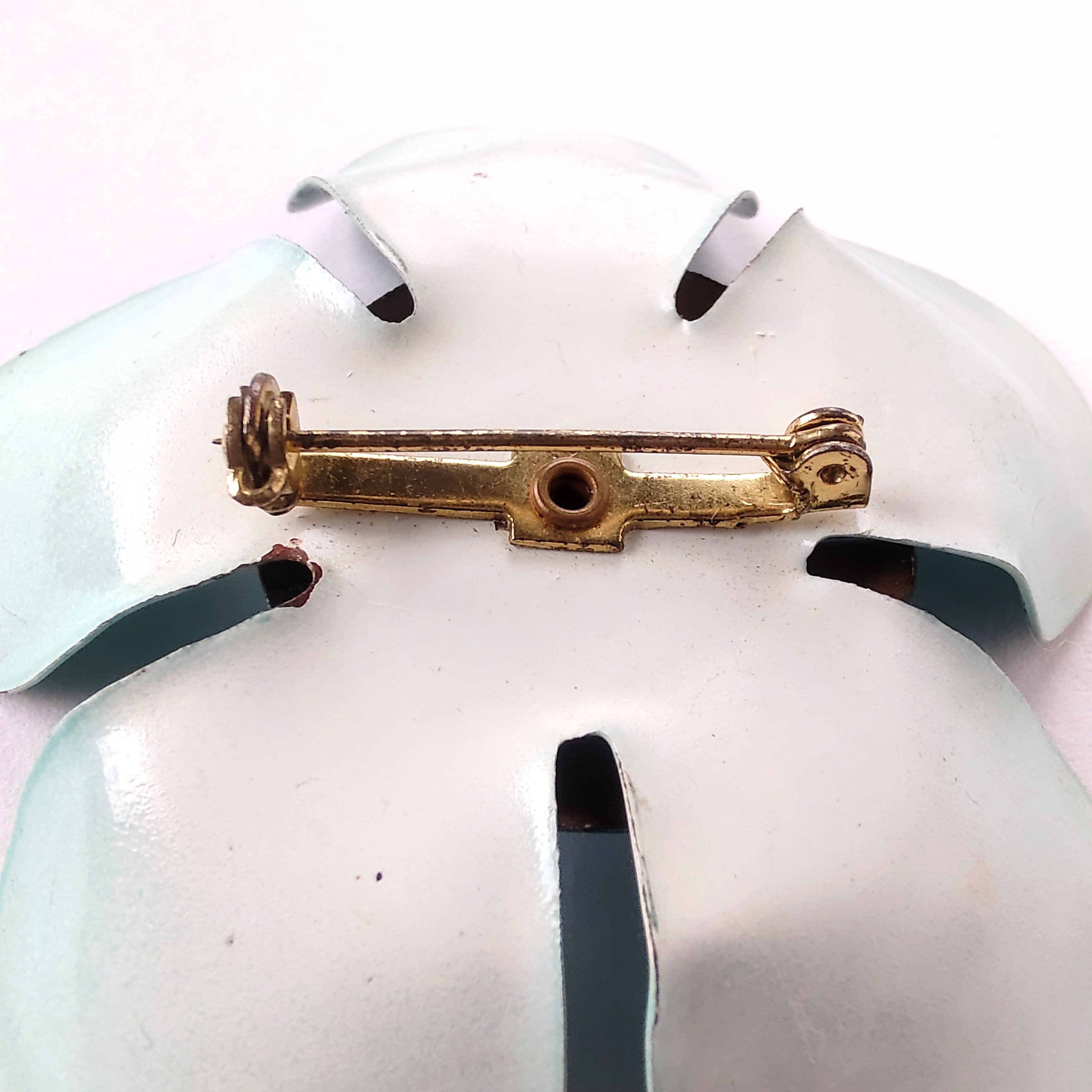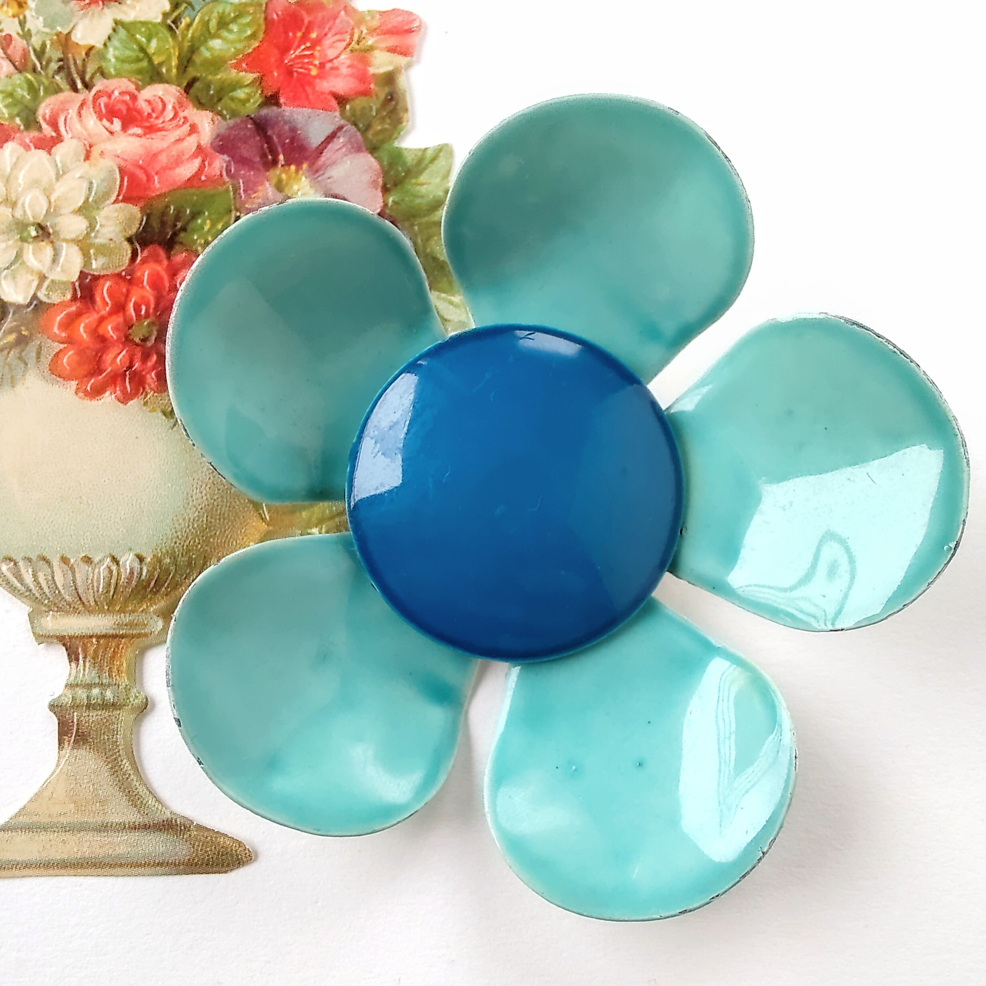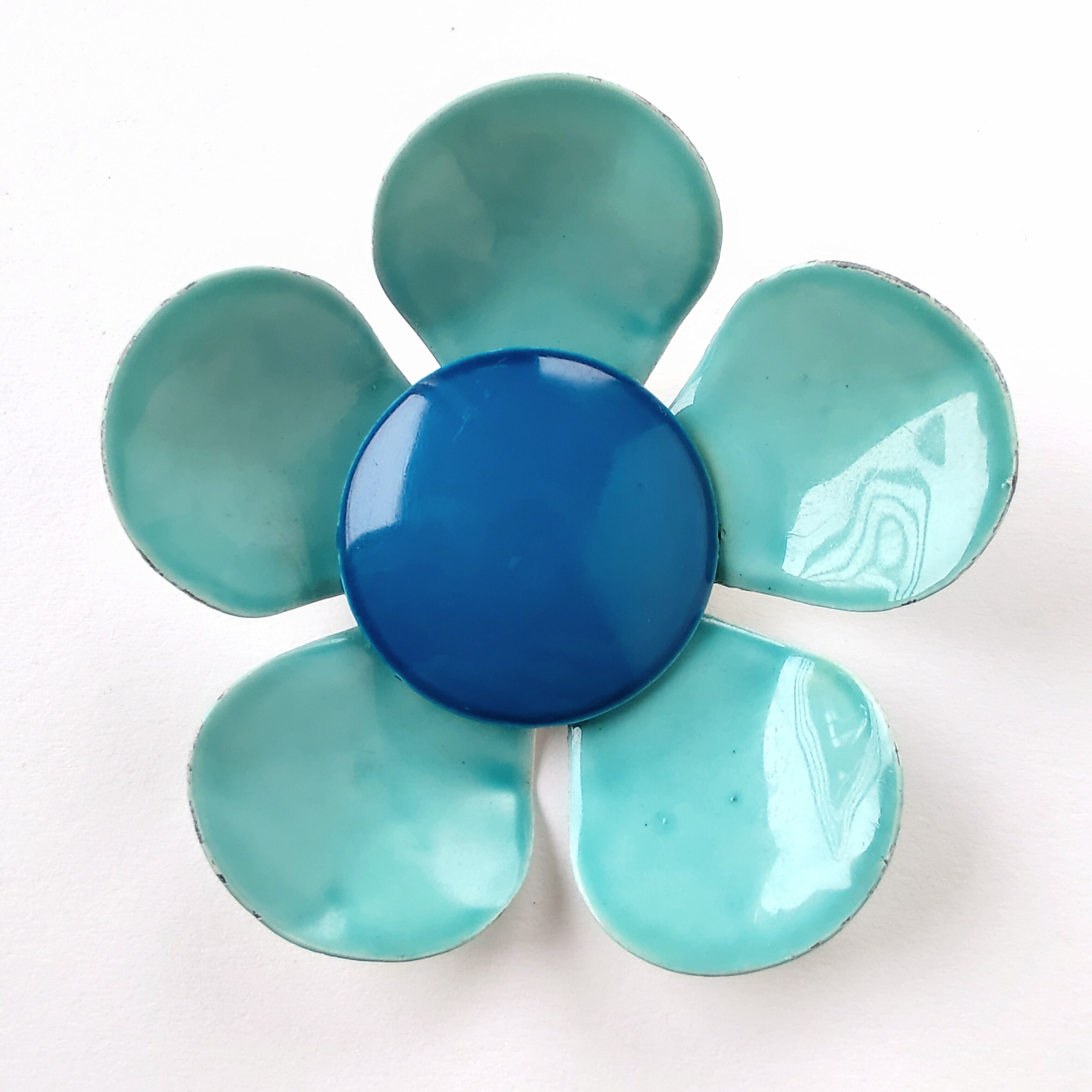 中央がブルー、花びらがライトブルーのエナメルで色付けされたメタルフラワーのヴィンテージブローチです。