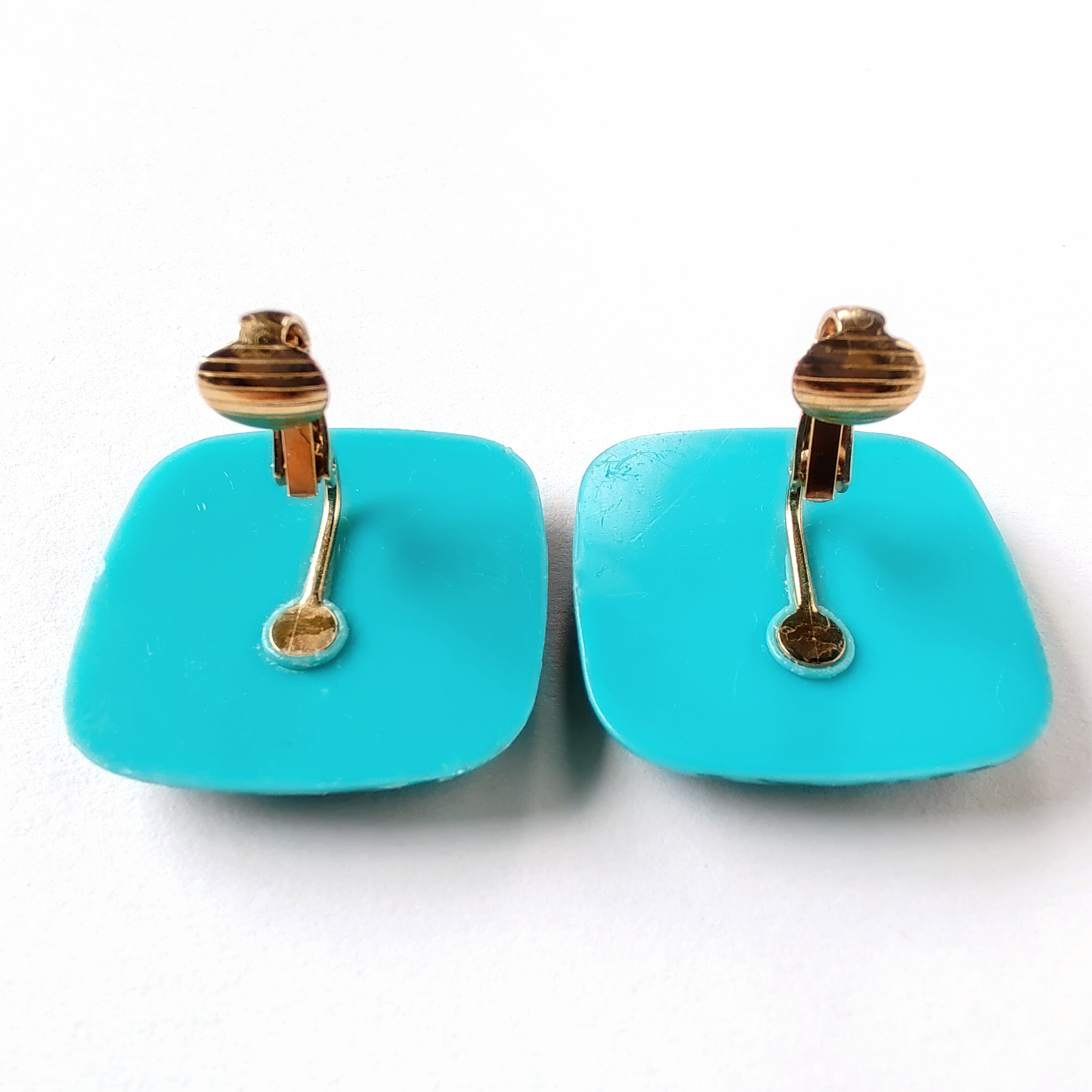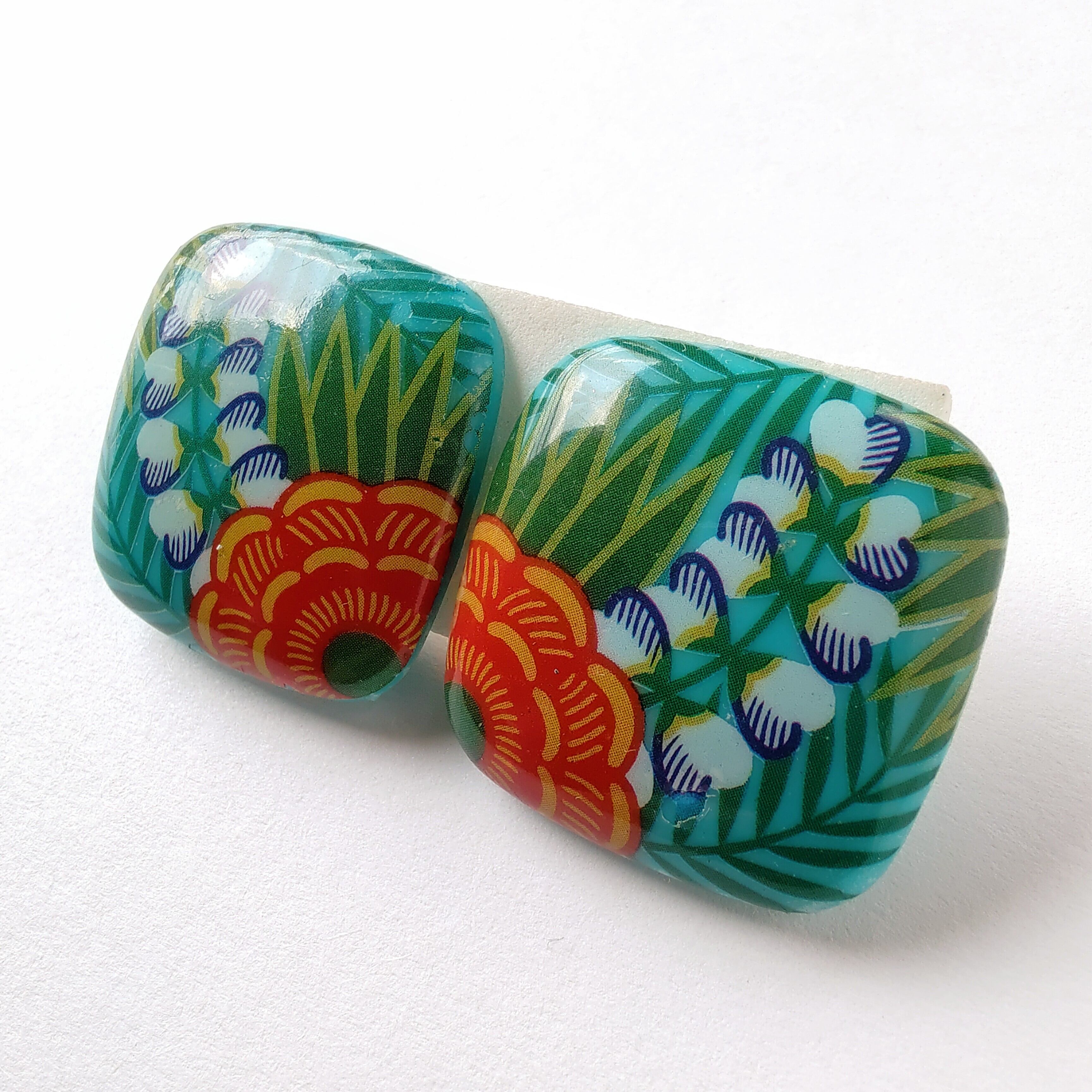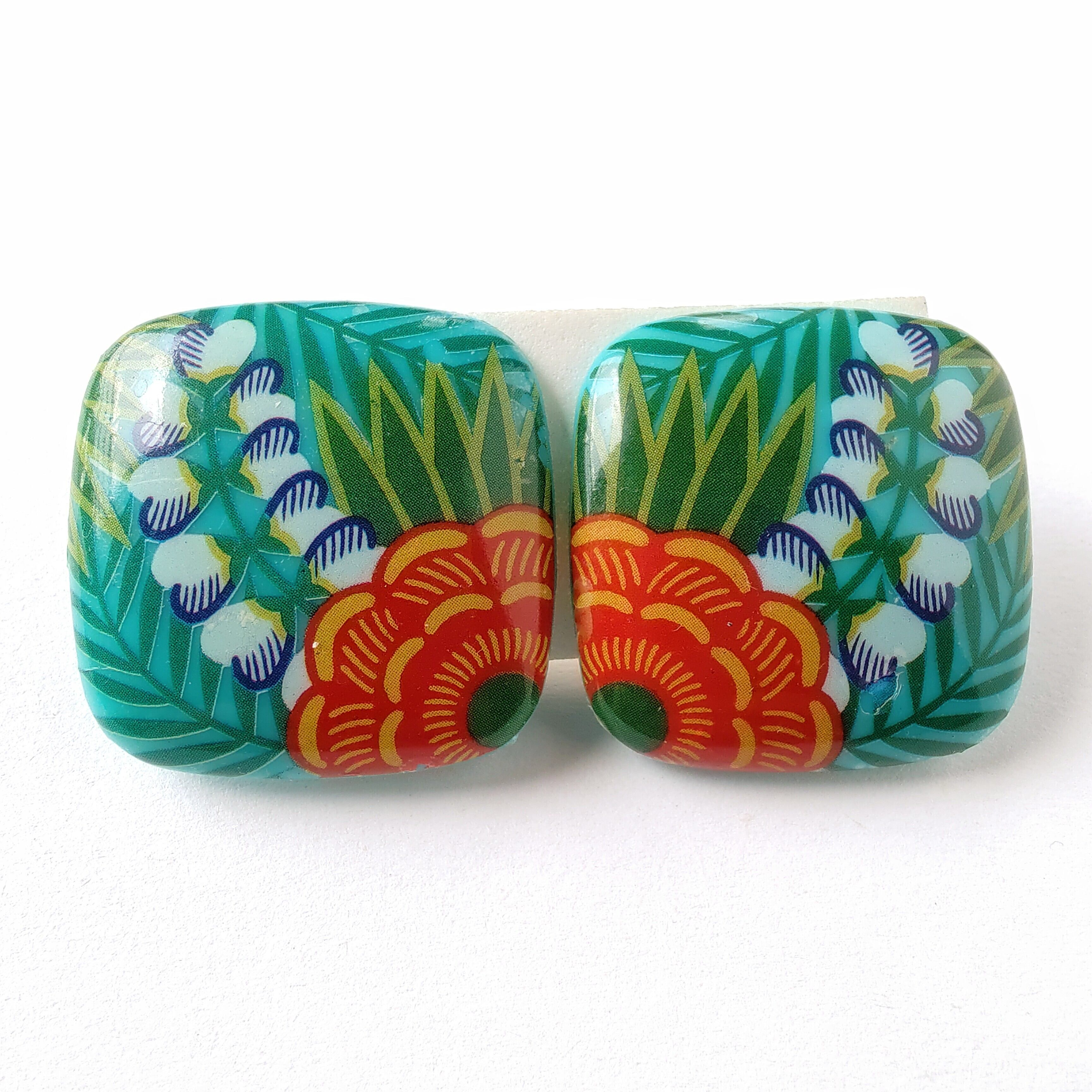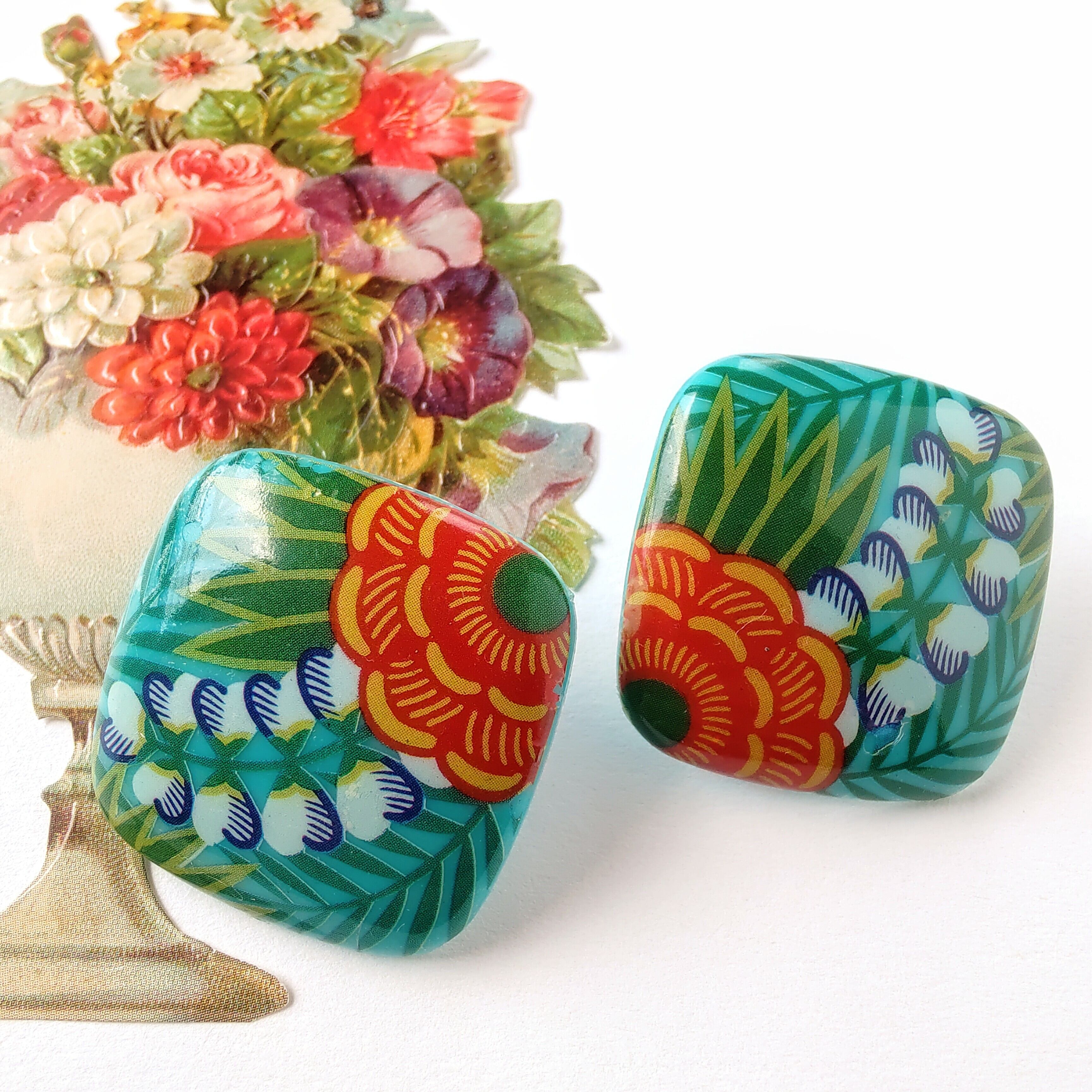 1886年アメリカのニューヨークにて小さな香水会社を創業、1971年に本格的にコスチュームジュエリーの製作を開始したAvon(エイボン)の1987年に販売された“tropical beauty”のターコイズブルーのスクエア型のプラスチックの表面にトロピカルフラワーがプリントされたヴィンテージイヤリングです。