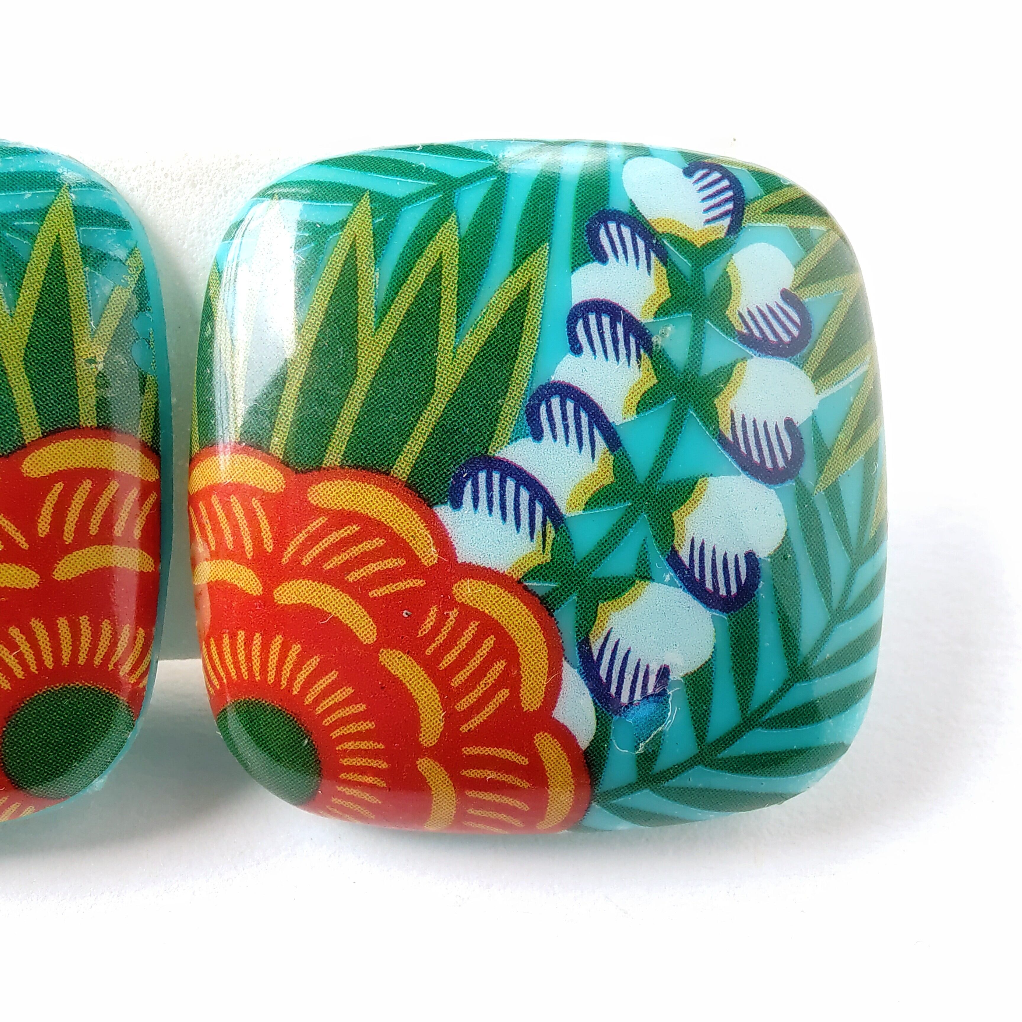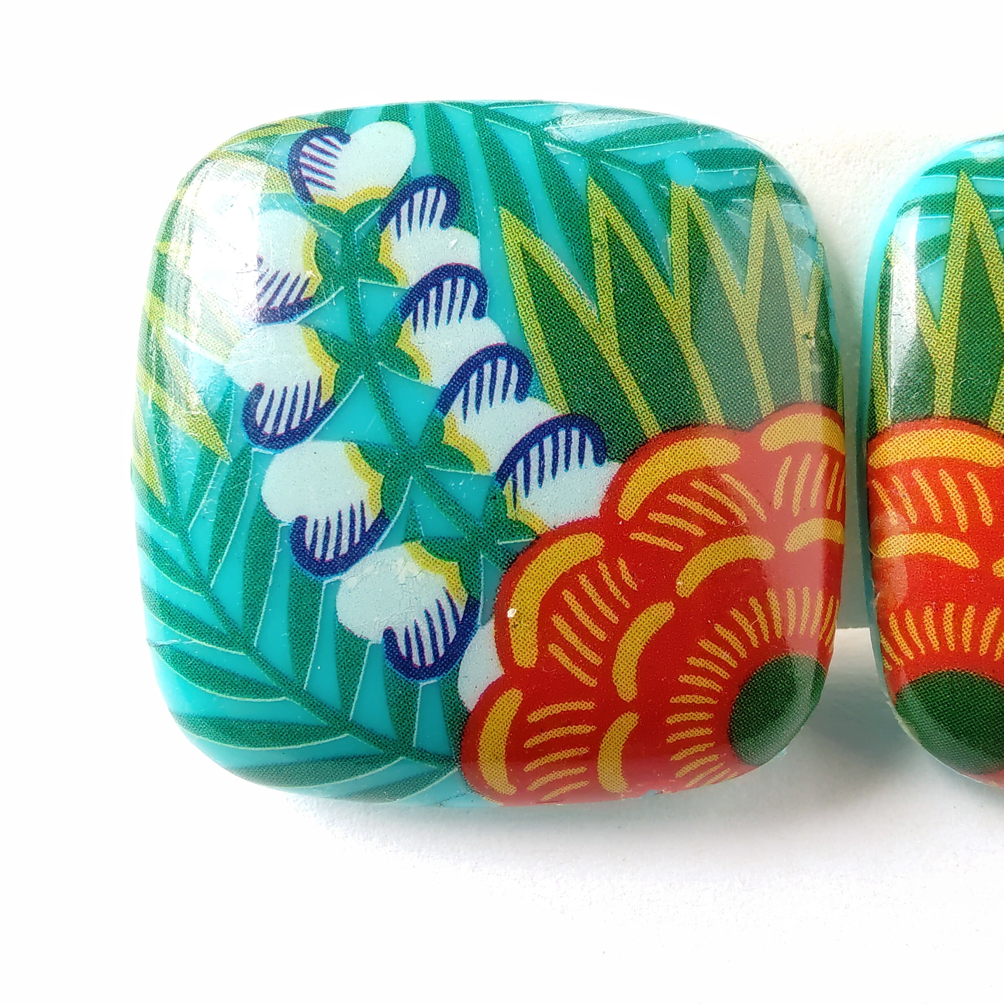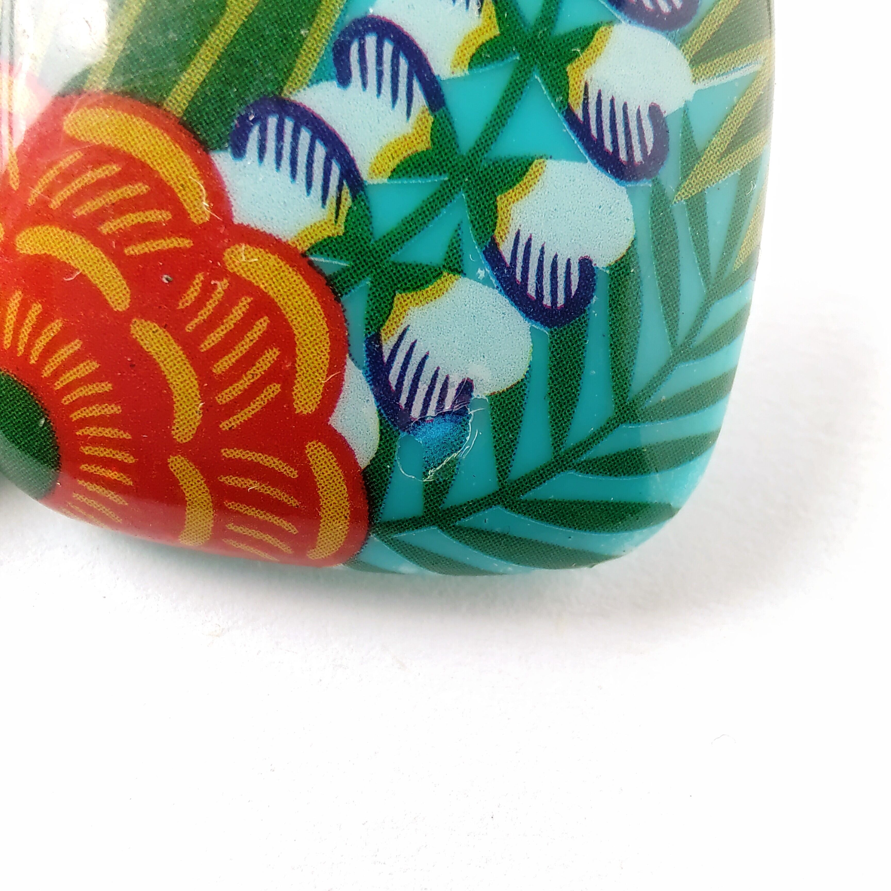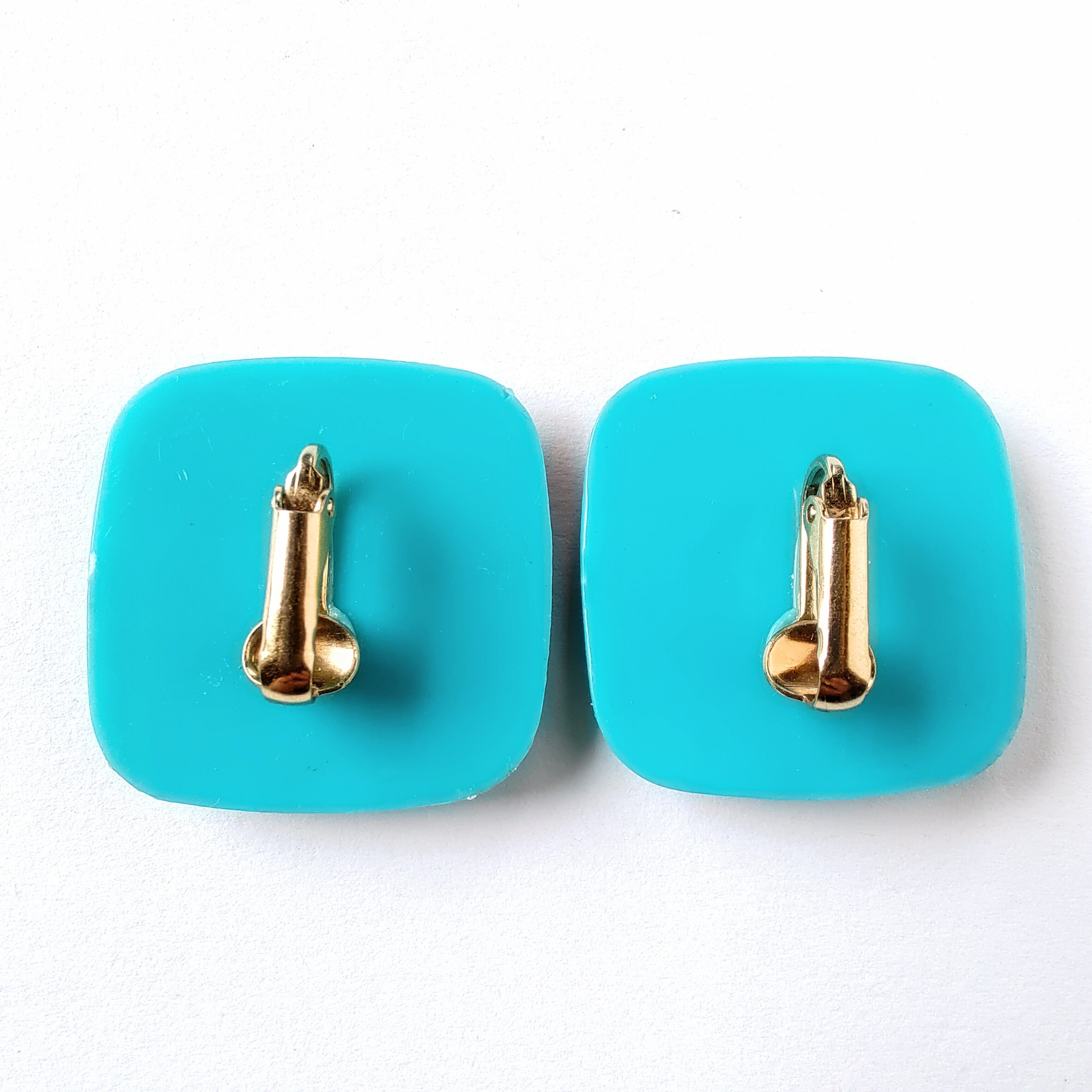 1886年アメリカのニューヨークにて小さな香水会社を創業、1971年に本格的にコスチュームジュエリーの製作を開始したAvon(エイボン)の1987年に販売された“tropical beauty”のターコイズブルーのスクエア型のプラスチックの表面にトロピカルフラワーがプリントされたヴィンテージイヤリングです。