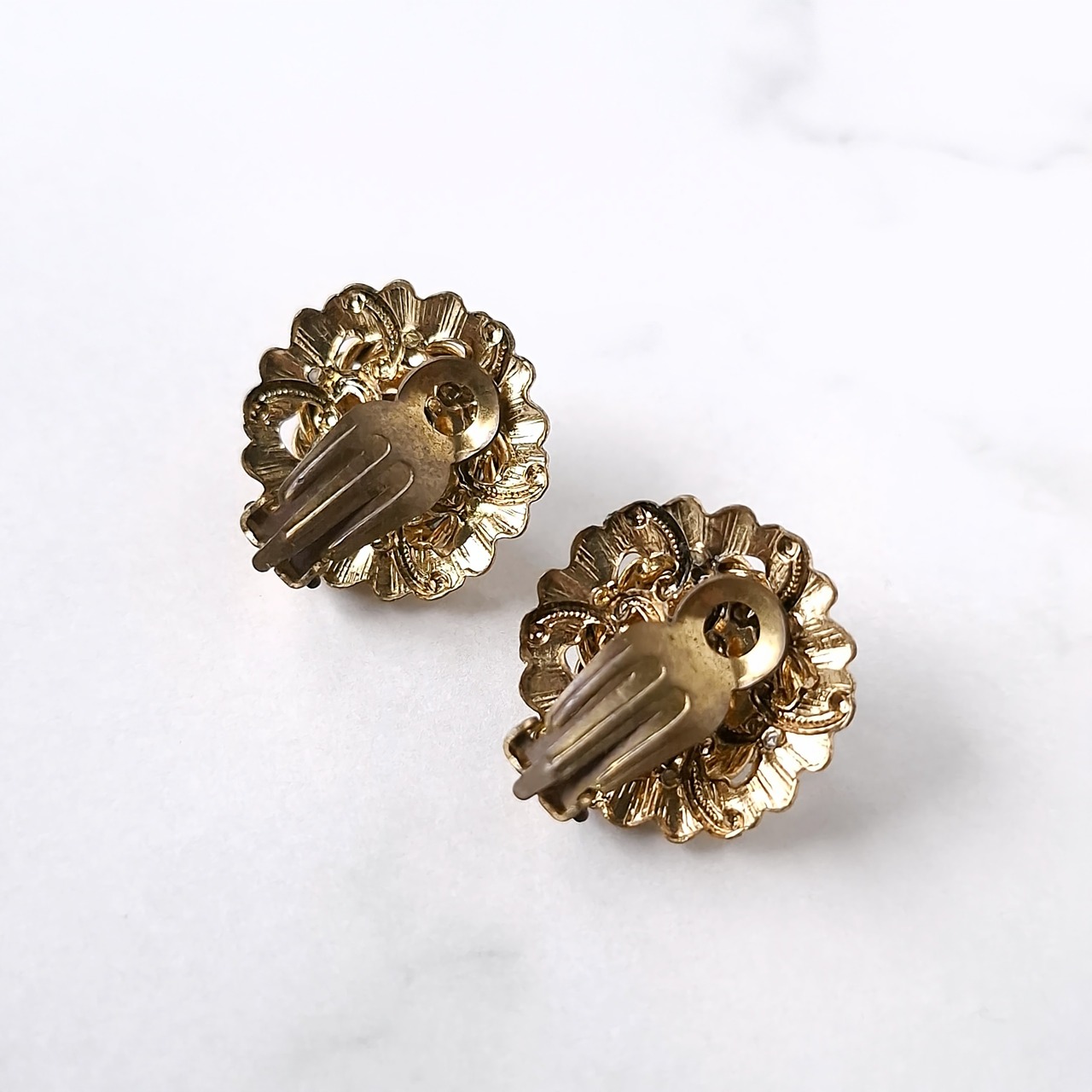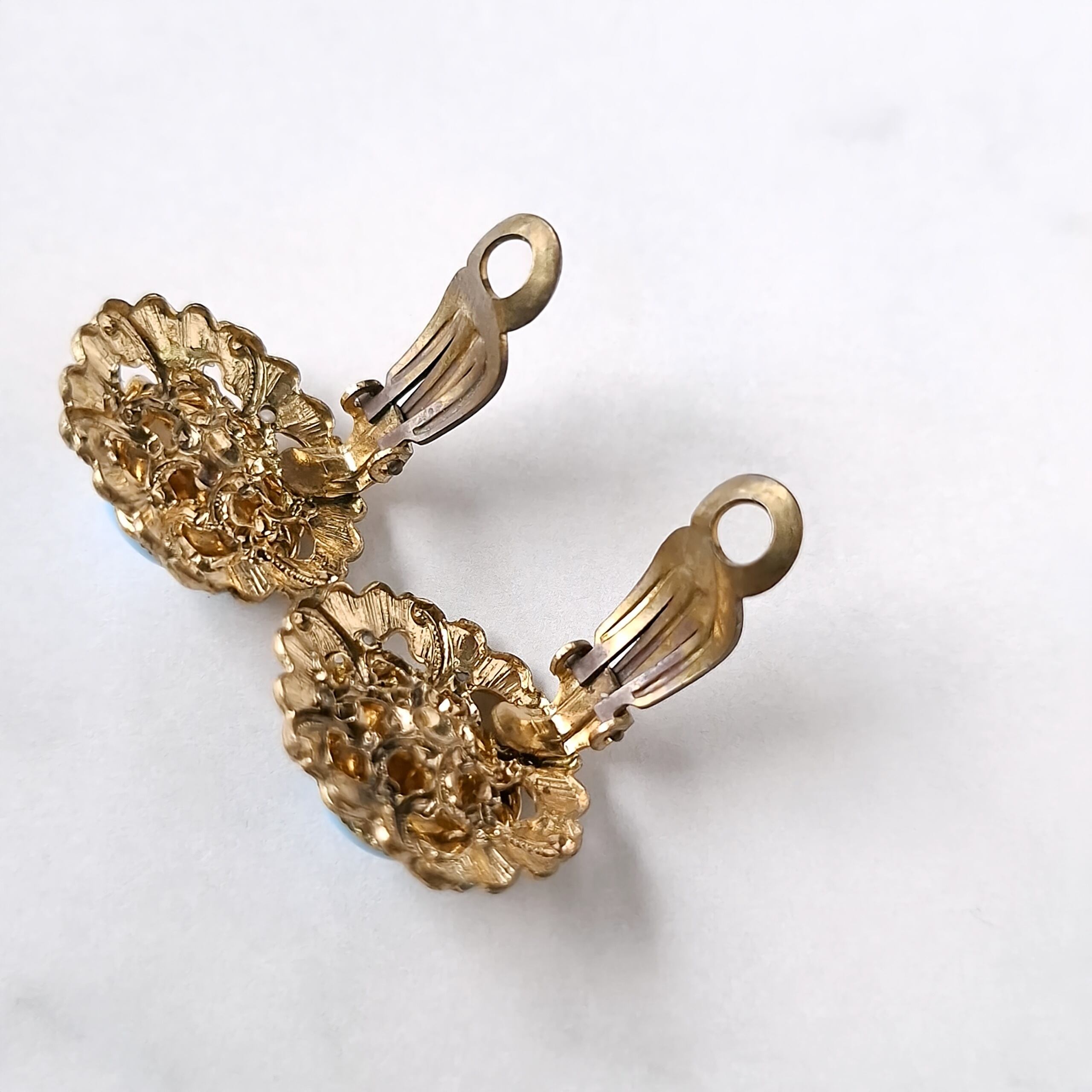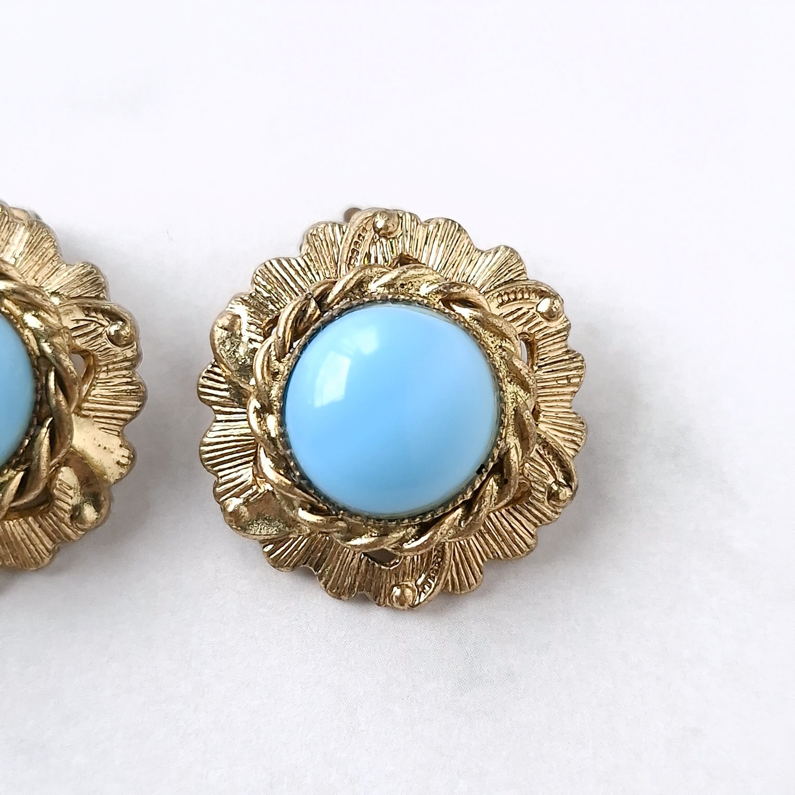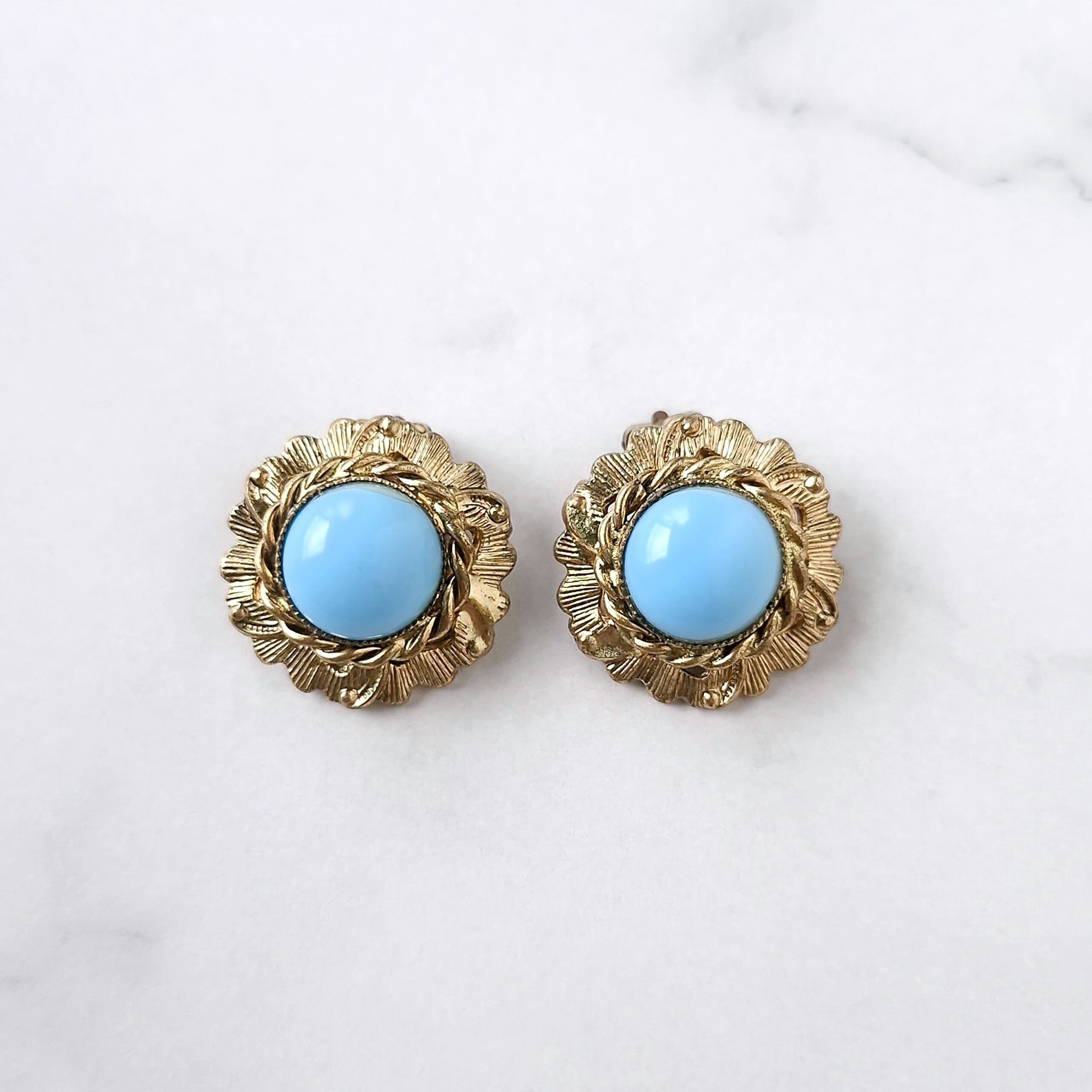 スワールやロープがデザインされたゴールドのベースメタルにターコイズブルーのプラスチックカボションがあしらわれたヴィンテージイヤリングです。