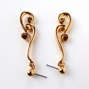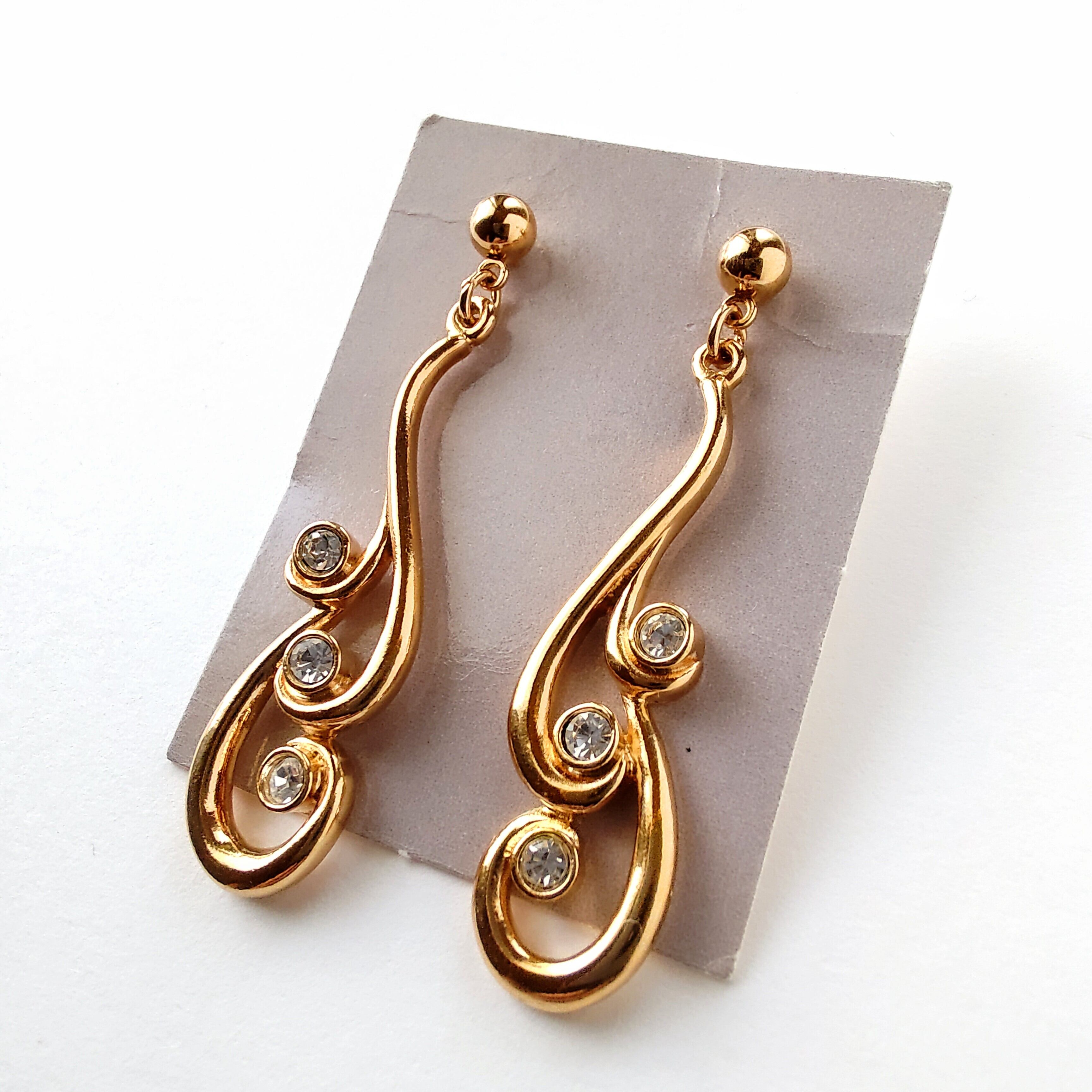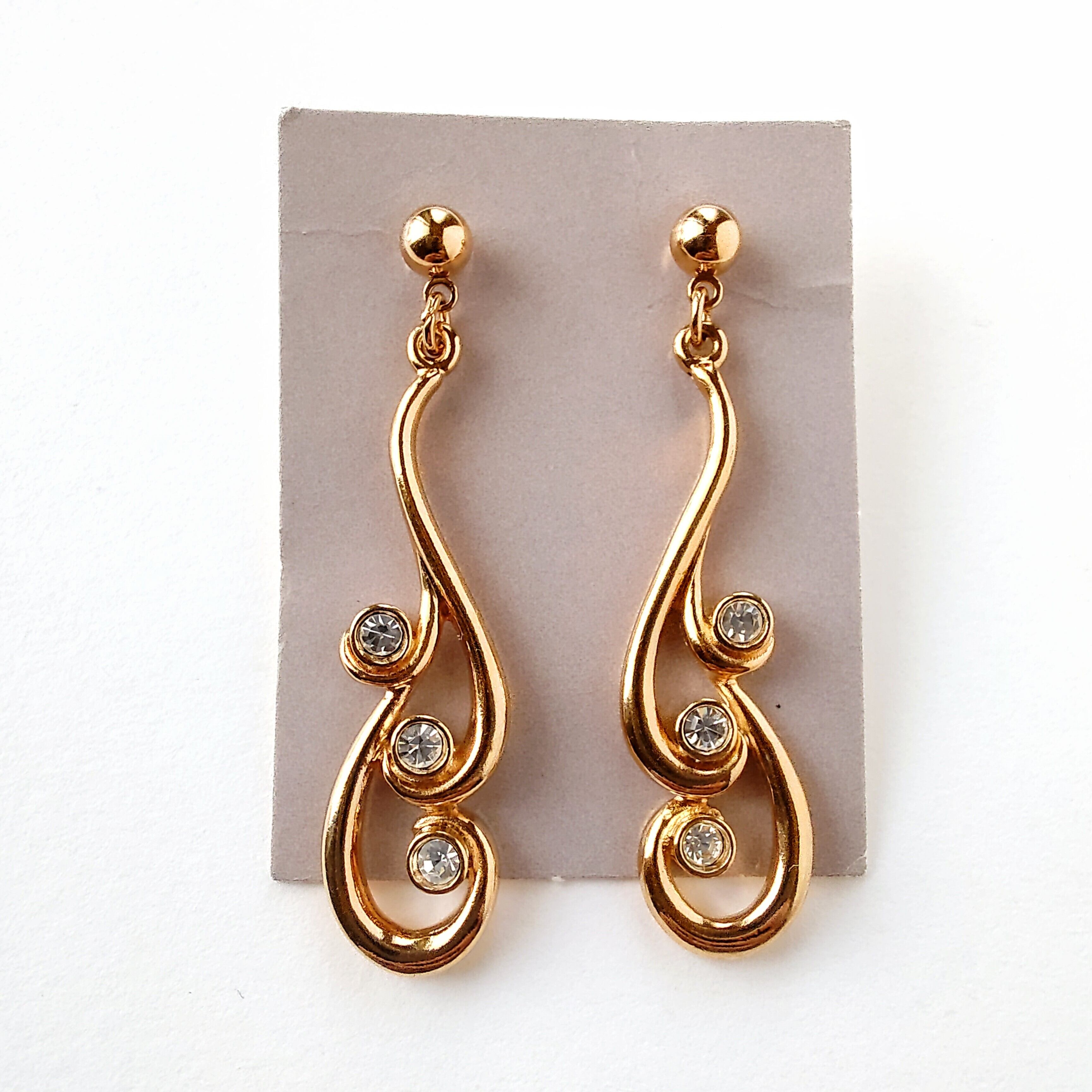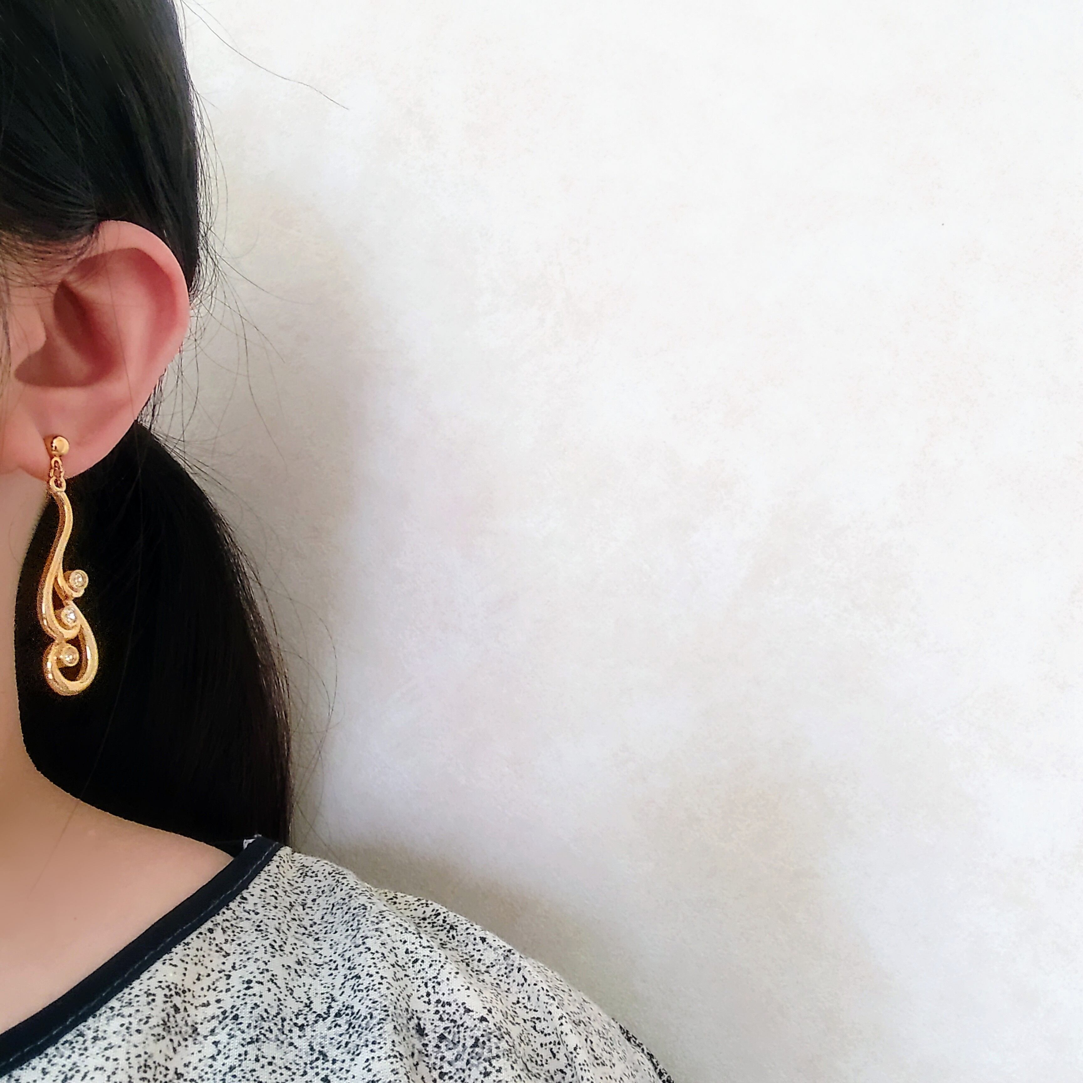 1886年アメリカのニューヨークにて小さな香水会社を創業、1971年に本格的にコスチュームジュエリーの製作を開始したAvon(エイボン)の1991年に販売されたスワールデザインのゴールドメタルにクリアなラインストーンがセットされた揺れるタイプの「melody dangle」のヴィンテージピアスです。