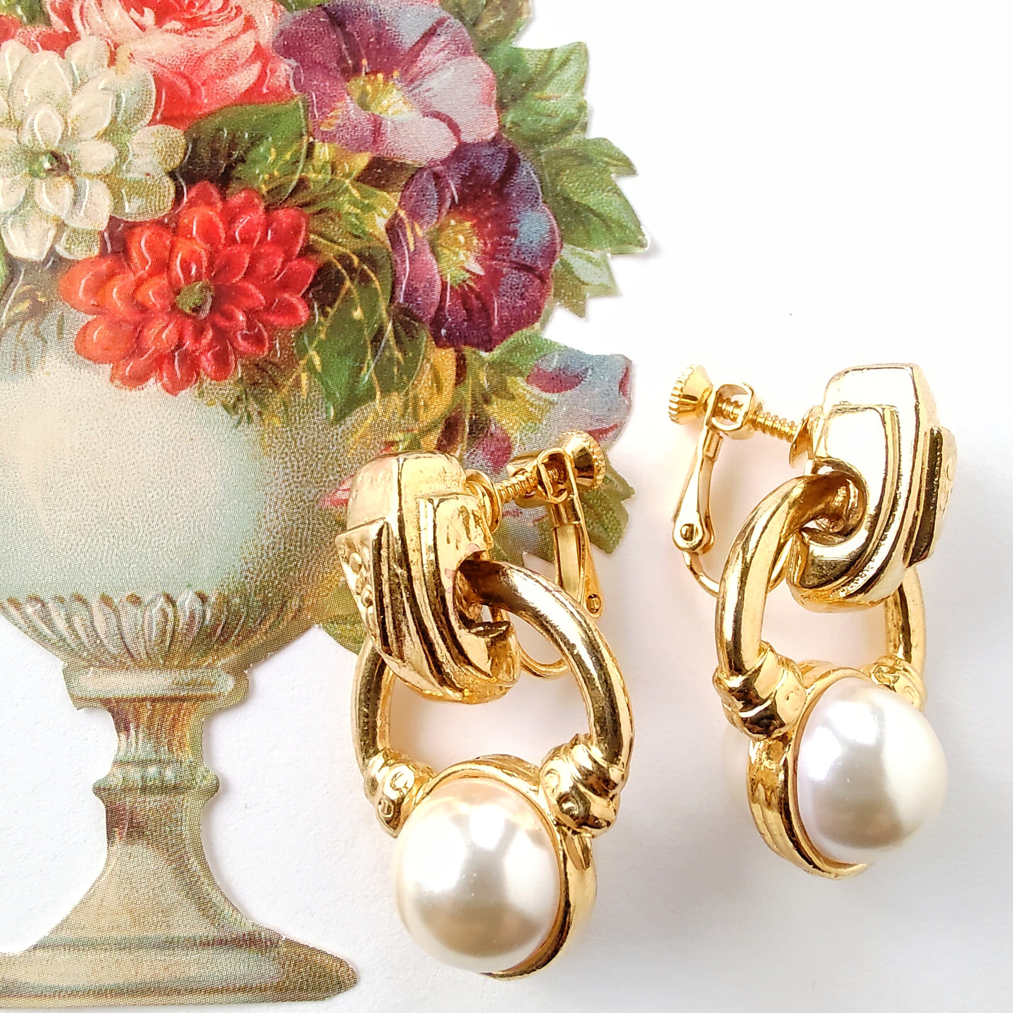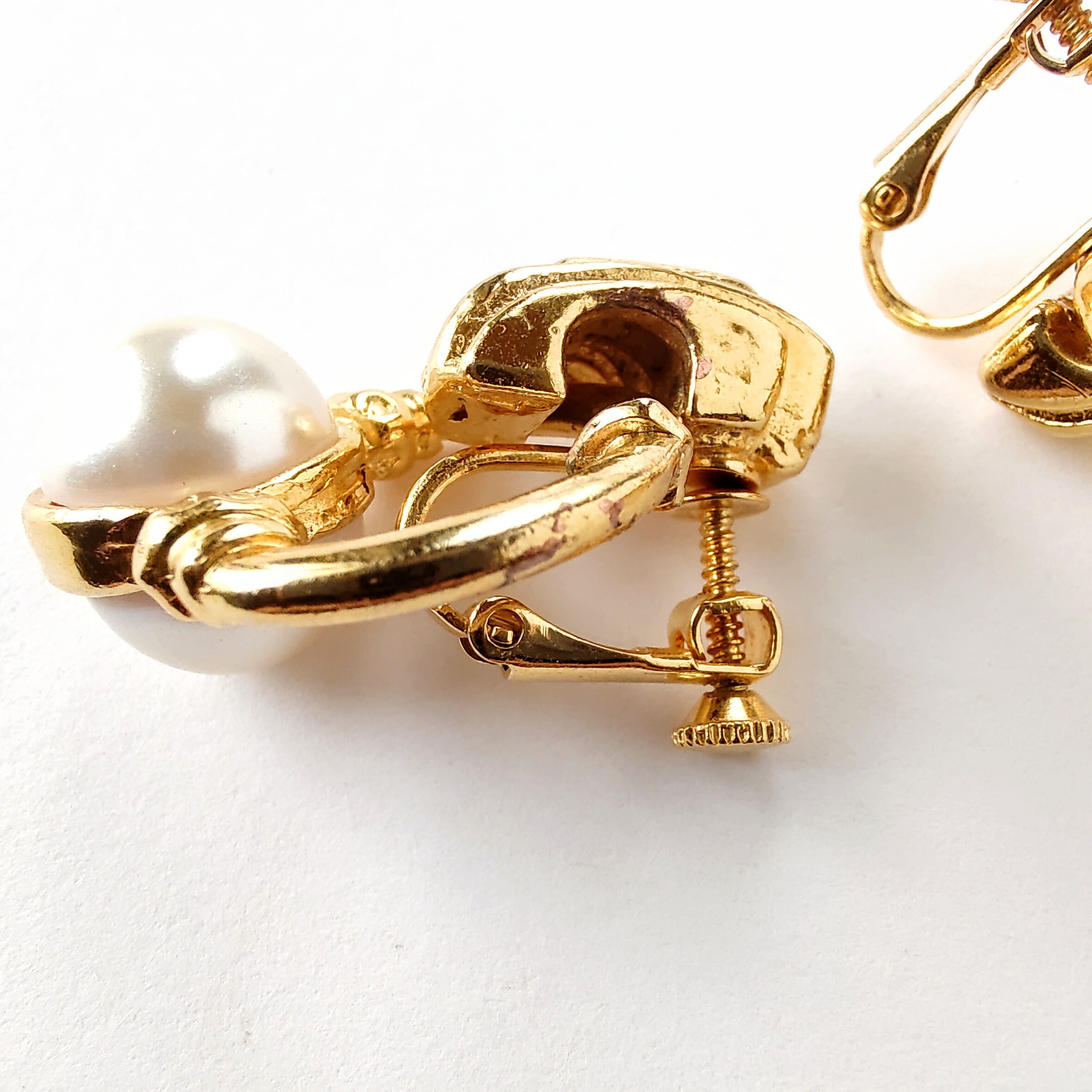 フェイクパールがあしらわれたゴールドメタルのドアノッカーデザインのヴィンテージイヤリングです。
