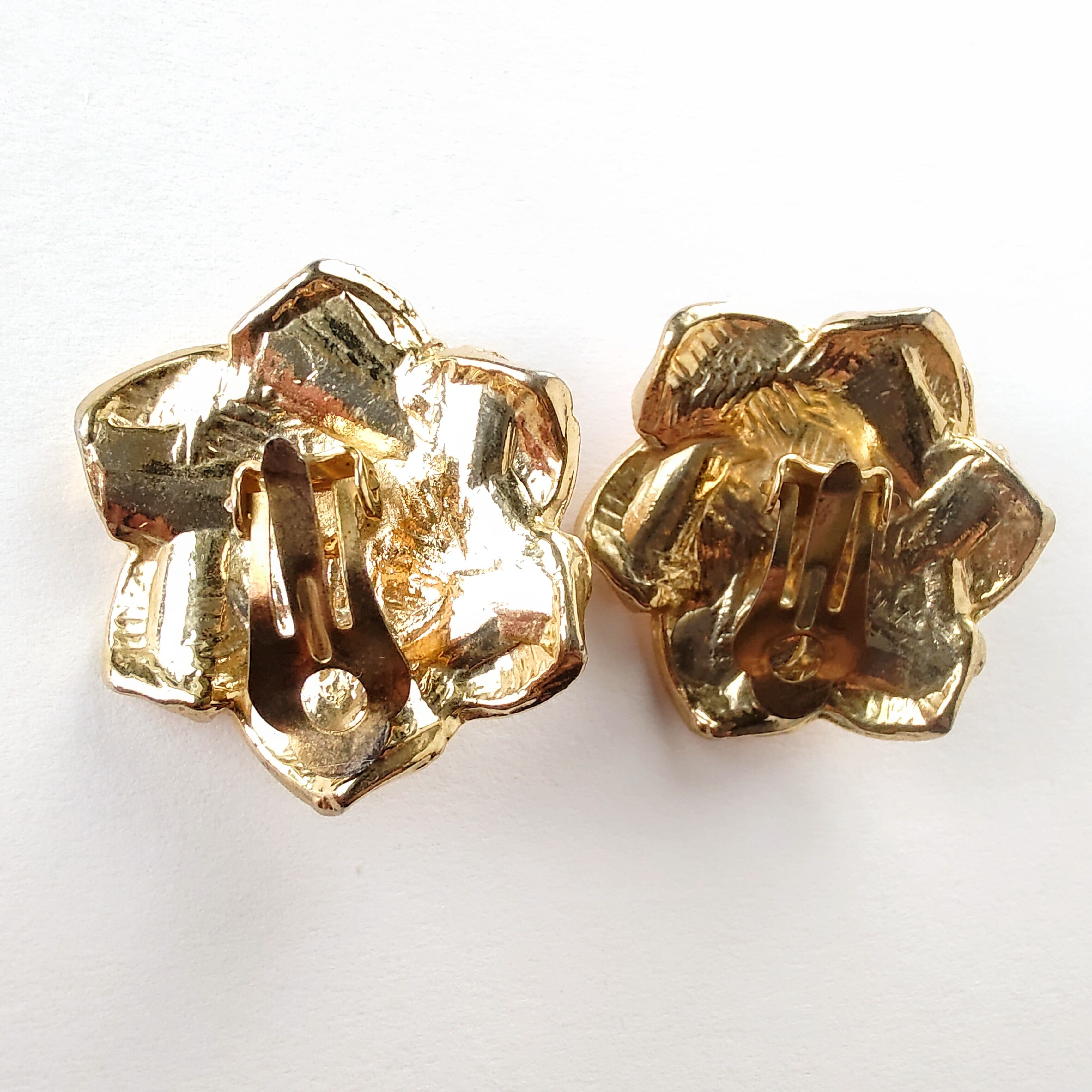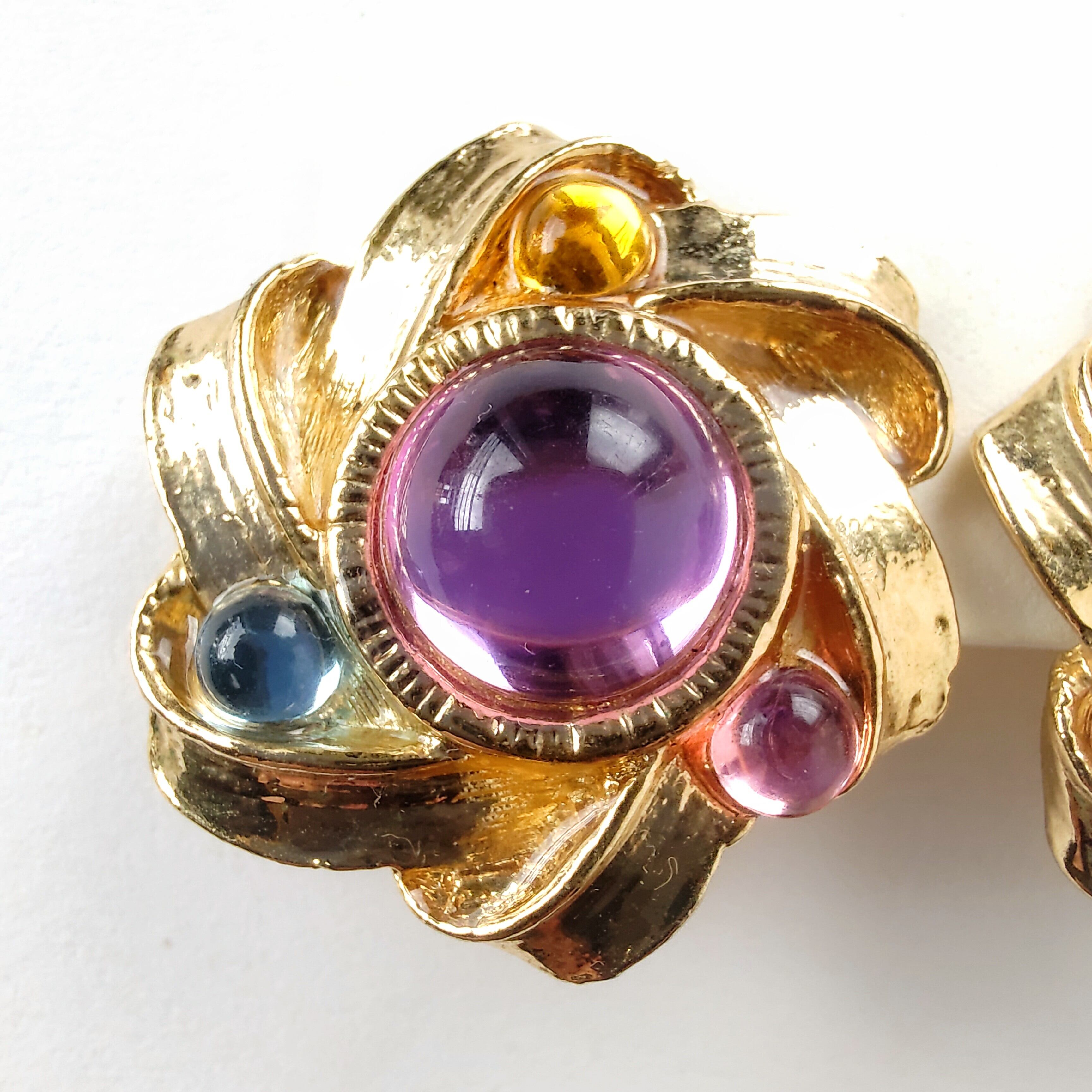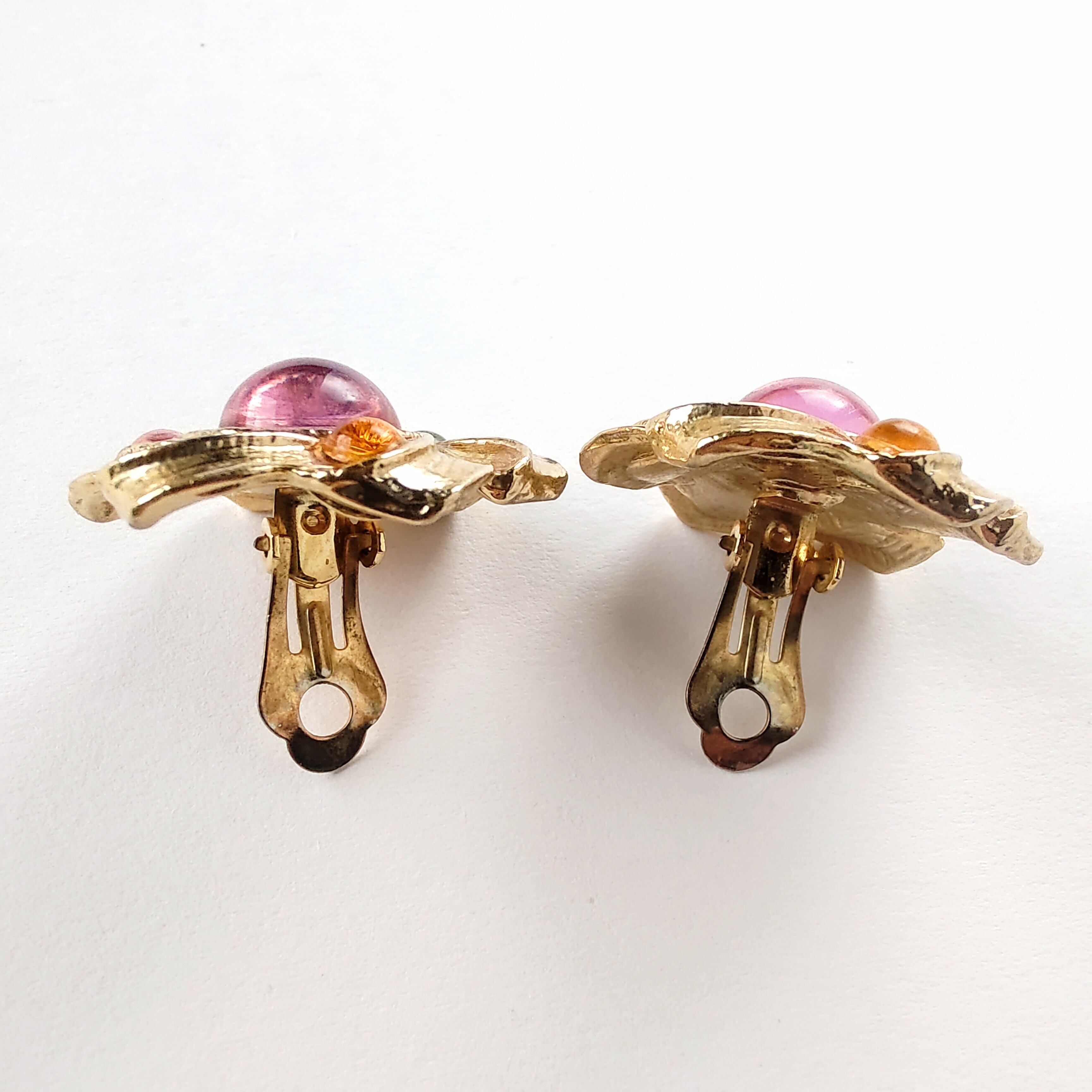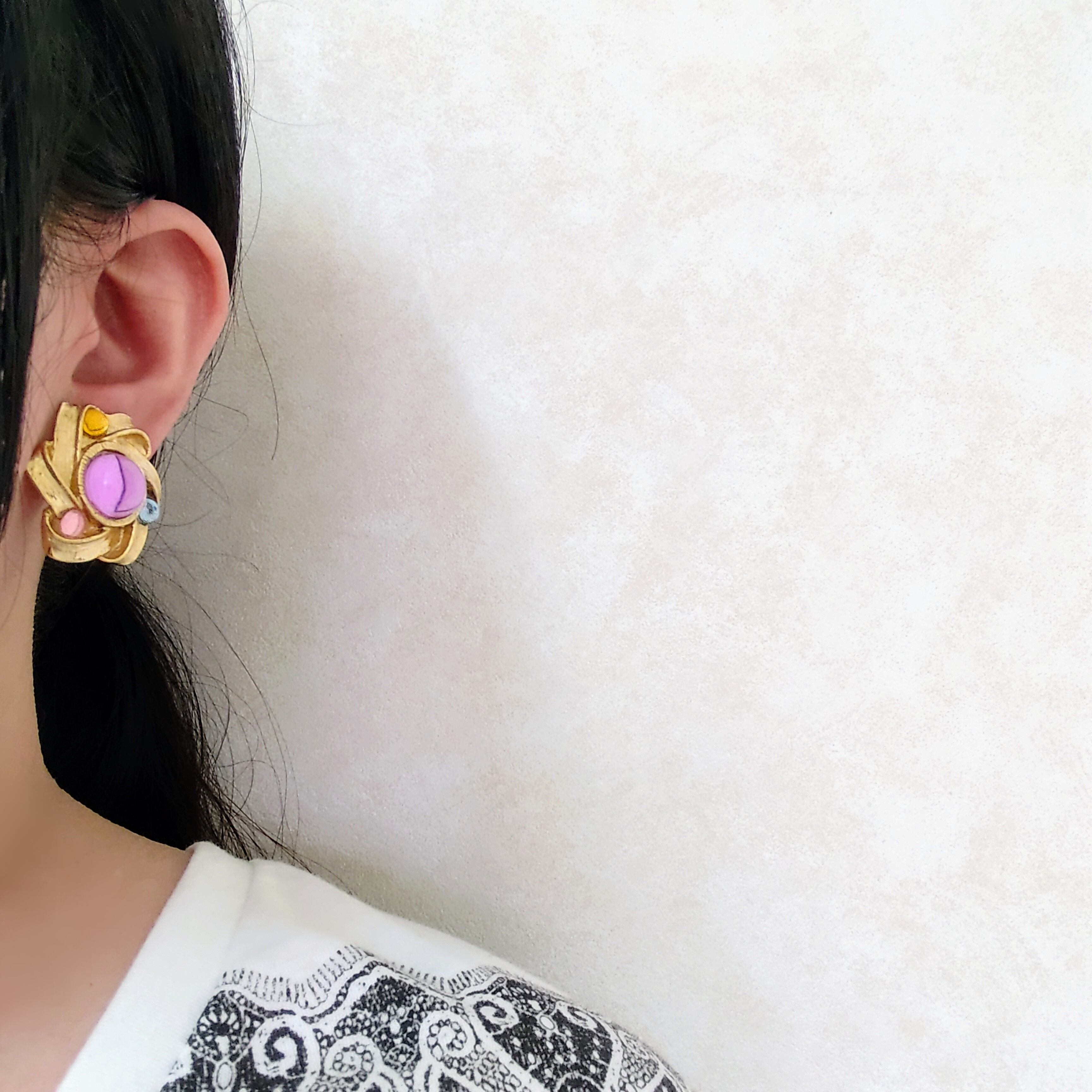 フラワーリボンをデザインしたゴールドメタルにパステルカラーのパープル、ピンク、イエロー、ブルーのガラスカボションがあしらわれたヴィンテージイヤリングです。