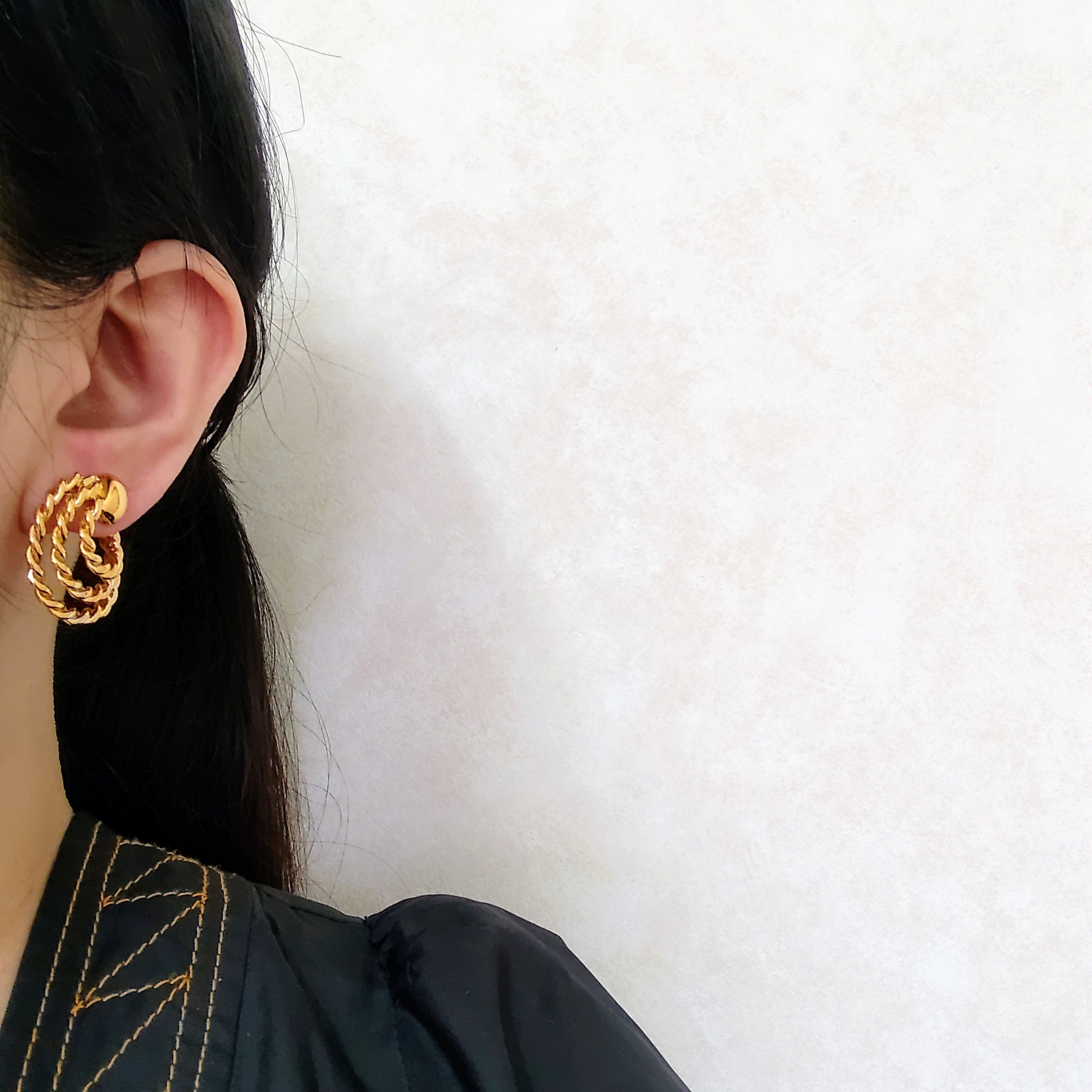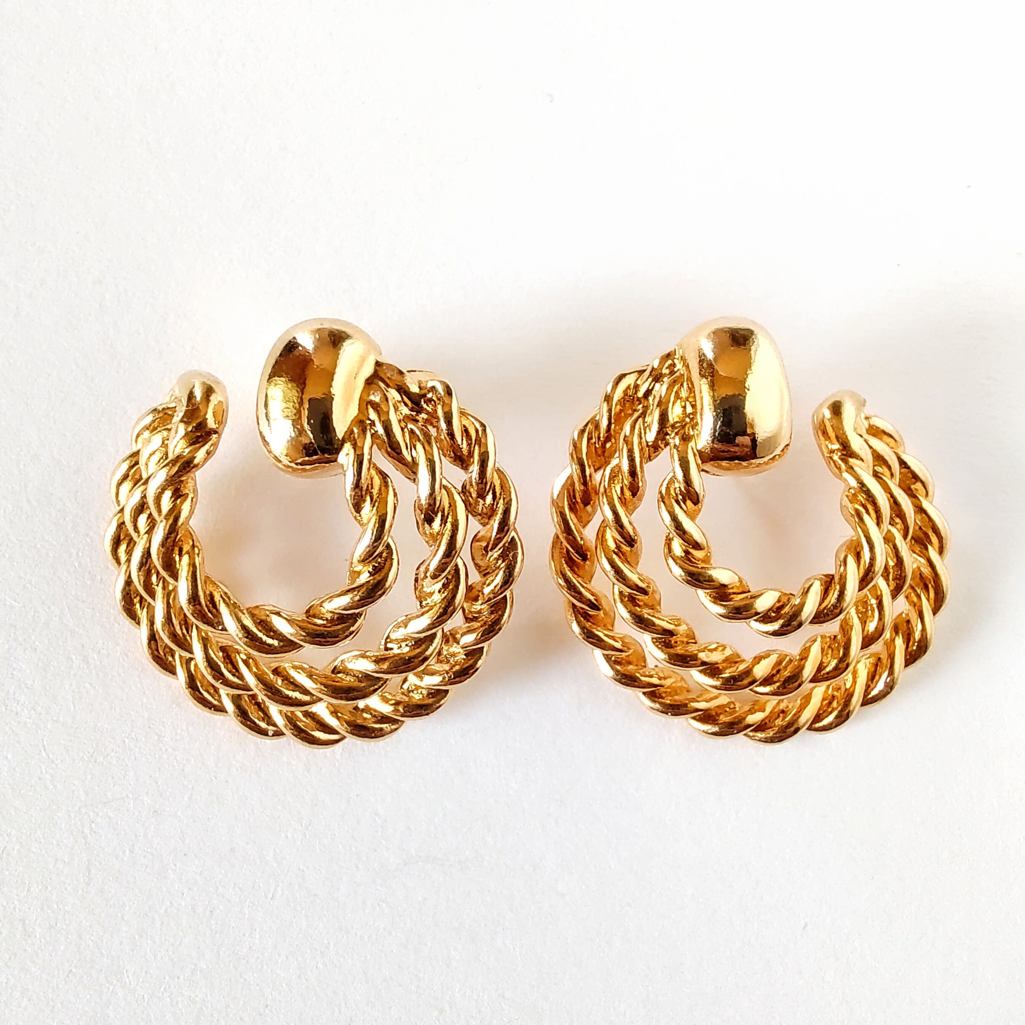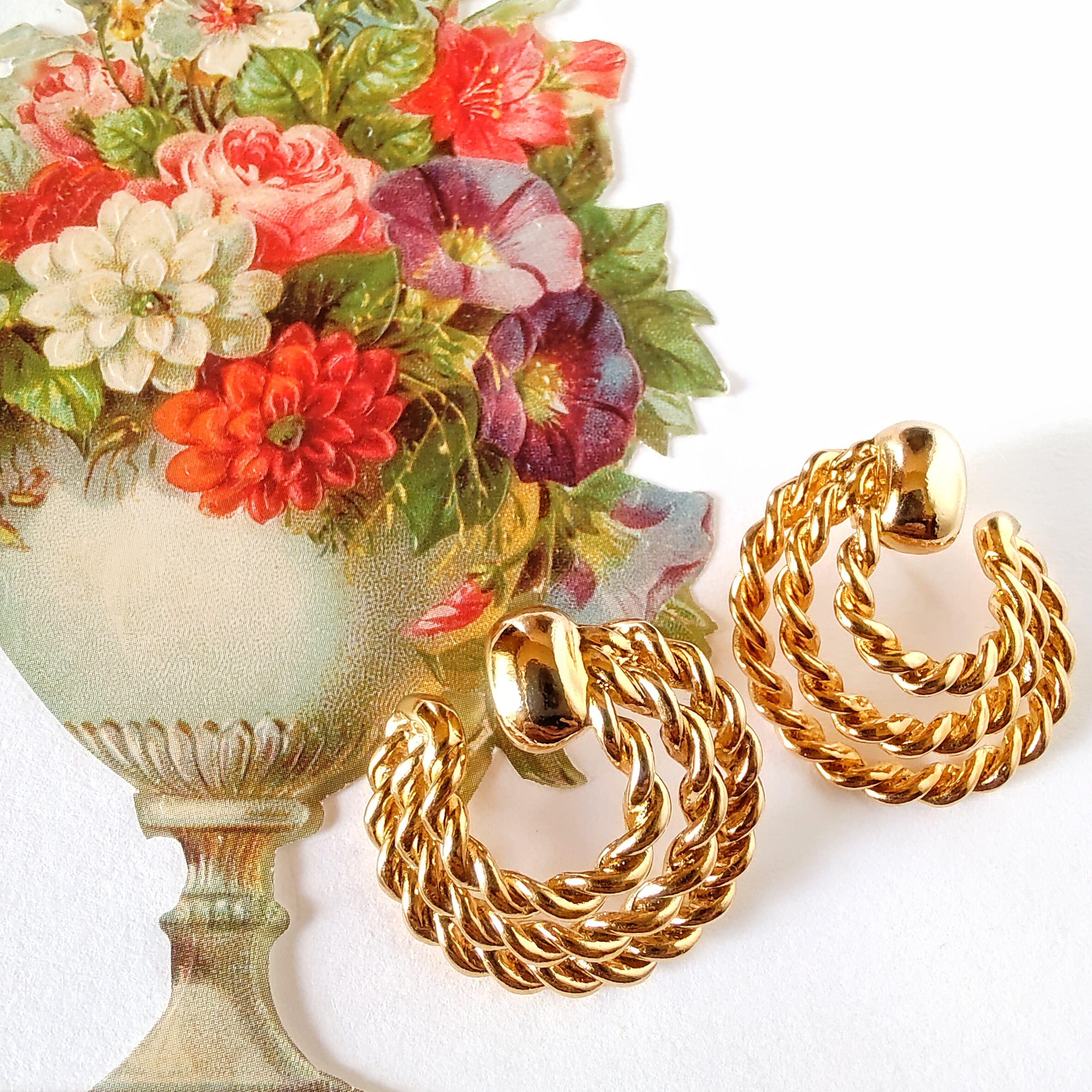 1886年アメリカのニューヨークにて小さな香水会社を創業、1971年に本格的にコスチュームジュエリーの製作を開始したAvon(エイボン)の1992年に販売された“Golden Braid”のゴールドメタルの3本のロープがカールしたデザインのヴィンテージピアスです。