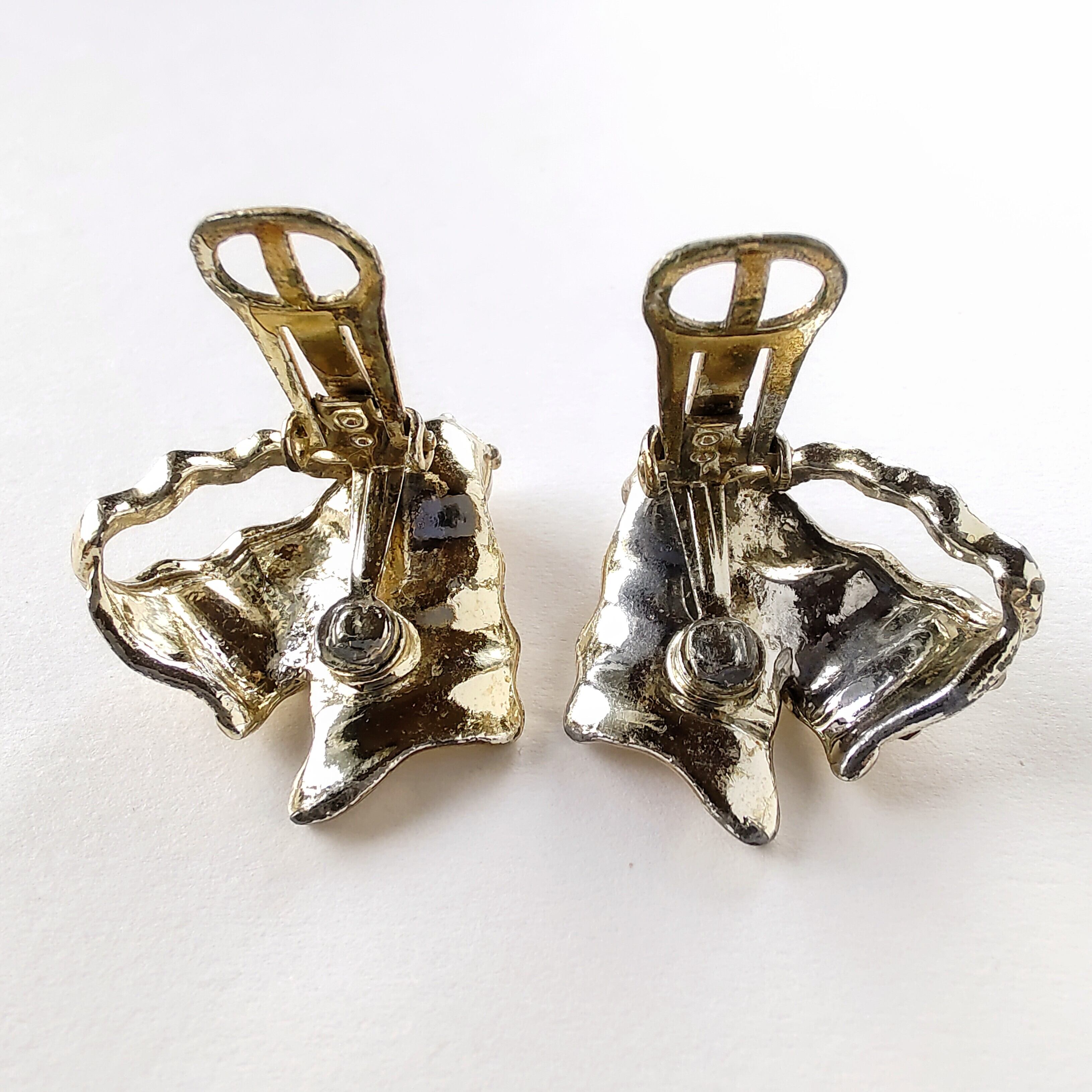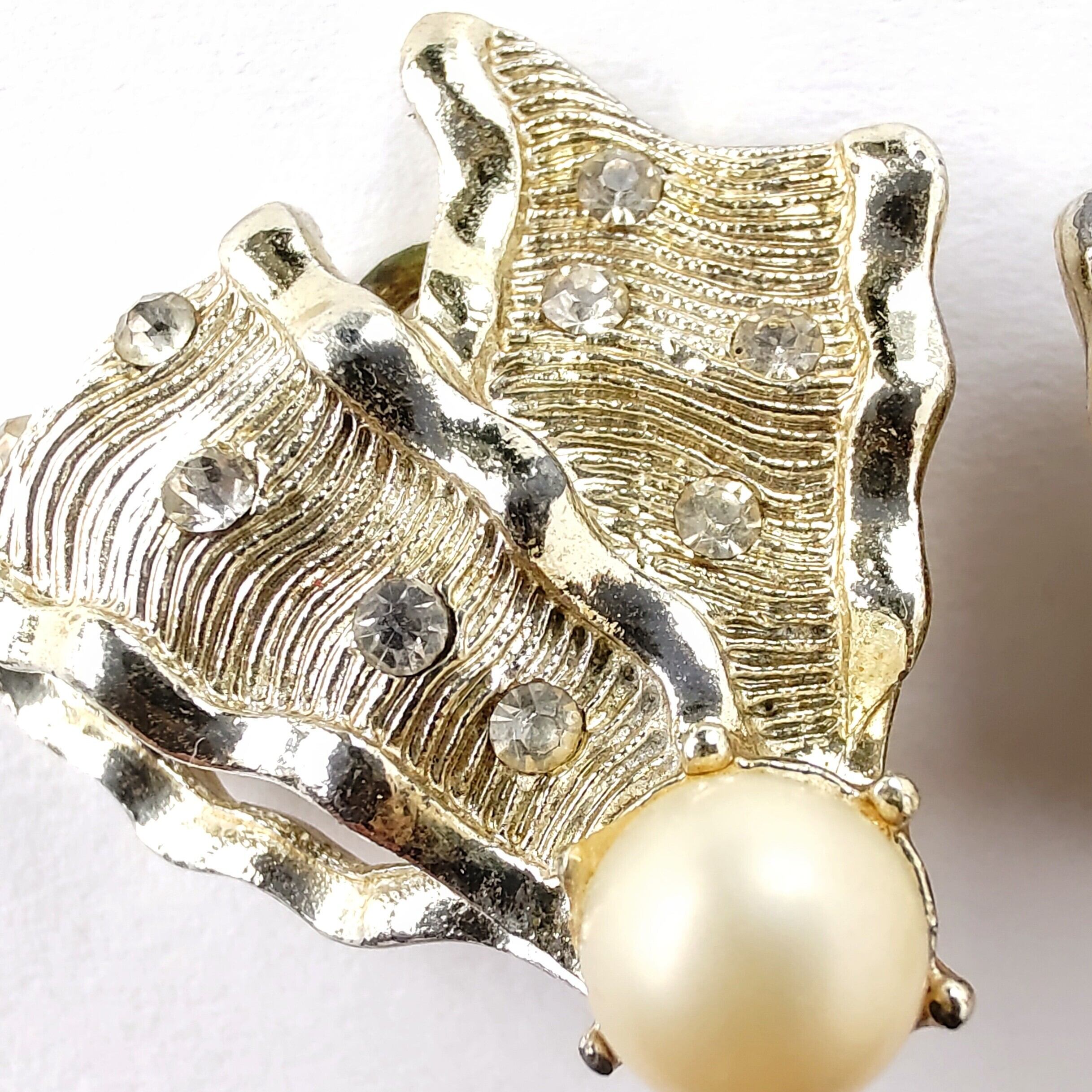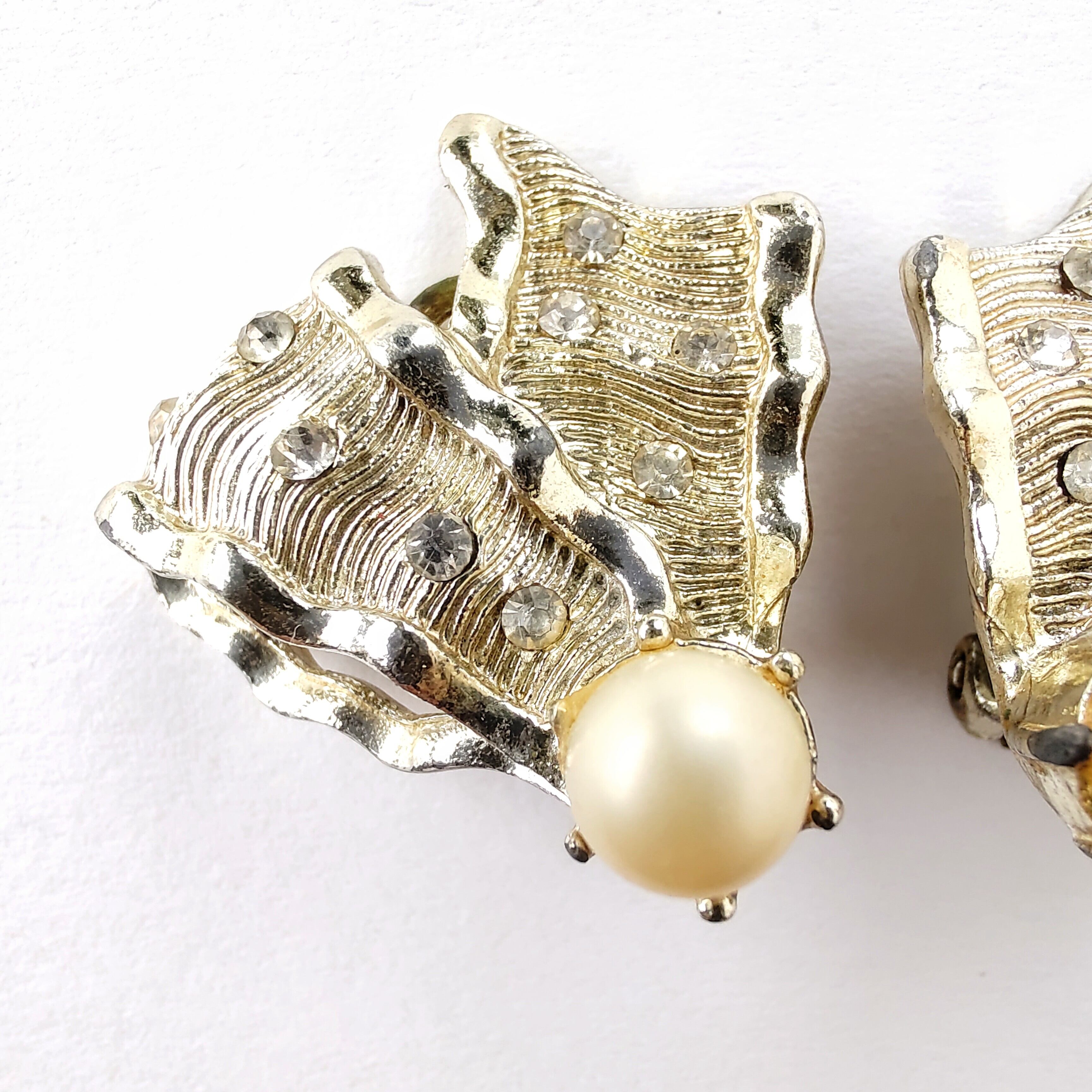 薄いゴールドメタルのリボンにフェイクパールとクリアラインストーンがあしらわれたヴィンテージイヤリングです。