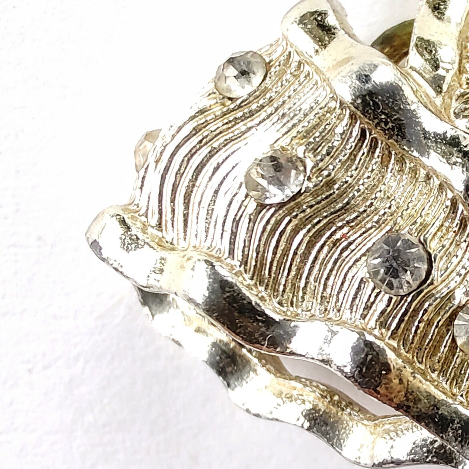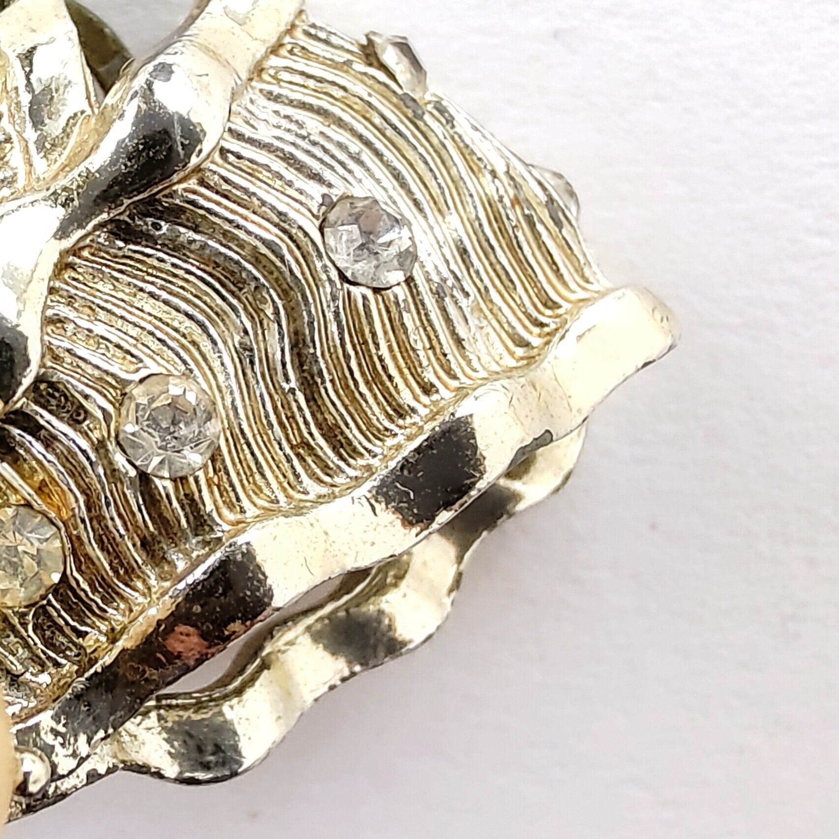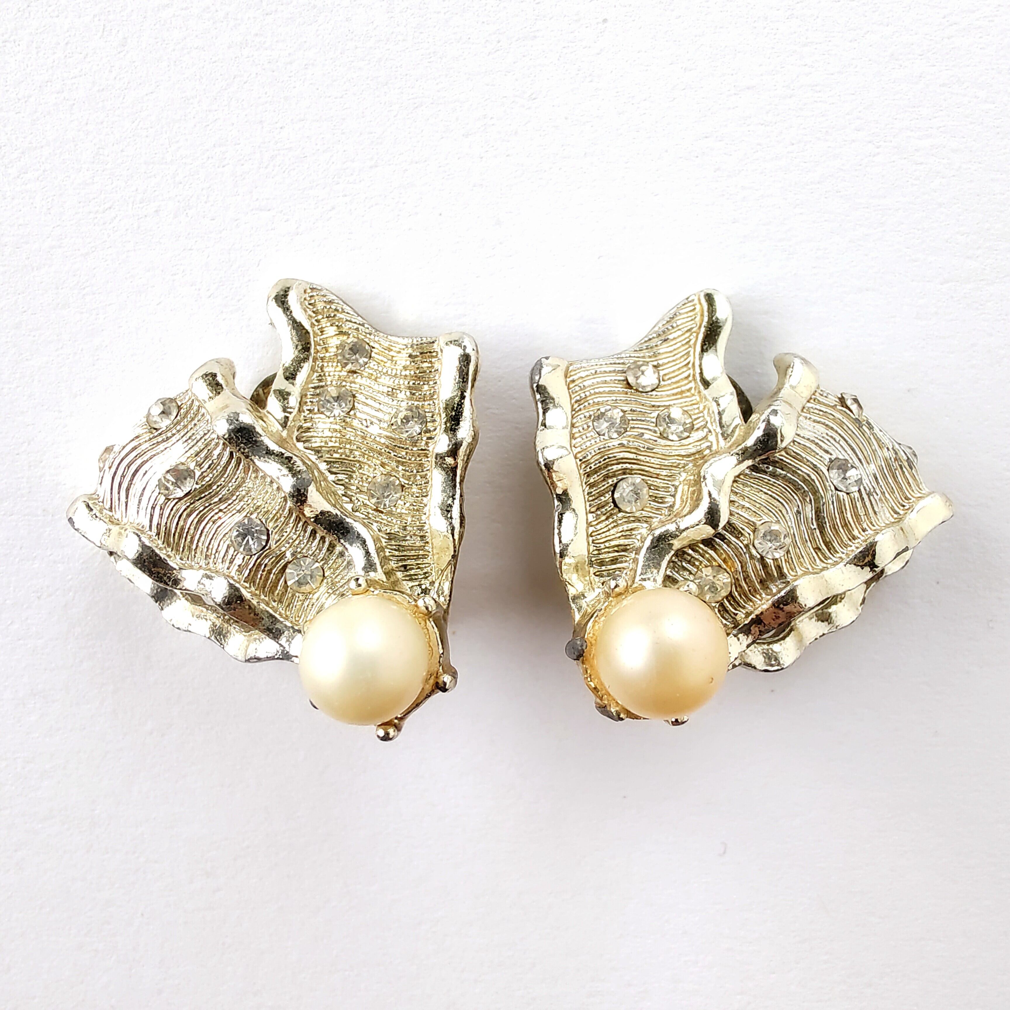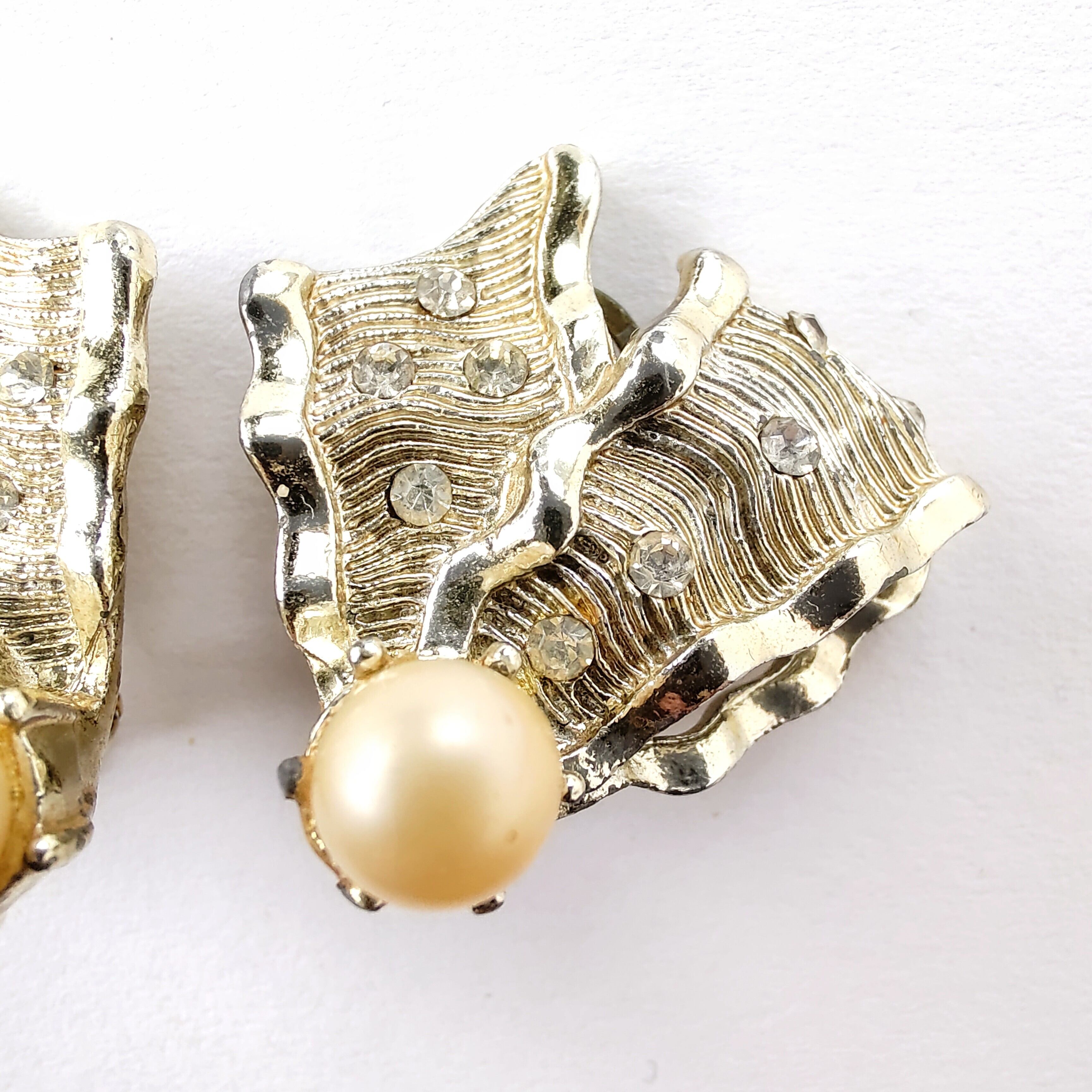 薄いゴールドメタルのリボンにフェイクパールとクリアラインストーンがあしらわれたヴィンテージイヤリングです。
