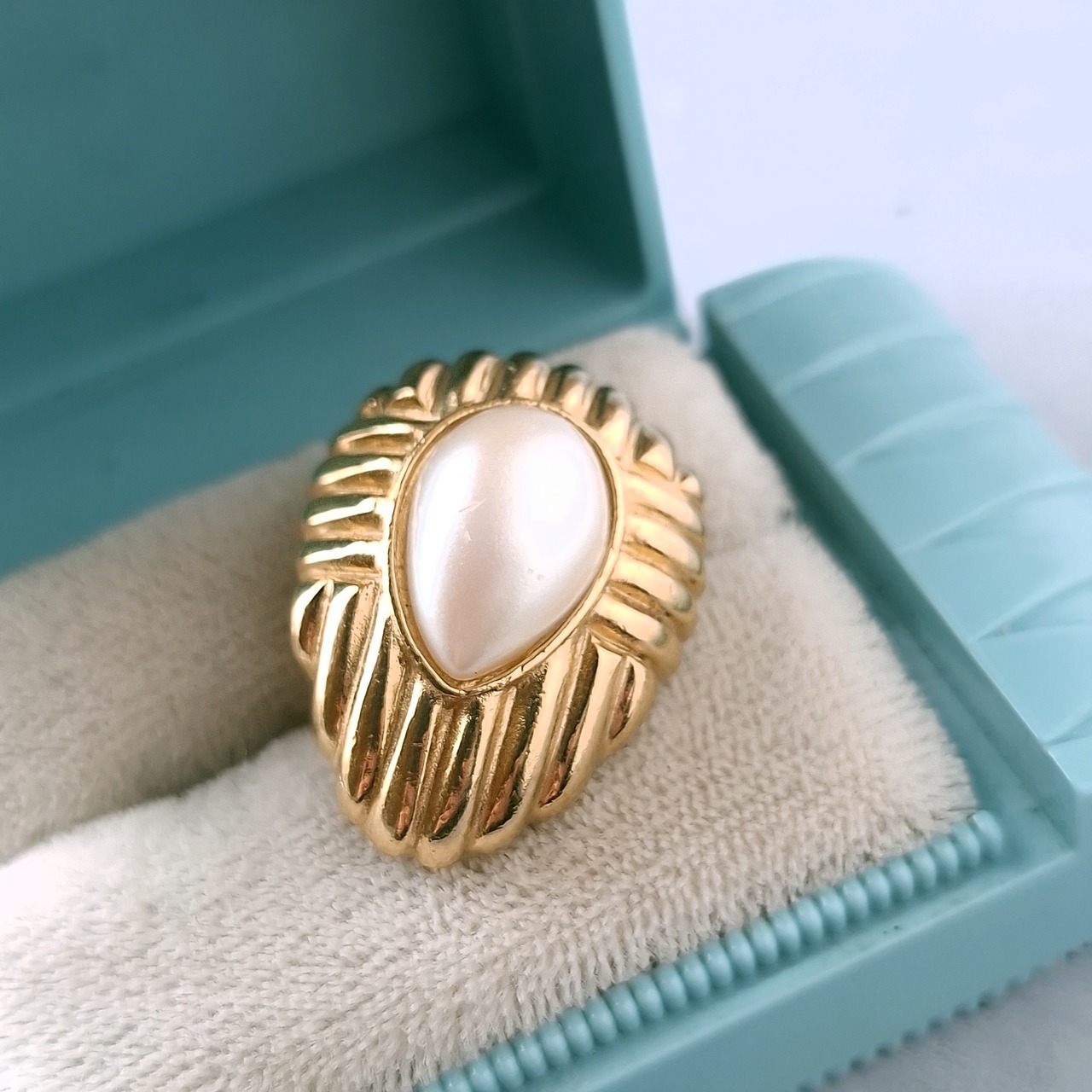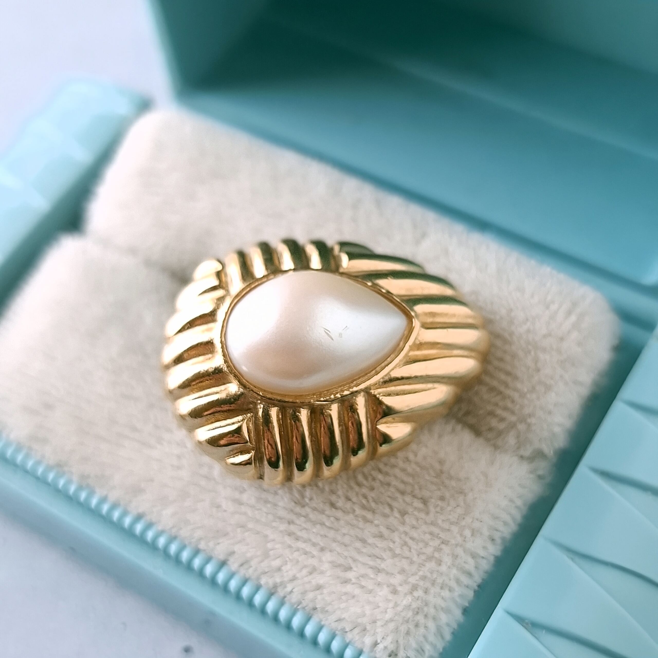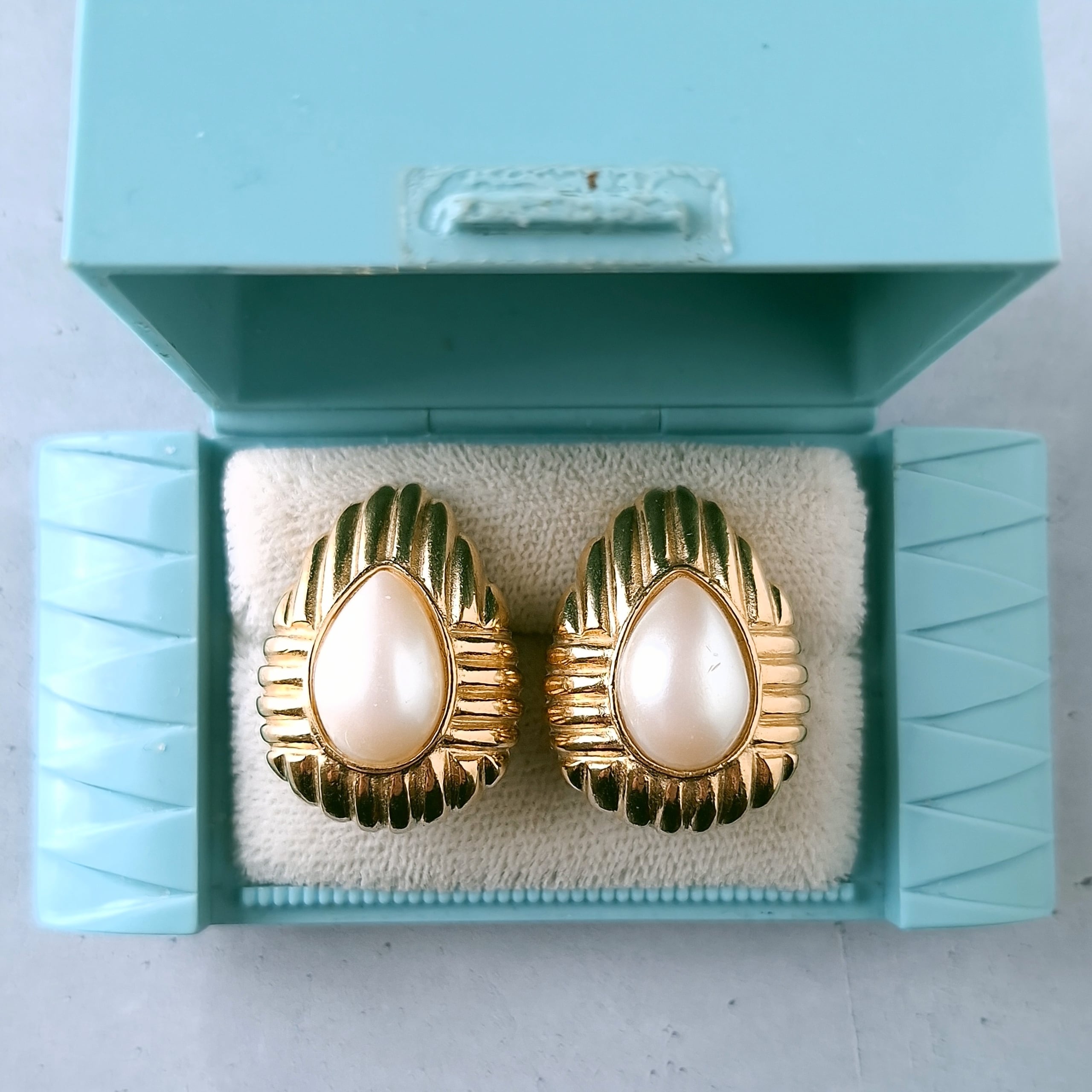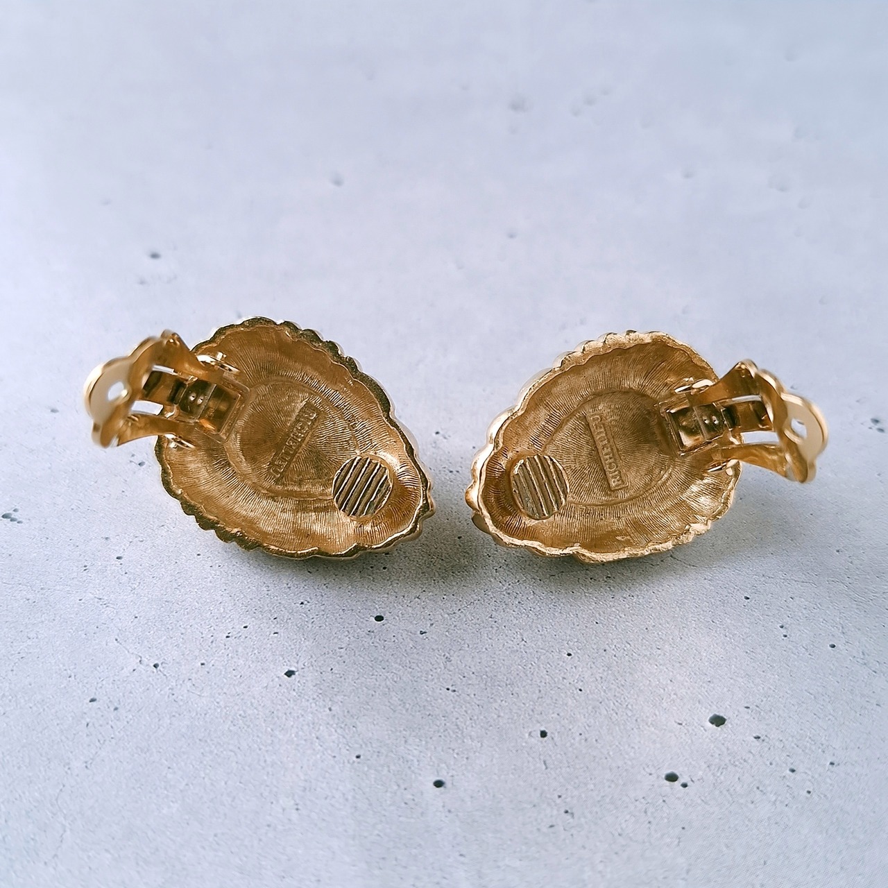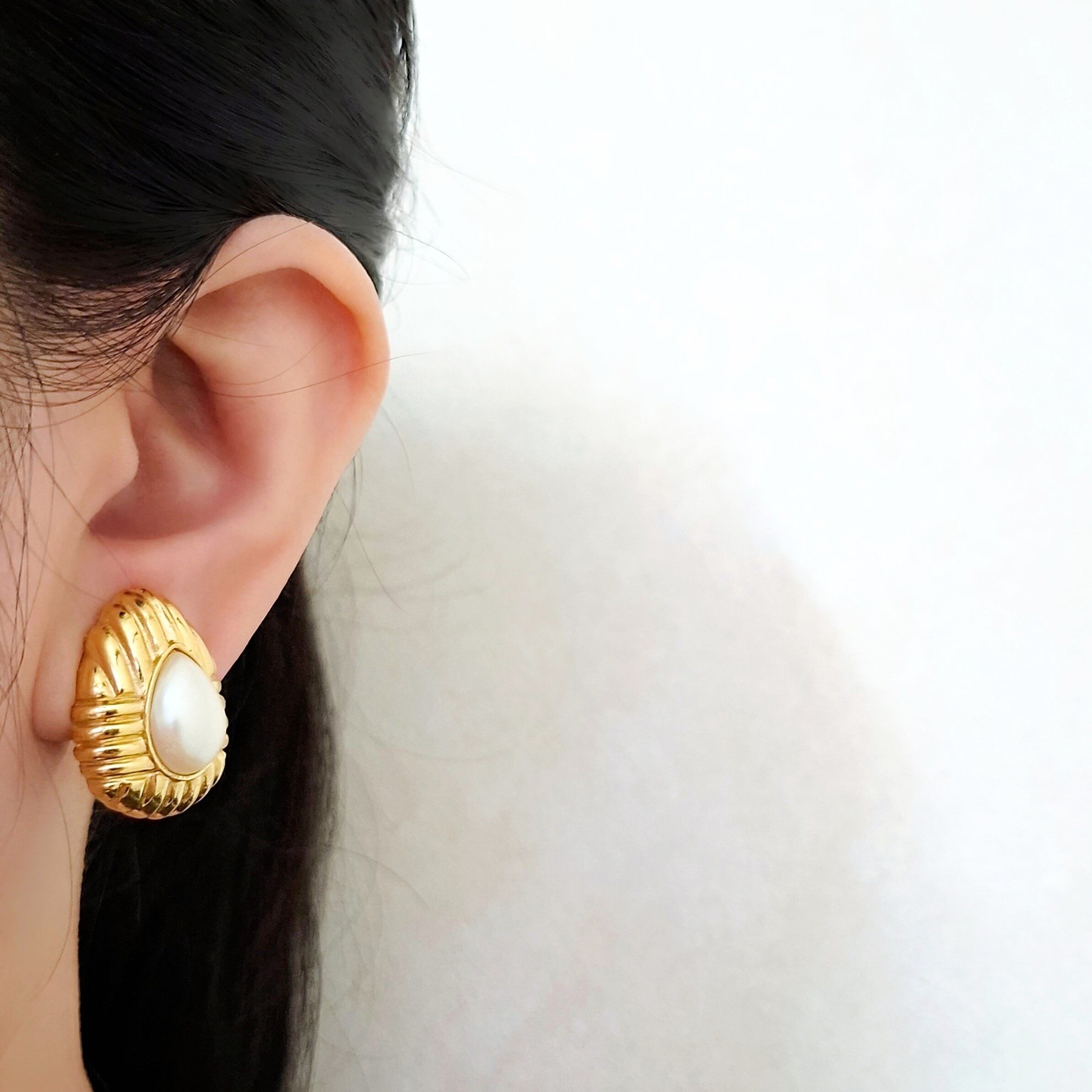 1911年ニューヨークのブルックリンにて創業、1978年にLISNER(リスナー)と合併したRichelieu(リシュリュー)の線状の模様が施されたゴールドメタルの中央にフェイクパールがあしらわれたドロップ型のヴィンテージイヤリングです。