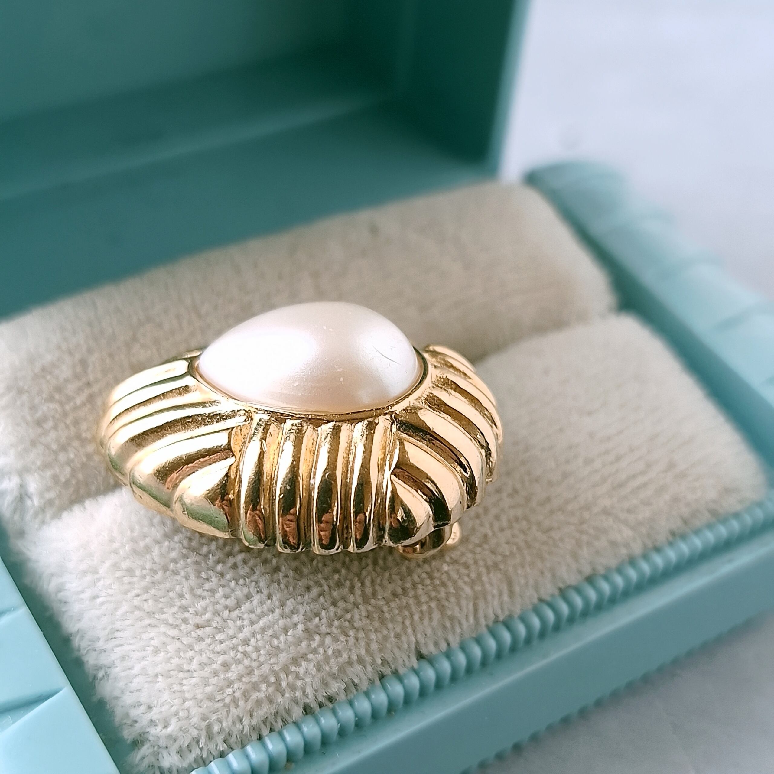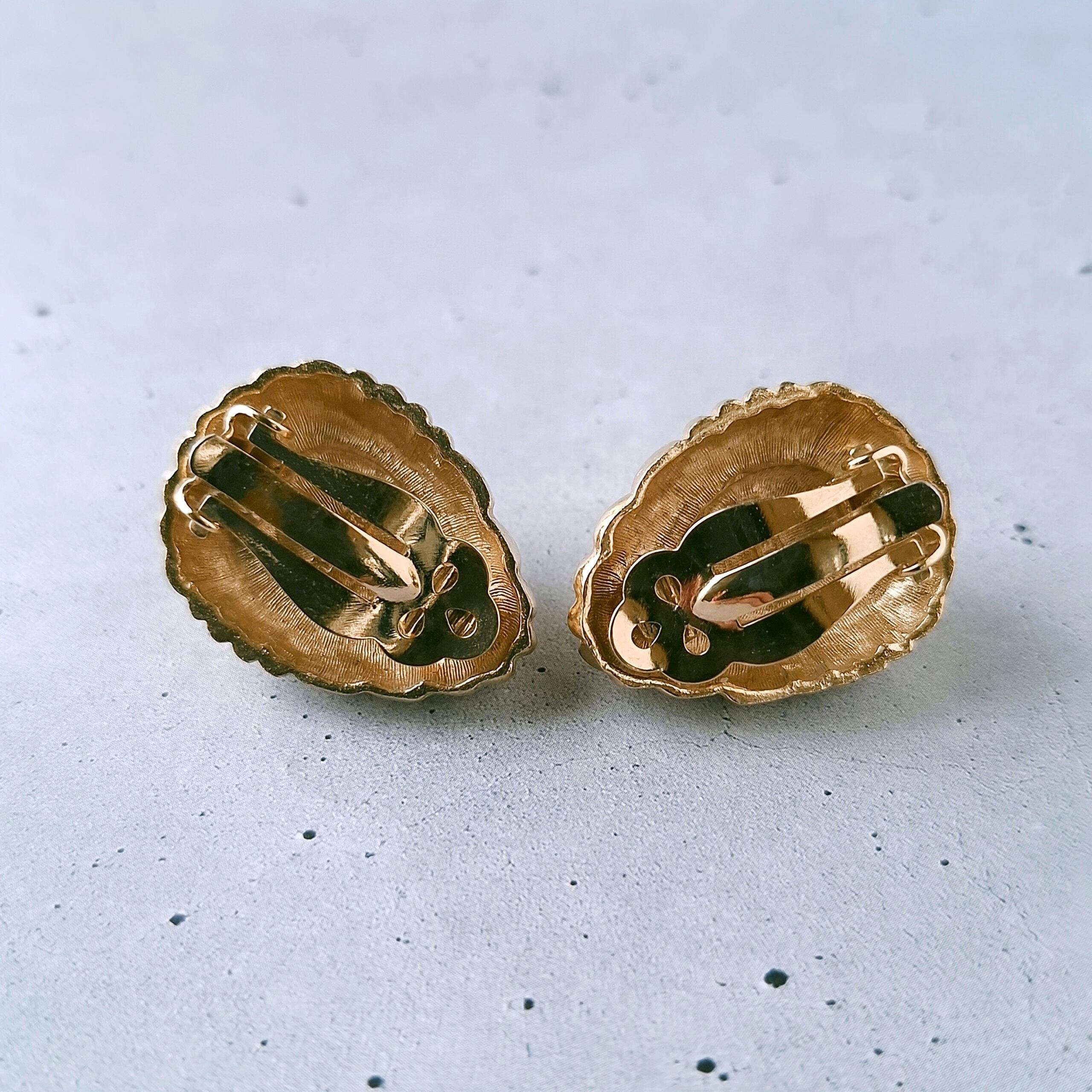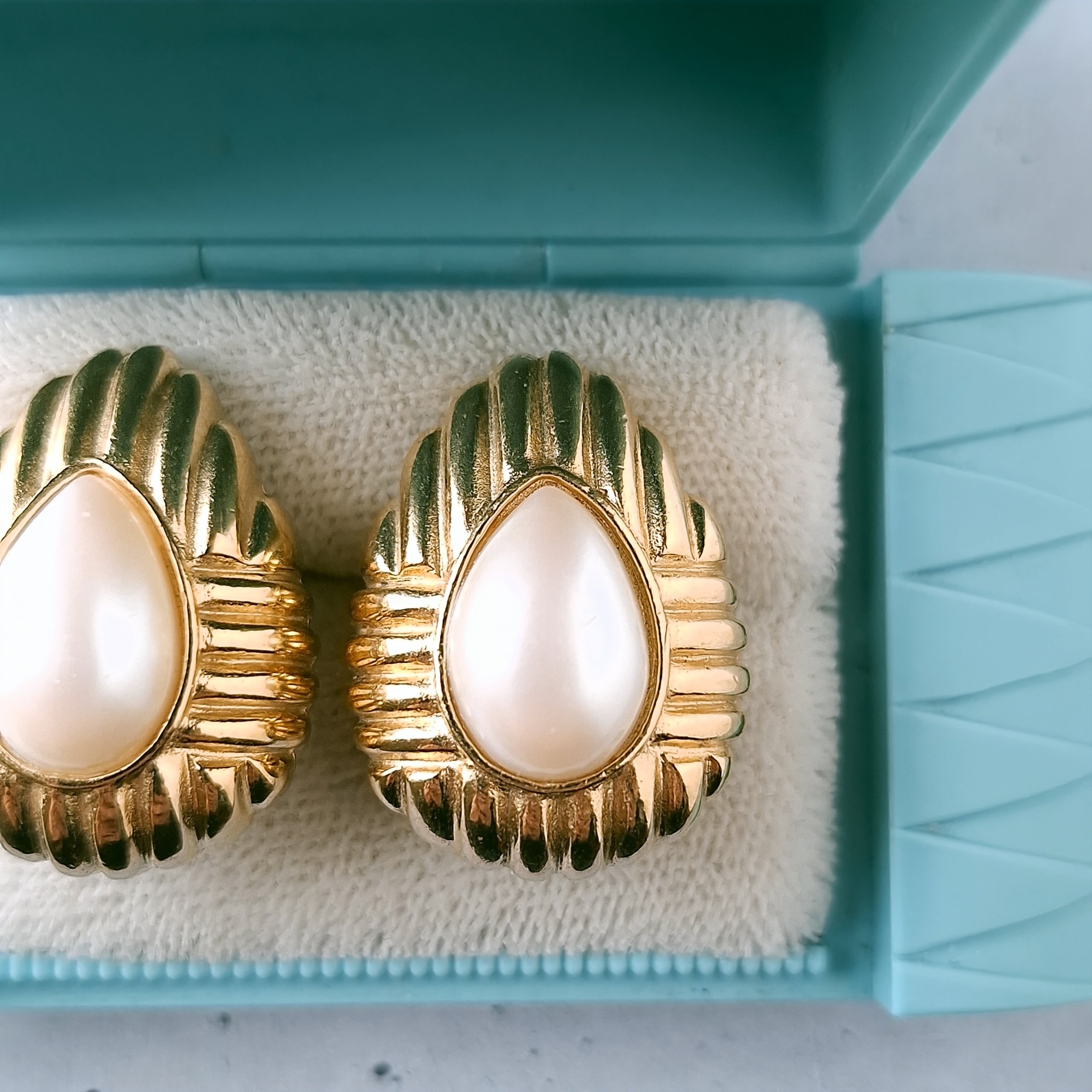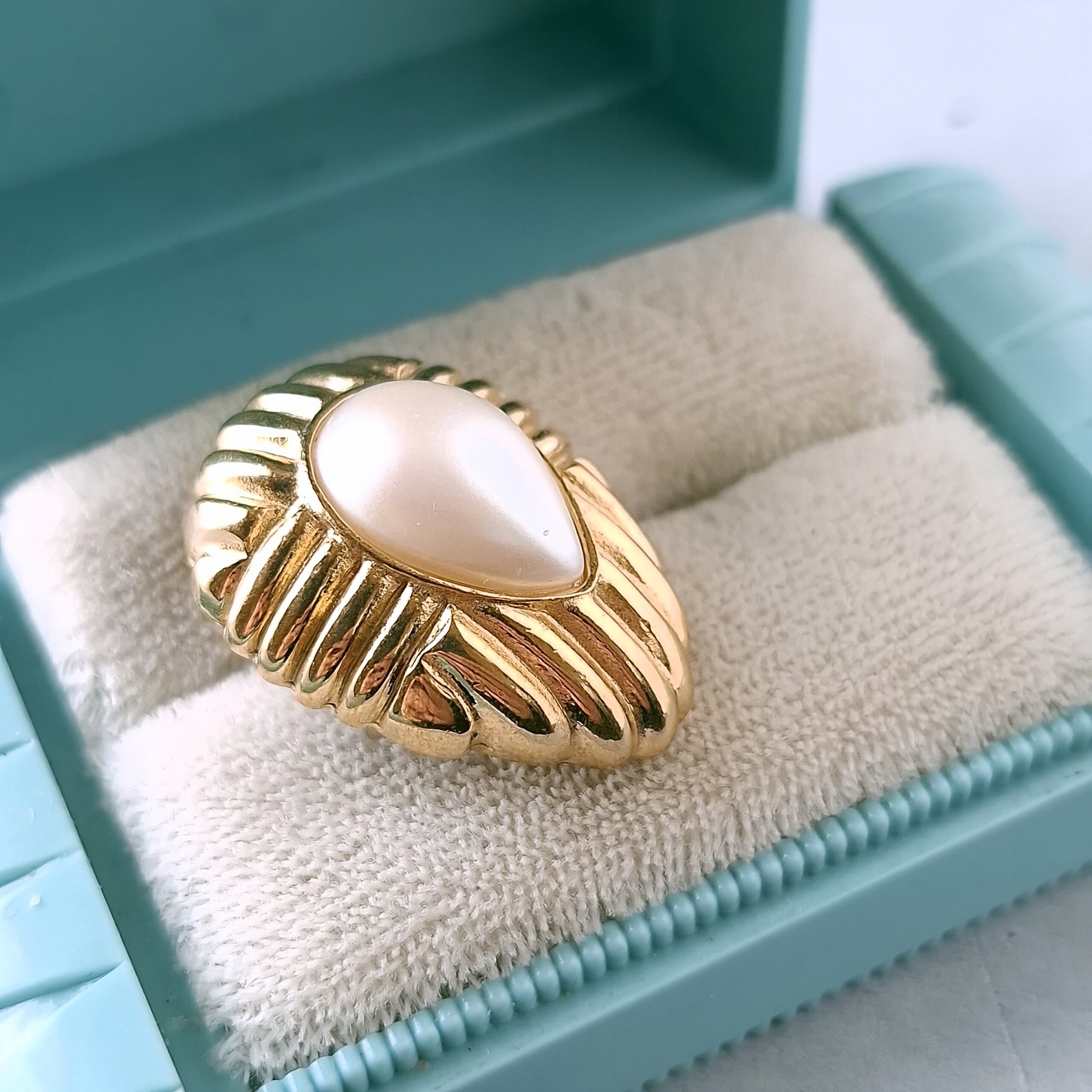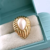 1911年ニューヨークのブルックリンにて創業、1978年にLISNER(リスナー)と合併したRichelieu(リシュリュー)の線状の模様が施されたゴールドメタルの中央にフェイクパールがあしらわれたドロップ型のヴィンテージイヤリングです。