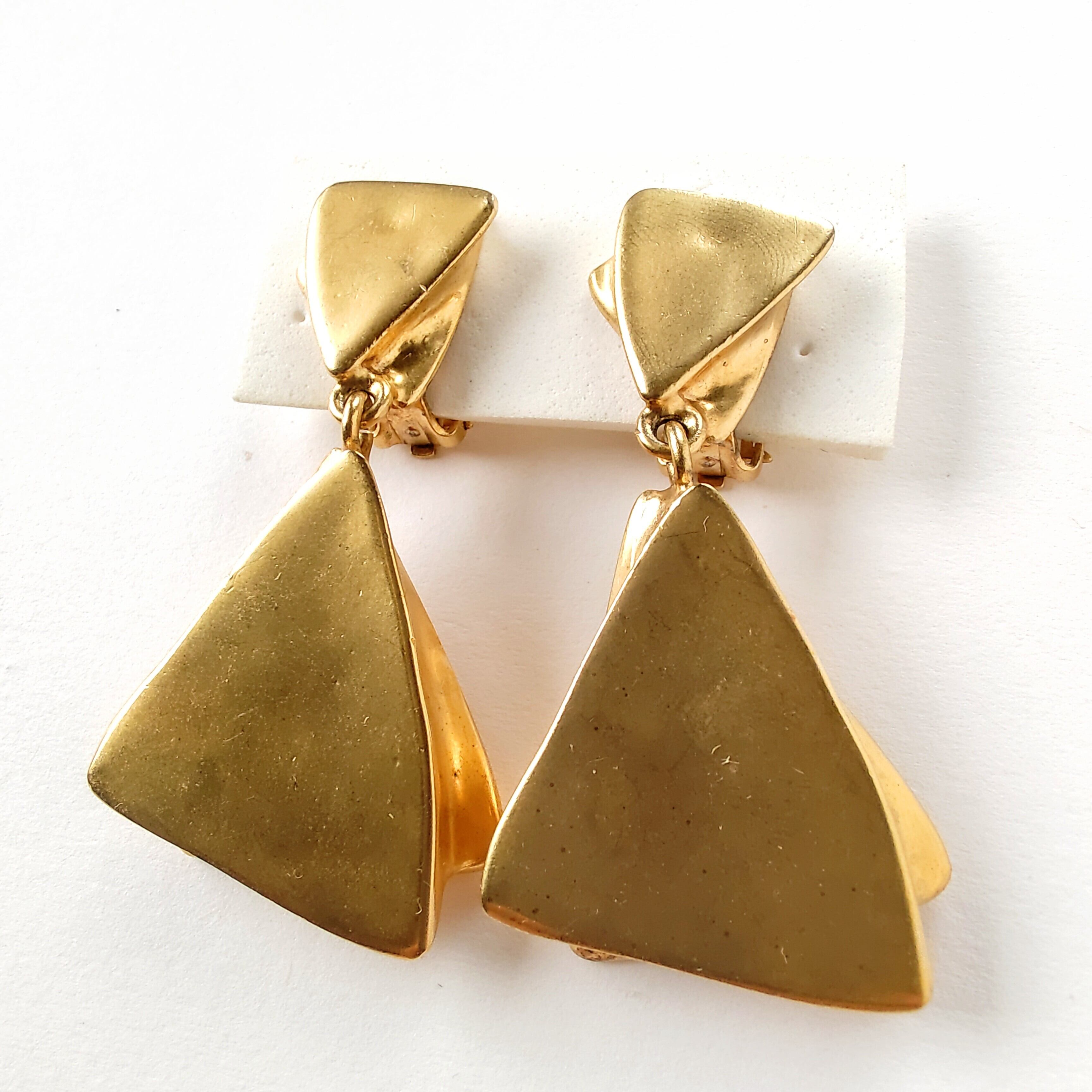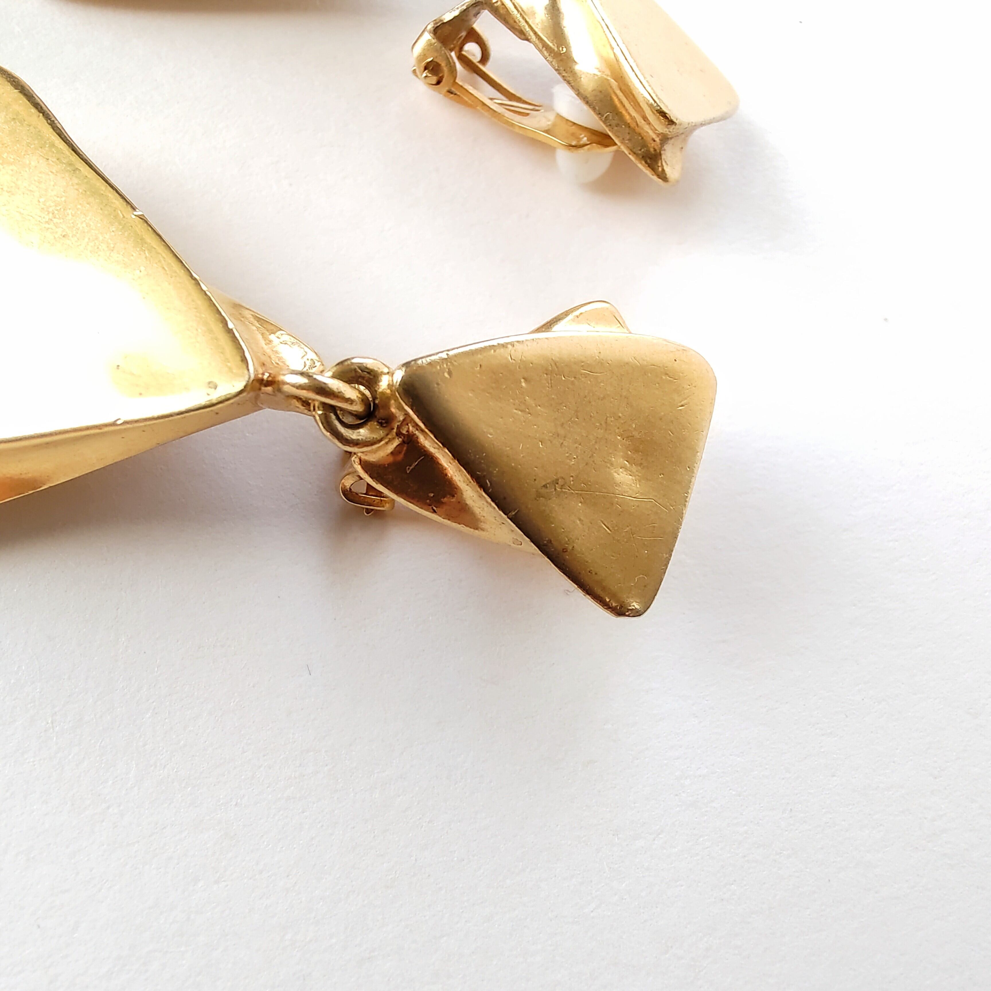 それぞれ2つの三角をずらして重ねたようなデザインの大小のゴールドメタルが揺れるタイプのヴィンテージイヤリングです。