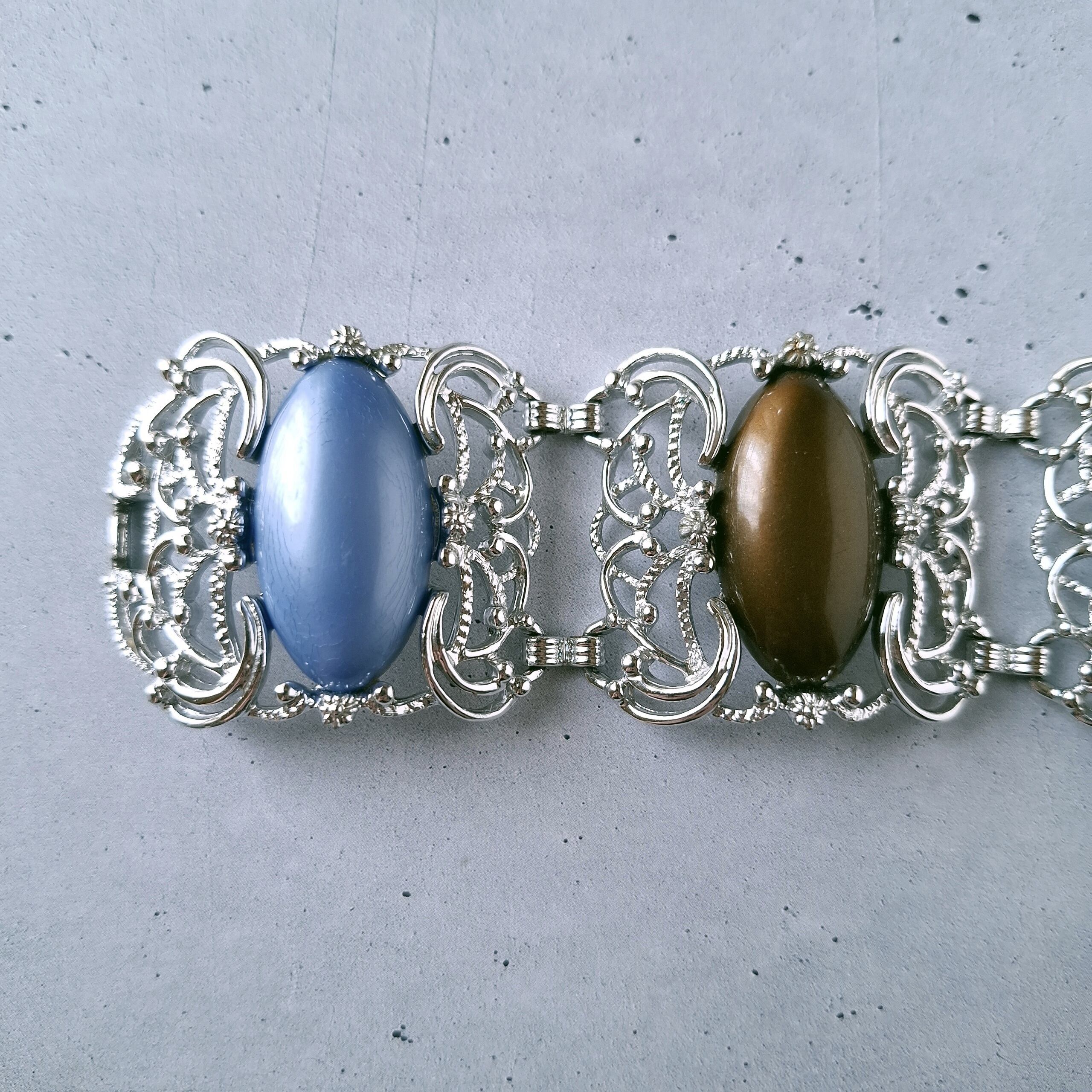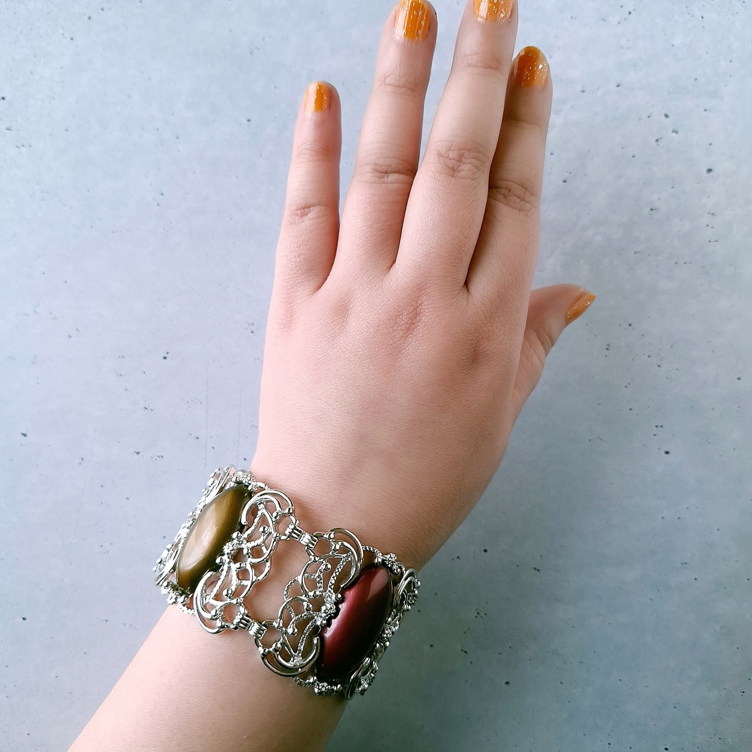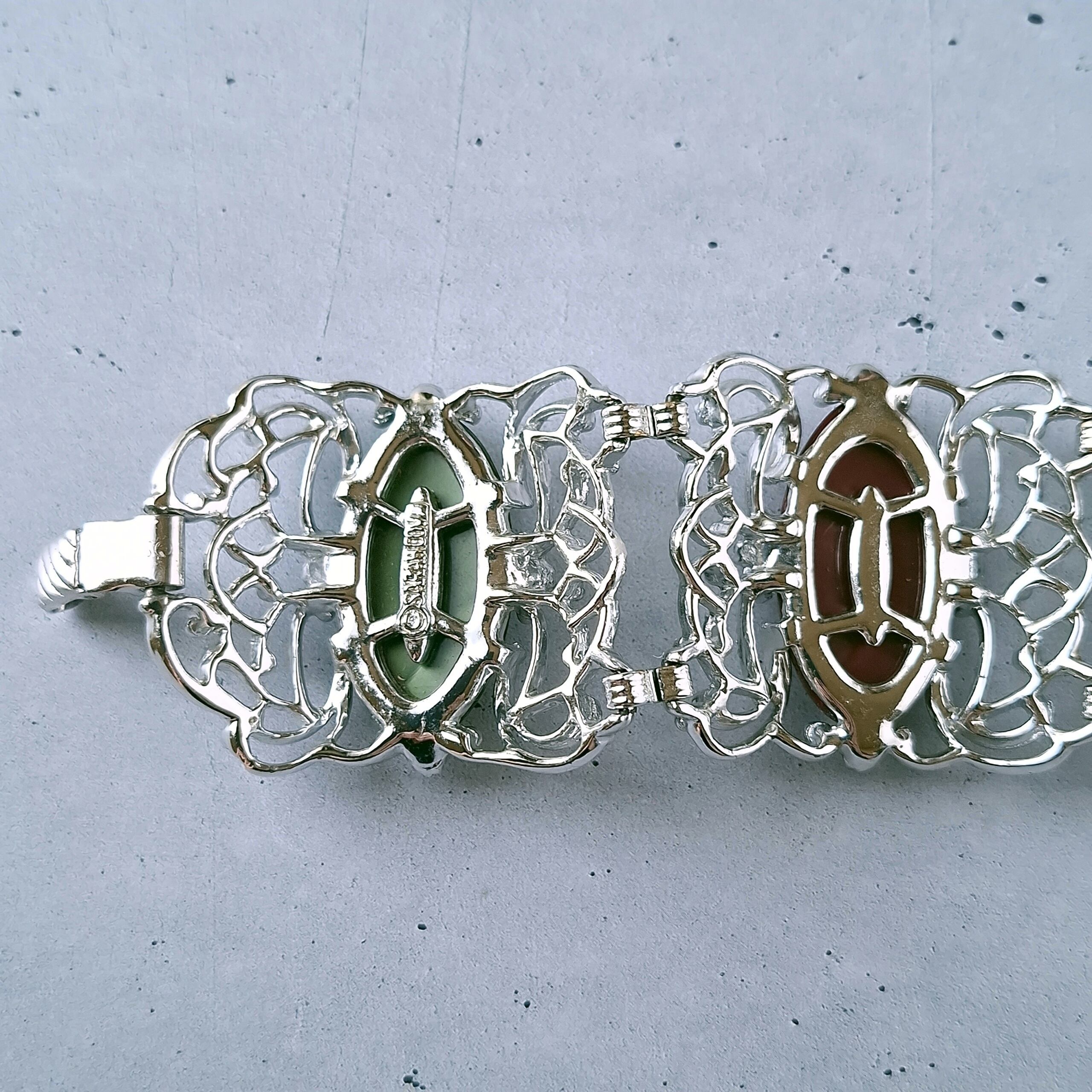 1949年にニューヨークで創業したSarah Coventry(サラコベントリー)の1960年に販売された“Carrousel”のフラワーやスワールが施されたスクエア型の透かしシルバーメタルにブルー、ブラウン、レッド、グリーンのカボションがあしらわれたヴィンテージブレスレットです。