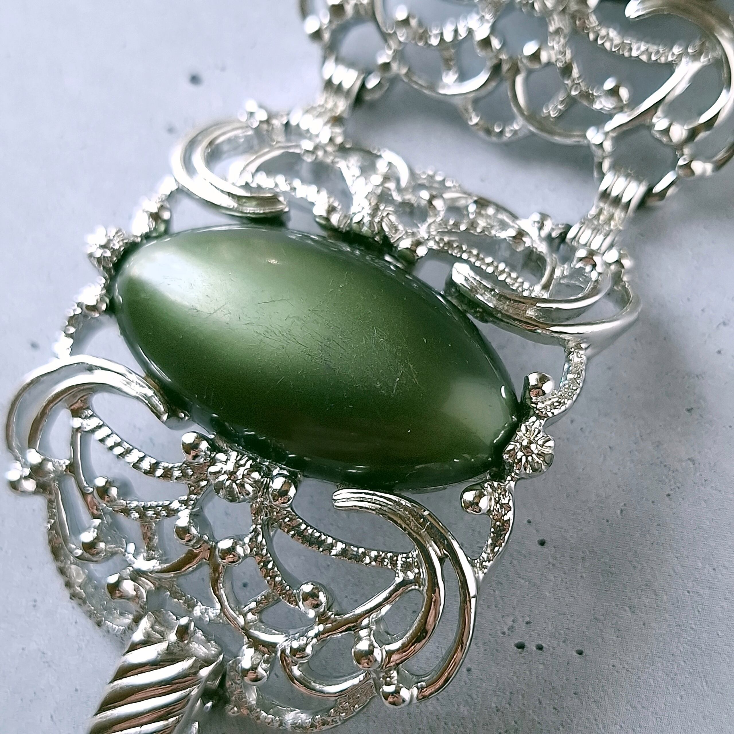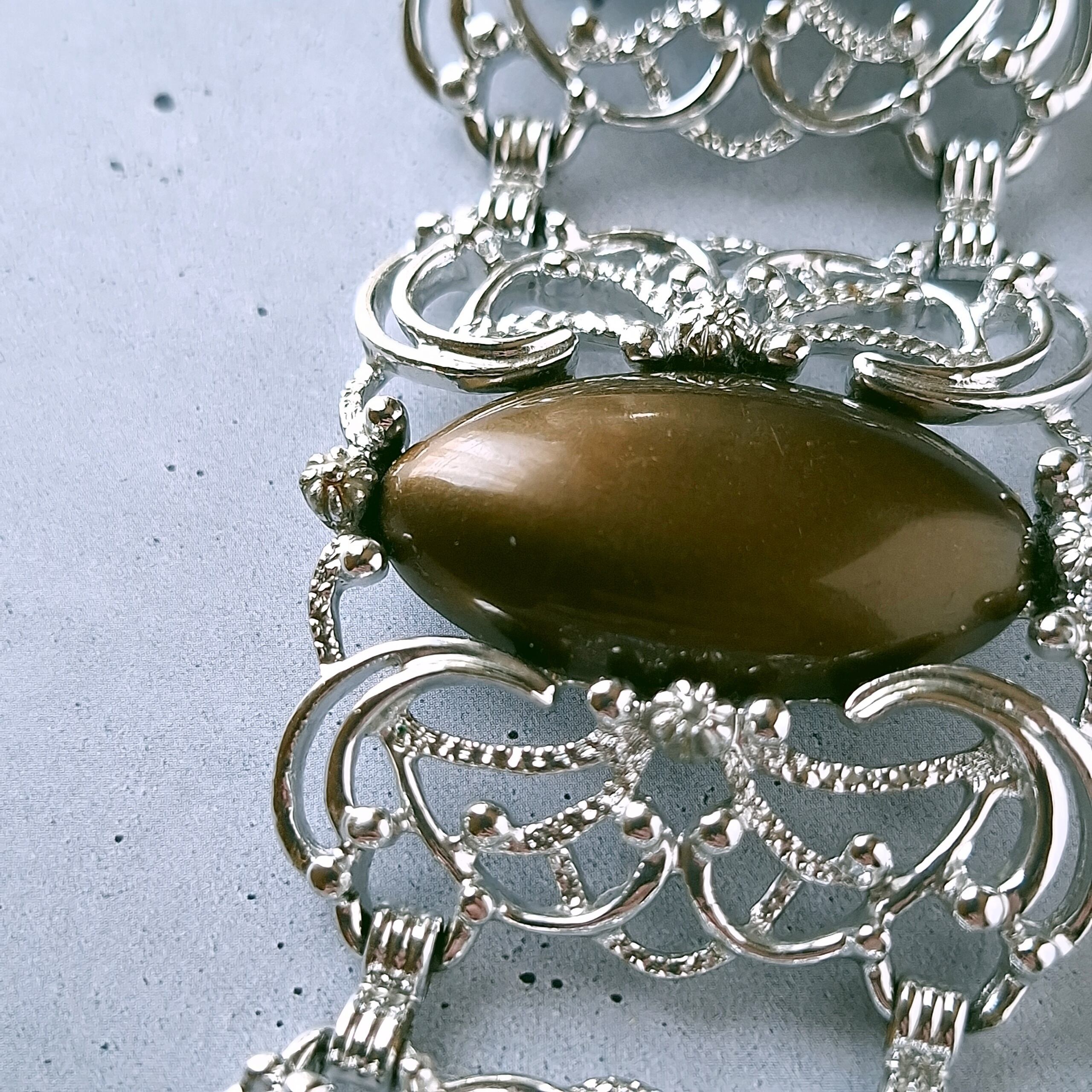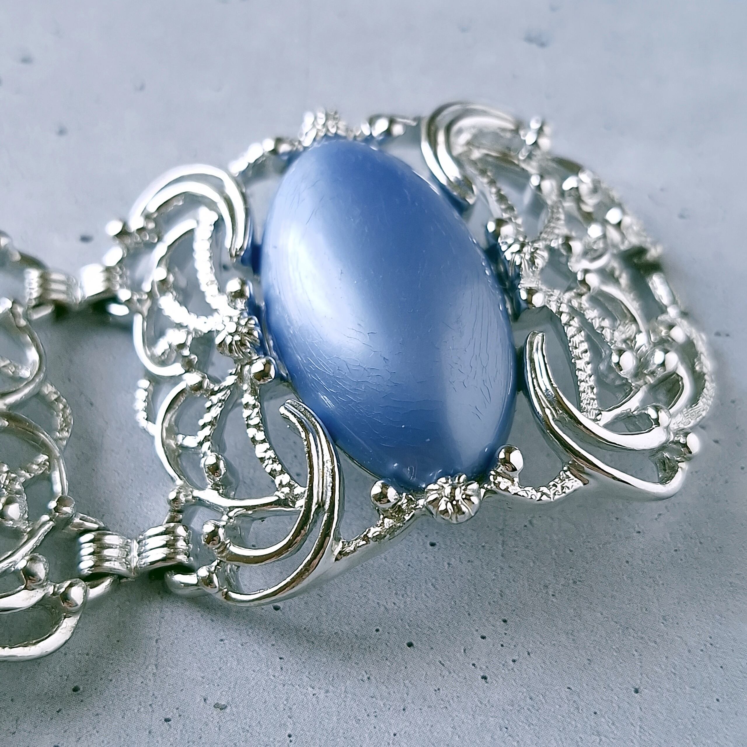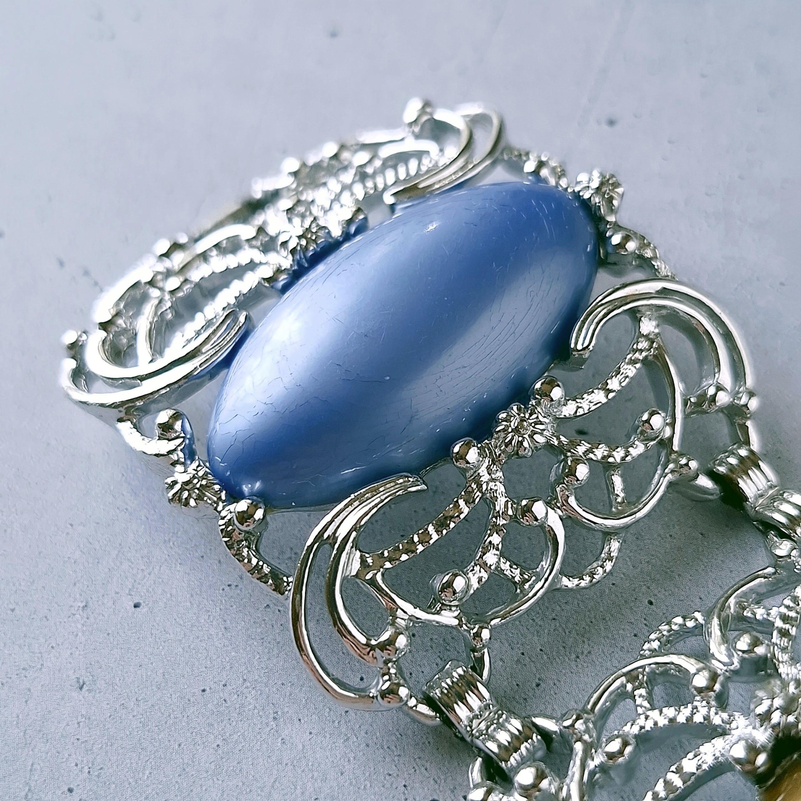 1949年にニューヨークで創業したSarah Coventry(サラコベントリー)の1960年に販売された“Carrousel”のフラワーやスワールが施されたスクエア型の透かしシルバーメタルにブルー、ブラウン、レッド、グリーンのカボションがあしらわれたヴィンテージブレスレットです。