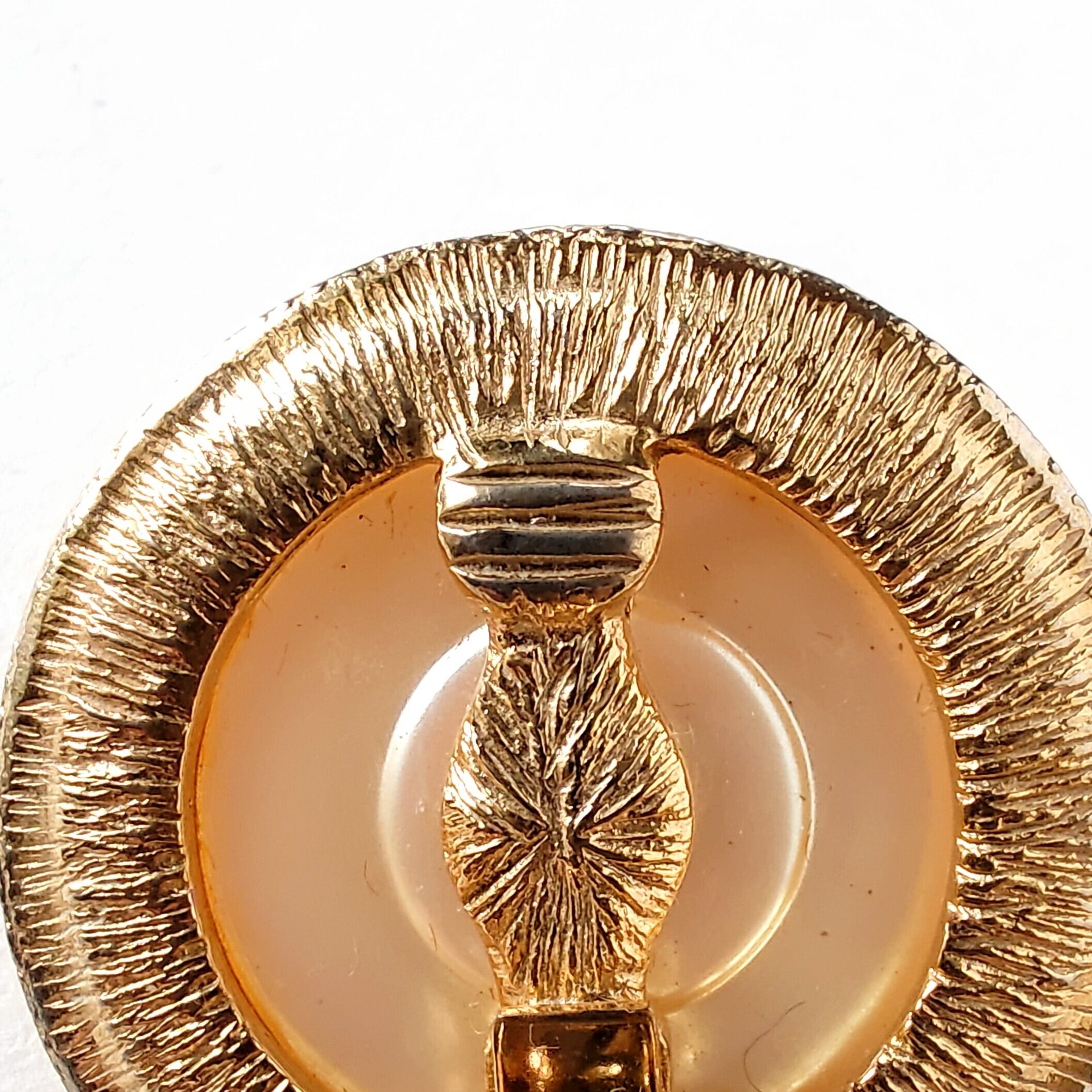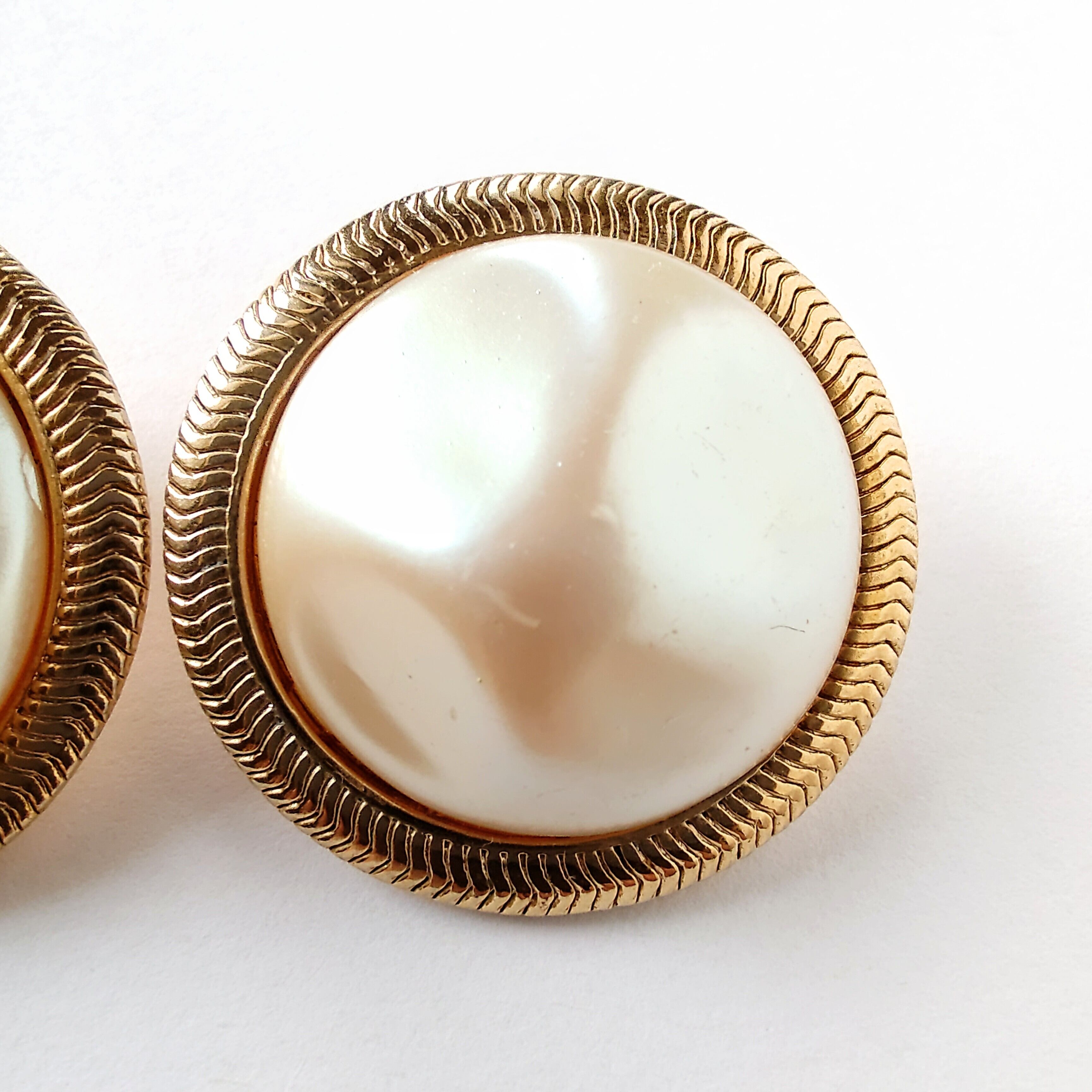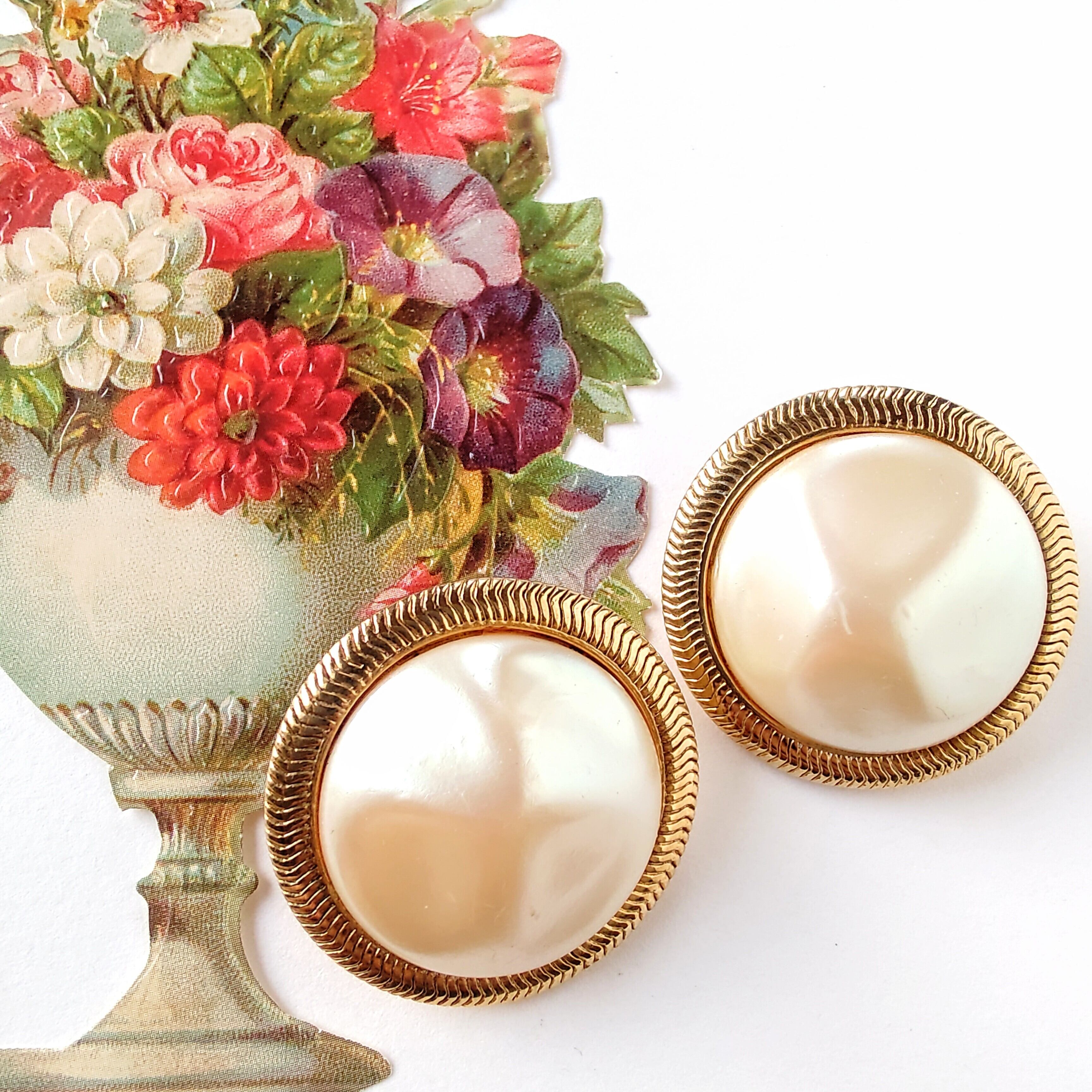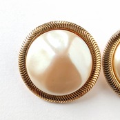 ゴールドのベースメタルの中央にフェイクバロックパールがあしらわれたラウンド型のヴィンテージイヤリングです。