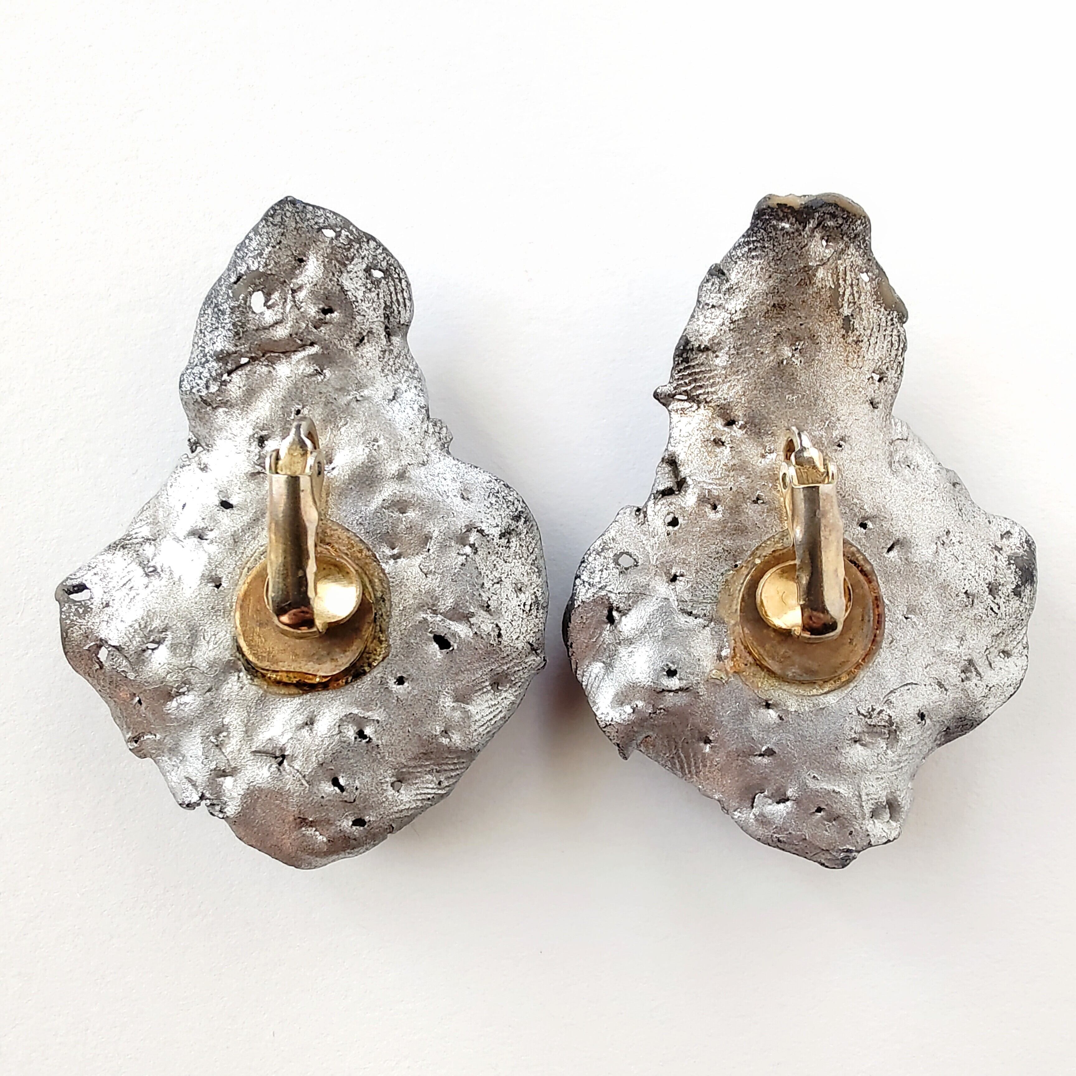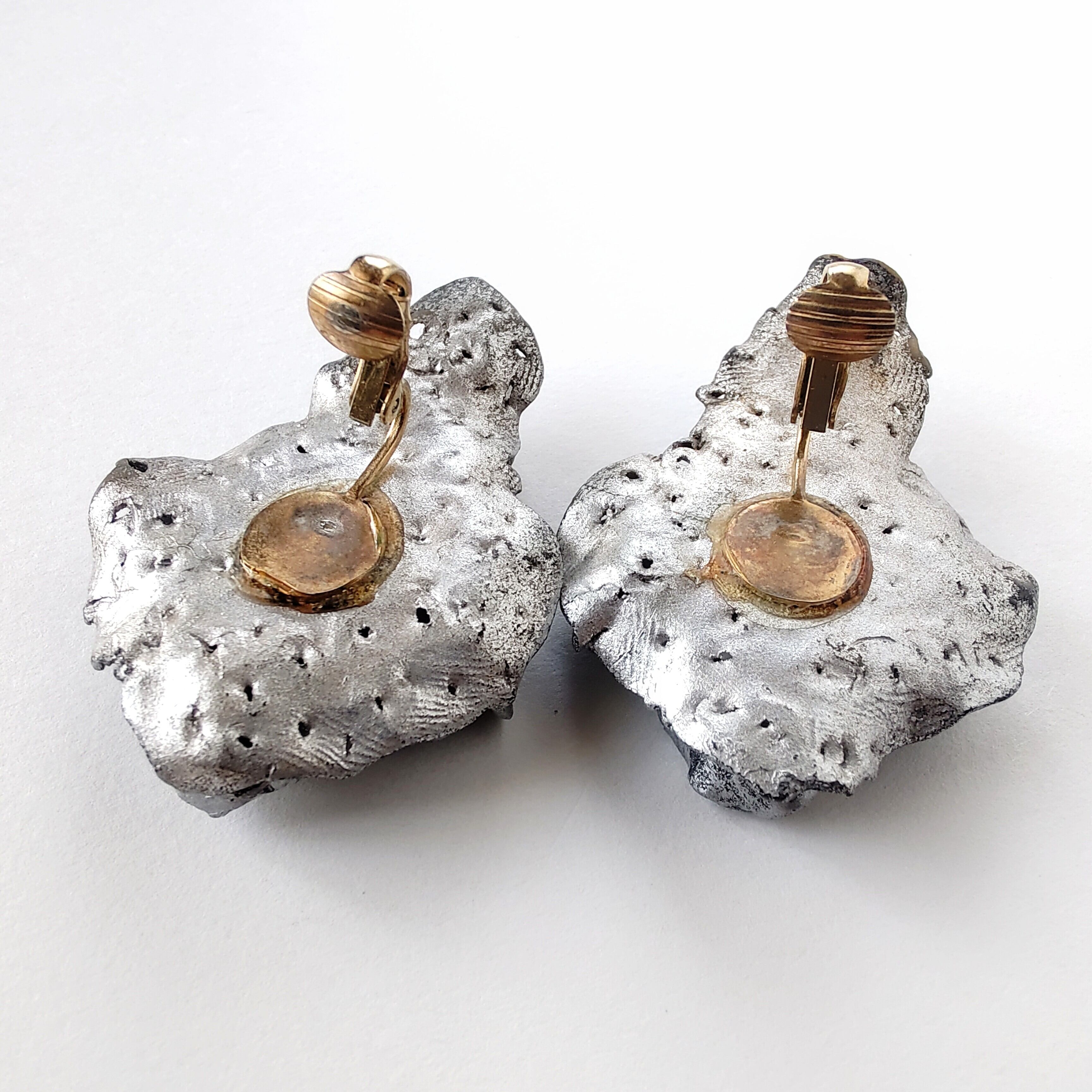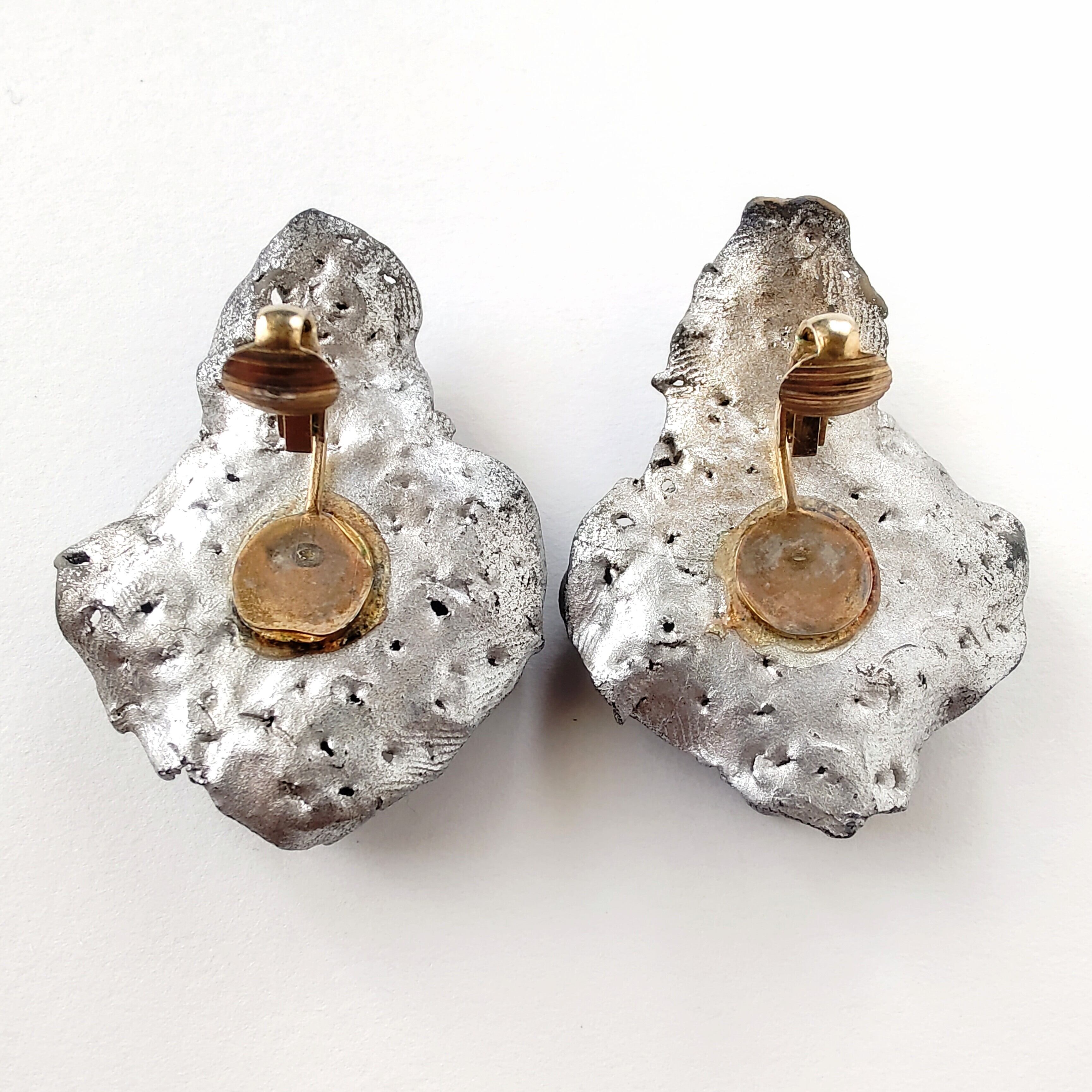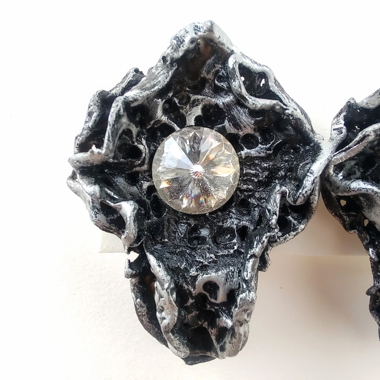 ブラックとシルバーで色付けされた軽い樹脂で作られた中央にリヴォリクリアラインストーンがあしらわれた歪なクロスのハンドクラフトのヴィンテージイヤリングです。