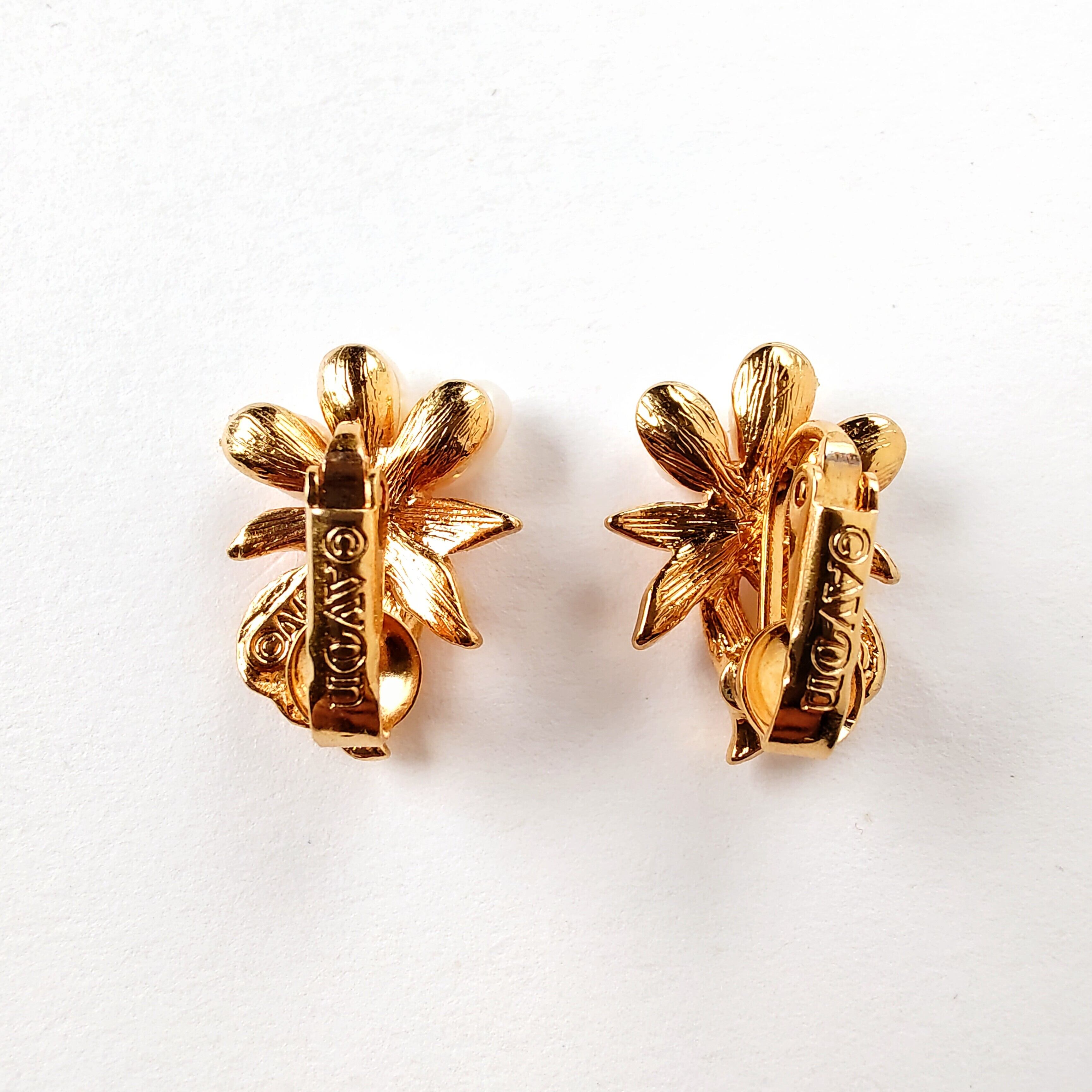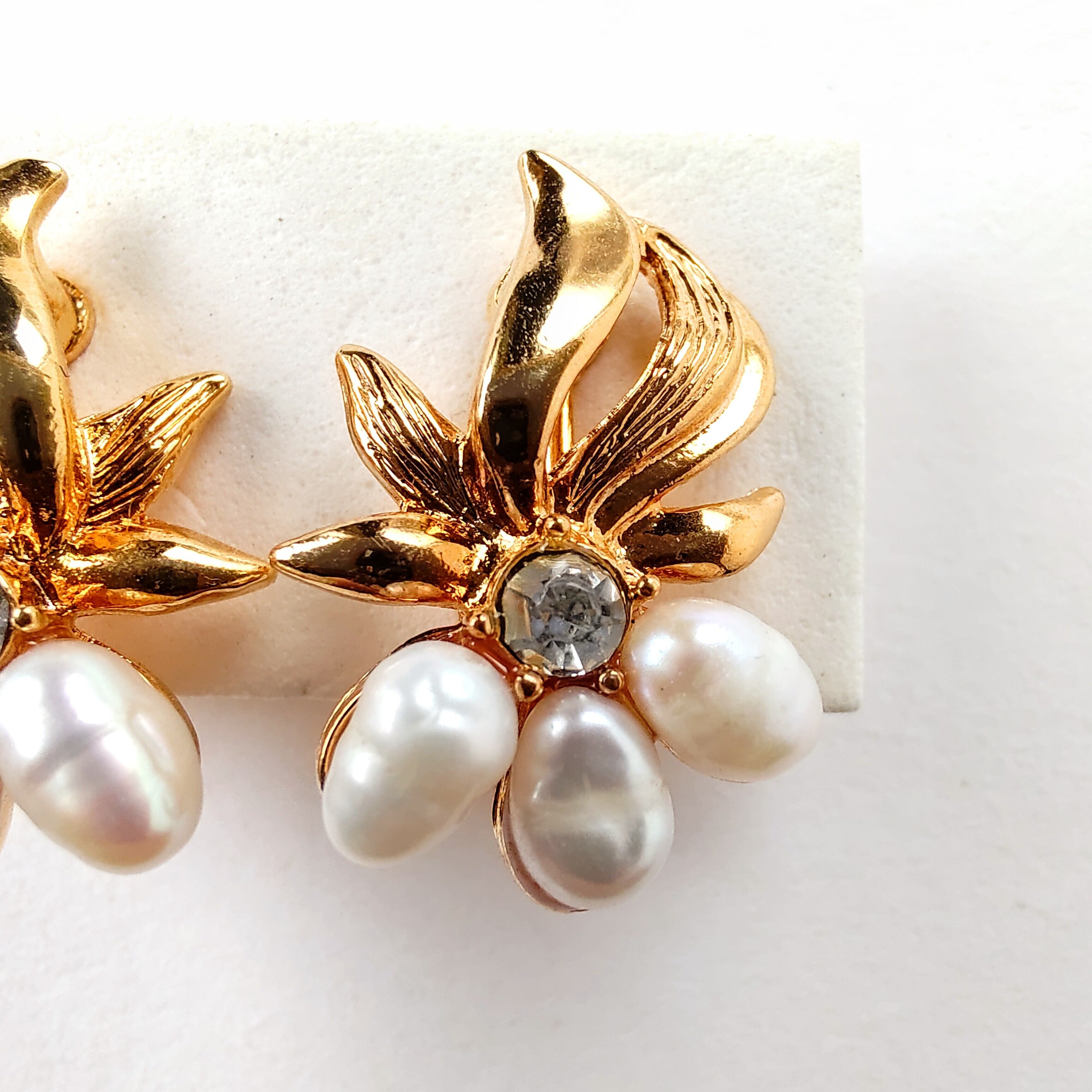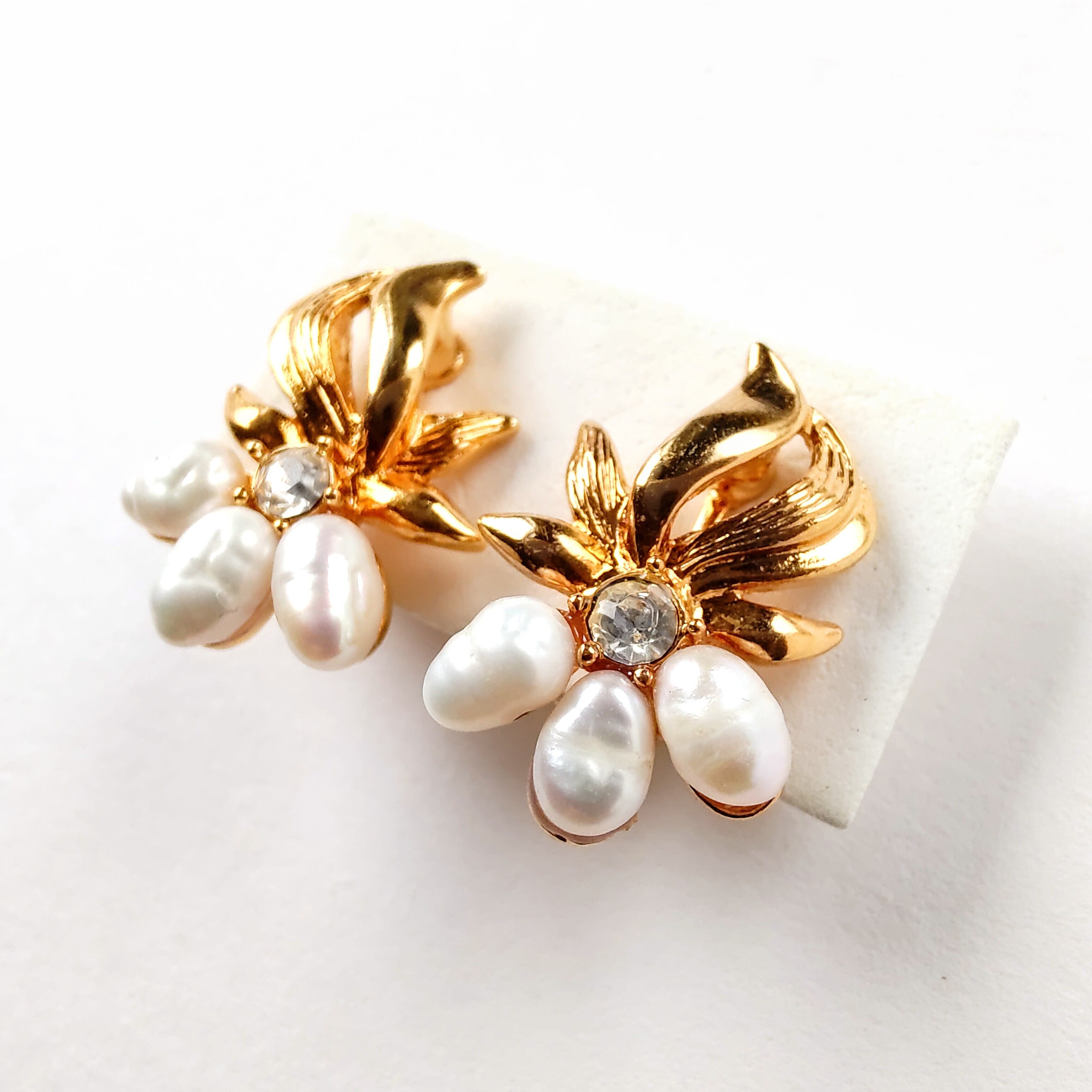 1886年アメリカのニューヨークにて小さな香水会社を創業、1971年に本格的にコスチュームジュエリーの製作を開始したAvon(エイボン)の1993年に販売された“Genuine Freshwater Pearl”の上部分には動きのあるゴールドメタルの花びら、下部分には本物の淡水パール、中央にクリアラインストーンがあしらわれたフラワーデザインのヴィンテージイヤリングです。