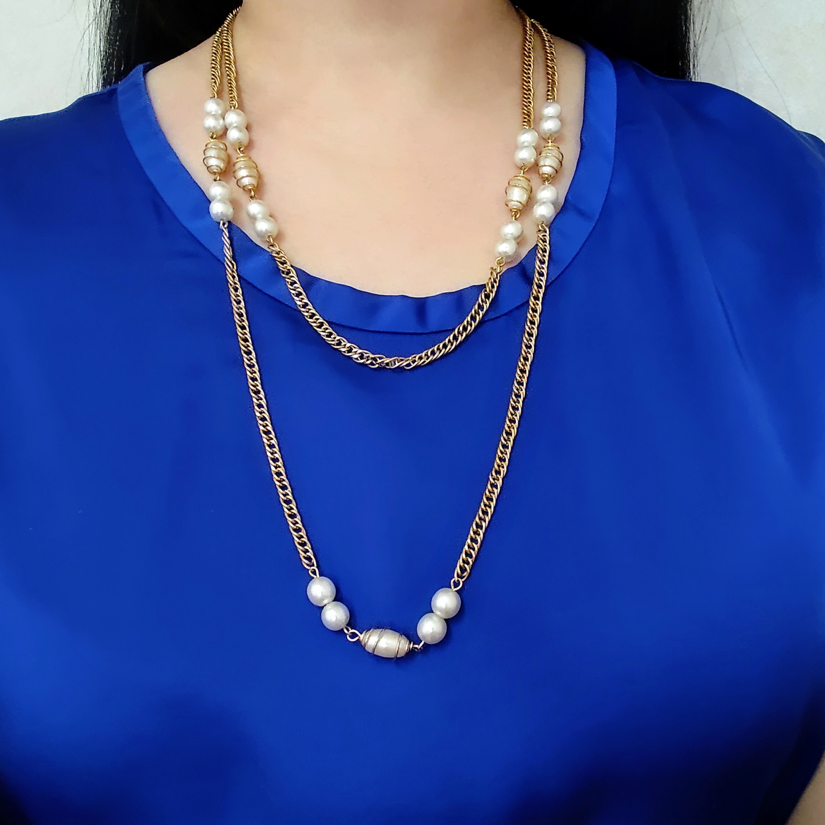 1949年にニューヨークで創業したSarah Coventry(サラコベントリー)の1970年に販売された“Caged Pearl”のゴールドメタルチェーンにぐるぐるとワイヤーで巻かれたフェイクパールがあしらわれたロングタイプのヴィンテージネックレスです。