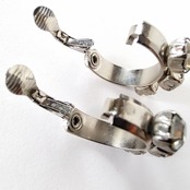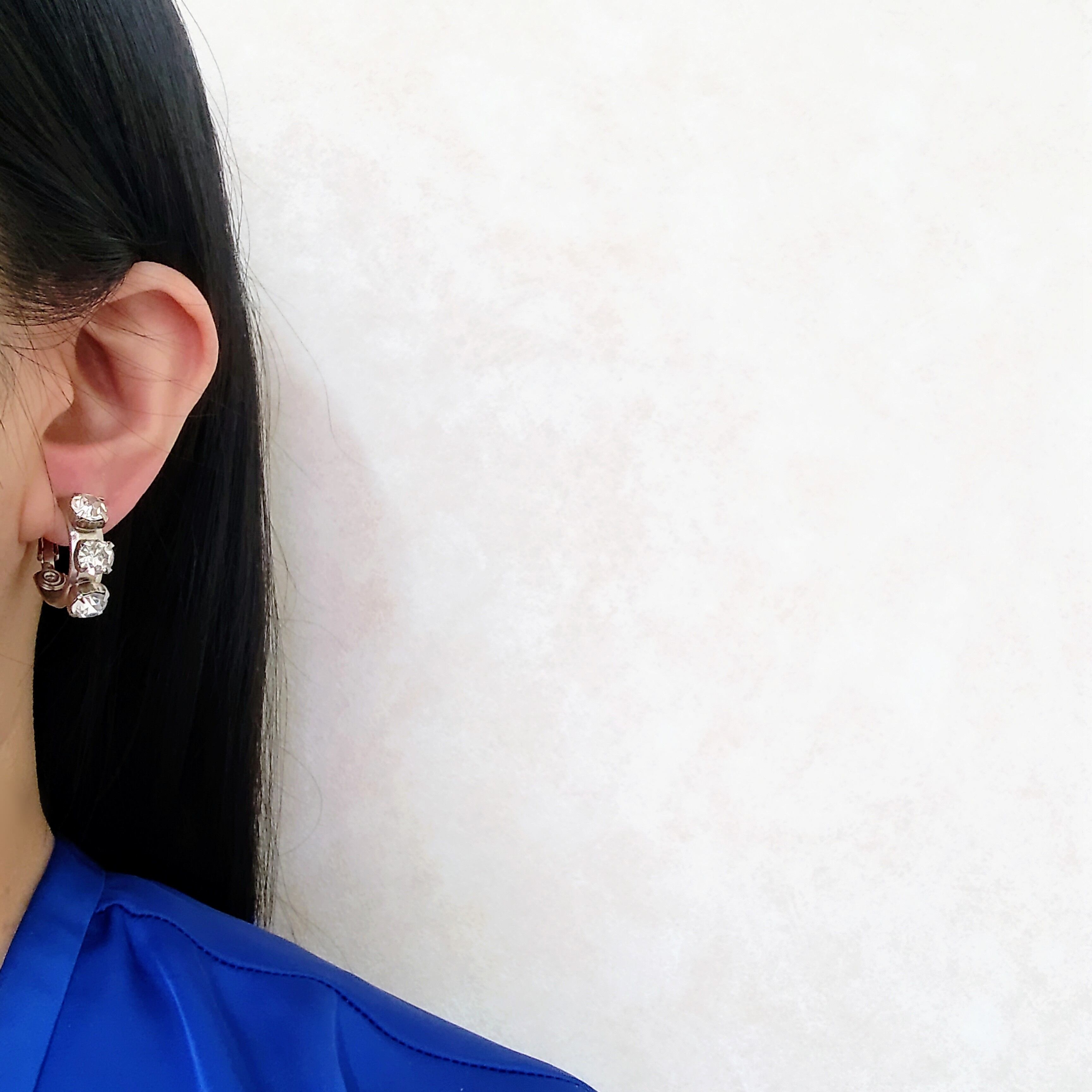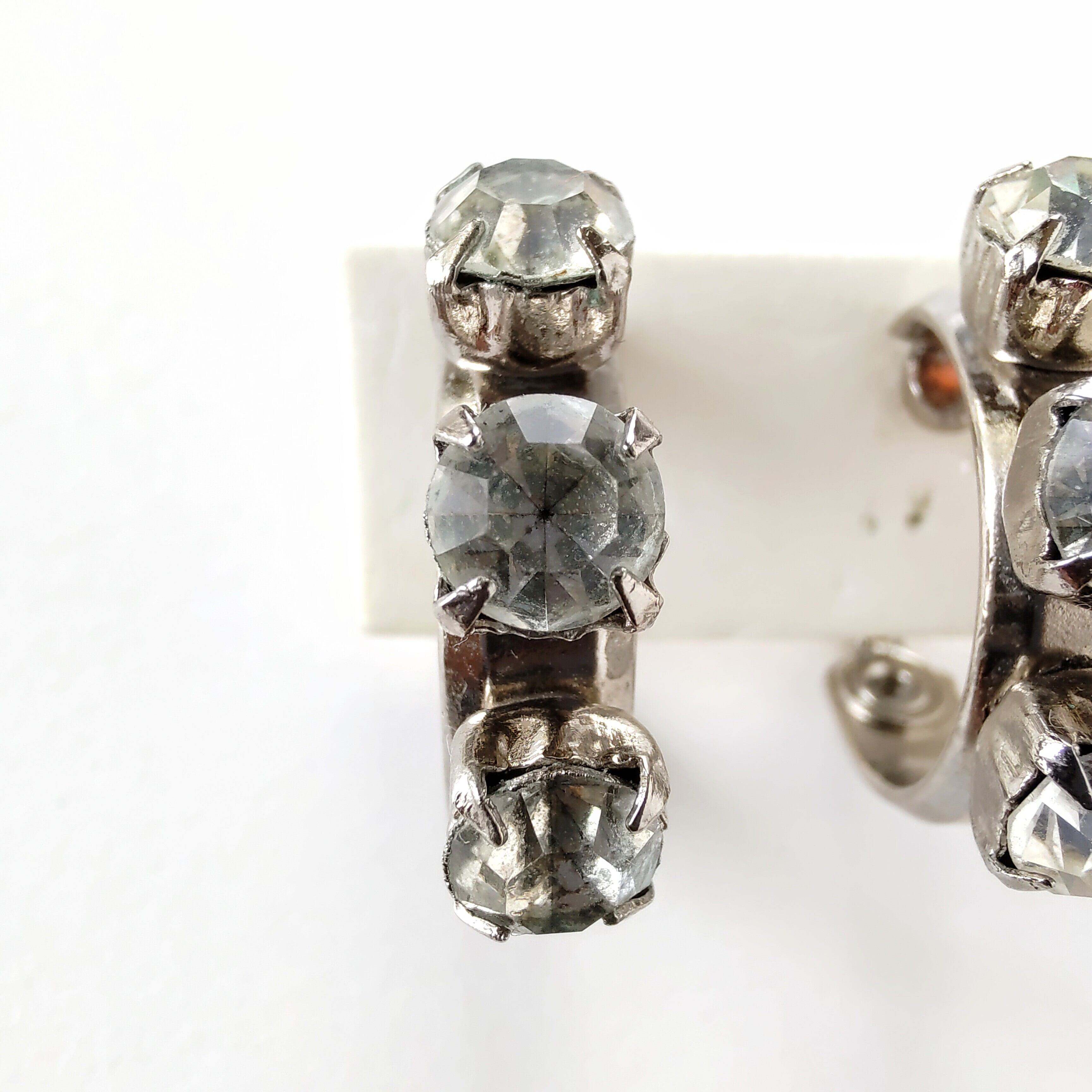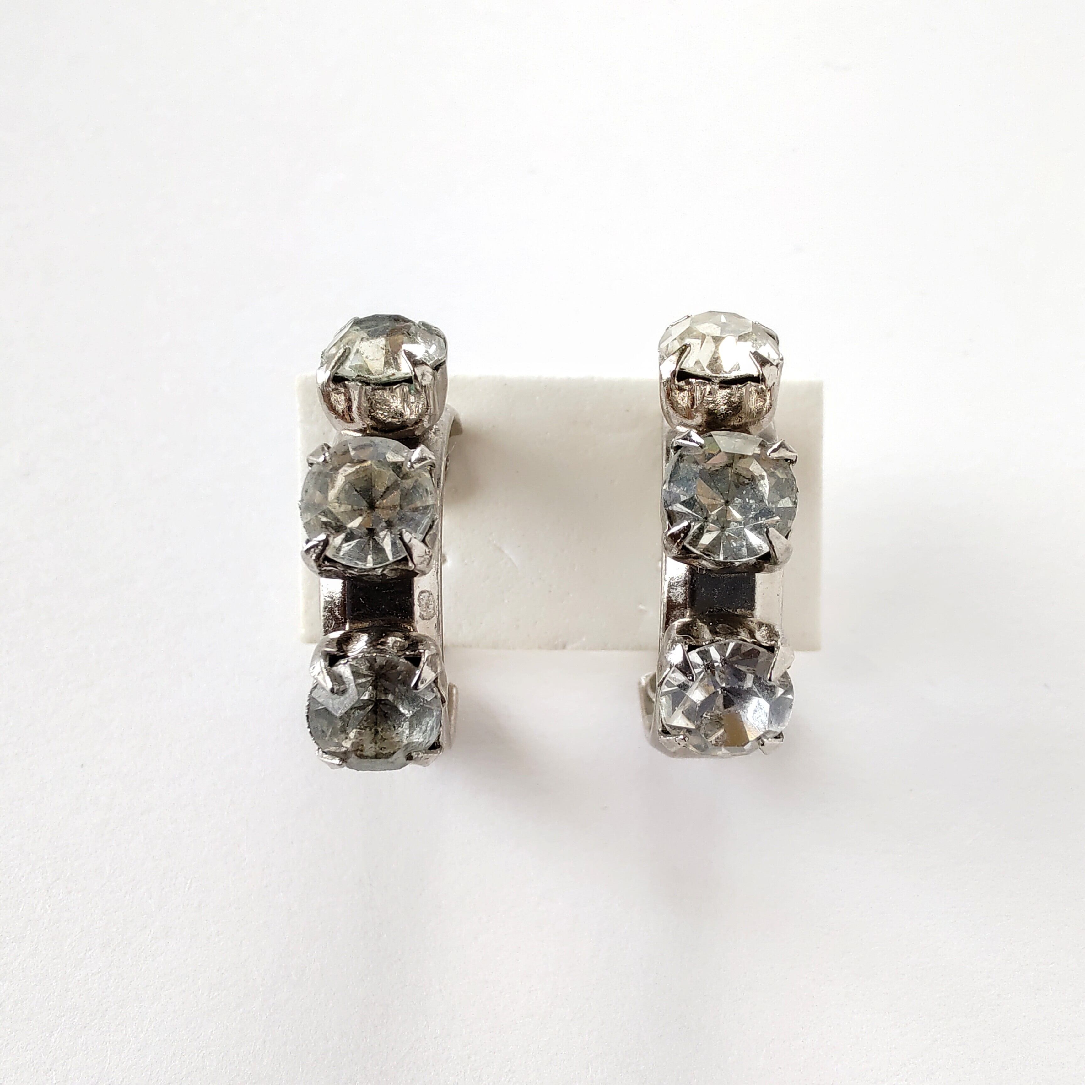 シルバーメタルのフープに3粒のクリアラインストーンがあしらわれたヴィンテージイヤリングです。
