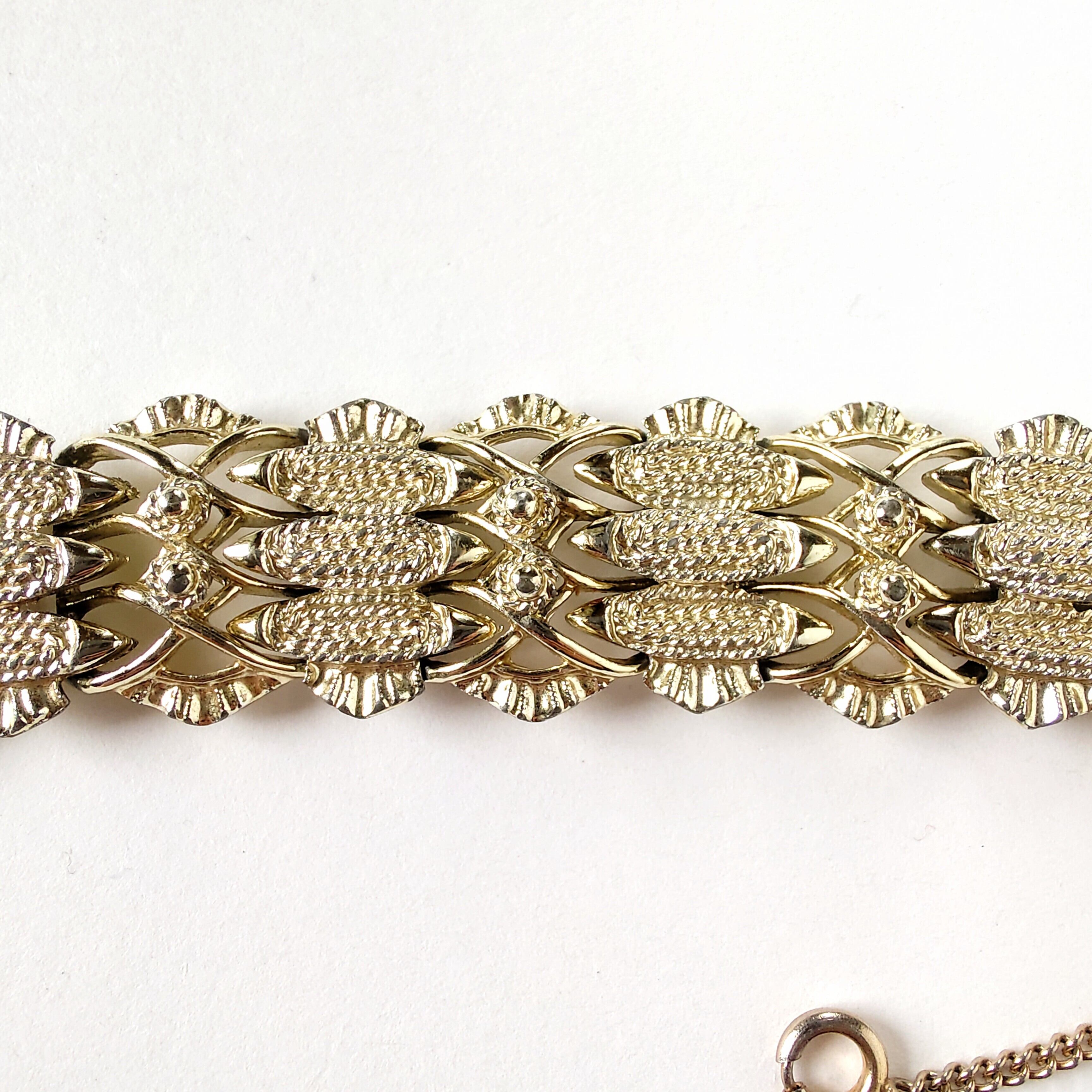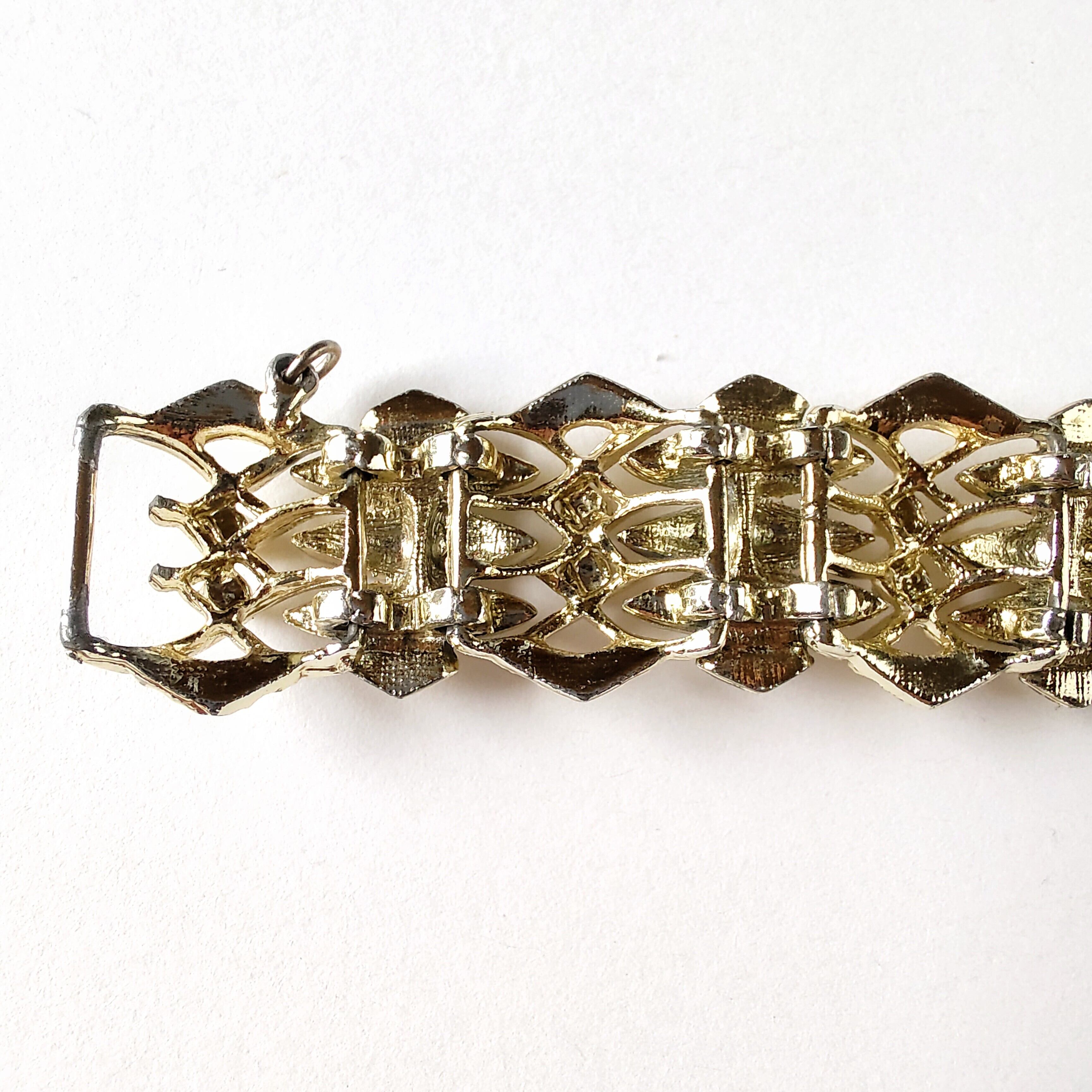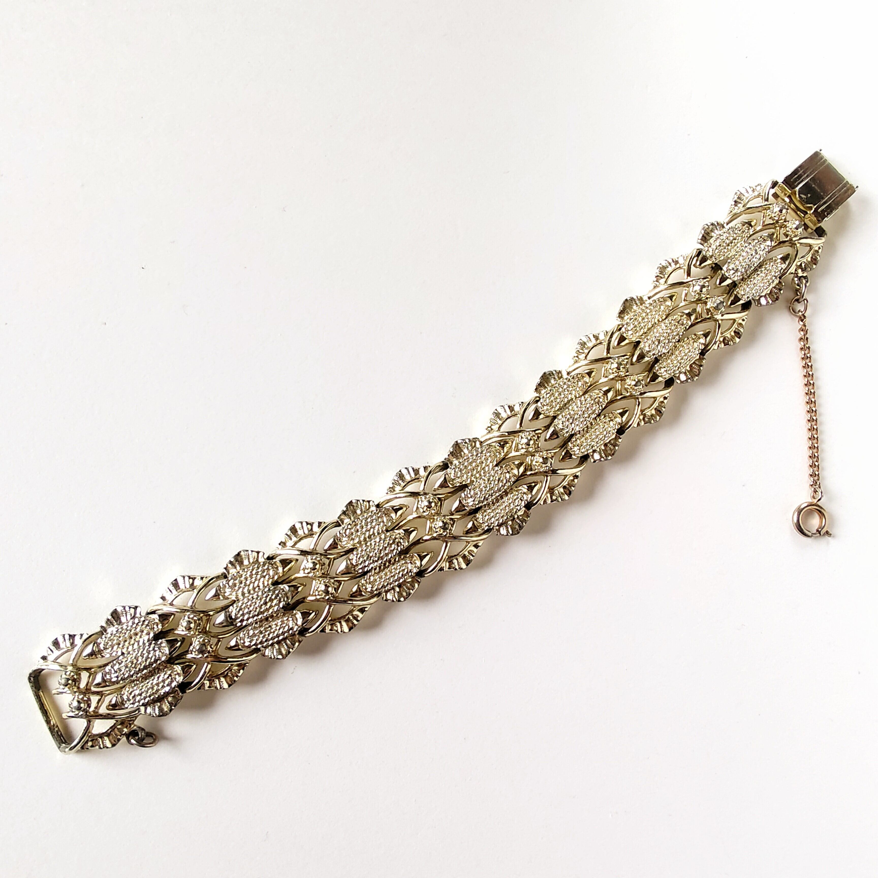 薄いゴールドメタルのオープンワークのアブストラクトなデザインのヴィンテージブレスレットです。