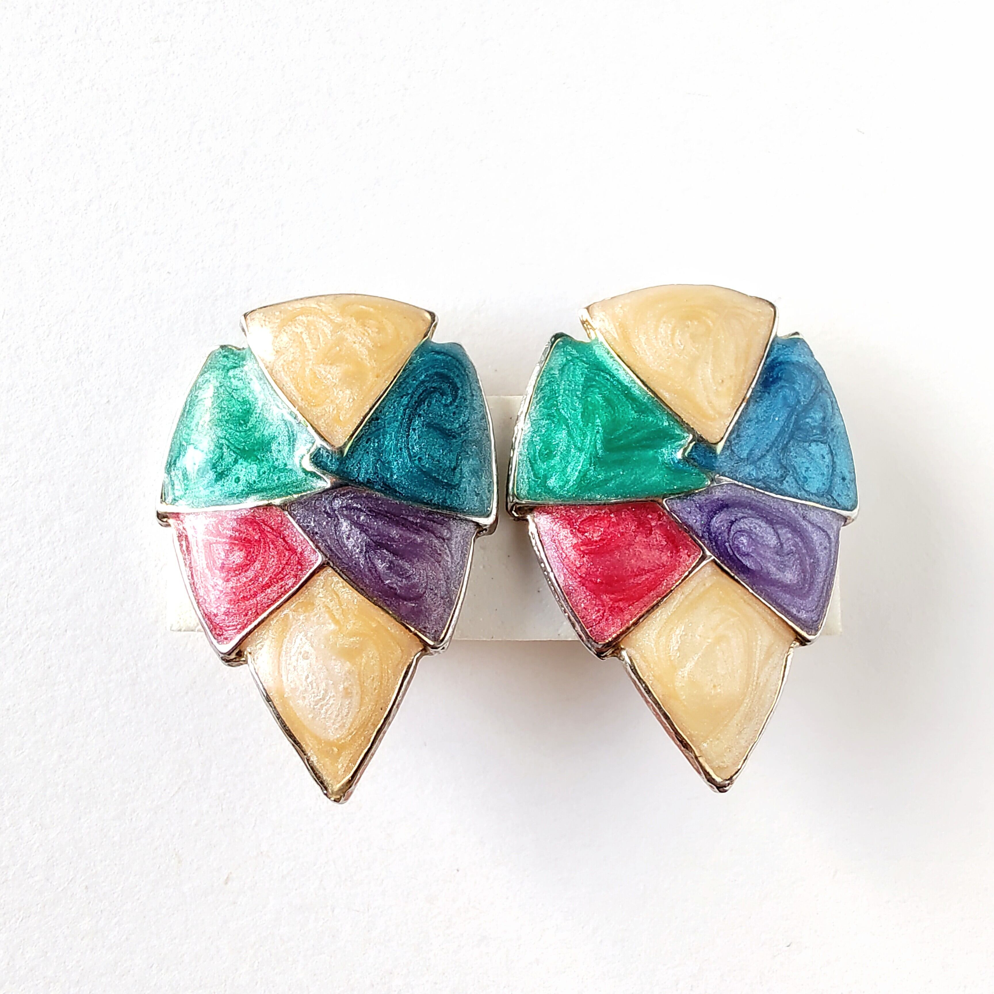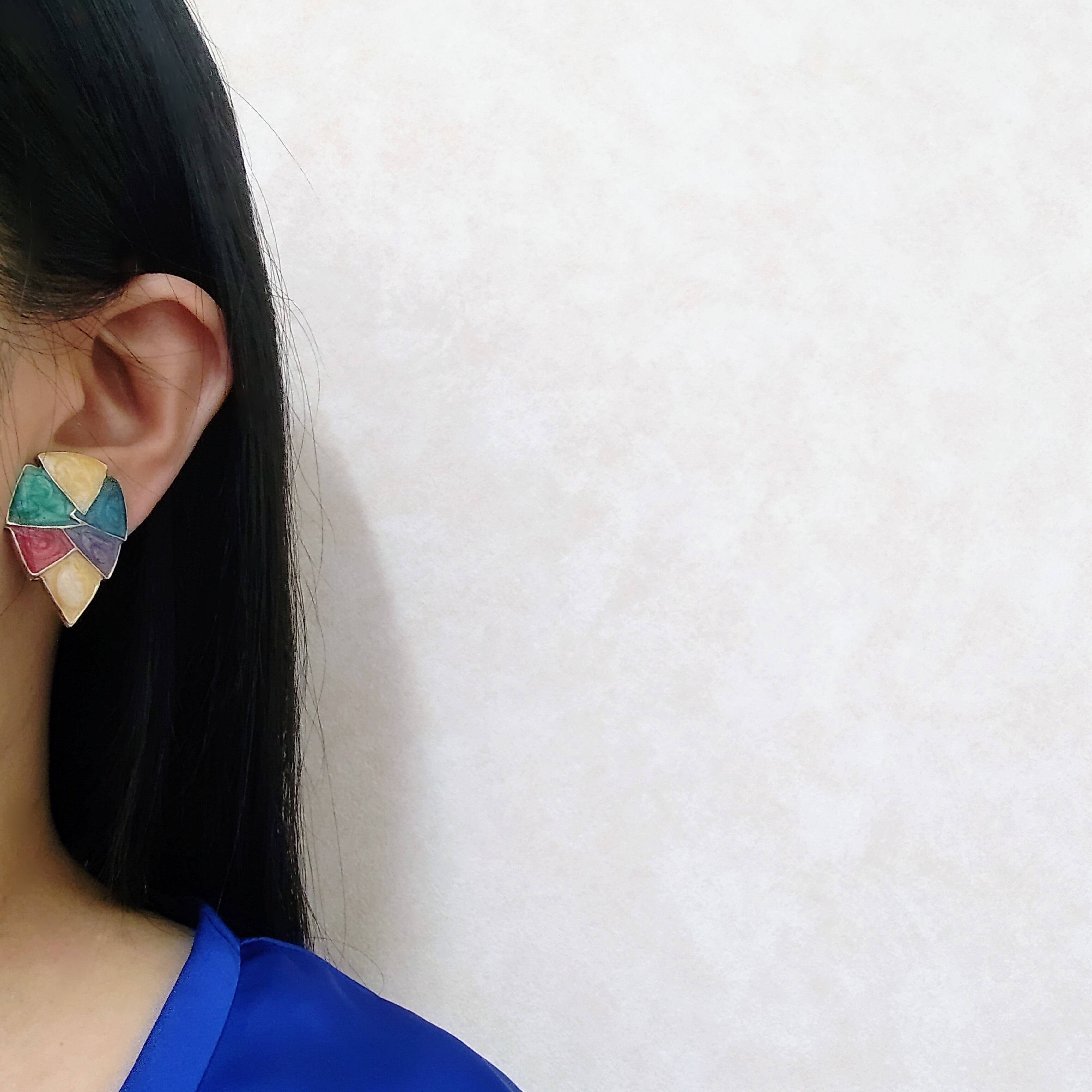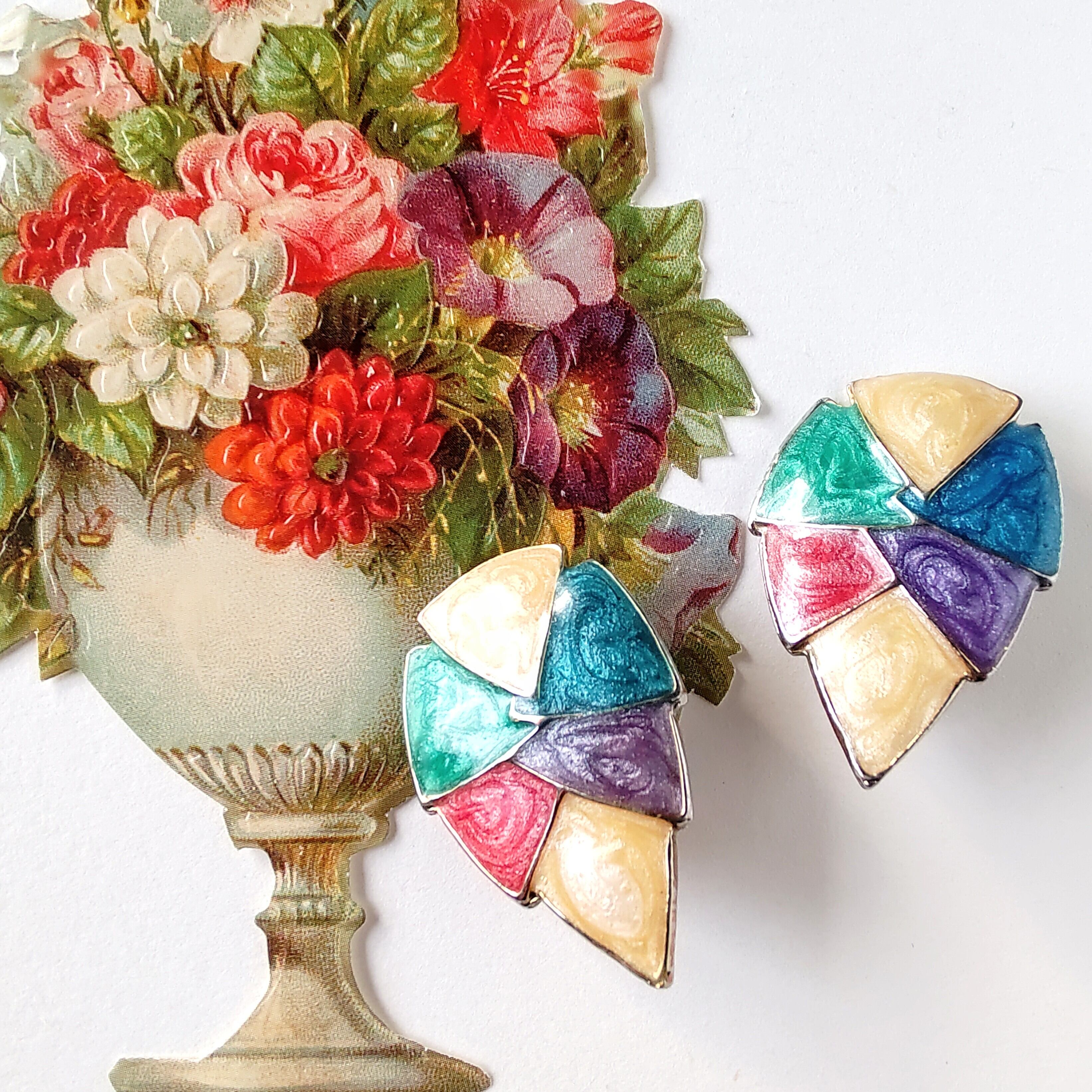 ブルー、グリーン、パープル、ピンク、ベージュのエナメルで色付けされた三角が重なってドロップ型にデザインされたヴィンテージイヤリングです。